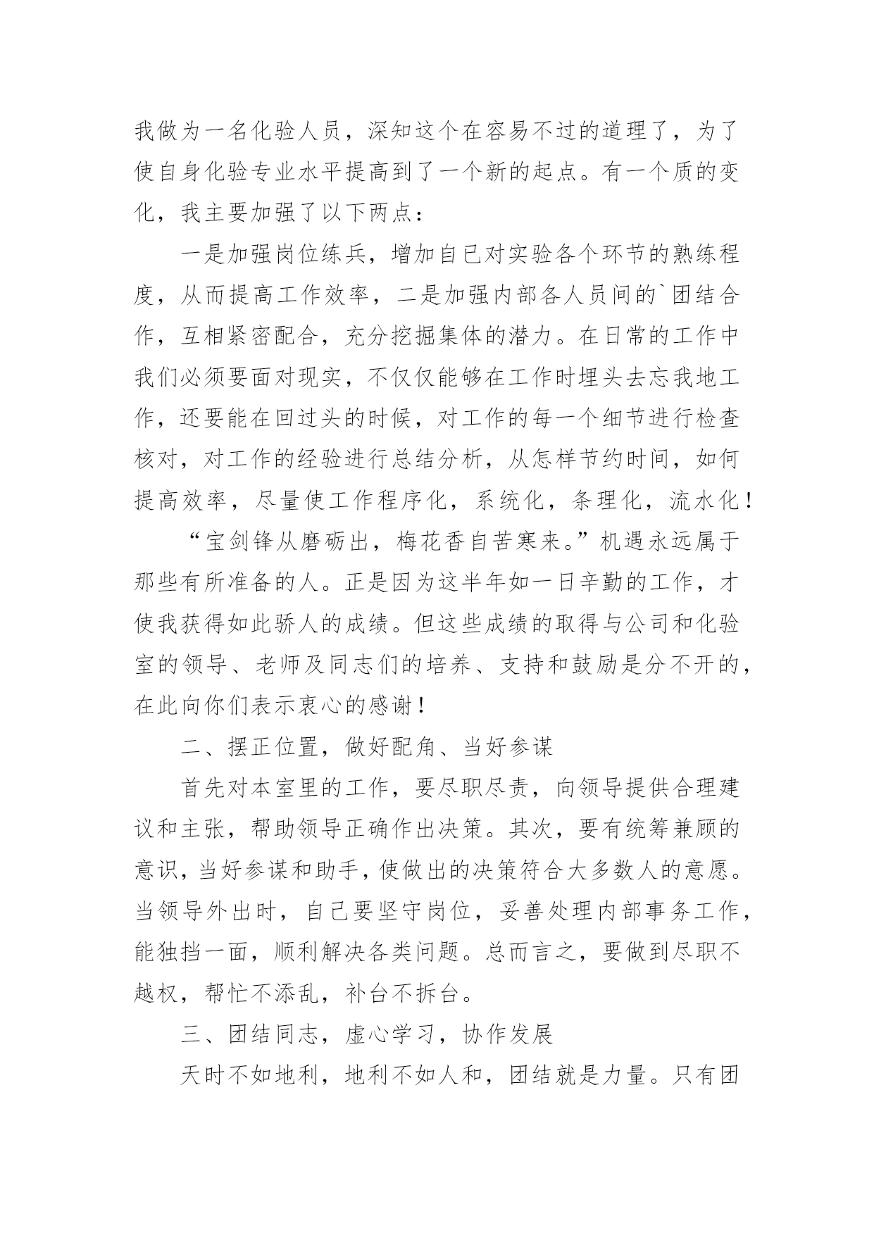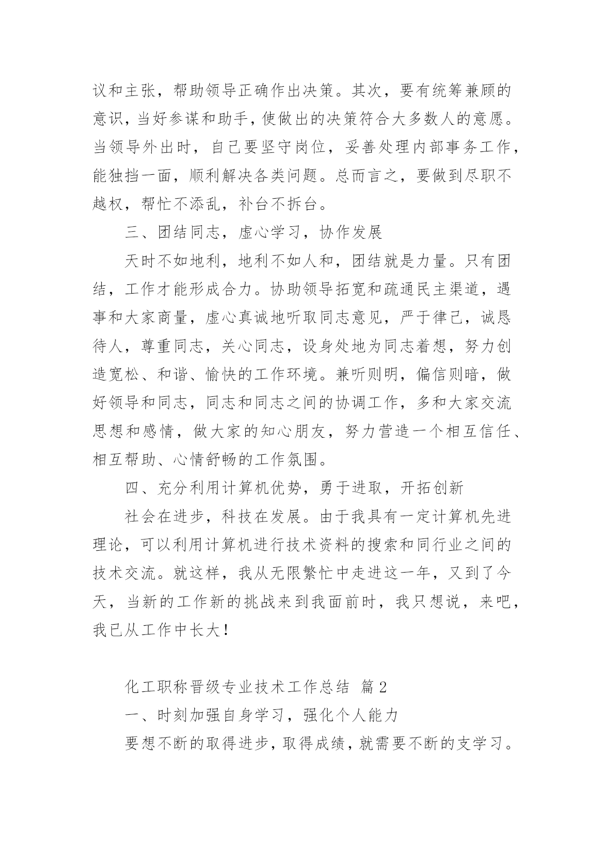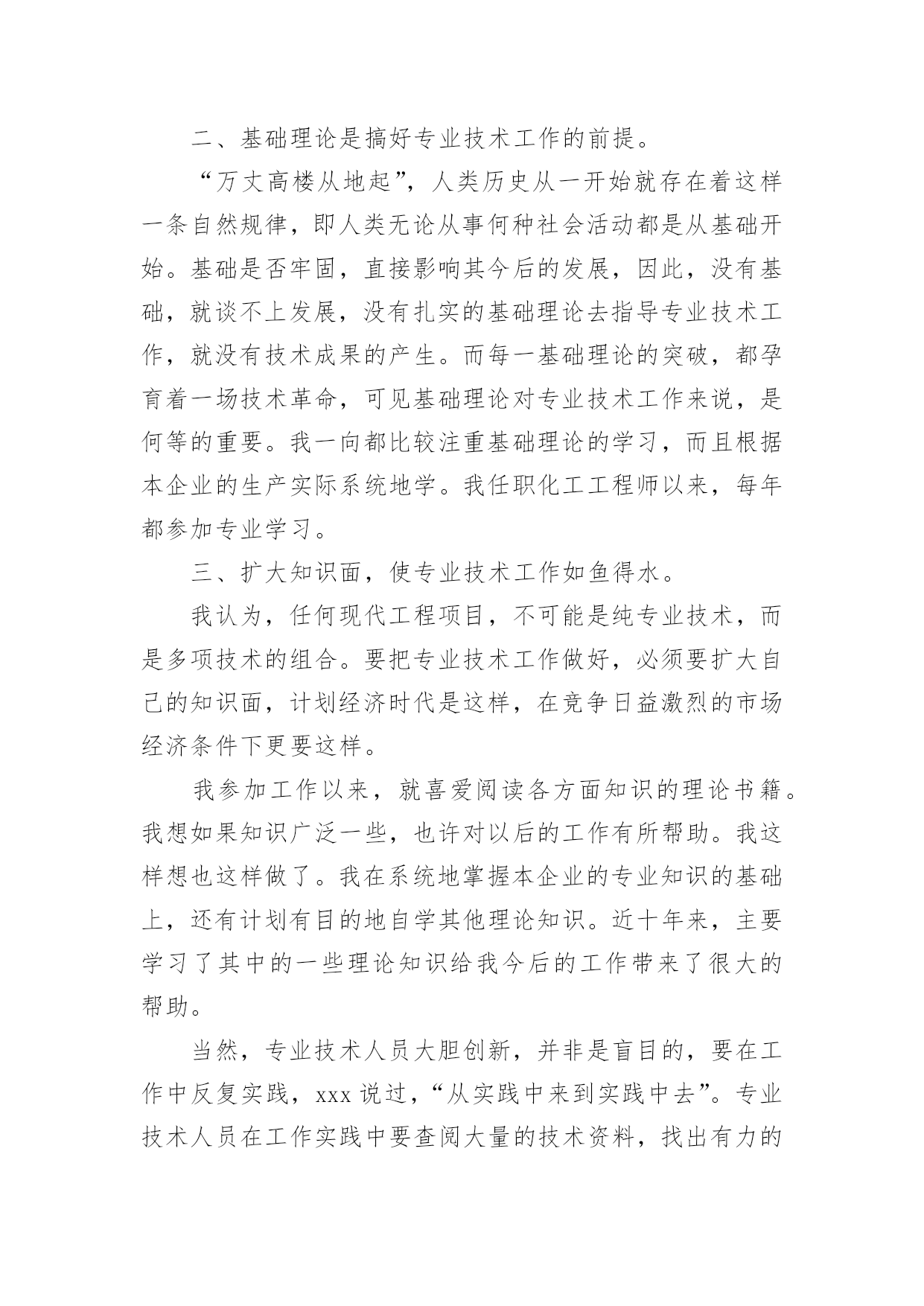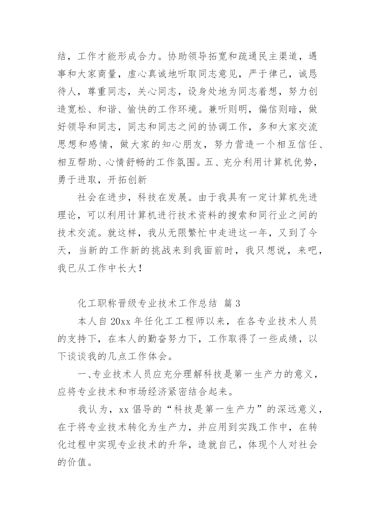 化工职称晋级专业技术工作总结总结是在一段时间内对学习和工作生活等表现加以总结和概括的一种书面材料,它可使零星的、肤浅的、表面的感性认知上升到全面的、系统的、本质的理性认识上来,不妨坐下来好好写写总结吧。总结怎么写才不会千篇一律呢?以下是小编精心整理的化工职称晋级专业技术工作总结,欢迎大家分享。化工职称晋级专业技术工作总结篇1一、时刻加强自身学习,强化个人能力要想不断的取得进步,取得成绩,就需要不断的学习。我做为一名技术人员,深知这个在容易不过的道理了,为了使自身专业水平提高到了一个新的起点。有一个质的变化,我主要加强了以下两点:一是加强岗位练兵,增加自已对各个环节的熟练程度,从而提高工作效率,二是加强内部各人员间的团结合作,互相紧密配合,充分挖掘集体的潜力。在日常的工作中我们必须要面对现实,不仅仅能够在工作时埋下头去忘我地工作,还要能在回过头的'时候,对工作的每一个细节进行检查核对,对工作的经验进行总结分析,从怎样节约时间,如何提高效率,尽量使工作程序化,系统化,条理化,流水化!二、摆正位置,做好配角、当好参谋首先对本室里的工作,要尽职尽责,向领导提供合理建议和主张,帮助领导正确作出决策。其次,要有统筹兼顾的意识,当好参谋和助手,使做出的决策符合大多数人的意愿。当领导外出时,自己要坚守岗位,妥善处理内部事务工作,能独挡一面,顺利解决各类问题。总而言之,要做到尽职不越权,帮忙不添乱,补台不拆台。三、团结同志,虚心学习,协作发展天时不如地利,地利不如人和,团结就是力量。只有团结,工作才能形成合力。协助领导拓宽和疏通民主渠道,遇事和大家商量,虚心真诚地听取同志意见,严于律己,诚恳待人,尊重同志,关心同志,设身处地为同志着想,努力创造宽松、和谐、愉快的工作环境。兼听则明,偏信则暗,做好领导和同志,同志和同志之间的协调工作,多和大家交流思想和感情,做大家的知心朋友,努力营造一个相互信任、相互帮助、心情舒畅的工作氛围。四、充分利用计算机优势,勇于进取,开拓创新社会在进步,科技在发展。由于我具有一定计算机先进理论,可以利用计算机进行技术资料的搜索和同行业之间的技术交流。就这样,我从无限繁忙中走进这一年,又到了今天,当新的工作新的挑战来到我面前时,我只想说,来吧,我已从工作中长大!化工职称晋级专业技术工作总结篇2一、时刻加强自身学习,强化个人能力要想不断的取得进步,取得成绩,就需要不断的支学习。我做为一名化验人员,深知这个在容易不过的道理了,为了使自身化验专业水平提高到了一个新的起点。有一个质的变化,我主要加强了以下两点:一是加强岗位练兵,增加自已对实验各个环节的熟练程度,从而提高工作效率,二是加强内部各人员间的`团结合作,互相紧密配合,充分挖掘集体的潜力。在日常的工作中我们必须要面对现实,不仅仅能够在工作时埋头去忘我地工作,还要能在回过头的时候,对工作的每一个细节进行检查核对,对工作的经验进行总结分析,从怎样节约时间,如何提高效率,尽量使工作程序化,系统化,条理化,流水化!“宝剑锋从磨砺出,梅花香自苦寒来。”机遇永远属于那些有所准备的人。正是因为这半年如一日辛勤的工作,才使我获得如此骄人的成绩。但这些成绩的取得与公司和化验室的领导、老师及同志们的培养、支持和鼓励是分不开的,在此向你们表示衷心的感谢!二、摆正位置,做好配角、当好参谋首先对本室里的工作,要尽职尽责,向领导提供合理建议和主张,帮助领导正确作出决策。其次,要有统筹兼顾的意识,当好参谋和助手,使做出的决策符合大多数人的意愿。当领导外出时,自己要坚守岗位,妥善处理内部事务工作,能独挡一面,顺利解决各类问题。总而言之,要做到尽职不越权,帮忙不添乱,补台不拆台。三、团结同志,虚心学习,协作发展天时不如地利,地利不如人和,团结就是力量。只有团结,工作才能形成合力。协助领导拓宽和疏通民主渠道,遇事和大家商量,虚心真诚地听取同志意见,严于律己,诚恳待人,尊重同志,关心同志,设身处地为同志着想,努力创造宽松、和谐、愉快的工作环境。兼听则明,偏信则暗,做好领导和同志,同志和同志之间的协调工作,多和大家交流思想和感情,做大家的知心朋友,努力营造一个相互信任、相互帮助、心情舒畅的工作氛围。五、充分利用计算机优势,勇于进取,开拓创新社会在进步,科技在发展。由于我具有一定计算机先进理论,可以利用计算机进行技术资料的搜索和同行业之间的技术交流。就这样,我从无限繁忙中走进这一年,又到了今天,当新的工作新的挑战来到我面前时,我只想说,来吧,我已从工作中长大!化工职称晋级专业技术工作总结篇3本人自20xx年任化工工程师以来,在各专业技术人员的支持下,在本人的勤奋努力下,工作取得了一些成绩,以下谈谈我的几点工作体会。一、专业技术人员应充分理解科技是第一生产力的意义,应将专业技术和市场经济紧密结合起来。我认为,xx
