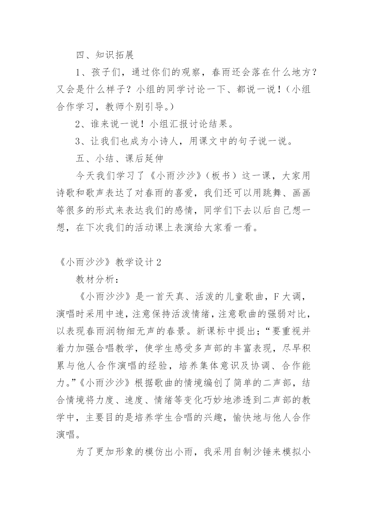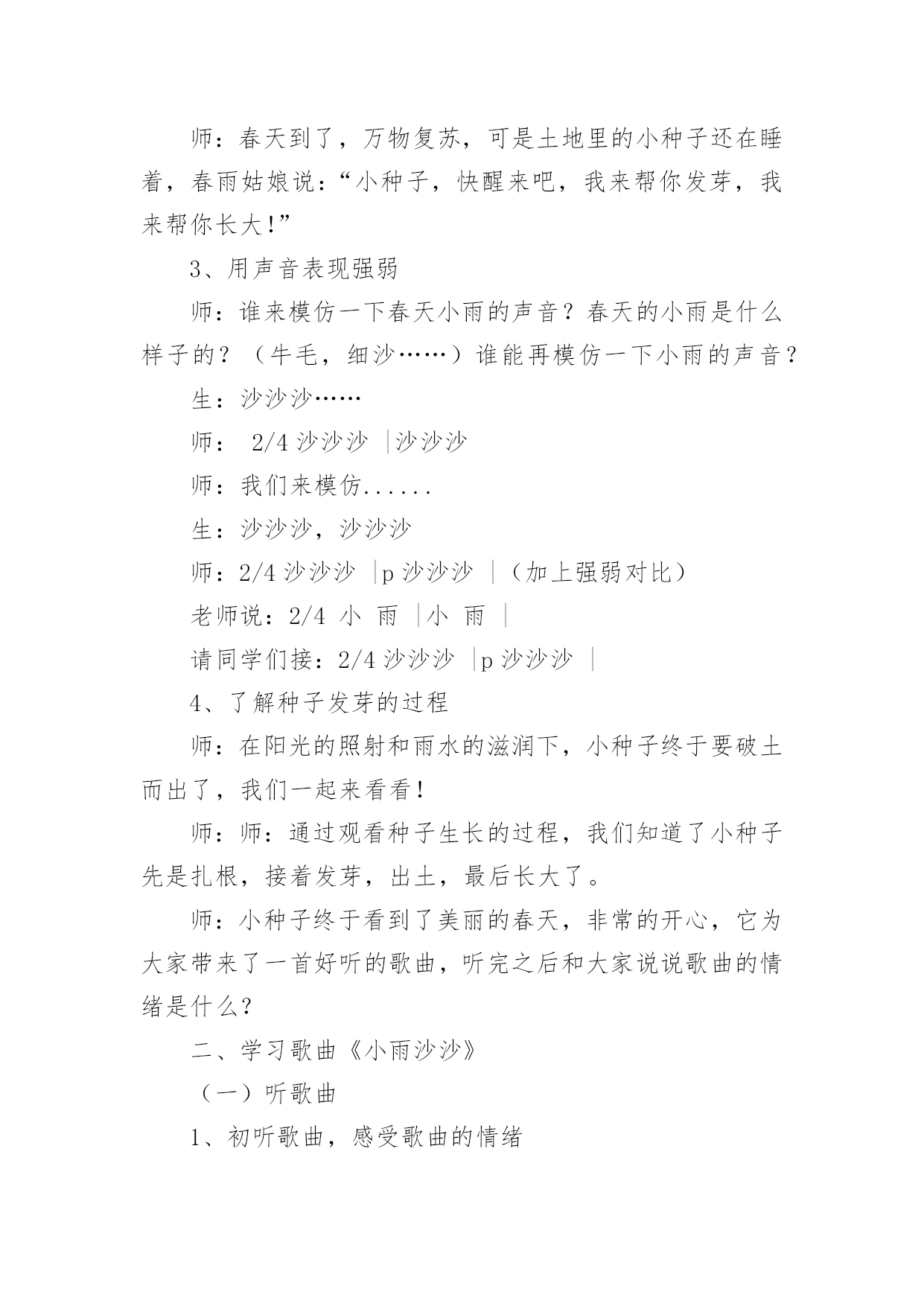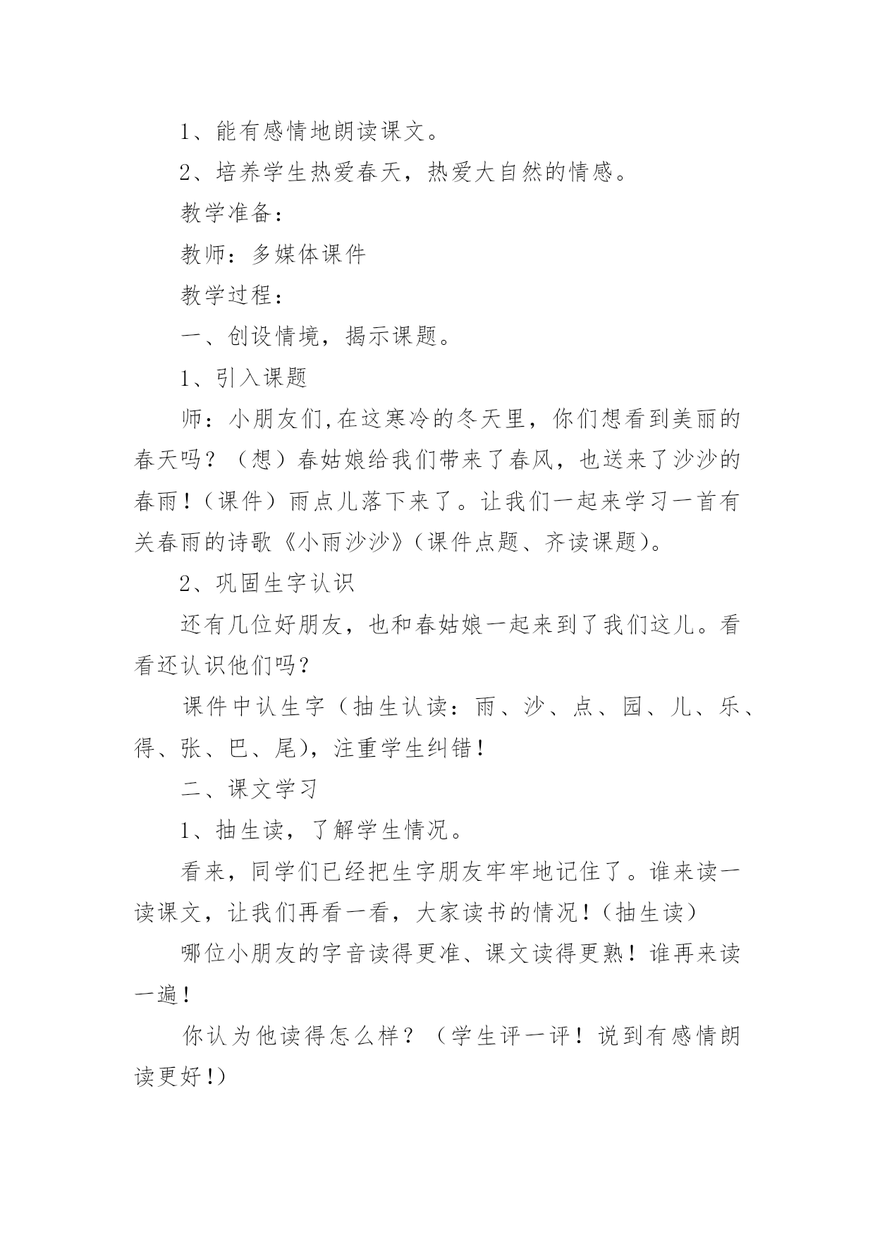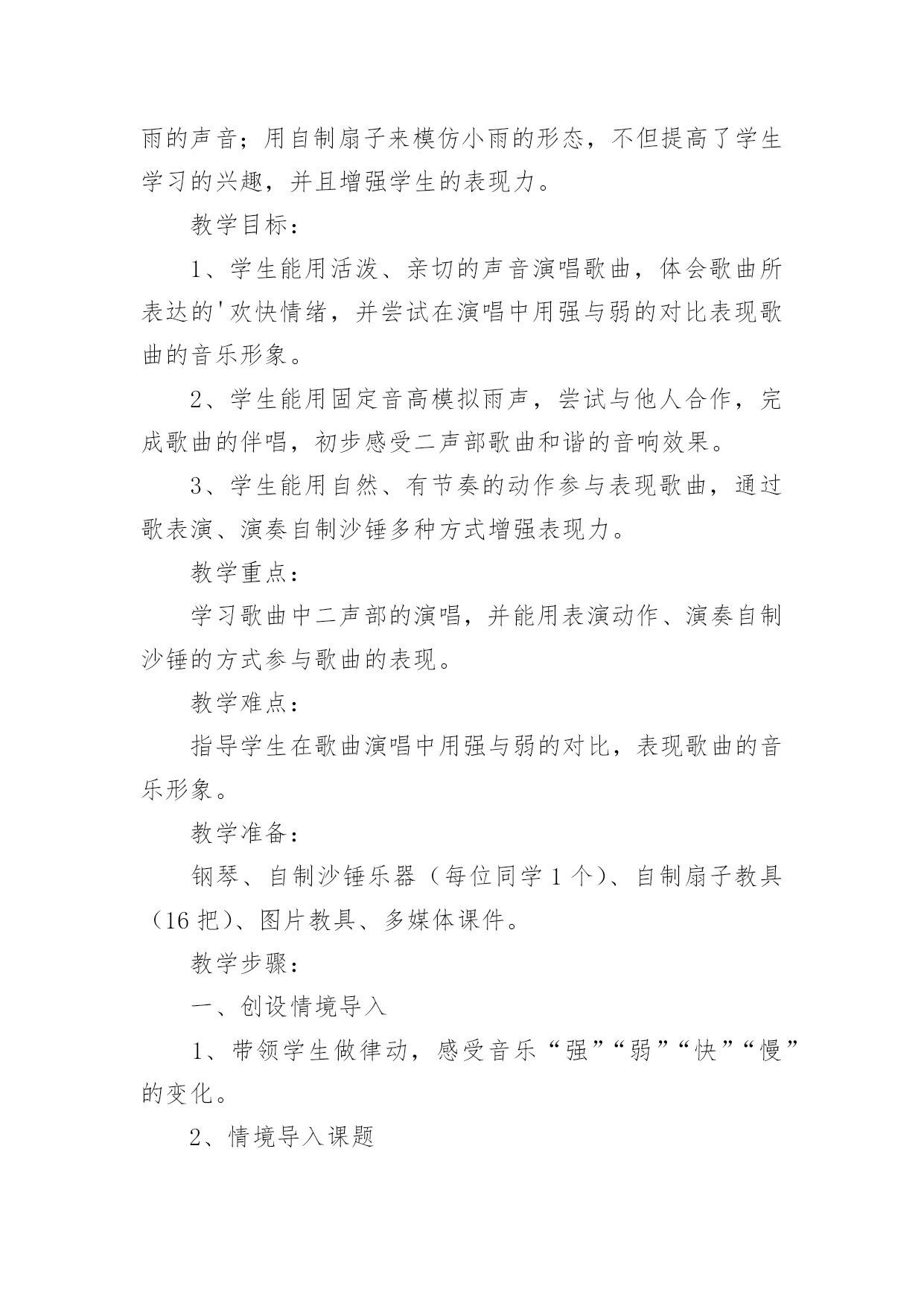 《小雨沙沙》教学设计《小雨沙沙》教学设计12篇作为一名教职工,时常需要用到教学设计,教学设计是一个系统设计并实现学习目标的过程,它遵循学习效果最优的原则吗,是课件开发质量高低的关键所在。那要怎么写好教学设计呢?以下是小编为大家收集的《小雨沙沙》教学设计,仅供参考,大家一起来看看吧。《小雨沙沙》教学设计1教学课题:小雨沙沙教学课时:本课第二课时教学内容:西师版小语教材第一册教学要求:1、能正确、连贯,有感情地朗读课文。2、能将创设的情境与生活实践相结合,体验春天的美丽。3、通过反复朗读体会春雨滋润万物的美好情景,产生热爱春天,热爱大自然的情感。4、可以背诵课文。教学重、难点:1、能有感情地朗读课文。2、培养学生热爱春天,热爱大自然的情感。教学准备:教师:多媒体课件教学过程:一、创设情境,揭示课题。1、引入课题师:小朋友们,在这寒冷的冬天里,你们想看到美丽的春天吗?(想)春姑娘给我们带来了春风,也送来了沙沙的春雨!(课件)雨点儿落下来了。让我们一起来学习一首有关春雨的诗歌《小雨沙沙》(课件点题、齐读课题)。2、巩固生字认识还有几位好朋友,也和春姑娘一起来到了我们这儿。看看还认识他们吗?课件中认生字(抽生认读:雨、沙、点、园、儿、乐、得、张、巴、尾),注重学生纠错!二、课文学习1、抽生读,了解学生情况。看来,同学们已经把生字朋友牢牢地记住了。谁来读一读课文,让我们再看一看,大家读书的情况!(抽生读)哪位小朋友的字音读得更准、课文读得更熟!谁再来读一遍!你认为他读得怎么样?(学生评一评!说到有感情朗读更好!)2、小组读,互助交流学习。请小朋友们在小组中读一读,比一比谁读得最好!(老师巡视指导)3、重点读,引导情感体会。这篇课文太美了!谁来,把你最喜欢读的哪一句,读给大家听一听?生读。小雨点落在哪儿?生答:花园里(鱼池、田野,板书)(点出相应课件)你还知道什么呢?生答:花儿乐得张嘴巴。(鱼儿、苗儿简笔画板书)加重动词语气!(张、摇、拔,板书)怎样得张嘴巴?生答:乐得!哪你能带着这种乐的心情再来读一次吗?谁再来把这种乐的心情读出来!读得很好!我们一起来试一试!齐读某段。(喜欢这段的同学一起读一读!同桌的一起读!分组赛读!多形式组织学生有感情地读!)其余同上学习模式,注重朗读形式和指导。4、有感情读,升华读的意义。5、结合板书,背诵课文。三、律动《小雨沙沙》孩子们,你们觉得春天的小雨美吗?哇!真是太美了,老师都忍不住想唱一唱、跳一跳来表达对小雨的'喜爱了。好!让我们一起唱起来,跳起来吧!(课件)四、知识拓展1、孩子们,通过你们的观察,春雨还会落在什么地方?又会是什么样子?小组的同学讨论一下、都说一说!(小组合作学习,教师个别引导。)2、谁来说一说!小组汇报讨论结果。3、让我们也成为小诗人,用课文中的句子说一说。五、小结、课后延伸今天我们学习了《小雨沙沙》(板书)这一课,大家用诗歌和歌声表达了对春雨的喜爱,我们还可以用跳舞、画画等很多的形式来表达我们的感情,同学们下去以后自己想一想,在下次我们的活动课上表演给大家看一看。《小雨沙沙》教学设计2教材分析:《小雨沙沙》是一首天真、活泼的儿童歌曲,F大调,演唱时采用中速,注意保持活泼情绪,注意歌曲的强弱对比,以表现春雨润物细无声的春景。新课标中提出;“要重视并着力加强合唱教学,使学生感受多声部的丰富表现,尽早积累与他人合作演唱的经验,培养集体意识及协调、合作能力。”《小雨沙沙》根据歌曲的情境编创了简单的二声部,结合情境将力度、速度、情绪等变化巧妙地渗透到二声部的教学中,主要目的是培养学生合唱的兴趣,愉快地与他人合作演唱。为了更加形象的模仿出小雨,我采用自制沙锤来模拟小雨的声音;用自制扇子来模仿小雨的形态,不但提高了学生学习的兴趣,并且增强学生的表现力。教学目标:1、学生能用活泼、亲切的声音演唱歌曲,体会歌曲所表达的'欢快情绪,并尝试在演唱中用强与弱的对比表现歌曲的音乐形象。2、学生能用固定音高模拟雨声,尝试与他人合作,完成歌曲的伴唱,初步感受二声部歌曲和谐的音响效果。3、学生能用自然、有节奏的动作参与表现歌曲,通过歌表演、演奏自制沙锤多种方式增强表现力。教学重点:学习歌曲中二声部的演唱,并能用表演动作、演奏自制沙锤的方式参与歌曲的表现。教学难点:指导学生在歌曲演唱中用强与弱的对比,表现歌曲的音乐形象。教学准备:钢琴、自制沙锤乐器(每位同学1个)、自制扇子教具(16把)、图片教具、多媒体课件。教学步骤:一、创设情境导入1、带领学生做律动,感受音乐“强”“弱”“快”“慢”的变化。2、情境导入课题师:春天到了,万物复苏,可是土地里的小种子还在睡着,春雨姑娘说:“小种子,快醒来吧,我来帮你发芽,我来帮你长大!”3、用声音表现强弱师:谁来模仿一下春天小雨的声音?春天的小雨是什么样子的?(牛毛,细沙……)谁