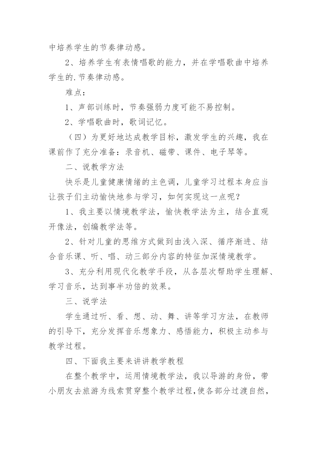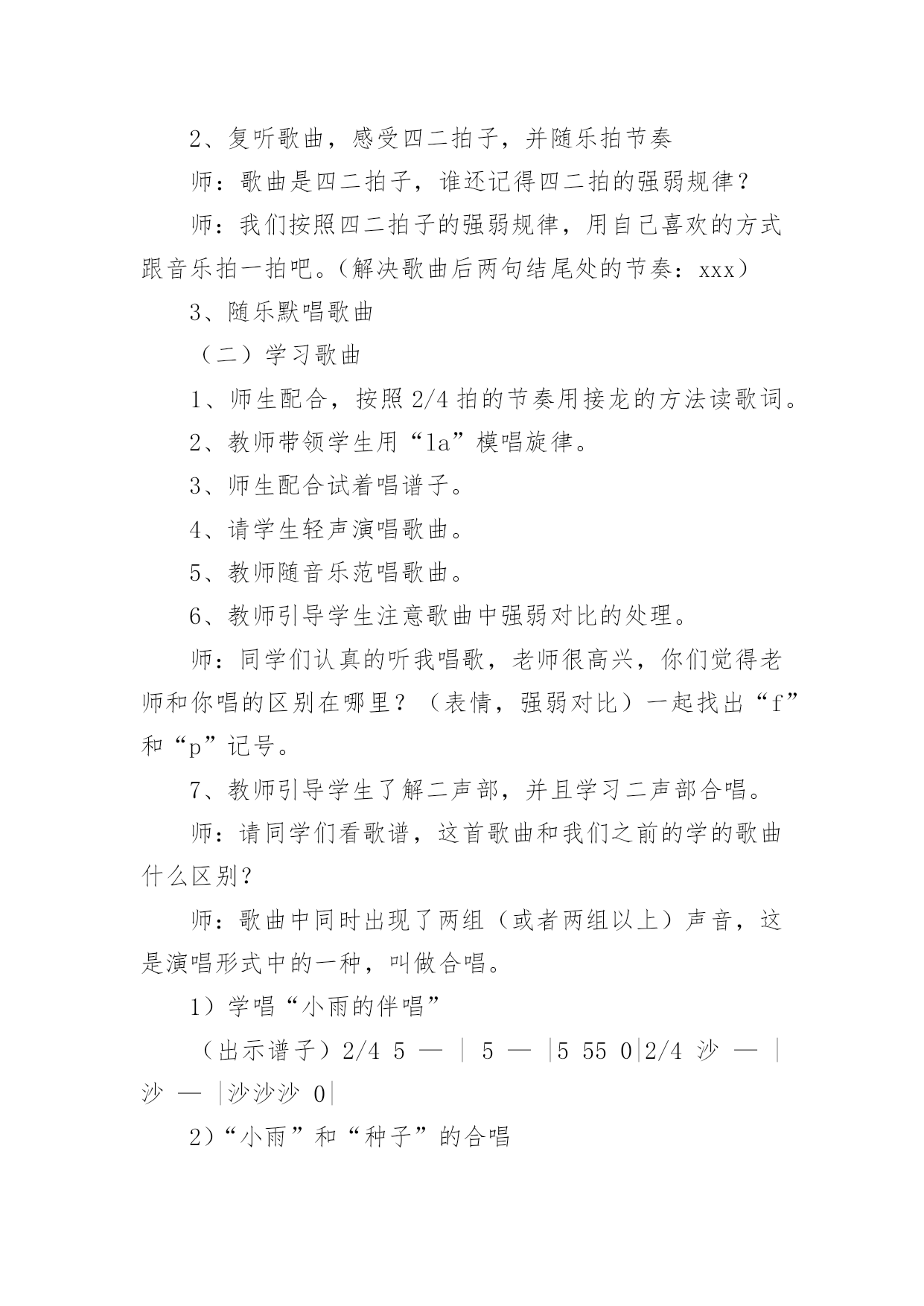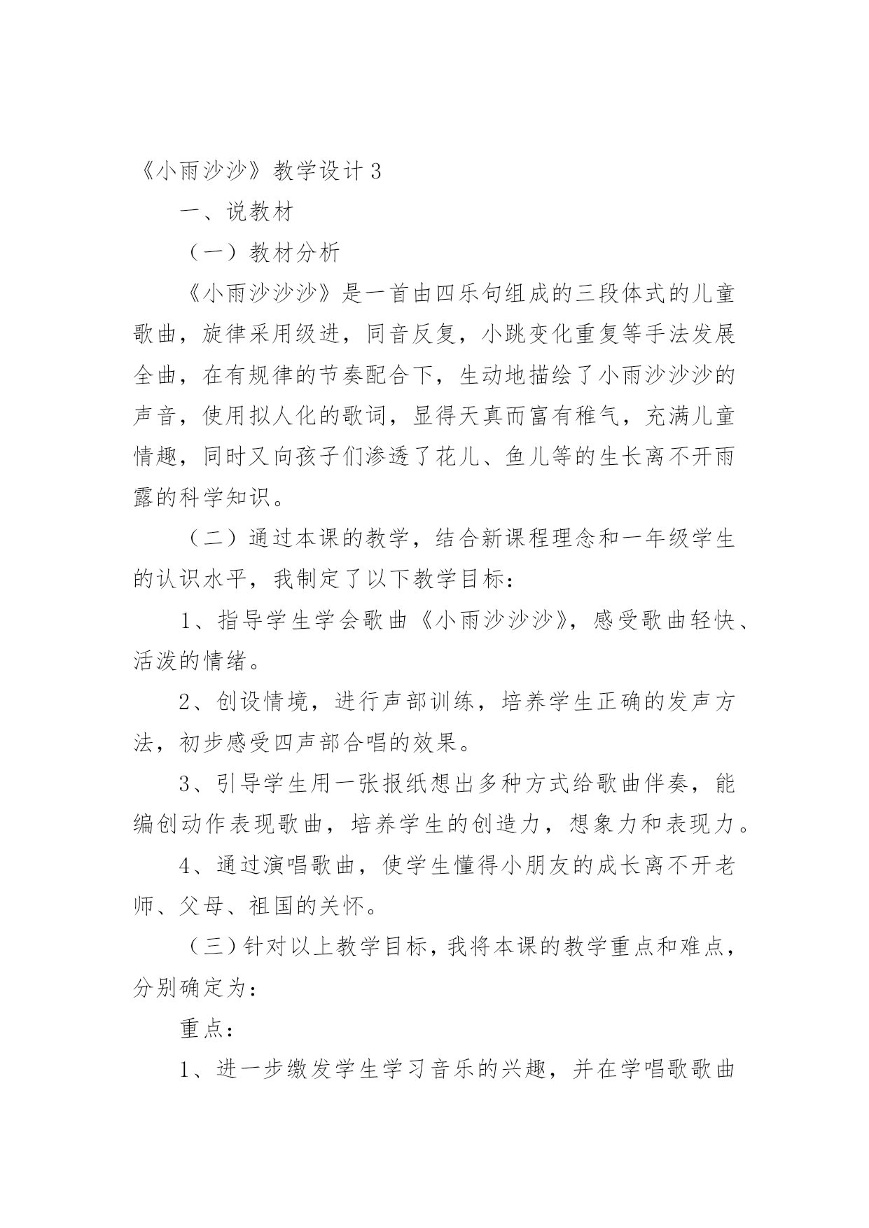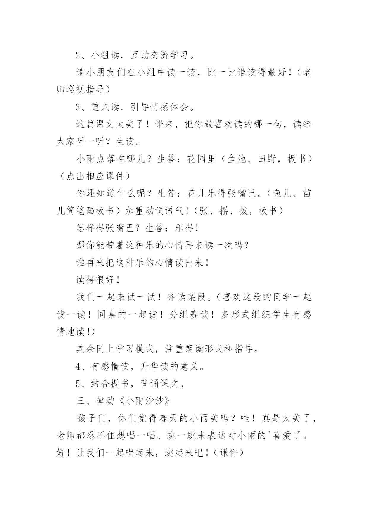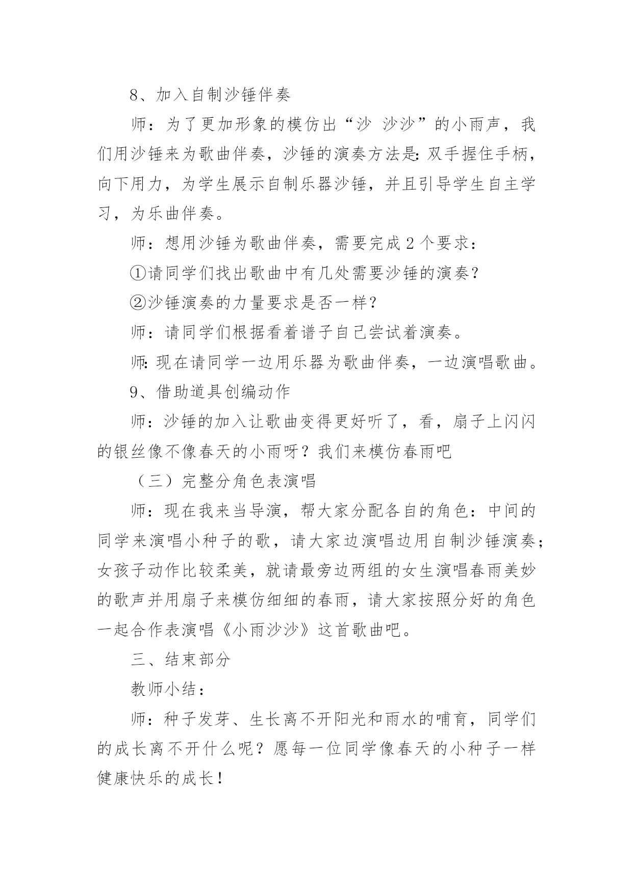 《小雨沙沙》教学设计《小雨沙沙》教学设计12篇作为一名教职工,时常需要用到教学设计,教学设计是一个系统设计并实现学习目标的过程,它遵循学习效果最优的原则吗,是课件开发质量高低的关键所在。那要怎么写好教学设计呢?以下是小编为大家收集的《小雨沙沙》教学设计,仅供参考,大家一起来看看吧。《小雨沙沙》教学设计1教学课题:小雨沙沙教学课时:本课第二课时教学内容:西师版小语教材第一册教学要求:1、能正确、连贯,有感情地朗读课文。2、能将创设的情境与生活实践相结合,体验春天的美丽。3、通过反复朗读体会春雨滋润万物的美好情景,产生热爱春天,热爱大自然的情感。4、可以背诵课文。教学重、难点:1、能有感情地朗读课文。2、培养学生热爱春天,热爱大自然的情感。教学准备:教师:多媒体课件教学过程:一、创设情境,揭示课题。1、引入课题师:小朋友们,在这寒冷的冬天里,你们想看到美丽的春天吗?(想)春姑娘给我们带来了春风,也送来了沙沙的春雨!(课件)雨点儿落下来了。让我们一起来学习一首有关春雨的诗歌《小雨沙沙》(课件点题、齐读课题)。2、巩固生字认识还有几位好朋友,也和春姑娘一起来到了我们这儿。看看还认识他们吗?课件中认生字(抽生认读:雨、沙、点、园、儿、乐、得、张、巴、尾),注重学生纠错!二、课文学习1、抽生读,了解学生情况。看来,同学们已经把生字朋友牢牢地记住了。谁来读一读课文,让我们再看一看,大家读书的情况!(抽生读)哪位小朋友的字音读得更准、课文读得更熟!谁再来读一遍!你认为他读得怎么样?(学生评一评!说到有感情朗读更好!)2、小组读,互助交流学习。请小朋友们在小组中读一读,比一比谁读得最好!(老师巡视指导)3、重点读,引导情感体会。这篇课文太美了!谁来,把你最喜欢读的哪一句,读给大家听一听?生读。小雨点落在哪儿?生答:花园里(鱼池、田野,板书)(点出相应课件)你还知道什么呢?生答:花儿乐得张嘴巴。(鱼儿、苗儿简笔画板书)加重动词语气!(张、摇、拔,板书)怎样得张嘴巴?生答:乐得!哪你能带着这种乐的心情再来读一次吗?谁再来把这种乐的心情读出来!读得很好!我们一起来试一试!齐读某段。(喜欢这段的同学一起读一读!同桌的一起读!分组赛读!多形式组织学生有感情地读!)其余同上学习模式,注重朗读形式和指导。4、有感情读,升华读的意义。5、结合板书,背诵课文。三、律动《小雨沙沙》孩子们,你们觉得春天的小雨美吗?哇!真是太美了,老师都忍不住想唱一唱、跳一跳来表达对小雨的'喜爱了。好!让我们一起唱起来,跳起来吧!(课件)四、知识拓展1、孩子们,通过你们的观察,春雨还会落在什么地方?又会是什么样子?小组的同学讨论一下、都说一说!(小组合作学习,教师个别引导。)2、谁来说一说!小组汇报讨论结果。3、让我们也成为小诗人,用课文中的句子说一说。五、小结、课后延伸今天我们学习了《小雨沙沙》(板书)这一课,大家用诗歌和歌声表达了对春雨的喜爱,我们还可以用跳舞、画画等很多的形式来表达我们的感情,同学们下去以后自己想一想,在下次我们的活动课上表演给大家看一看。《小雨沙沙》教学设计2教材分析:《小雨沙沙》是一首天真、活泼的儿童歌曲,F大调,演唱时采用中速,注意保持活泼情绪,注意歌曲的强弱对比,以表现春雨润物细无声的春景。新课标中提出;“要重视并着力加强合唱教学,使学生感受多声部的丰富表现,尽早积累与他人合作演唱的经验,培养集体意识及协调、合作能力。”《小雨沙沙》根据歌曲的情境编创了简单的二声部,结合情境将力度、速度、情绪等变化巧妙地渗透到二声部的教学中,主要目的是培养学生合唱的兴趣,愉快地与他人合作演唱。为了更加形象的模仿出小雨,我采用自制沙锤来模拟小雨的声音;用自制扇子来模仿小雨的形态,不但提高了学生学习的兴趣,并且增强学生的表现力。教学目标:1、学生能用活泼、亲切的声音演唱歌曲,体会歌曲所表达的'欢快情绪,并尝试在演唱中用强与弱的对比表现歌曲的音乐形象。2、学生能用固定音高模拟雨声,尝试与他人合作,完成歌曲的伴唱,初步感受二声部歌曲和谐的音响效果。3、学生能用自然、有节奏的动作参与表现歌曲,通过歌表演、演奏自制沙锤多种方式增强表现力。教学重点:学习歌曲中二声部的演唱,并能用表演动作、演奏自制沙锤的方式参与歌曲的表现。教学难点:指导学生在歌曲演唱中用强与弱的对比,表现歌曲的音乐形象。教学准备:钢琴、自制沙锤乐器(每位同学1个)、自制扇子教具(16把)、图片教具、多媒体课件。教学步骤:一、创设情境导入1、带领学生做律动,感受音乐“强”“弱”“快”“慢”的变化。2、情境导入课题师:春天到了,万物复苏,可是土地里的小种子还在睡着,春雨姑娘说:“小种子,快醒来吧,我来帮你发芽,我来帮你长大!”3、用声音表现强弱师:谁来模仿一下春天小雨的声音?春天的小雨是什么样子的?(牛毛,细沙……)谁
