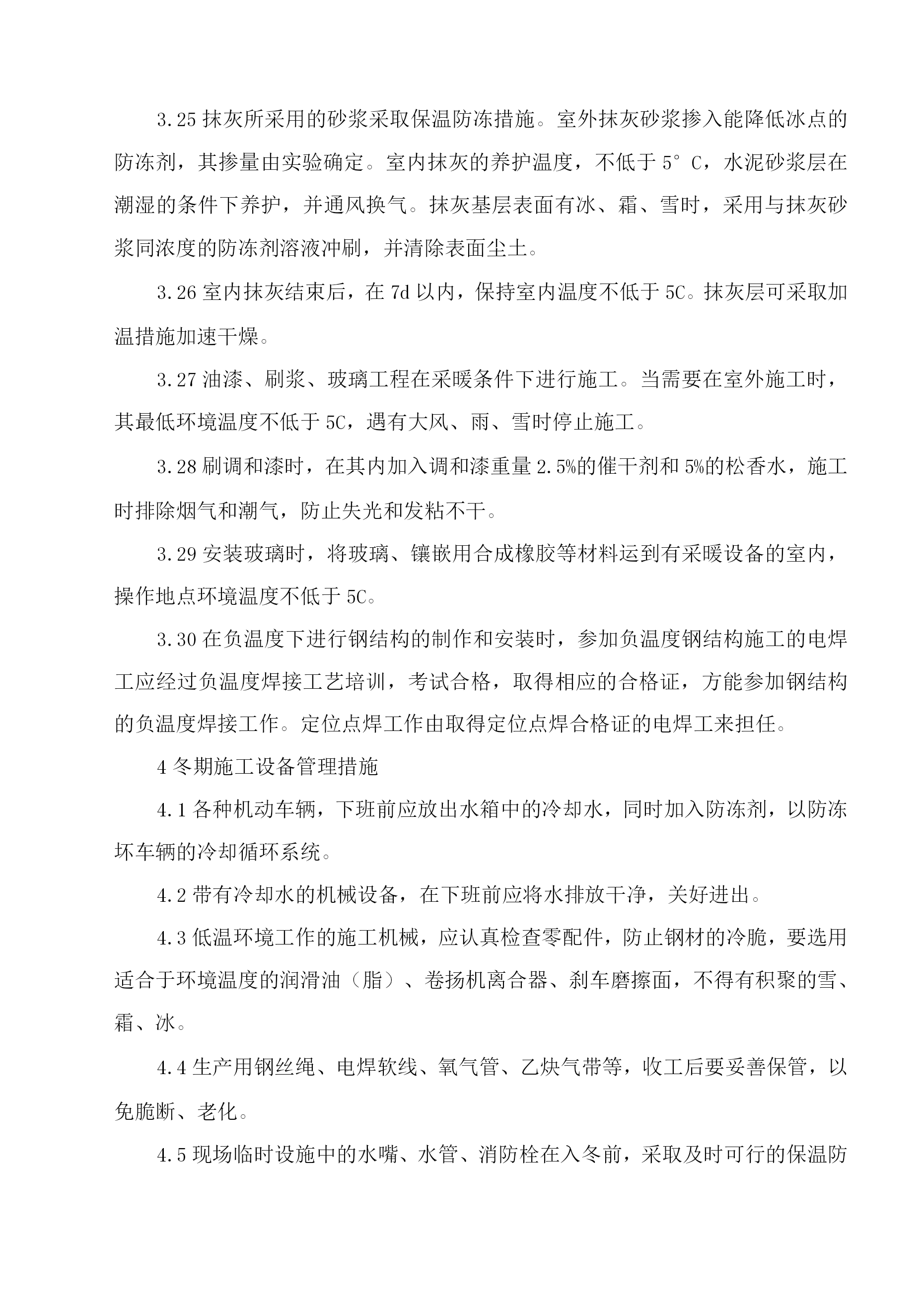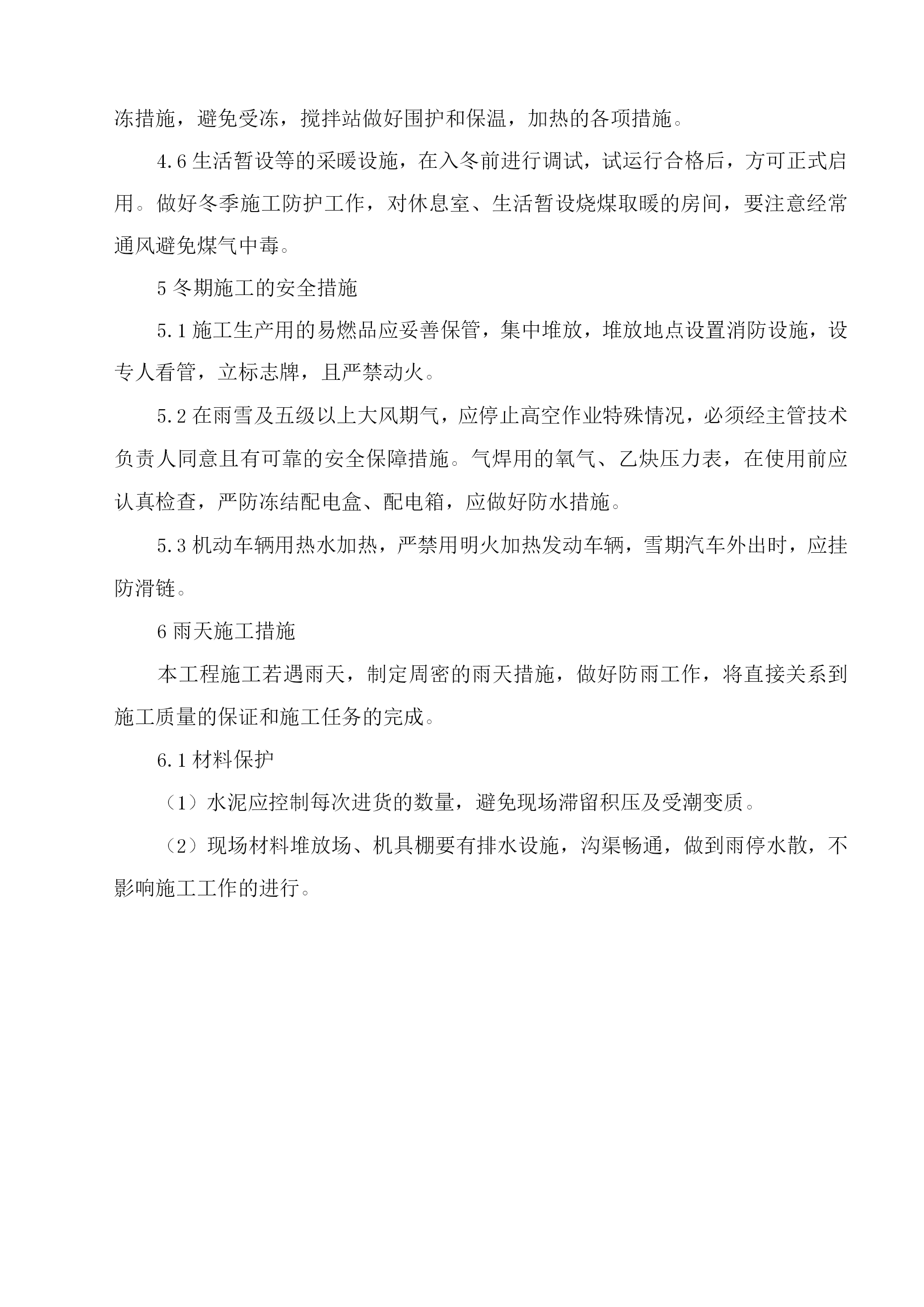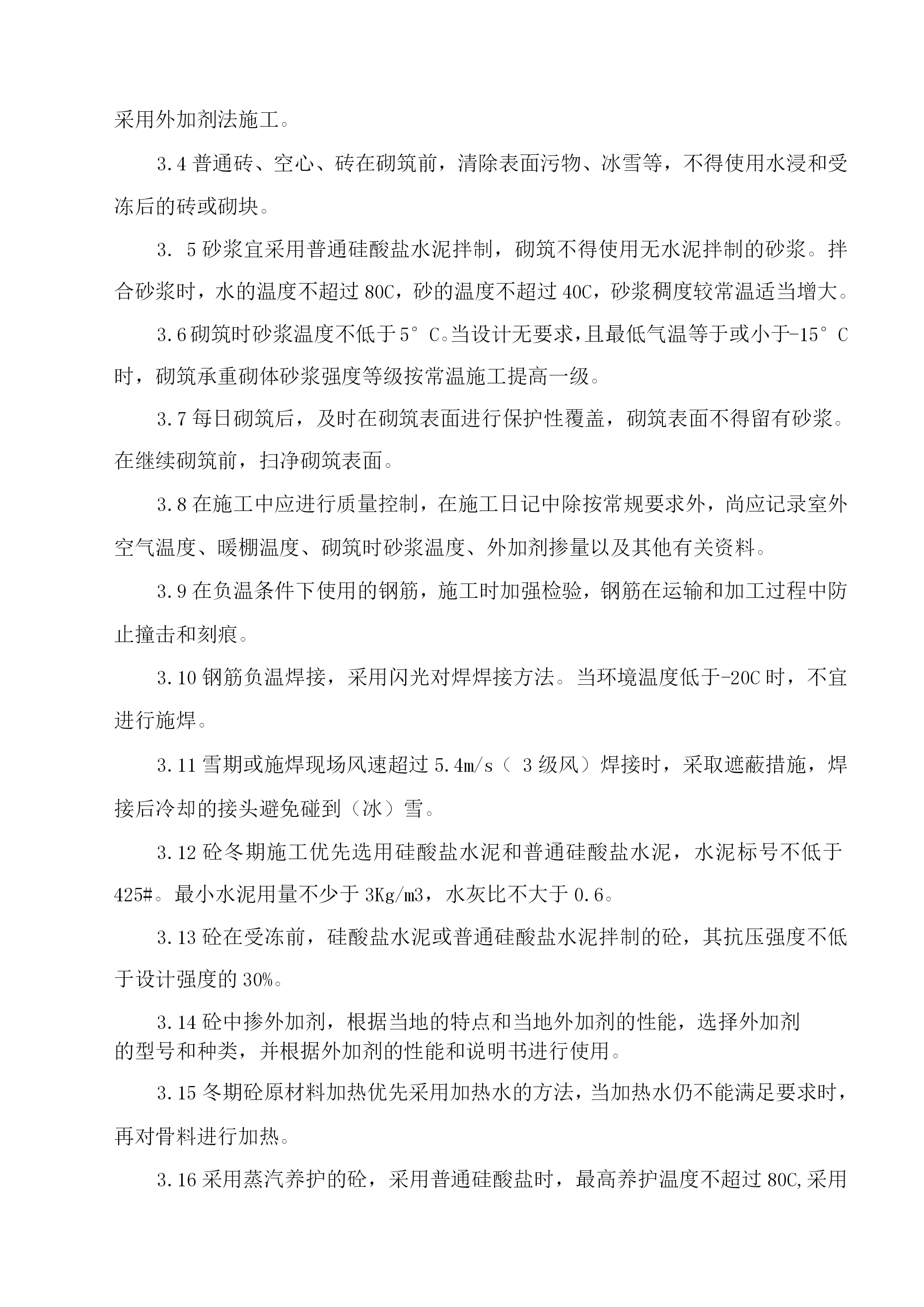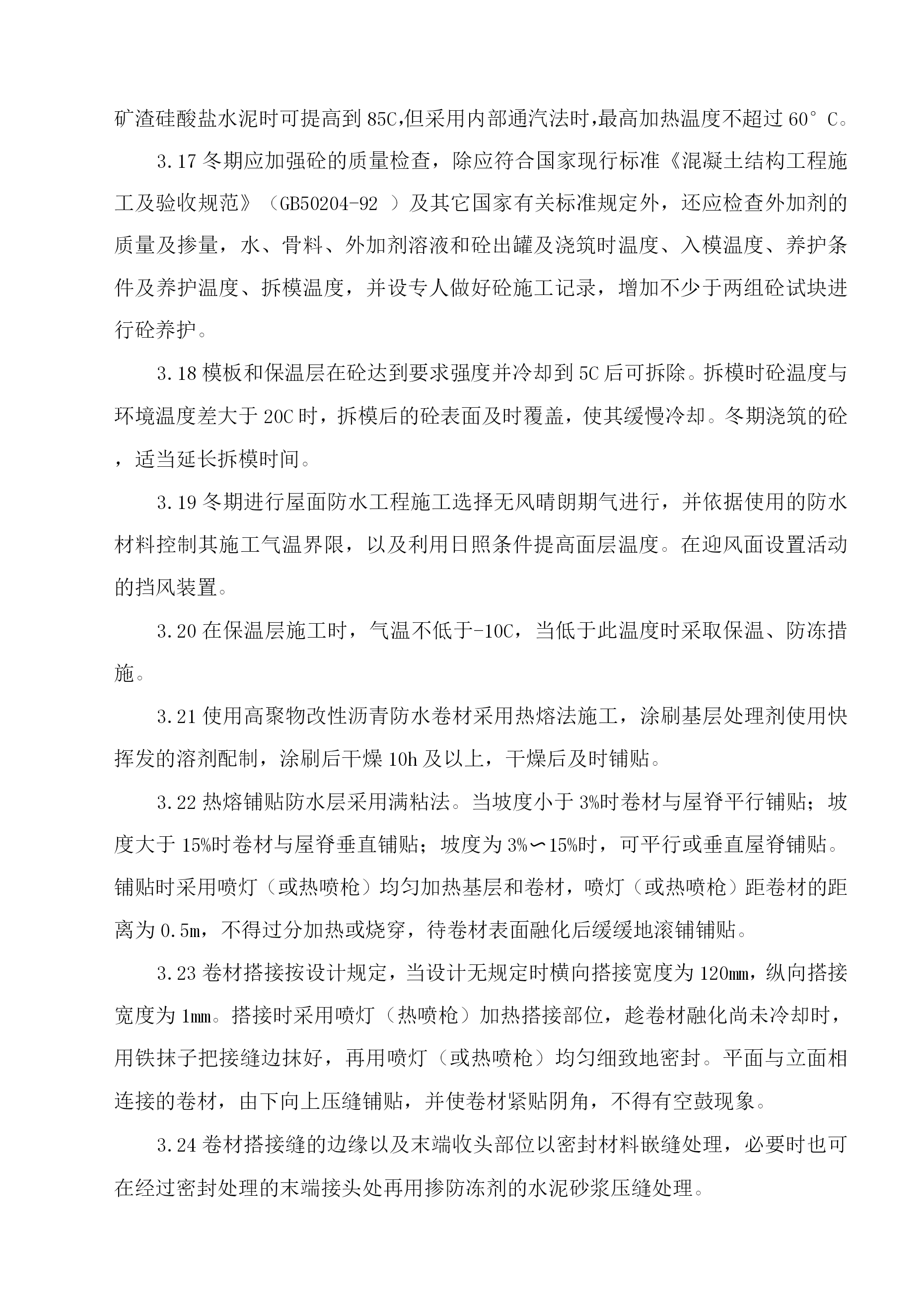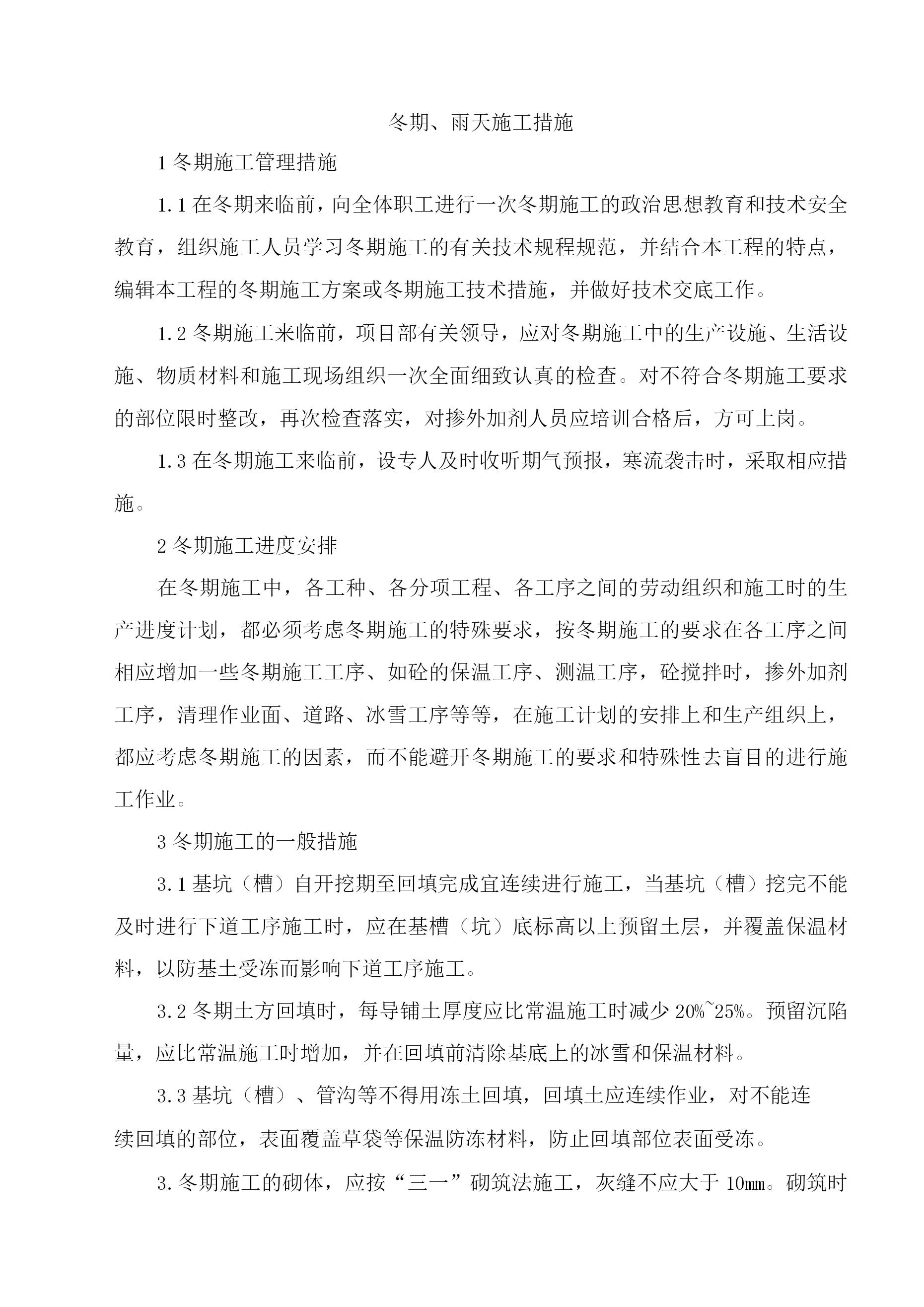 冬期、雨天施工措施1冬期施工管理措施1.1在冬期来临前,向全体职工进行一次冬期施工的政治思想教育和技术安全教育,组织施工人员学习冬期施工的有关技术规程规范,并结合本工程的特点,编辑本工程的冬期施工方案或冬期施工技术措施,并做好技术交底工作。1.2冬期施工来临前,项目部有关领导,应对冬期施工中的生产设施、生活设施、物质材料和施工现场组织一次全面细致认真的检查。对不符合冬期施工要求的部位限时整改,再次检查落实,对掺外加剂人员应培训合格后,方可上岗。1.3在冬期施工来临前,设专人及时收听期气预报,寒流袭击时,采取相应措施。2冬期施工进度安排在冬期施工中,各工种、各分项工程、各工序之间的劳动组织和施工时的生产进度计划,都必须考虑冬期施工的特殊要求,按冬期施工的要求在各工序之间相应增加一些冬期施工工序、如砼的保温工序、测温工序,砼搅拌时,掺外加剂工序,清理作业面、道路、冰雪工序等等,在施工计划的安排上和生产组织上,都应考虑冬期施工的因素,而不能避开冬期施工的要求和特殊性去盲目的进行施工作业。3冬期施工的一般措施3.1基坑(槽)自开挖期至回填完成宜连续进行施工,当基坑(槽)挖完不能及时进行下道工序施工时,应在基槽(坑)底标高以上预留土层,并覆盖保温材料,以防基土受冻而影响下道工序施工。3.2冬期土方回填时,每导铺土厚度应比常温施工时减少20%~25%。预留沉陷量,应比常温施工时增加,并在回填前清除基底上的冰雪和保温材料。3.3基坑(槽)、管沟等不得用冻土回填,回填土应连续作业,对不能连续回填的部位,表面覆盖草袋等保温防冻材料,防止回填部位表面受冻。3.冬期施工的砌体,应按“三一”砌筑法施工,灰缝不应大于10mm。砌筑时采用外加剂法施工。3.4普通砖、空心、砖在砌筑前,清除表面污物、冰雪等,不得使用水浸和受冻后的砖或砌块。3.5砂浆宜采用普通硅酸盐水泥拌制,砌筑不得使用无水泥拌制的砂浆。拌合砂浆时,水的温度不超过80C,砂的温度不超过40C,砂浆稠度较常温适当增大。3.6砌筑时砂浆温度不低于5°C。当设计无要求,且最低气温等于或小于-15°C时,砌筑承重砌体砂浆强度等级按常温施工提高一级。3.7每日砌筑后,及时在砌筑表面进行保护性覆盖,砌筑表面不得留有砂浆。在继续砌筑前,扫净砌筑表面。3.8在施工中应进行质量控制,在施工日记中除按常规要求外,尚应记录室外空气温度、暖棚温度、砌筑时砂浆温度、外加剂掺量以及其他有关资料。3.9在负温条件下使用的钢筋,施工时加强检验,钢筋在运输和加工过程中防止撞击和刻痕。3.10钢筋负温焊接,采用闪光对焊焊接方法。当环境温度低于-20C时,不宜进行施焊。3.11雪期或施焊现场风速超过5.4m/s(3级风)焊接时,采取遮蔽措施,焊接后冷却的接头避免碰到(冰)雪。3.12砼冬期施工优先选用硅酸盐水泥和普通硅酸盐水泥,水泥标号不低于425#。最小水泥用量不少于3Kg/m3,水灰比不大于0.6。3.13砼在受冻前,硅酸盐水泥或普通硅酸盐水泥拌制的砼,其抗压强度不低于设计强度的30%。3.14砼中掺外加剂,根据当地的特点和当地外加剂的性能,选择外加剂的型号和种类,并根据外加剂的性能和说明书进行使用。3.15冬期砼原材料加热优先采用加热水的方法,当加热水仍不能满足要求时,再对骨料进行加热。3.16采用蒸汽养护的砼,采用普通硅酸盐时,最高养护温度不超过80C,采用矿渣硅酸盐水泥时可提高到85C,但采用内部通汽法时,最高加热温度不超过60°C。3.17冬期应加强砼的质量检查,除应符合国家现行标准《混凝土结构工程施工及验收规范》(GB50204-92)及其它国家有关标准规定外,还应检查外加剂的质量及掺量,水、骨料、外加剂溶液和砼出罐及浇筑时温度、入模温度、养护条件及养护温度、拆模温度,并设专人做好砼施工记录,增加不少于两组砼试块进行砼养护。3.18模板和保温层在砼达到要求强度并冷却到5C后可拆除。拆模时砼温度与环境温度差大于20C时,拆模后的砼表面及时覆盖,使其缓慢冷却。冬期浇筑的砼,适当延长拆模时间。3.19冬期进行屋面防水工程施工选择无风晴朗期气进行,并依据使用的防水材料控制其施工气温界限,以及利用日照条件提高面层温度。在迎风面设置活动的挡风装置。3.20在保温层施工时,气温不低于-10C,当低于此温度时采取保温、防冻措施。3.21使用高聚物改性沥青防水卷材采用热熔法施工,涂刷基层处理剂使用快挥发的溶剂配制,涂刷后干燥10h及以上,干燥后及时铺贴。3.22热熔铺贴防水层采用满粘法。当坡度小于3%时卷材与屋脊平行铺贴;坡度大于15%时卷材与屋脊垂直铺贴;坡度为3%〜15%时,可平行或垂直屋脊铺贴。铺贴时采用喷灯(或热喷枪)均匀加热基层和卷材,喷灯(或热喷枪)距卷材的