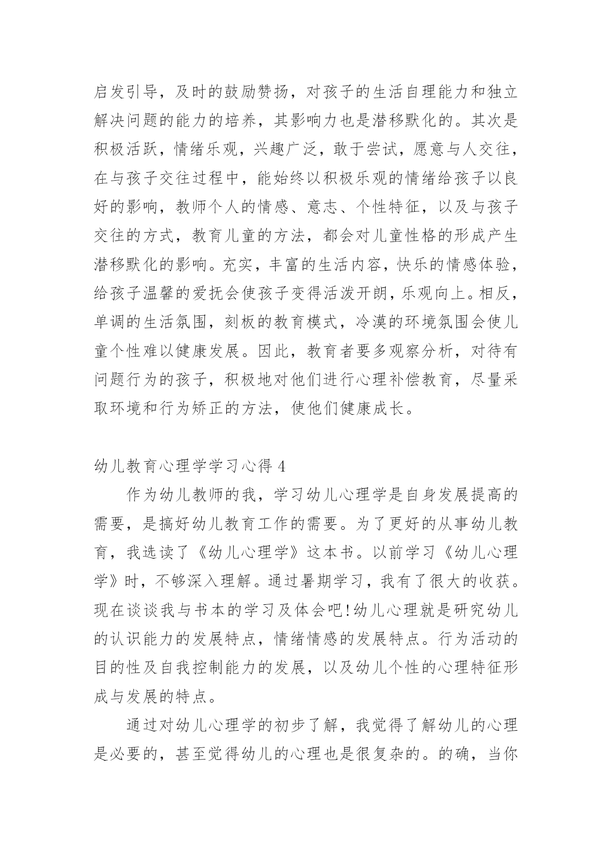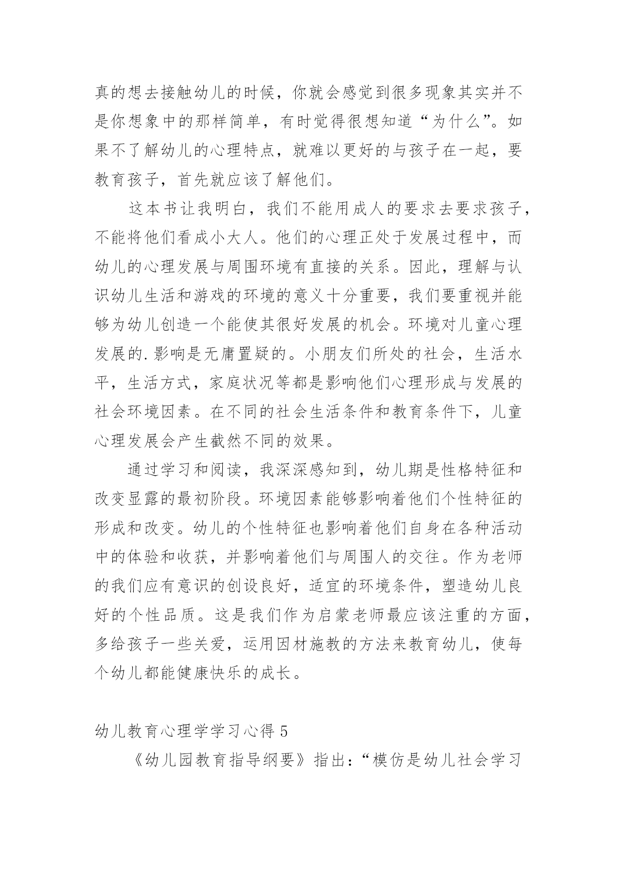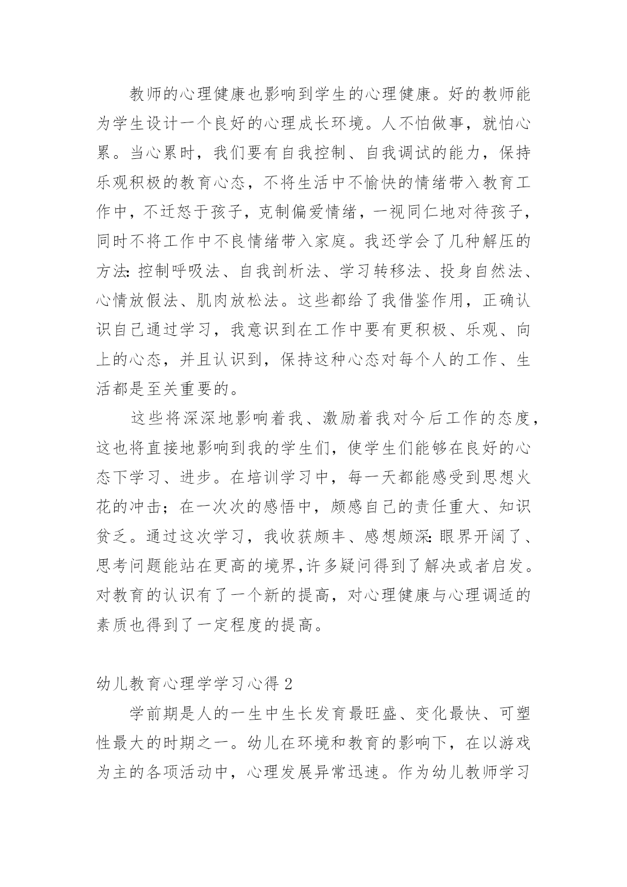 幼儿教育心理学学习心得我们从一些事情上得到感悟后,有这样的时机,要好好记录下来,这么做可以让我们不断思考不断进步。那么写心得体会要注意的内容有什么呢?下面是小编整理的幼儿教育心理学学习心得,供大家参考借鉴,希望可以帮助到有需要的朋友。幼儿教育心理学学习心得1学习了《幼儿教师的心理健康与心理调适》这一课程,本人受益匪浅。我觉得自己不仅学习到的是心理学的理论知识,而且让我更为自信更为坦然地接受一次次的挑战!在这次学习中,我认真倾听了教授与从事心理工作一线老师的讲座,他们都以实实在在的案例和具体丰富的知识内涵及精湛的理论阐述了心理健康这门学科的魅力所在,给了我强烈的.感染和深深的理论引领,并且通过理论学习、自我剖析等让我们意识到心理健康教育是一门提高学生心理素质的基础教育,同时也让我们知道,加强对学生的心理教育,可以减少甚至杜绝学生心理问题的发生。通过学习我还意识到要实现提高学生素质,促进学生的人格健全发展的目标,教师的作用是无可替代的,尤其是班主任。所以在这几天的学习中,我都认认真真地看教材,听讲座,做好笔记,学好心理健康方面的知识,帮助学生学习得更好,生活得更好!教师的心理健康也影响到学生的心理健康。好的教师能为学生设计一个良好的心理成长环境。人不怕做事,就怕心累。当心累时,我们要有自我控制、自我调试的能力,保持乐观积极的教育心态,不将生活中不愉快的情绪带入教育工作中,不迁怒于孩子,克制偏爱情绪,一视同仁地对待孩子,同时不将工作中不良情绪带入家庭。我还学会了几种解压的方法:控制呼吸法、自我剖析法、学习转移法、投身自然法、心情放假法、肌肉放松法。这些都给了我借鉴作用,正确认识自己通过学习,我意识到在工作中要有更积极、乐观、向上的心态,并且认识到,保持这种心态对每个人的工作、生活都是至关重要的。这些将深深地影响着我、激励着我对今后工作的态度,这也将直接地影响到我的学生们,使学生们能够在良好的心态下学习、进步。在培训学习中,每一天都能感受到思想火花的冲击;在一次次的感悟中,颇感自己的责任重大、知识贫乏。通过这次学习,我收获颇丰、感想颇深:眼界开阔了、思考问题能站在更高的境界,许多疑问得到了解决或者启发。对教育的认识有了一个新的提高,对心理健康与心理调适的素质也得到了一定程度的提高。幼儿教育心理学学习心得2学前期是人的一生中生长发育最旺盛、变化最快、可塑性最大的时期之一。幼儿在环境和教育的影响下,在以游戏为主的各项活动中,心理发展异常迅速。作为幼儿教师学习心理学是自身发展提高的需要,是搞好幼儿教育工作的需要。通过学习《幼儿心理学》,我深知:幼儿阶段是人生的'奠基阶段,而幼儿教师是年青一代最初的启蒙老师,在幼儿成长过程中起着主导作用。作为幼儿教师,首先是要做幼儿的朋友,在平等的关系中,教师是幼儿的伙伴,使幼儿在心理上得到安全、放松,让他们感觉生活在自由、尊重、平等、合作的气氛中,在这气氛中,让幼儿充分的活动,获得表达自己的欲望的能力和机会。我们班每个孩子的个性都不相同,有的孩子活泼大方,他们能主动表现自己,见到客人能主动打招呼,听到音乐就能翩翩起舞,为大家表演,这样的是我们所倡导的.。但是有些孩子,他们在幼儿园里比较活泼,一旦离开了他们熟悉的环境,或家里来了客人,或者幼儿园来了陌生人参观等等,他们便很胆怯,不敢说话。这种胆怯性格的形成,大多因为缺乏锻炼的机会,缺少表现自己的勇气的条件,如果不及时加以引导,将严重影响幼儿一生的发展。胆怯的幼儿往往没有勇气在众人面前讲话,或说话声音很小,为改变这种胆怯的性格,我们努力为幼儿提供"说"的机会,让幼儿在每个人面前表达自己欲望和自己的感情。幼儿教育心理学学习心得3充实丰富的生活内容,快乐的情感体验,给孩子温馨的爱抚会使孩子变得活泼开朗,乐观向上。相反,单调的生活氛围,刻板的教育模式,冷漠的环境氛围会使儿童个性难以健康发展。因此,教育者要多观察分析,对待有问题行为的孩子,积极地对他们进行心理补偿教育,尽量采取环境和行为矫正的方法,使他们健康成长。“促进幼儿的健康”是由幼儿健康的特有价值决定的。17世纪英国伟大的哲学家和启蒙思想家约翰。洛克认为:“人生幸福有一个简短而充分的描述:健全的心智寓于健全的身体。凡身体和心智都健全的人就不必再有什么别的奢望了;身体或心智如果有一方面不健全,那么即使得到了种种别的东西也是枉然。”心理健康教育必须从娃娃抓起,这已是广大教育工作者的一个共识。由于受到传统教育观念和文化的影响,儿童心理健康教育相对薄弱。而未来社会要求每个人都具有面对现实,不怕困难,开拓进取的精神,具有关心他人,家庭、社会、自然的意识和责任感,具有合作、交流能力和创新精神,具有自主、自信、自强的人格品质。那么,如何重视和加强儿童健康心理教育呢?首先,孩子不论大小,他都是一个实实在在的人,这就是说教育者
