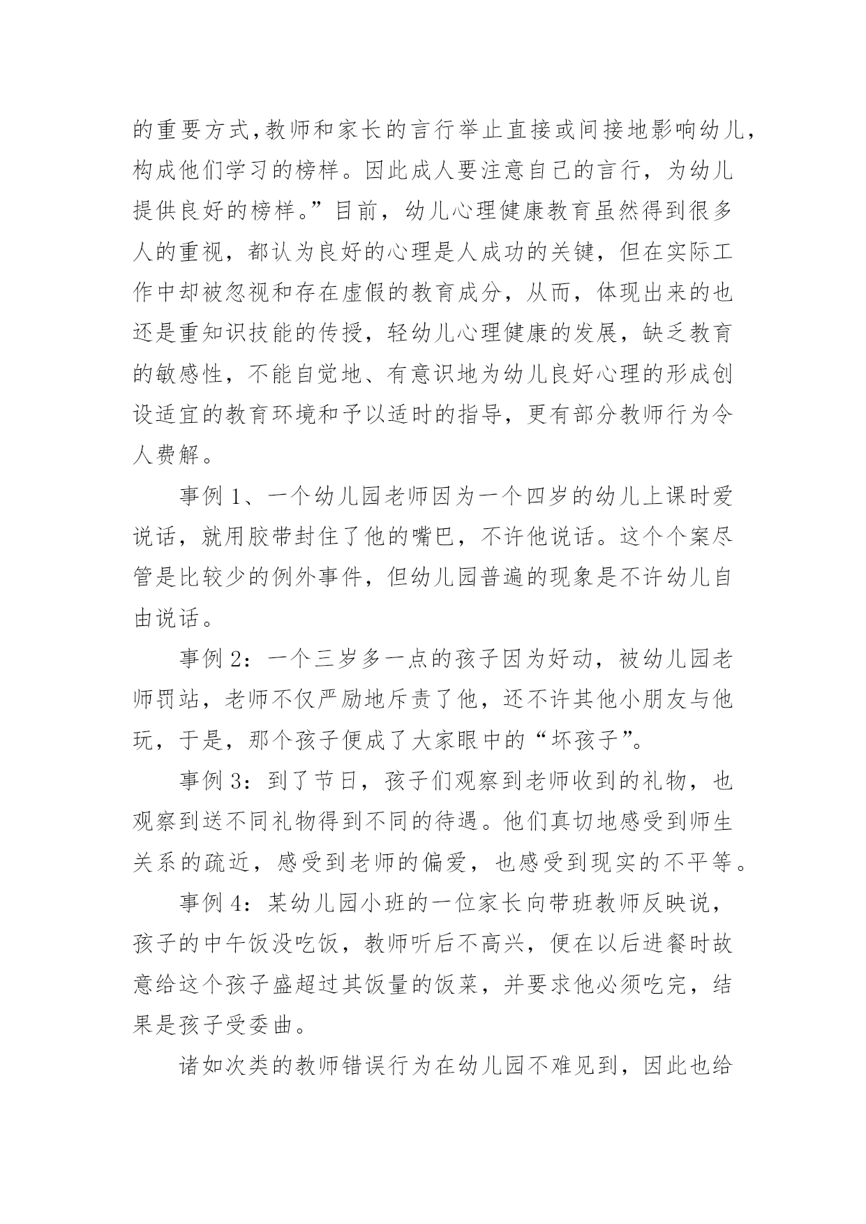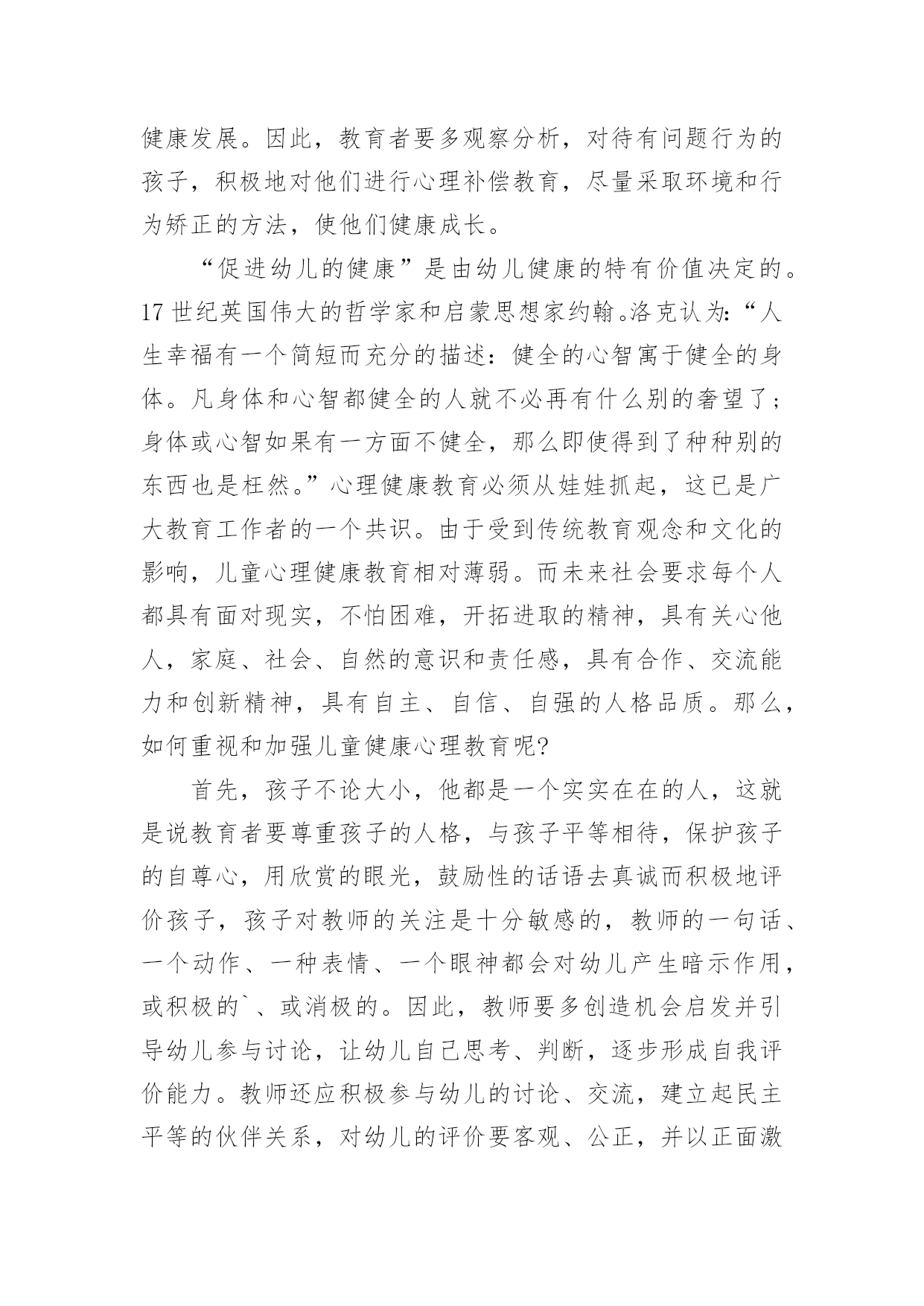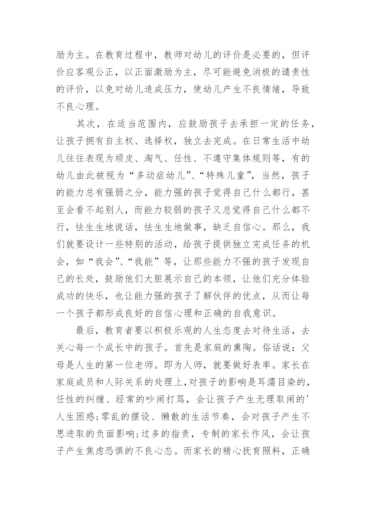 幼儿教育心理学学习心得我们从一些事情上得到感悟后,有这样的时机,要好好记录下来,这么做可以让我们不断思考不断进步。那么写心得体会要注意的内容有什么呢?下面是小编整理的幼儿教育心理学学习心得,供大家参考借鉴,希望可以帮助到有需要的朋友。幼儿教育心理学学习心得1学习了《幼儿教师的心理健康与心理调适》这一课程,本人受益匪浅。我觉得自己不仅学习到的是心理学的理论知识,而且让我更为自信更为坦然地接受一次次的挑战!在这次学习中,我认真倾听了教授与从事心理工作一线老师的讲座,他们都以实实在在的案例和具体丰富的知识内涵及精湛的理论阐述了心理健康这门学科的魅力所在,给了我强烈的.感染和深深的理论引领,并且通过理论学习、自我剖析等让我们意识到心理健康教育是一门提高学生心理素质的基础教育,同时也让我们知道,加强对学生的心理教育,可以减少甚至杜绝学生心理问题的发生。通过学习我还意识到要实现提高学生素质,促进学生的人格健全发展的目标,教师的作用是无可替代的,尤其是班主任。所以在这几天的学习中,我都认认真真地看教材,听讲座,做好笔记,学好心理健康方面的知识,帮助学生学习得更好,生活得更好!教师的心理健康也影响到学生的心理健康。好的教师能为学生设计一个良好的心理成长环境。人不怕做事,就怕心累。当心累时,我们要有自我控制、自我调试的能力,保持乐观积极的教育心态,不将生活中不愉快的情绪带入教育工作中,不迁怒于孩子,克制偏爱情绪,一视同仁地对待孩子,同时不将工作中不良情绪带入家庭。我还学会了几种解压的方法:控制呼吸法、自我剖析法、学习转移法、投身自然法、心情放假法、肌肉放松法。这些都给了我借鉴作用,正确认识自己通过学习,我意识到在工作中要有更积极、乐观、向上的心态,并且认识到,保持这种心态对每个人的工作、生活都是至关重要的。这些将深深地影响着我、激励着我对今后工作的态度,这也将直接地影响到我的学生们,使学生们能够在良好的心态下学习、进步。在培训学习中,每一天都能感受到思想火花的冲击;在一次次的感悟中,颇感自己的责任重大、知识贫乏。通过这次学习,我收获颇丰、感想颇深:眼界开阔了、思考问题能站在更高的境界,许多疑问得到了解决或者启发。对教育的认识有了一个新的提高,对心理健康与心理调适的素质也得到了一定程度的提高。幼儿教育心理学学习心得2学前期是人的一生中生长发育最旺盛、变化最快、可塑性最大的时期之一。幼儿在环境和教育的影响下,在以游戏为主的各项活动中,心理发展异常迅速。作为幼儿教师学习心理学是自身发展提高的需要,是搞好幼儿教育工作的需要。通过学习《幼儿心理学》,我深知:幼儿阶段是人生的'奠基阶段,而幼儿教师是年青一代最初的启蒙老师,在幼儿成长过程中起着主导作用。作为幼儿教师,首先是要做幼儿的朋友,在平等的关系中,教师是幼儿的伙伴,使幼儿在心理上得到安全、放松,让他们感觉生活在自由、尊重、平等、合作的气氛中,在这气氛中,让幼儿充分的活动,获得表达自己的欲望的能力和机会。我们班每个孩子的个性都不相同,有的孩子活泼大方,他们能主动表现自己,见到客人能主动打招呼,听到音乐就能翩翩起舞,为大家表演,这样的是我们所倡导的.。但是有些孩子,他们在幼儿园里比较活泼,一旦离开了他们熟悉的环境,或家里来了客人,或者幼儿园来了陌生人参观等等,他们便很胆怯,不敢说话。这种胆怯性格的形成,大多因为缺乏锻炼的机会,缺少表现自己的勇气的条件,如果不及时加以引导,将严重影响幼儿一生的发展。胆怯的幼儿往往没有勇气在众人面前讲话,或说话声音很小,为改变这种胆怯的性格,我们努力为幼儿提供"说"的机会,让幼儿在每个人面前表达自己欲望和自己的感情。幼儿教育心理学学习心得3充实丰富的生活内容,快乐的情感体验,给孩子温馨的爱抚会使孩子变得活泼开朗,乐观向上。相反,单调的生活氛围,刻板的教育模式,冷漠的环境氛围会使儿童个性难以健康发展。因此,教育者要多观察分析,对待有问题行为的孩子,积极地对他们进行心理补偿教育,尽量采取环境和行为矫正的方法,使他们健康成长。“促进幼儿的健康”是由幼儿健康的特有价值决定的。17世纪英国伟大的哲学家和启蒙思想家约翰。洛克认为:“人生幸福有一个简短而充分的描述:健全的心智寓于健全的身体。凡身体和心智都健全的人就不必再有什么别的奢望了;身体或心智如果有一方面不健全,那么即使得到了种种别的东西也是枉然。”心理健康教育必须从娃娃抓起,这已是广大教育工作者的一个共识。由于受到传统教育观念和文化的影响,儿童心理健康教育相对薄弱。而未来社会要求每个人都具有面对现实,不怕困难,开拓进取的精神,具有关心他人,家庭、社会、自然的意识和责任感,具有合作、交流能力和创新精神,具有自主、自信、自强的人格品质。那么,如何重视和加强儿童健康心理教育呢?首先,孩子不论大小,他都是一个实实在在的人,这就是说教育者