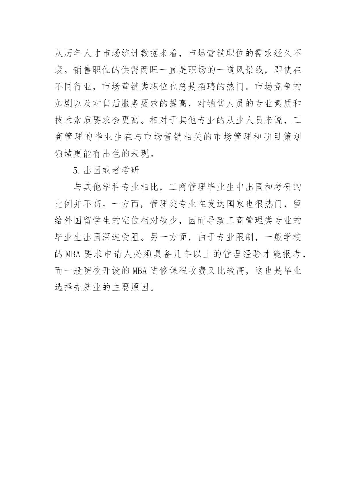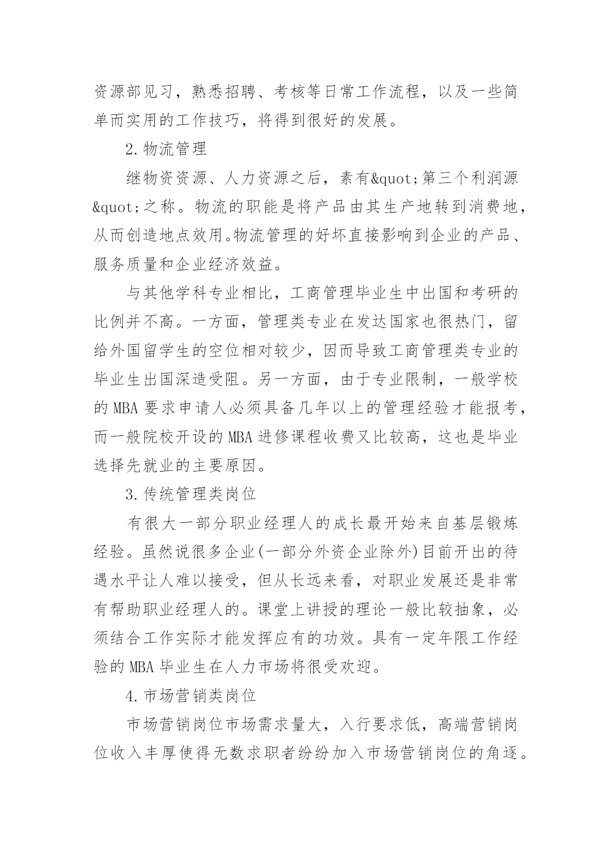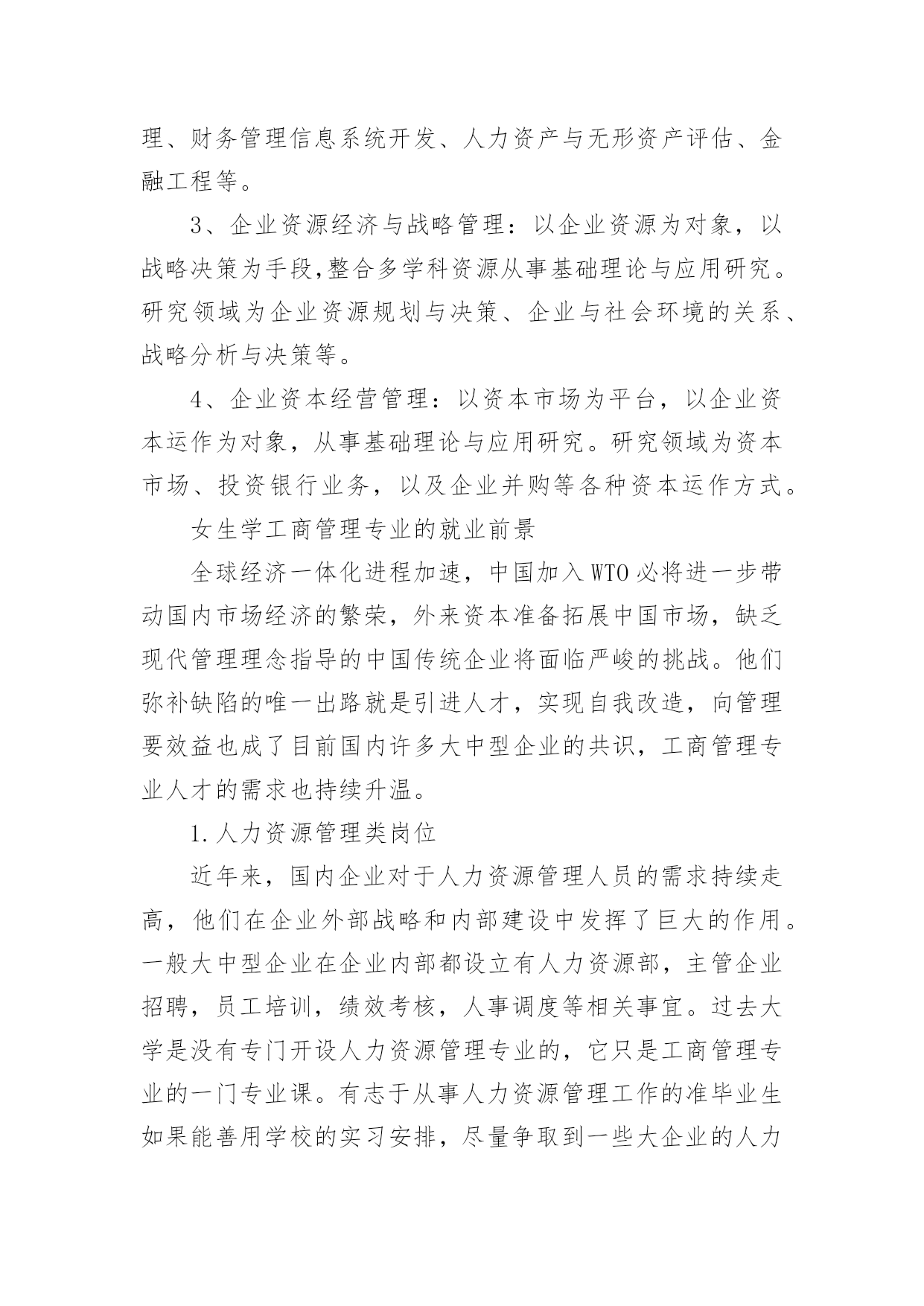女生学工商管理专业的就业前景工商管理是研究工商企业经济管理基本理论和一般方法的学科,主要包括企业的经营战略制定和内部行为管理两个方面。工商管理专业的应用性很强,它的目标是依据管理学、经济学的基本理论,通过运用现代管理的方法和手段来进行有效的企业管理和经营决策,保证企业的生存和发展。那么,工商管理女生做什么好呢?下面有途网小编给大家带来工商管理专业的女生就业前景。工商管理专业培养目标坚持德、智、体全面发展的方针,实现以下具体培养目标:系统掌握企业管理专业的基础理论和专业知识;熟悉所从事研究方向的前沿理论与最新动态;了解相关学科的发展态势;具有进行科学研究、教学和独立担负专门管理技术工作的能力;具有严谨求实的科学作风。毕业后能够胜任相应的工作。工商管理专业研究方向1、现代企业理论与职业经理人研究:以现代产权经济学为基础,从事基础理论与应用研究。研究领域为现代企业制度、公司治理结构,职业经理人的形成与发展机制、激励与约束机制,企业内部的组织管理机制等。2、金融与财务管理:以企业与社会环境、自然环境协调发展为导向,整合多学科资源从事基础理论与应用研究。研究领域为利益相关者理论与公司财务、财务战略、财务治理、财务管理信息系统开发、人力资产与无形资产评估、金融工程等。3、企业资源经济与战略管理:以企业资源为对象,以战略决策为手段,整合多学科资源从事基础理论与应用研究。研究领域为企业资源规划与决策、企业与社会环境的关系、战略分析与决策等。4、企业资本经营管理:以资本市场为平台,以企业资本运作为对象,从事基础理论与应用研究。研究领域为资本市场、投资银行业务,以及企业并购等各种资本运作方式。女生学工商管理专业的就业前景全球经济一体化进程加速,中国加入WTO必将进一步带动国内市场经济的繁荣,外来资本准备拓展中国市场,缺乏现代管理理念指导的中国传统企业将面临严峻的挑战。他们弥补缺陷的唯一出路就是引进人才,实现自我改造,向管理要效益也成了目前国内许多大中型企业的共识,工商管理专业人才的需求也持续升温。1.人力资源管理类岗位近年来,国内企业对于人力资源管理人员的需求持续走高,他们在企业外部战略和内部建设中发挥了巨大的作用。一般大中型企业在企业内部都设立有人力资源部,主管企业招聘,员工培训,绩效考核,人事调度等相关事宜。过去大学是没有专门开设人力资源管理专业的,它只是工商管理专业的一门专业课。有志于从事人力资源管理工作的准毕业生如果能善用学校的实习安排,尽量争取到一些大企业的人力资源部见习,熟悉招聘、考核等日常工作流程,以及一些简单而实用的工作技巧,将得到很好的发展。2.物流管理继物资资源、人力资源之后,素有"第三个利润源"之称。物流的职能是将产品由其生产地转到消费地,从而创造地点效用。物流管理的好坏直接影响到企业的产品、服务质量和企业经济效益。与其他学科专业相比,工商管理毕业生中出国和考研的比例并不高。一方面,管理类专业在发达国家也很热门,留给外国留学生的空位相对较少,因而导致工商管理类专业的毕业生出国深造受阻。另一方面,由于专业限制,一般学校的MBA要求申请人必须具备几年以上的管理经验才能报考,而一般院校开设的MBA进修课程收费又比较高,这也是毕业选择先就业的主要原因。3.传统管理类岗位有很大一部分职业经理人的成长最开始来自基层锻炼经验。虽然说很多企业(一部分外资企业除外)目前开出的待遇水平让人难以接受,但从长远来看,对职业发展还是非常有帮助职业经理人的。课堂上讲授的理论一般比较抽象,必须结合工作实际才能发挥应有的功效。具有一定年限工作经验的MBA毕业生在人力市场将很受欢迎。4.市场营销类岗位市场营销岗位市场需求量大,入行要求低,高端营销岗位收入丰厚使得无数求职者纷纷加入市场营销岗位的角逐。从历年人才市场统计数据来看,市场营销职位的需求经久不衰。销售职位的供需两旺一直是职场的一道风景线,即使在不同行业,市场营销类职位也总是招聘的热门。市场竞争的加剧以及对售后服务要求的提高,对销售人员的专业素质和技术素质要求会更高。相对于其他专业的从业人员来说,工商管理的毕业生在与市场营销相关的市场管理和项目策划领域更能有出色的表现。5.出国或者考研与其他学科专业相比,工商管理毕业生中出国和考研的比例并不高。一方面,管理类专业在发达国家也很热门,留给外国留学生的空位相对较少,因而导致工商管理类专业的毕业生出国深造受阻。另一方面,由于专业限制,一般学校的MBA要求申请人必须具备几年以上的管理经验才能报考,而一般院校开设的MBA进修课程收费又比较高,这也是毕业选择先就业的主要原因。