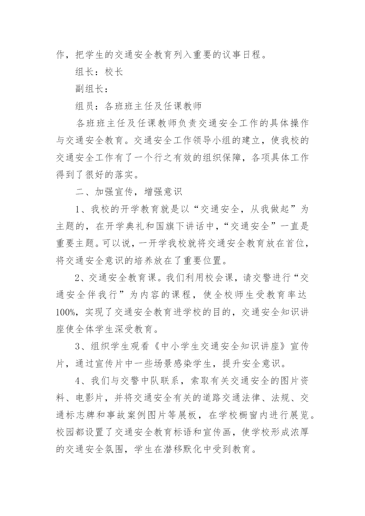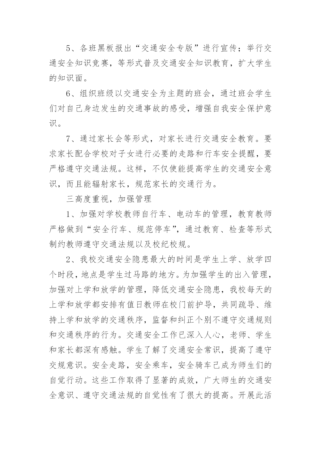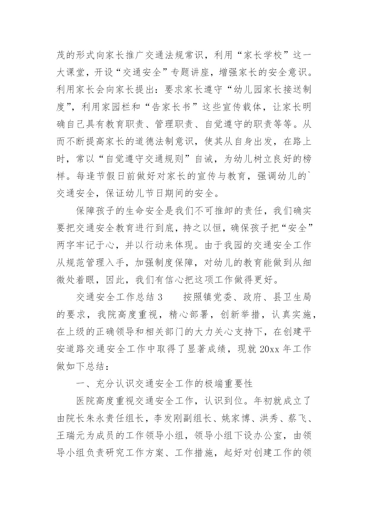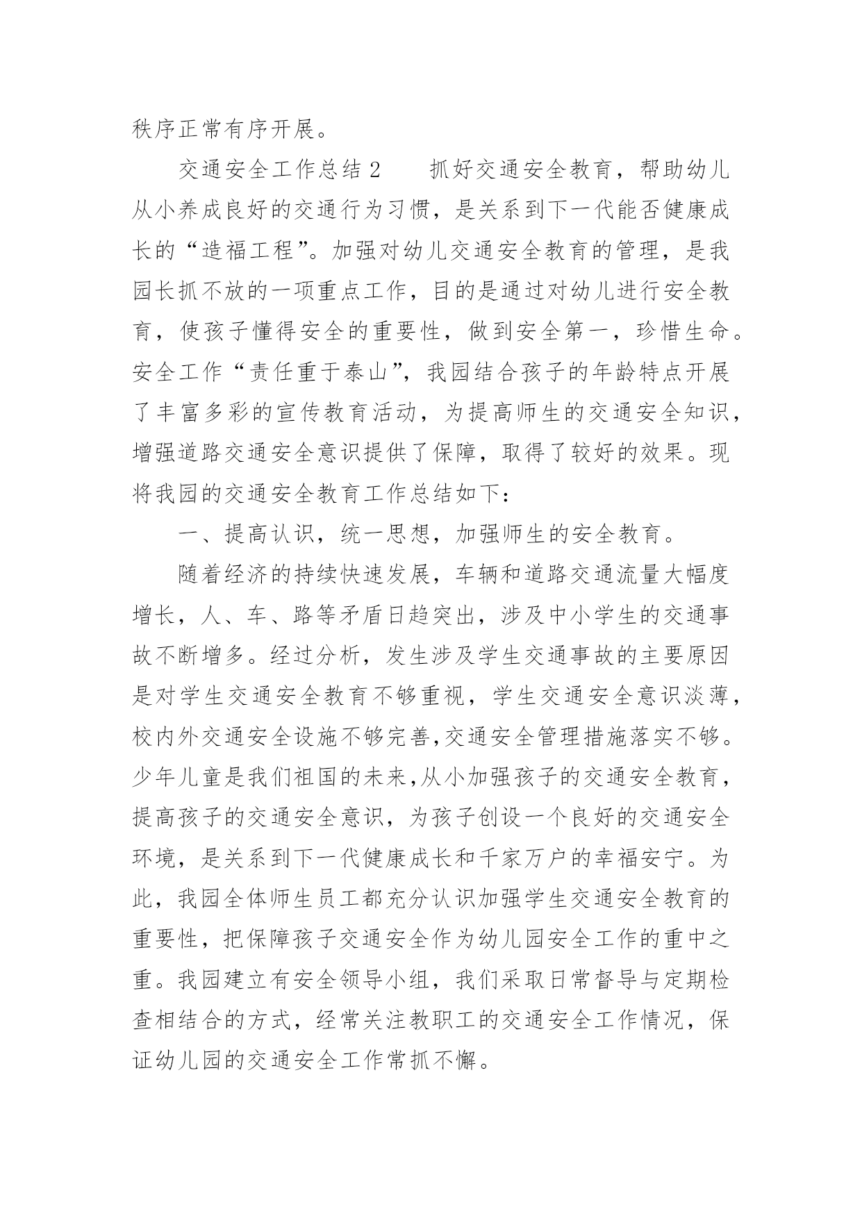 交通安全工作总结2020年交通安全工作总结(精选8篇)光阴似箭,岁月无痕,一段时间的工作已经结束了,回顾这段时间的工作,相信你有很多感想吧,是时候抽出时间写写工作总结了。工作总结怎么写才能发挥它最大的作用呢?以下是小编帮大家整理的2020年交通安全工作总结(精选8篇),仅供参考,希望能够帮助到大家。交通安全工作总结1为全面贯彻落实上级文件精神,我校在上级部门的指导下,立足自身,针对学校的实际,踏踏实实做好本次全国交通安全反思日教育活动,现将有关活动情况总结如下:一、健全机制,精心组织作为安全工作,学校把本次教育活动摆在重要议事日程。除完成常规的工作外,学校在各项工作亟待理顺的情况下,抽出时间召开班子会议,专题研究本次活动的开展。成立了由江淮波校长任组长,吴王树云书记任副组长,各班班主任为组员的“全国交通安全反思日”活动工作领导小组,形成了主要领导亲自抓,分管领导具体抓,其它成员落实抓的良好工作局面,为本次活动的开展打下了良好的基础。二、活动丰富,效果明显在为期一周的宣传教育中,学校开展了多项活动。内容丰富多彩,做到了全员动员、人人参与,全体师生的安全意识明显加强,家长既满意,同时也受到了教育,一个良好的氛围进一步形成。活动形式:1、张贴宣传标语、宣传画;2、以班级为单位组织学生学习《中小学生交通安全知识》读本,开展主题班会;3、组织学生学习《道路交通安全法》,谈体会,写心得;4、以“小手牵大手”的形式,积极向家长和周围的成人开展交通常识、法规宣传活动。三、加强督查,长效管理作为一次有效的教育手段,尽管本次活动结束,但学校并没有放任自流,而是把提高学生的交通安全法制意识作为一项长期的任务来抓,把它结合到日常的教育教学工作以及各项社会实践活动中去,在长效机制上下功夫。我们还把本次活动和打造“平安校园”结合起来,把在本次活动中取得了成果在进行细化、深化,为我校创建安全基础。四、存在的不足和今后努力的方向尽管在本次活动中,我们已经取得了较好的成果,但我们也看到校内外的交通设施还不够完善,特别是我校所处地理位置,交通安全时刻是一大隐患;家长对学生的交通安全意识还不够到位,还存在麻痹大意的现象,个别学生的交通安全意识也还比较淡薄等等情况存在。下一步,除建立完善长效机制外,我们将继续高度重视学生的交通安全工作,做到时时抓、处处抓、人人抓,及时排查安全隐患,防患于未然,努力为学生创造一个良好的环境,保证学校的教育教学秩序正常有序开展。交通安全工作总结2抓好交通安全教育,帮助幼儿从小养成良好的交通行为习惯,是关系到下一代能否健康成长的“造福工程”。加强对幼儿交通安全教育的管理,是我园长抓不放的一项重点工作,目的是通过对幼儿进行安全教育,使孩子懂得安全的重要性,做到安全第一,珍惜生命。安全工作“责任重于泰山”,我园结合孩子的年龄特点开展了丰富多彩的宣传教育活动,为提高师生的交通安全知识,增强道路交通安全意识提供了保障,取得了较好的效果。现将我园的交通安全教育工作总结如下:一、提高认识,统一思想,加强师生的安全教育。随着经济的持续快速发展,车辆和道路交通流量大幅度增长,人、车、路等矛盾日趋突出,涉及中小学生的交通事故不断增多。经过分析,发生涉及学生交通事故的主要原因是对学生交通安全教育不够重视,学生交通安全意识淡薄,校内外交通安全设施不够完善,交通安全管理措施落实不够。少年儿童是我们祖国的未来,从小加强孩子的交通安全教育,提高孩子的交通安全意识,为孩子创设一个良好的交通安全环境,是关系到下一代健康成长和千家万户的幸福安宁。为此,我园全体师生员工都充分认识加强学生交通安全教育的重要性,把保障孩子交通安全作为幼儿园安全工作的重中之重。我园建立有安全领导小组,我们采取日常督导与定期检查相结合的方式,经常关注教职工的交通安全工作情况,保证幼儿园的交通安全工作常抓不懈。二、全面开展交通安全教育活动,增强孩子的安全意识和自护能力。在组织交通安全教育的过程中,我园发动教师、家长、孩子共同收集有关交通安全的资料。并把收集的资料分类整理,如:交通规则的资料、交通事故的图片,道路交通标志、交通意外抢救知识等等。为了增强幼儿辨别安全与危险的能力,在园内和班级创设交通安全活动角,粘贴交通安全标志的图片等,潜移默化地影响幼儿,提高幼儿对交通标志的识别。针对幼儿的年龄特点给幼儿进行交通安全方面的教育,让孩子明白怎么乘车,安全带怎么系,乘车应注意的事项等交通安全知识。在交通安全的角色游戏中设立交通指挥岗、斑马线、“小小交通警察”运用简单的交通手势,指挥交通。通过游戏活动使幼儿对交通规则有一个初浅的印象,“红灯停,绿灯行,黄灯亮了做准备,过路应走斑马线,交通规则要记牢。”“交通安全很重要,交通规则要牢记。从小养成好习惯,不在路上玩游戏。行走应走人行道,没有行道往右靠。乘车安全