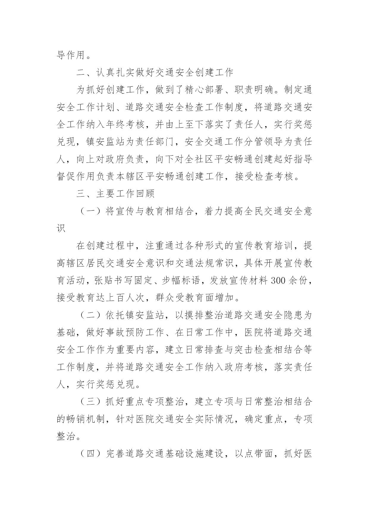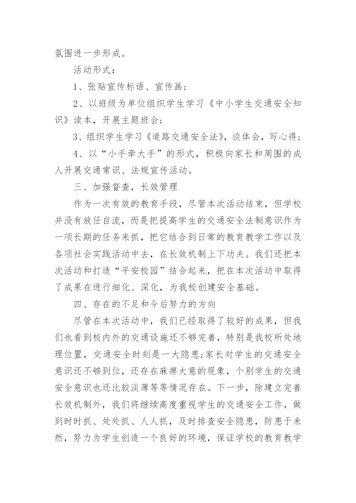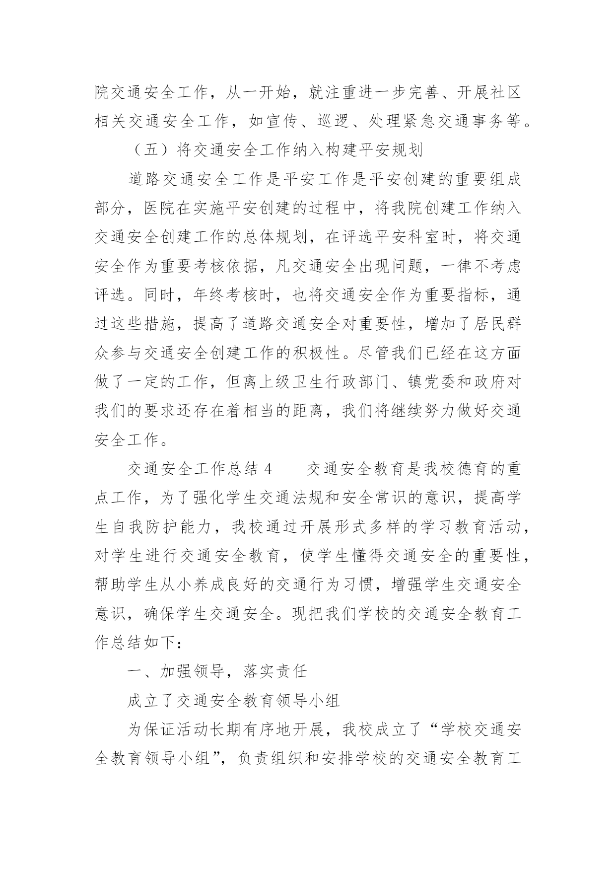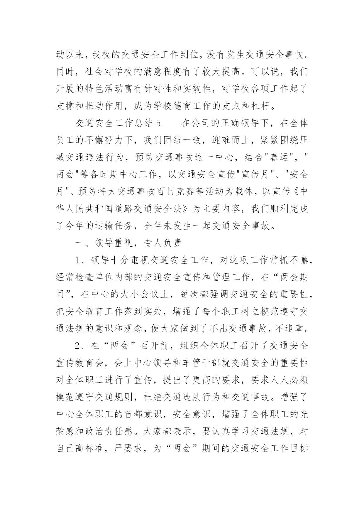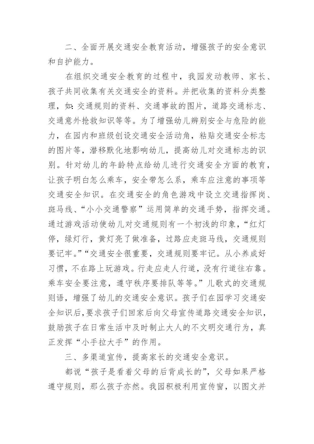 交通安全工作总结2020年交通安全工作总结(精选8篇)光阴似箭,岁月无痕,一段时间的工作已经结束了,回顾这段时间的工作,相信你有很多感想吧,是时候抽出时间写写工作总结了。工作总结怎么写才能发挥它最大的作用呢?以下是小编帮大家整理的2020年交通安全工作总结(精选8篇),仅供参考,希望能够帮助到大家。交通安全工作总结1为全面贯彻落实上级文件精神,我校在上级部门的指导下,立足自身,针对学校的实际,踏踏实实做好本次全国交通安全反思日教育活动,现将有关活动情况总结如下:一、健全机制,精心组织作为安全工作,学校把本次教育活动摆在重要议事日程。除完成常规的工作外,学校在各项工作亟待理顺的情况下,抽出时间召开班子会议,专题研究本次活动的开展。成立了由江淮波校长任组长,吴王树云书记任副组长,各班班主任为组员的“全国交通安全反思日”活动工作领导小组,形成了主要领导亲自抓,分管领导具体抓,其它成员落实抓的良好工作局面,为本次活动的开展打下了良好的基础。二、活动丰富,效果明显在为期一周的宣传教育中,学校开展了多项活动。内容丰富多彩,做到了全员动员、人人参与,全体师生的安全意识明显加强,家长既满意,同时也受到了教育,一个良好的氛围进一步形成。活动形式:1、张贴宣传标语、宣传画;2、以班级为单位组织学生学习《中小学生交通安全知识》读本,开展主题班会;3、组织学生学习《道路交通安全法》,谈体会,写心得;4、以“小手牵大手”的形式,积极向家长和周围的成人开展交通常识、法规宣传活动。三、加强督查,长效管理作为一次有效的教育手段,尽管本次活动结束,但学校并没有放任自流,而是把提高学生的交通安全法制意识作为一项长期的任务来抓,把它结合到日常的教育教学工作以及各项社会实践活动中去,在长效机制上下功夫。我们还把本次活动和打造“平安校园”结合起来,把在本次活动中取得了成果在进行细化、深化,为我校创建安全基础。四、存在的不足和今后努力的方向尽管在本次活动中,我们已经取得了较好的成果,但我们也看到校内外的交通设施还不够完善,特别是我校所处地理位置,交通安全时刻是一大隐患;家长对学生的交通安全意识还不够到位,还存在麻痹大意的现象,个别学生的交通安全意识也还比较淡薄等等情况存在。下一步,除建立完善长效机制外,我们将继续高度重视学生的交通安全工作,做到时时抓、处处抓、人人抓,及时排查安全隐患,防患于未然,努力为学生创造一个良好的环境,保证学校的教育教学秩序正常有序开展。交通安全工作总结2抓好交通安全教育,帮助幼儿从小养成良好的交通行为习惯,是关系到下一代能否健康成长的“造福工程”。加强对幼儿交通安全教育的管理,是我园长抓不放的一项重点工作,目的是通过对幼儿进行安全教育,使孩子懂得安全的重要性,做到安全第一,珍惜生命。安全工作“责任重于泰山”,我园结合孩子的年龄特点开展了丰富多彩的宣传教育活动,为提高师生的交通安全知识,增强道路交通安全意识提供了保障,取得了较好的效果。现将我园的交通安全教育工作总结如下:一、提高认识,统一思想,加强师生的安全教育。随着经济的持续快速发展,车辆和道路交通流量大幅度增长,人、车、路等矛盾日趋突出,涉及中小学生的交通事故不断增多。经过分析,发生涉及学生交通事故的主要原因是对学生交通安全教育不够重视,学生交通安全意识淡薄,校内外交通安全设施不够完善,交通安全管理措施落实不够。少年儿童是我们祖国的未来,从小加强孩子的交通安全教育,提高孩子的交通安全意识,为孩子创设一个良好的交通安全环境,是关系到下一代健康成长和千家万户的幸福安宁。为此,我园全体师生员工都充分认识加强学生交通安全教育的重要性,把保障孩子交通安全作为幼儿园安全工作的重中之重。我园建立有安全领导小组,我们采取日常督导与定期检查相结合的方式,经常关注教职工的交通安全工作情况,保证幼儿园的交通安全工作常抓不懈。二、全面开展交通安全教育活动,增强孩子的安全意识和自护能力。在组织交通安全教育的过程中,我园发动教师、家长、孩子共同收集有关交通安全的资料。并把收集的资料分类整理,如:交通规则的资料、交通事故的图片,道路交通标志、交通意外抢救知识等等。为了增强幼儿辨别安全与危险的能力,在园内和班级创设交通安全活动角,粘贴交通安全标志的图片等,潜移默化地影响幼儿,提高幼儿对交通标志的识别。针对幼儿的年龄特点给幼儿进行交通安全方面的教育,让孩子明白怎么乘车,安全带怎么系,乘车应注意的事项等交通安全知识。在交通安全的角色游戏中设立交通指挥岗、斑马线、“小小交通警察”运用简单的交通手势,指挥交通。通过游戏活动使幼儿对交通规则有一个初浅的印象,“红灯停,绿灯行,黄灯亮了做准备,过路应走斑马线,交通规则要记牢。”“交通安全很重要,交通规则要牢记。从小养成好习惯,不在路上玩游戏。行走应走人行道,没有行道往右靠。乘车安全