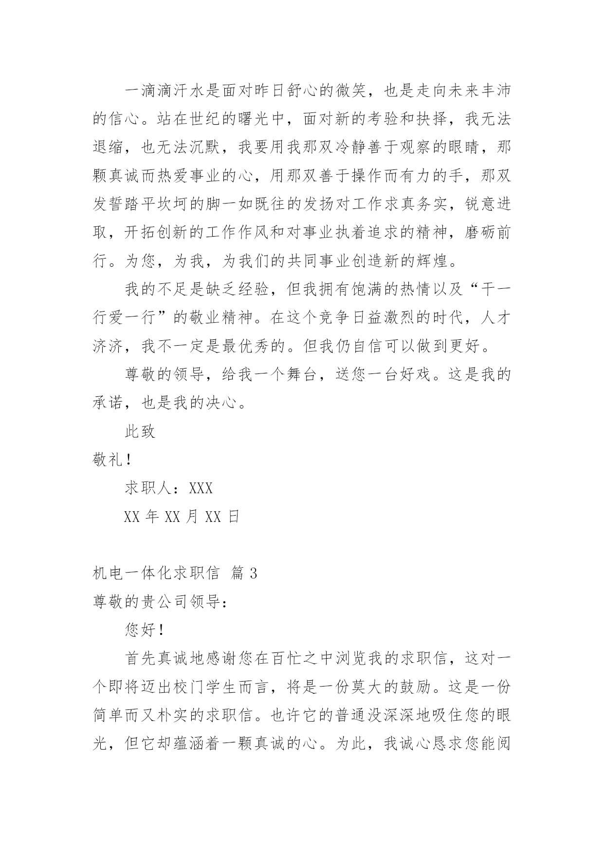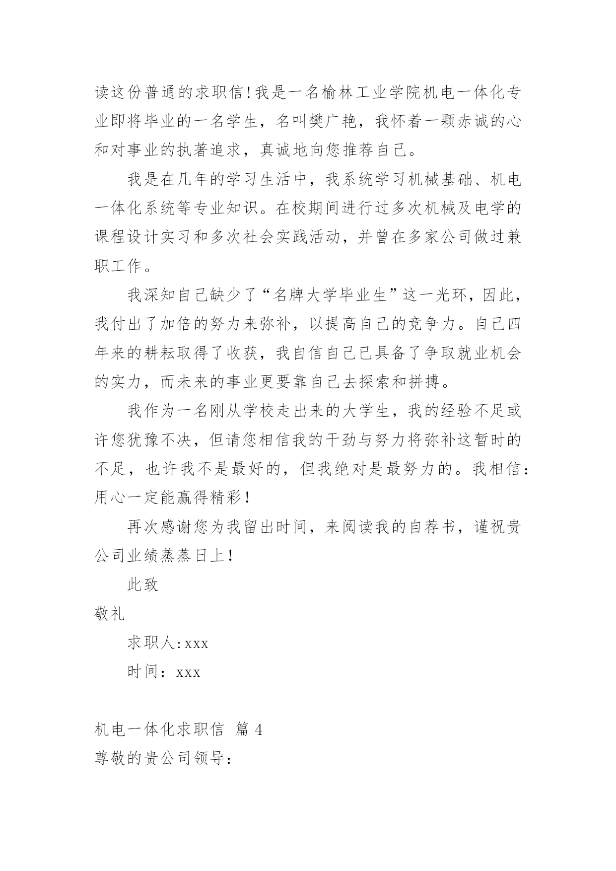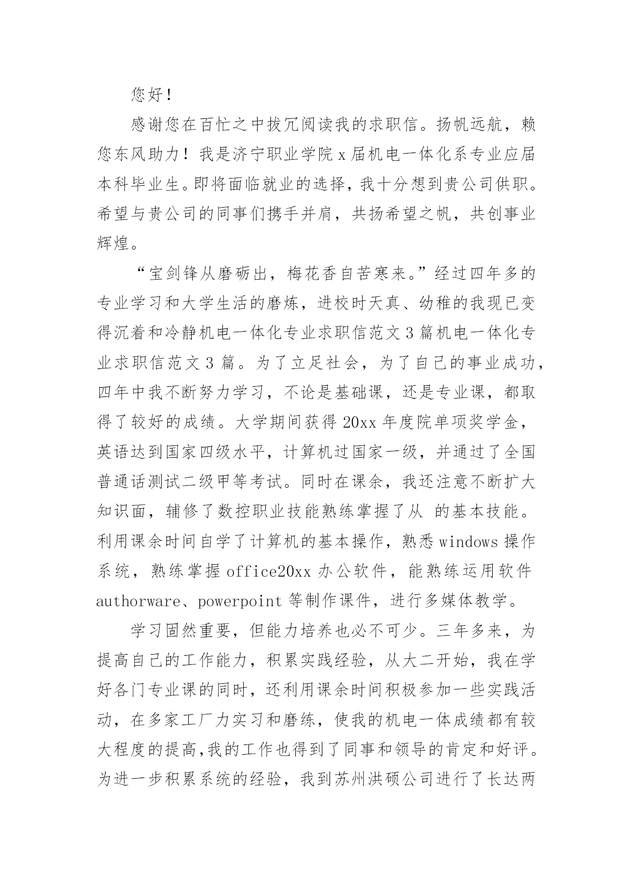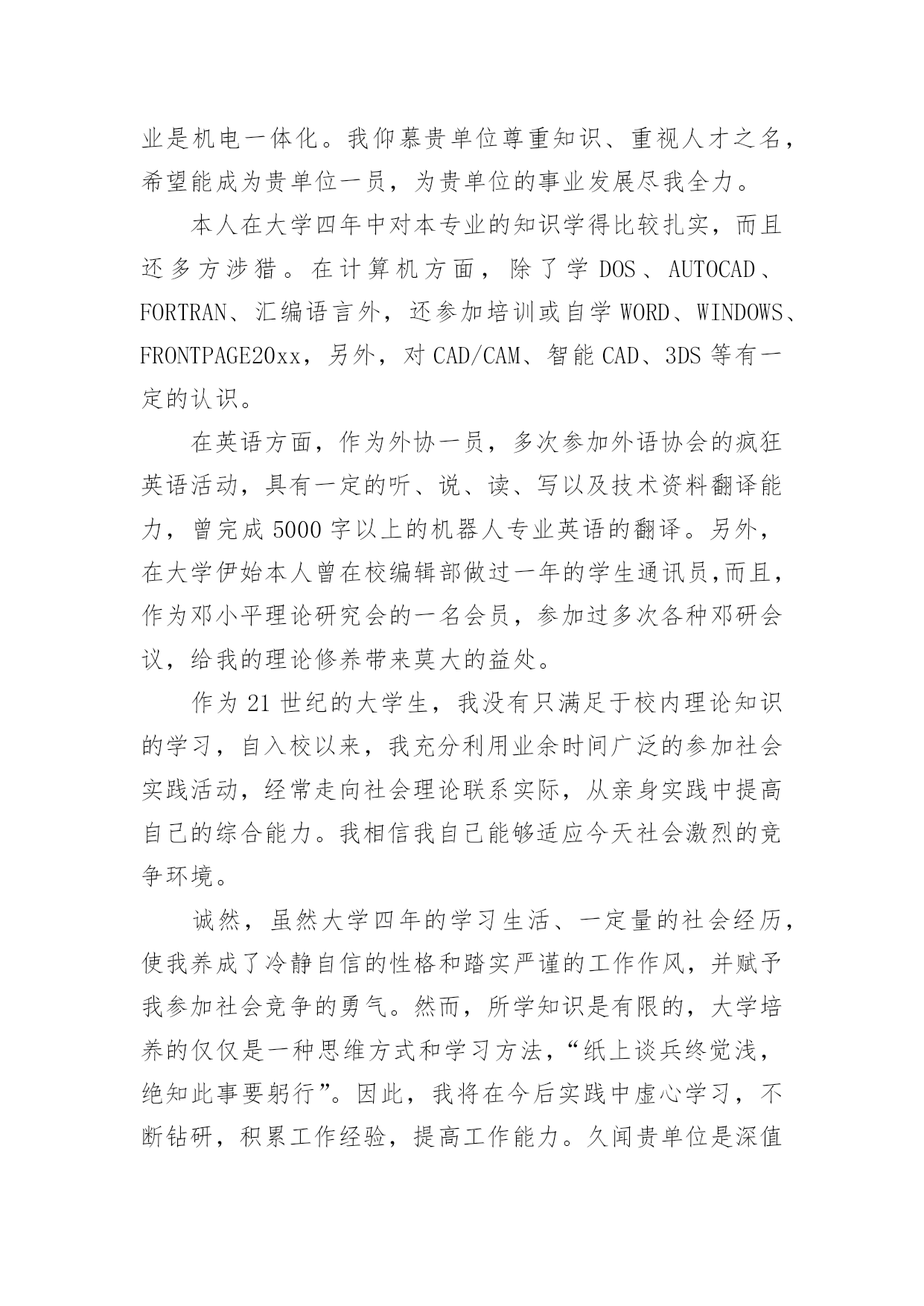 机电一体化求职信关于机电一体化求职信集合7篇时间稍纵即逝,没想到也到了自己找工作的时间,是时候好好地琢磨一下写求职信的事情了哦。求职信怎么写才不会千篇一律呢?下面是小编为大家收集的机电一体化求职信9篇,供大家参考借鉴,希望可以帮助到有需要的朋友。机电一体化求职信篇1尊敬的领导:您好!真诚地感谢您在繁忙的公务中浏览这份求职信,这里有一颗热情而赤诚的心灵渴望得到您的了解、支持与帮助。在此,请允许我向您毛遂自荐。我叫XX,毕业于xx学院机电工程系机电一体化专业。在三年的学习期间,我深知理论知识与实践能力的重要性,所以我努力地系统的学习了机械制造和计算机网络的相关专业课程的理论知识和基础、专科操作,各科学习成绩优良。现已很熟练的懂得了一些有关计算机硬、软件的组装和维护,熟练的办公软件操作、网络安全的管理、企业网站的开发,同时也尽可能的了解专业外的知识,以使自己充实,视野拓展。我严格的要求自己,遵守学校的规章制度,从未有过违纪现象。在课余时间,我积极参加学院、社团的活动。在班上作为班干部的我对工作认真负责,能积极配合其它班委开展活动。我尊敬老师,团结同学,关心热爱班集体,有着强烈的集体责任感。强烈的集体荣誉感和奉献激情又使我积极、热情、务实地投入到一些有益的社会活动中。在假期中,我认真参加了社会实践,多次在校外参加各种兼职家教、志愿者工作等不断地丰富我的业余生活。使我学到了在书本上学不到的知识,尽管时间很短,但体会颇深,无论是在业务能力,还是社交能力,都有一定的提高,具备了一定的工作经验。在完成学业和实践活动过程中,我不断地加强自己的思想道德修养,既要学会做事,又要学会做人,恪守"有所作为是人生的最高境界"的人生信条,积极奉献,乐于助人,多次参与社会捐赠和公益活动。我出生于一个农民家庭,艰苦的生活磨练我更懂得付出才有收获。所以自幼养成勤俭节约,勤奋刻苦,谦虚谨慎,认真务实的生活态度,并懂得感恩生活。现已大学毕业,但是大学毕业不是终点,而是人生的又一个起点。昨天,已经过去;今天,需要您给我机会;明天,我自信将会更好。盼望您的答复能圆我心中的梦,您的任何形式的答复我都视为关怀!如蒙贵公司录用,给我一个发展的机会,我将以兢兢业业的精神扎根贵公司,并以实际行动来报答贵公司的知遇之恩,不辜负贵公司对我的期望和厚待。最后,衷心祝愿贵公司事业发达、蒸蒸日上!此致敬礼!申请人:XXX日期:XX年XX月XX日机电一体化求职信篇2尊敬的领导:首先真诚地感谢您在百忙之中浏览本人的求职信,这对一个即将迈出校门的学子而言,将是一份莫大的鼓励。这是一份简单的求职信,也许它的普通没深深地吸住您的眼光,但它却蕴涵着一颗真诚的心。为此,我诚心恳求您能阅读这份普通的求职函!我是机电一体化专业即将毕业的一名学生,名叫XXX。我怀着一颗赤诚的心和对事业的执著追求,真诚地向您推荐自己。社会竞争的残酷性和激烈性,使我认识到必须用知识来充实自己。因此,我努力学习专业知识,对这个专业有了深入的了解,除此之外,我还注重自己素质的培养,在校期间,获得大学英语四级证书,参加了电子电工实训,并获得了电工证书,参加了车工、钳工、铣工实习,成绩优异。大学三年,除了系统学习本专业知识外,我还能在Windows环境下熟悉操作多种应用软件,能借助Pore、辅助绘图,我还参加了学校举办的电子电工培训,能力得到很大提升。一滴滴汗水是面对昨日舒心的微笑,也是走向未来丰沛的信心。站在世纪的曙光中,面对新的考验和抉择,我无法退缩,也无法沉默,我要用我那双冷静善于观察的眼睛,那颗真诚而热爱事业的心,用那双善于操作而有力的手,那双发誓踏平坎坷的脚一如既往的发扬对工作求真务实,锐意进取,开拓创新的工作作风和对事业执着追求的精神,磨砺前行。为您,为我,为我们的共同事业创造新的辉煌。我的不足是缺乏经验,但我拥有饱满的热情以及“干一行爱一行”的敬业精神。在这个竞争日益激烈的时代,人才济济,我不一定是最优秀的。但我仍自信可以做到更好。尊敬的领导,给我一个舞台,送您一台好戏。这是我的承诺,也是我的决心。此致敬礼!求职人:XXXXX年XX月XX日机电一体化求职信篇3尊敬的贵公司领导:您好!首先真诚地感谢您在百忙之中浏览我的求职信,这对一个即将迈出校门学生而言,将是一份莫大的鼓励。这是一份简单而又朴实的求职信。也许它的普通没深深地吸住您的眼光,但它却蕴涵着一颗真诚的心。为此,我诚心恳求您能阅读这份普通的求职信!我是一名榆林工业学院机电一体化专业即将毕业的一名学生,名叫樊广艳,我怀着一颗赤诚的心和对事业的执著追求,真诚地向您推荐自己。我是在几年的学习生活中,我系统学习机械基础、机电一体化系统等专业知识。在校期间进行过多次机械及电学的课程设计实习和多次社会实践活动,并曾在多家公司做过兼职工作。我深知自己缺少了“名牌大学毕业生”这一