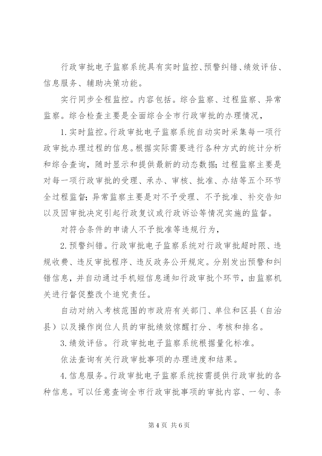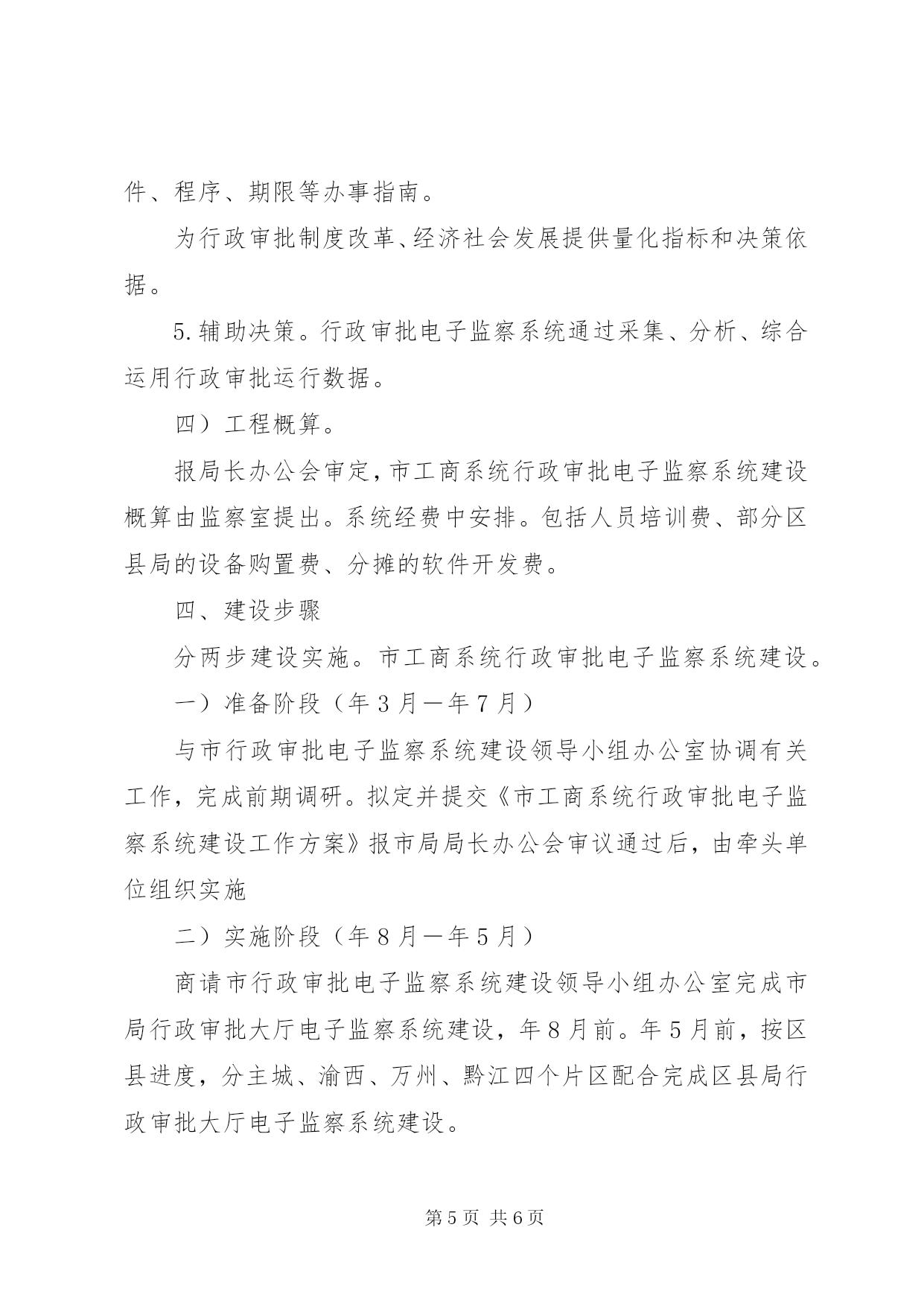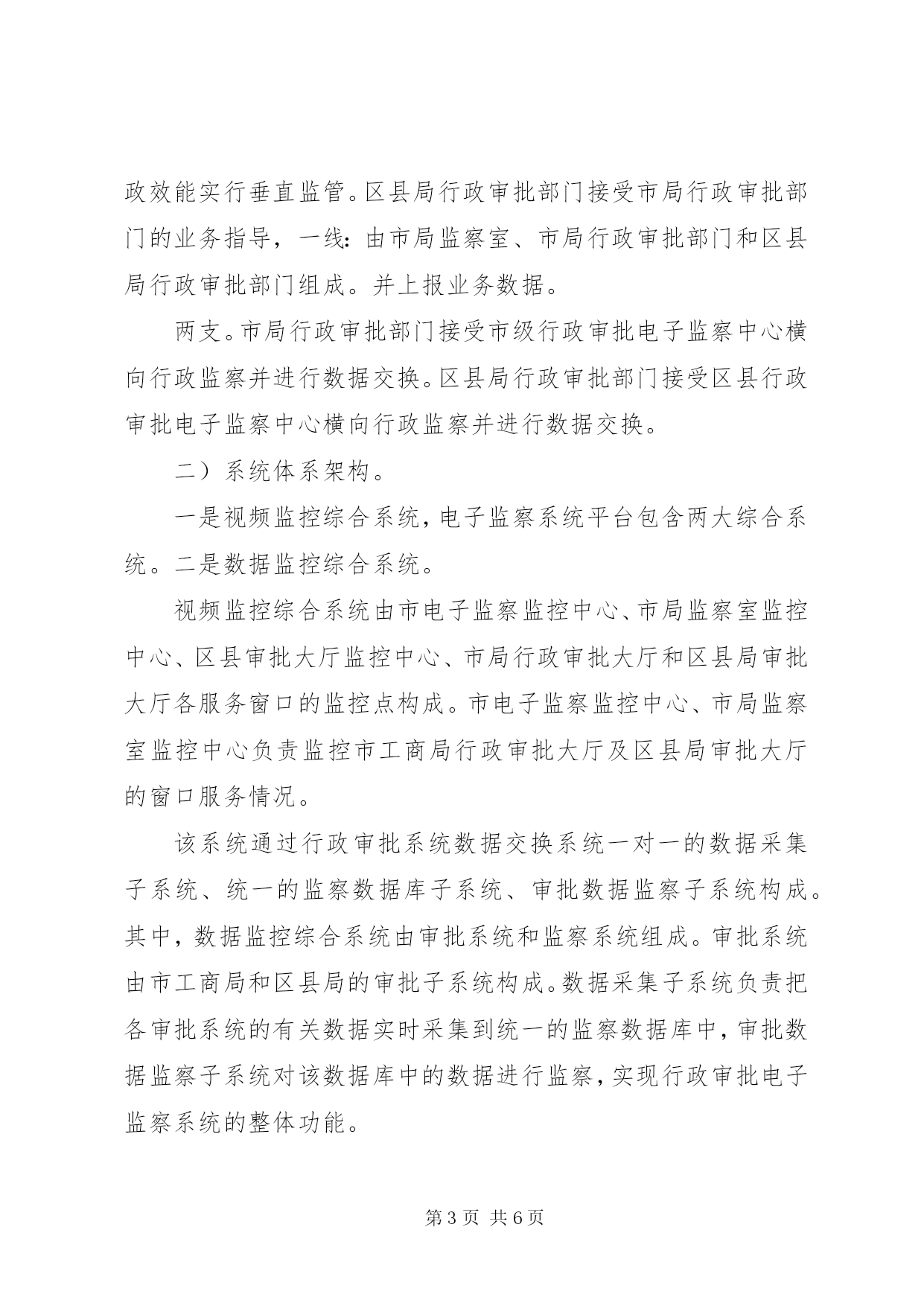 第PAGE\*Arabic\*MERGEFORMAT6页共NUMPAGES\*MERGEFORMAT6页工商局优化电子监管落实方案按市行政审批电子监察中心的技术要求进行系统数据交换,明确职责分工。法制处负责行政审批事项的清理和规范;信息中心负责系统规划建设、网络技术和安全保障工作。配合完成行政审批电子监察系统移植、改造、接入和维护;财审处负责系统建设的资金预算和落实;监察室负责总体推进电子监察系统建设工作,加强与市行政审批电子监察系统建设领导小组办公室的工作衔接,沟通情况,协调行区县行政审批电子监察系统建设领导小组。加强行政监察和效能监察,为了更好地加快工商系统行政审批制度改革。按照《市人民政府关于批转市行政审批电子监察系统建设工作方案的通知》渝府发〔〕78号)精神,结合我市工商系统的实际,特制订本方案。一、建设目标全面落实科学发展观,以邓小平理论和“三个代表”重要思想为指导。运用信息技术,年底前建成市工商系统行政审批电子监察系统,实现市工商系统行政审批监察工作的信息化。二、建设原则市工商系统行政审批电子监察系统建设遵循以下原则。市政府、市监察局的统一领导下。一)分工协作。市工商系统行政审批电子监察系统建设领导小组办公室负责市局及区县局行政审批电子监察系统建设的统一规划、组织推进和工作协调,统筹规划。明确市局相关处室、区县工商局在行政审批电子监察系统建设中的任务。二)分片到位。根据市政府、市监察局的工作安排,总体规划。总体确定市工商系统行政审批电子监察系统的建设目标,先建设市局行政审批窗口的电子监察系统,同时分片区按区县政府的进度建设区县局的电子监察系统。三)制度配套。充分运用市局电子政务系统的基础上,技术实用。采用先进的技术和设备,注重升级及功能扩展,确保行政审批电子监察系统的高性能、高安全性和可扩展性,同步建立相关配套制度。强化监督。行政审批电子监察系统建设要与深化“执政为民、服务发展”学习整改活动成果、执行行政审批违规违纪责任追究制、行政首长问责制、行政执法责任制相结合,四)依法依纪。强化对行政审批事前、事中和事后的全过程监督,拓展源头治腐领域,促使行政权利运行廉洁高效。三、建设内容一)系统基本构成。由“一线两支”组成。市工商系统行政审批电子监察系统依托市政府政务外网和市局业务管理系统平台。市局监察室对市局行政审批部门、区县局行政审批部门的行政效能实行垂直监管。区县局行政审批部门接受市局行政审批部门的业务指导,一线:由市局监察室、市局行政审批部门和区县局行政审批部门组成。并上报业务数据。两支。市局行政审批部门接受市级行政审批电子监察中心横向行政监察并进行数据交换。区县局行政审批部门接受区县行政审批电子监察中心横向行政监察并进行数据交换。二)系统体系架构。一是视频监控综合系统,电子监察系统平台包含两大综合系统。二是数据监控综合系统。视频监控综合系统由市电子监察监控中心、市局监察室监控中心、区县审批大厅监控中心、市局行政审批大厅和区县局审批大厅各服务窗口的监控点构成。市电子监察监控中心、市局监察室监控中心负责监控市工商局行政审批大厅及区县局审批大厅的窗口服务情况。该系统通过行政审批系统数据交换系统一对一的数据采集子系统、统一的监察数据库子系统、审批数据监察子系统构成。其中,数据监控综合系统由审批系统和监察系统组成。审批系统由市工商局和区县局的审批子系统构成。数据采集子系统负责把各审批系统的有关数据实时采集到统一的监察数据库中,审批数据监察子系统对该数据库中的数据进行监察,实现行政审批电子监察系统的整体功能。行政审批电子监察系统具有实时监控、预警纠错、绩效评估、信息服务、辅助决策功能。实行同步全程监控。内容包括。综合监察、过程监察、异常监察。综合检查主要是全面综合全市行政审批的办理情况,1.实时监控。行政审批电子监察系统自动实时采集每一项行政审批办理过程的信息。根据实际需要进行各种方式的统计分析和综合查询,随时显示和提供最新的动态数据;过程监察主要是对每一项行政审批的受理、承办、审核、批准、办结等五个环节全过程监督;异常监察主要是对不予受理、不予批准、补交告知以及因审批决定引起行政复议或行政诉讼等情况实施的监督。对符合条件的申请人不予批准等违规行为,2.预警纠错。行政审批电子监察系统对行政审批超时限、违规收费、违反审批程序、违反政务公开规定。分别发出预警和纠错信息,并自动通过手机短信息通知行政审批个环节,由监察机关进行督促整改个追究责任。自动对纳入考核范围的市政府有关部门、单位和区县(自治县)以及操作岗位人员的审批绩效惊醒打分、考核和排名。3.绩效评估。行政审批电子监察系统根据量化标准。依法查询有关行政审批事项的办理进度和结果。4.信息服务。行政审批电子监察系统按需提供行政审批的各种信息。可以任意查询