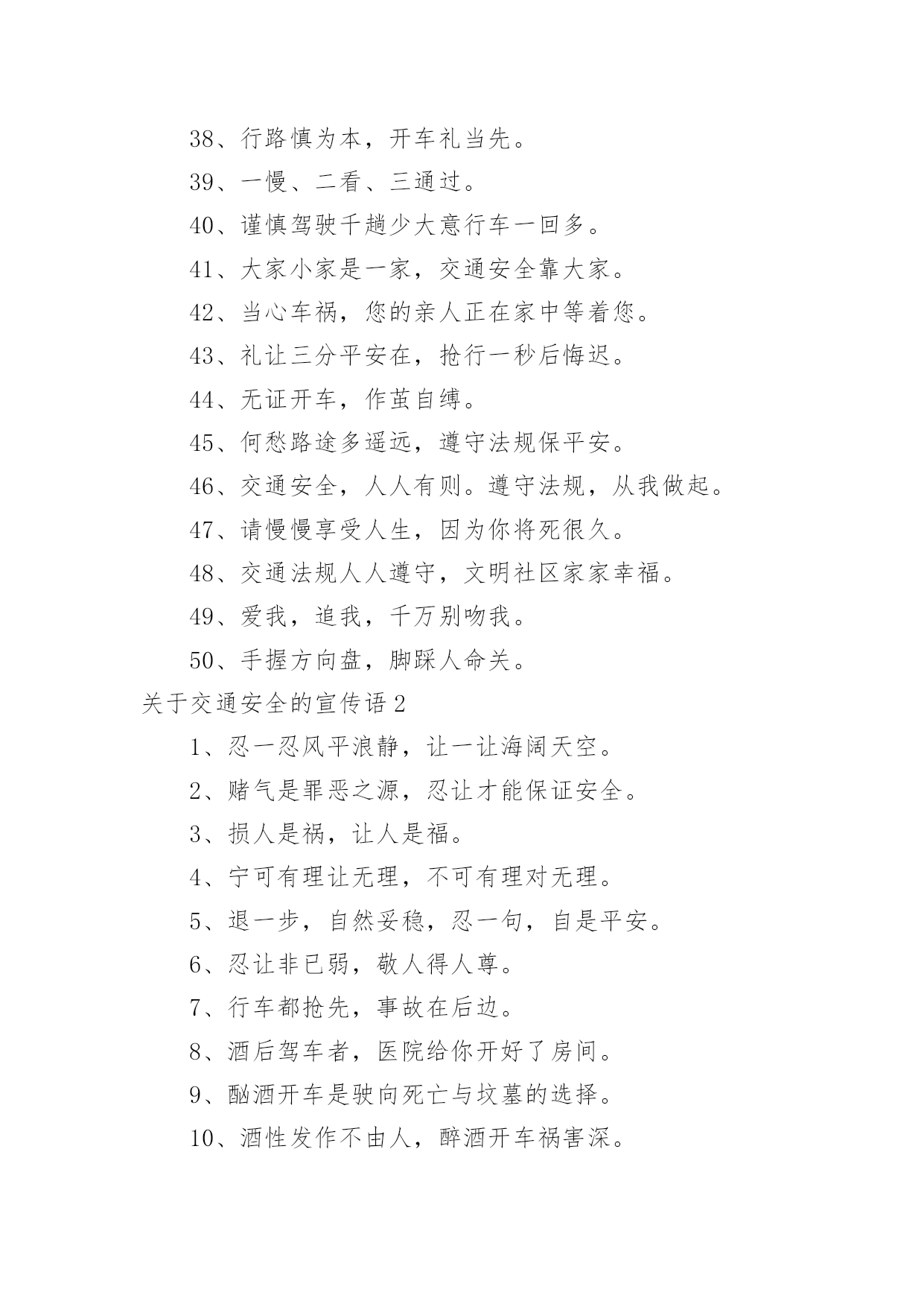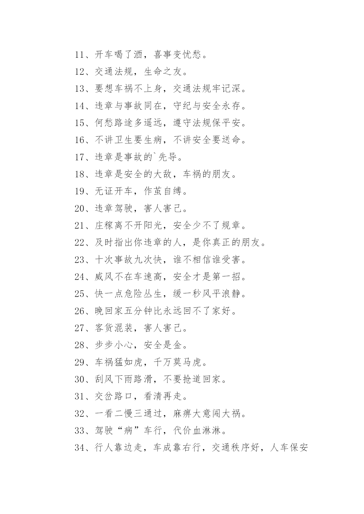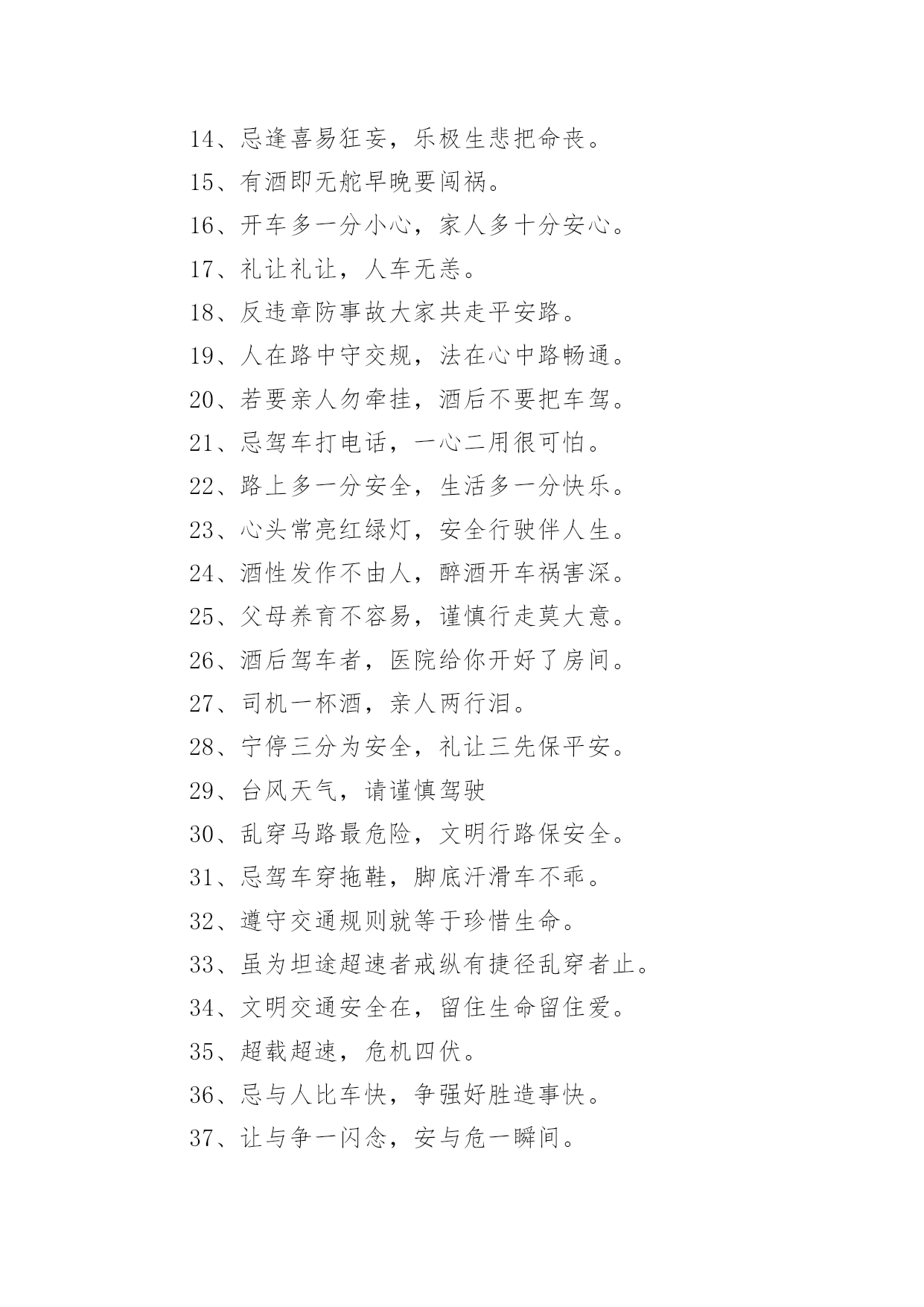 交通安全的宣传语关于交通安全的宣传语在平凡的学习、工作、生活中,大家都接触过比较经典的宣传语吧,宣传语具有在理智上启发人们,在情感上打动人们的作用。你写宣传语时总是没有新意?以下是小编收集整理的关于交通安全的宣传语,仅供参考,大家一起来看看吧。关于交通安全的宣传语11、带一分小心上路,携一团温馨回家。2、走遍东西南北中,安全二字记心中。3、超载多一吨,危险增十分。4、步步小心,平安是金5、居安思危危自小有备无患患可除。6、带上平安上路,载着幸福回家。7、爱妻爱子爱家庭,无视交规等于零。8、遵守交通规则,安全在每个人手中。9、宁等3分,不抢一秒。10、安全你我他,步步小心平安是金。11、树立现代交通意识,养成良好交通习惯。12、迈文明步子,行安全车子,做谦让君子,享平安日子。13、红灯无数次,生命只一次。14、忌逢喜易狂妄,乐极生悲把命丧。15、有酒即无舵早晚要闯祸。16、开车多一分小心,家人多十分安心。17、礼让礼让,人车无恙。18、反违章防事故大家共走平安路。19、人在路中守交规,法在心中路畅通。20、若要亲人勿牵挂,酒后不要把车驾。21、忌驾车打电话,一心二用很可怕。22、路上多一分安全,生活多一分快乐。23、心头常亮红绿灯,安全行驶伴人生。24、酒性发作不由人,醉酒开车祸害深。25、父母养育不容易,谨慎行走莫大意。26、酒后驾车者,医院给你开好了房间。27、司机一杯酒,亲人两行泪。28、宁停三分为安全,礼让三先保平安。29、台风天气,请谨慎驾驶30、乱穿马路最危险,文明行路保安全。31、忌驾车穿拖鞋,脚底汗滑车不乖。32、遵守交通规则就等于珍惜生命。33、虽为坦途超速者戒纵有捷径乱穿者止。34、文明交通安全在,留住生命留住爱。35、超载超速,危机四伏。36、忌与人比车快,争强好胜造事快。37、让与争一闪念,安与危一瞬间。38、行路慎为本,开车礼当先。39、一慢、二看、三通过。40、谨慎驾驶千趟少大意行车一回多。41、大家小家是一家,交通安全靠大家。42、当心车祸,您的亲人正在家中等着您。43、礼让三分平安在,抢行一秒后悔迟。44、无证开车,作茧自缚。45、何愁路途多遥远,遵守法规保平安。46、交通安全,人人有则。遵守法规,从我做起。47、请慢慢享受人生,因为你将死很久。48、交通法规人人遵守,文明社区家家幸福。49、爱我,追我,千万别吻我。50、手握方向盘,脚踩人命关。关于交通安全的宣传语21、忍一忍风平浪静,让一让海阔天空。2、赌气是罪恶之源,忍让才能保证安全。3、损人是祸,让人是福。4、宁可有理让无理,不可有理对无理。5、退一步,自然妥稳,忍一句,自是平安。6、忍让非已弱,敬人得人尊。7、行车都抢先,事故在后边。8、酒后驾车者,医院给你开好了房间。9、酗酒开车是驶向死亡与坟墓的选择。10、酒性发作不由人,醉酒开车祸害深。11、开车喝了酒,喜事变忧愁。12、交通法规,生命之友。13、要想车祸不上身,交通法规牢记深。14、违章与事故同在,守纪与安全永存。15、何愁路途多遥远,遵守法规保平安。16、不讲卫生要生病,不讲安全要送命。17、违章是事故的`先导。18、违章是安全的大敌,车祸的朋友。19、无证开车,作茧自缚。20、违章驾驶,害人害己。21、庄稼离不开阳光,安全少不了规章。22、及时指出你违章的人,是你真正的朋友。23、十次事故九次快,谁不相信谁受害。24、威风不在车速高,安全才是第一招。25、快一点危险丛生,缓一秒风平浪静。26、晚回家五分钟比永远回不了家好。27、客货混装,害人害己。28、步步小心,安全是金。29、车祸猛如虎,千万莫马虎。30、刮风下雨路滑,不要抢道回家。31、交岔路口,看清再走。32、一看二慢三通过,麻痹大意闯大祸。33、驾驶“病”车行,代价血淋淋。34、行人靠边走,车成靠右行,交通秩序好,人车保安宁。35、人不斜穿,不车越线,各行其道。36、马路如虎口,劝君多留神。37、行人过路要小心,提前准备防万一。38、安全行走的人才能走得远。39、宁走千步远,不冒一步险。40、同志,亲人盼您平安回家。41、一人带“禁品”,全车都遭殃,大家齐制止,安全有保障。42、妻子儿女望穿眼,盼你安全把家还。43、提倡社会公德,爱护交通标志,设施。44、公路打晒粮,肇事悔断肠。45、违章占道,诱发事故。46、出了车祸速报警救死扶伤见真情。47、一人出车全家念一人平安全家福。48、一秒钟车祸一辈子痛苦。49、遵守交通法规关爱生命旅程。50、违章铸成终身悔守规伴你一世安。关于交通安全的宣传语31、爱家庭,无视交规等于零。2、维护水上交通秩序,确保春运交通安全!3、春运交通安全从我做起,自觉抵制交通违法行为!4、为了万家团圆,确保春运安全!5、不乘违法车辆,确保乘车安全!6、春节回家团圆,莫忘交通安全。7、带一份小心上