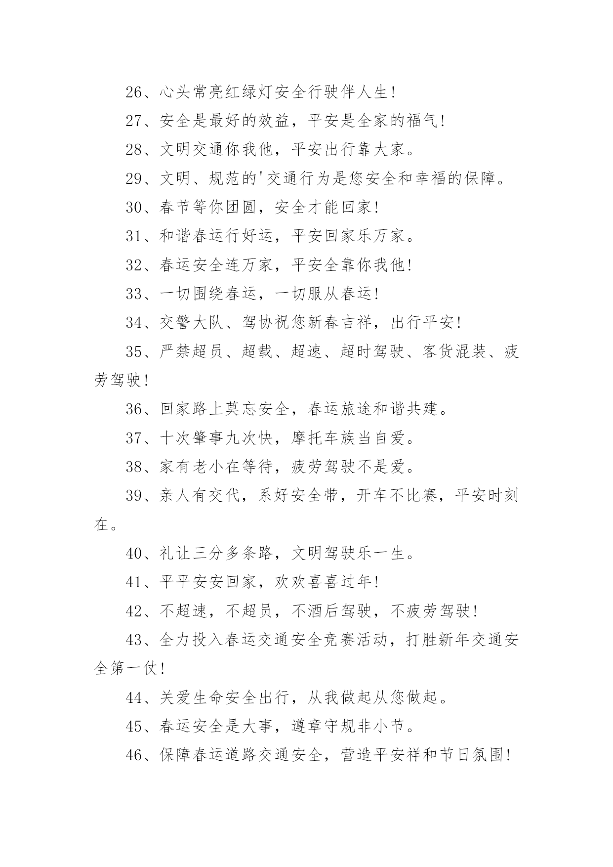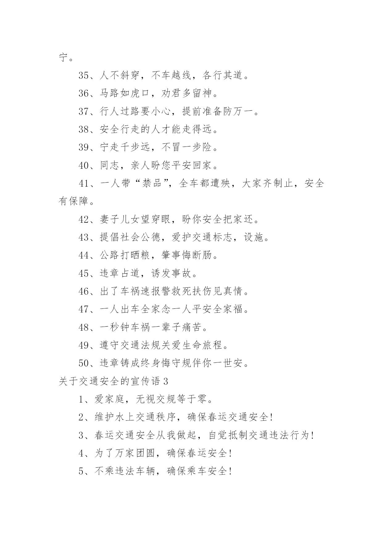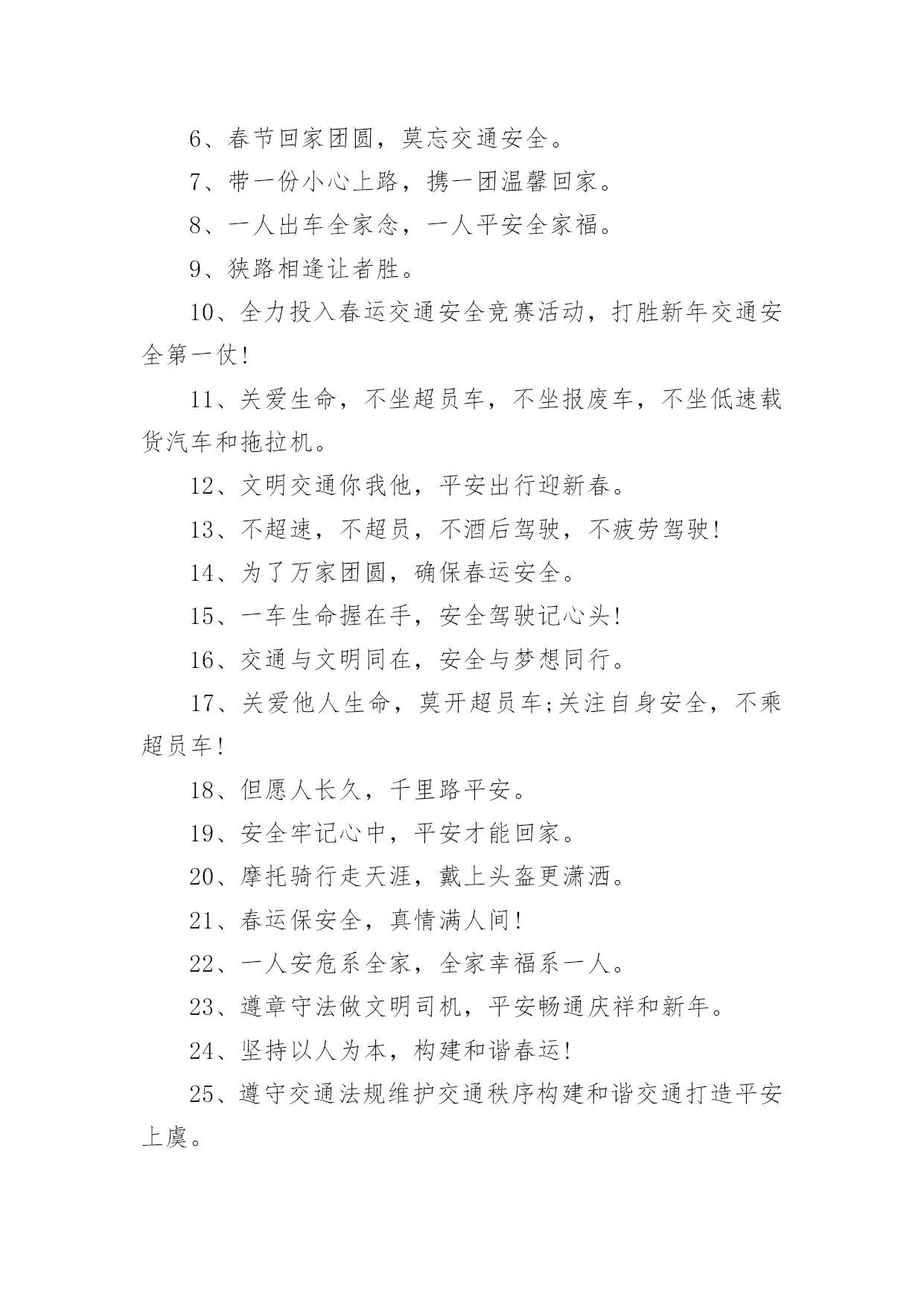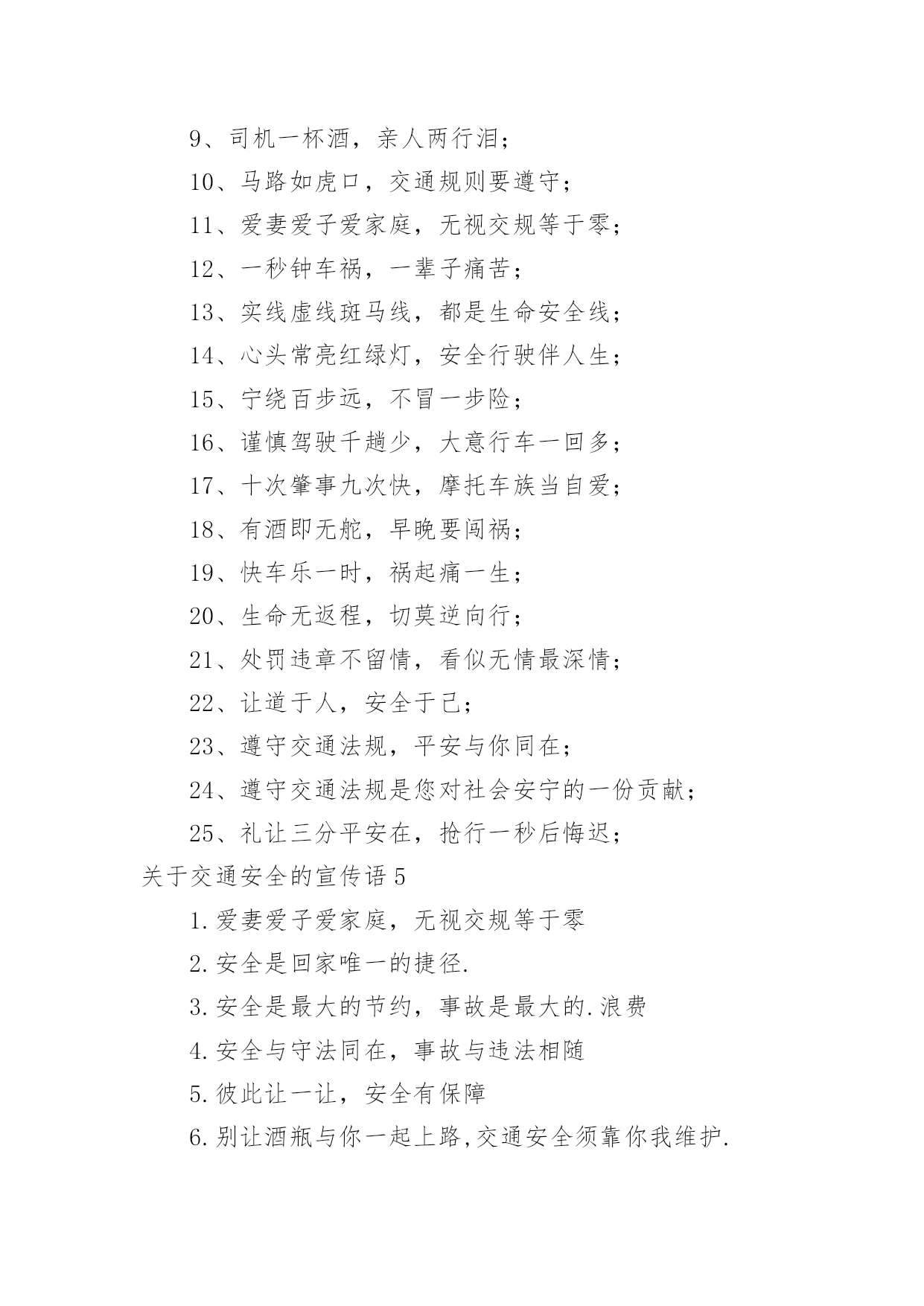 交通安全的宣传语关于交通安全的宣传语在平凡的学习、工作、生活中,大家都接触过比较经典的宣传语吧,宣传语具有在理智上启发人们,在情感上打动人们的作用。你写宣传语时总是没有新意?以下是小编收集整理的关于交通安全的宣传语,仅供参考,大家一起来看看吧。关于交通安全的宣传语11、带一分小心上路,携一团温馨回家。2、走遍东西南北中,安全二字记心中。3、超载多一吨,危险增十分。4、步步小心,平安是金5、居安思危危自小有备无患患可除。6、带上平安上路,载着幸福回家。7、爱妻爱子爱家庭,无视交规等于零。8、遵守交通规则,安全在每个人手中。9、宁等3分,不抢一秒。10、安全你我他,步步小心平安是金。11、树立现代交通意识,养成良好交通习惯。12、迈文明步子,行安全车子,做谦让君子,享平安日子。13、红灯无数次,生命只一次。14、忌逢喜易狂妄,乐极生悲把命丧。15、有酒即无舵早晚要闯祸。16、开车多一分小心,家人多十分安心。17、礼让礼让,人车无恙。18、反违章防事故大家共走平安路。19、人在路中守交规,法在心中路畅通。20、若要亲人勿牵挂,酒后不要把车驾。21、忌驾车打电话,一心二用很可怕。22、路上多一分安全,生活多一分快乐。23、心头常亮红绿灯,安全行驶伴人生。24、酒性发作不由人,醉酒开车祸害深。25、父母养育不容易,谨慎行走莫大意。26、酒后驾车者,医院给你开好了房间。27、司机一杯酒,亲人两行泪。28、宁停三分为安全,礼让三先保平安。29、台风天气,请谨慎驾驶30、乱穿马路最危险,文明行路保安全。31、忌驾车穿拖鞋,脚底汗滑车不乖。32、遵守交通规则就等于珍惜生命。33、虽为坦途超速者戒纵有捷径乱穿者止。34、文明交通安全在,留住生命留住爱。35、超载超速,危机四伏。36、忌与人比车快,争强好胜造事快。37、让与争一闪念,安与危一瞬间。38、行路慎为本,开车礼当先。39、一慢、二看、三通过。40、谨慎驾驶千趟少大意行车一回多。41、大家小家是一家,交通安全靠大家。42、当心车祸,您的亲人正在家中等着您。43、礼让三分平安在,抢行一秒后悔迟。44、无证开车,作茧自缚。45、何愁路途多遥远,遵守法规保平安。46、交通安全,人人有则。遵守法规,从我做起。47、请慢慢享受人生,因为你将死很久。48、交通法规人人遵守,文明社区家家幸福。49、爱我,追我,千万别吻我。50、手握方向盘,脚踩人命关。关于交通安全的宣传语21、忍一忍风平浪静,让一让海阔天空。2、赌气是罪恶之源,忍让才能保证安全。3、损人是祸,让人是福。4、宁可有理让无理,不可有理对无理。5、退一步,自然妥稳,忍一句,自是平安。6、忍让非已弱,敬人得人尊。7、行车都抢先,事故在后边。8、酒后驾车者,医院给你开好了房间。9、酗酒开车是驶向死亡与坟墓的选择。10、酒性发作不由人,醉酒开车祸害深。11、开车喝了酒,喜事变忧愁。12、交通法规,生命之友。13、要想车祸不上身,交通法规牢记深。14、违章与事故同在,守纪与安全永存。15、何愁路途多遥远,遵守法规保平安。16、不讲卫生要生病,不讲安全要送命。17、违章是事故的`先导。18、违章是安全的大敌,车祸的朋友。19、无证开车,作茧自缚。20、违章驾驶,害人害己。21、庄稼离不开阳光,安全少不了规章。22、及时指出你违章的人,是你真正的朋友。23、十次事故九次快,谁不相信谁受害。24、威风不在车速高,安全才是第一招。25、快一点危险丛生,缓一秒风平浪静。26、晚回家五分钟比永远回不了家好。27、客货混装,害人害己。28、步步小心,安全是金。29、车祸猛如虎,千万莫马虎。30、刮风下雨路滑,不要抢道回家。31、交岔路口,看清再走。32、一看二慢三通过,麻痹大意闯大祸。33、驾驶“病”车行,代价血淋淋。34、行人靠边走,车成靠右行,交通秩序好,人车保安宁。35、人不斜穿,不车越线,各行其道。36、马路如虎口,劝君多留神。37、行人过路要小心,提前准备防万一。38、安全行走的人才能走得远。39、宁走千步远,不冒一步险。40、同志,亲人盼您平安回家。41、一人带“禁品”,全车都遭殃,大家齐制止,安全有保障。42、妻子儿女望穿眼,盼你安全把家还。43、提倡社会公德,爱护交通标志,设施。44、公路打晒粮,肇事悔断肠。45、违章占道,诱发事故。46、出了车祸速报警救死扶伤见真情。47、一人出车全家念一人平安全家福。48、一秒钟车祸一辈子痛苦。49、遵守交通法规关爱生命旅程。50、违章铸成终身悔守规伴你一世安。关于交通安全的宣传语31、爱家庭,无视交规等于零。2、维护水上交通秩序,确保春运交通安全!3、春运交通安全从我做起,自觉抵制交通违法行为!4、为了万家团圆,确保春运安全!5、不乘违法车辆,确保乘车安全!6、春节回家团圆,莫忘交通安全。7、带一份小心上