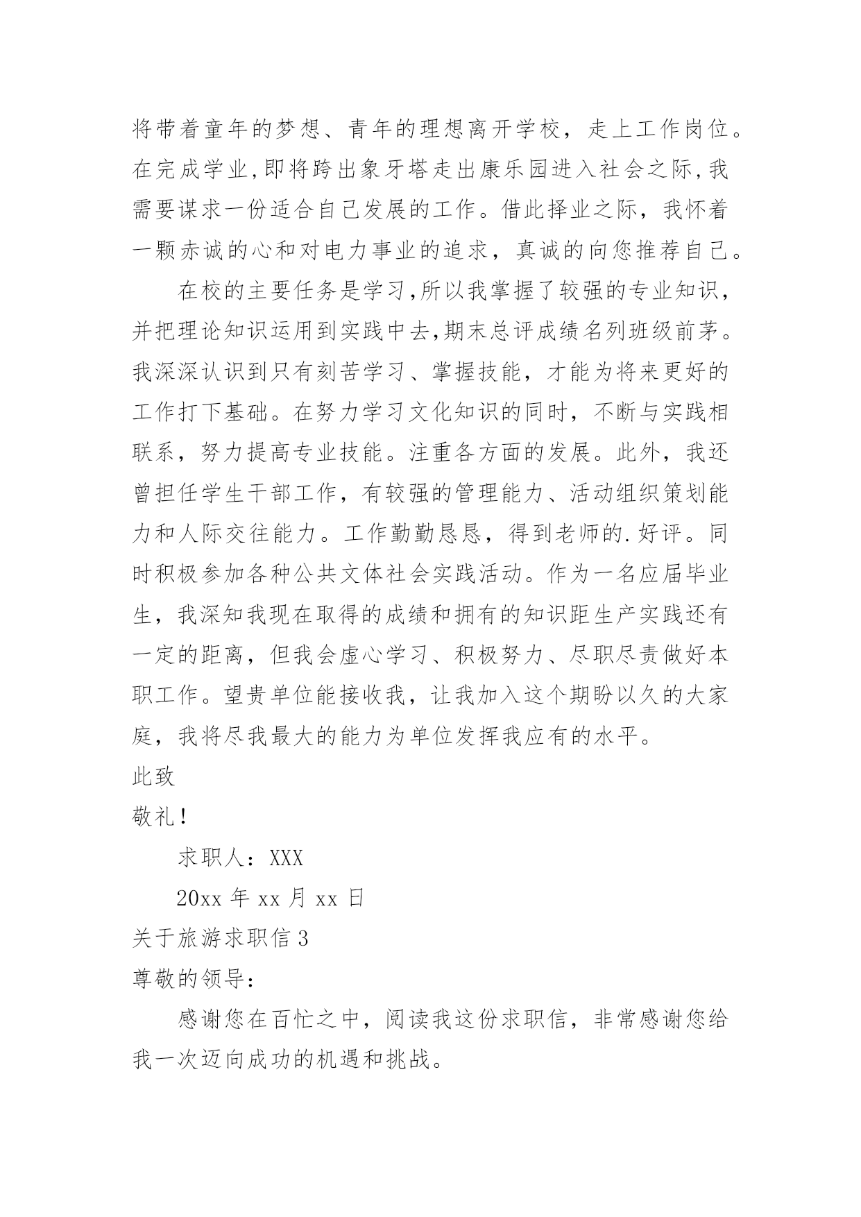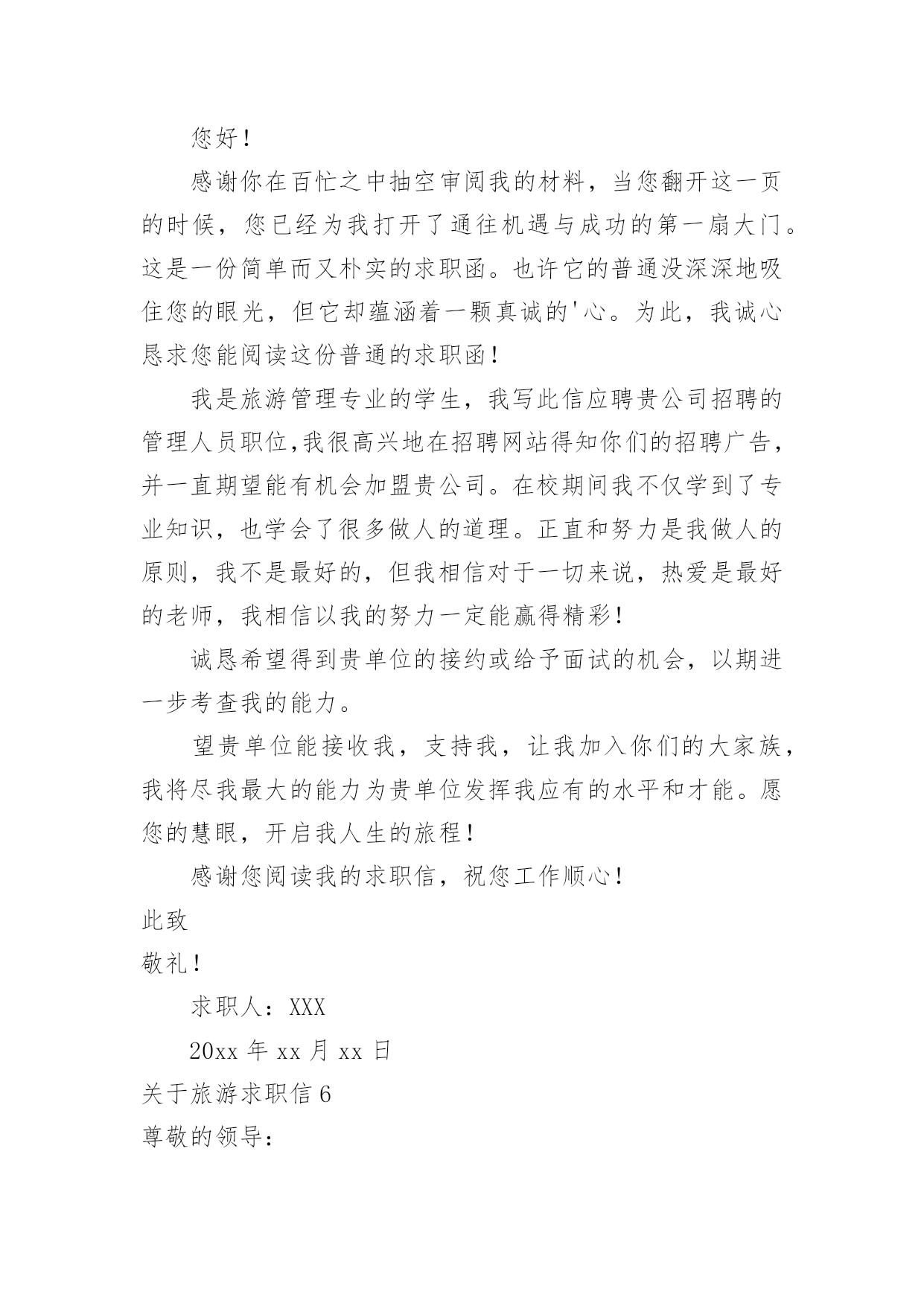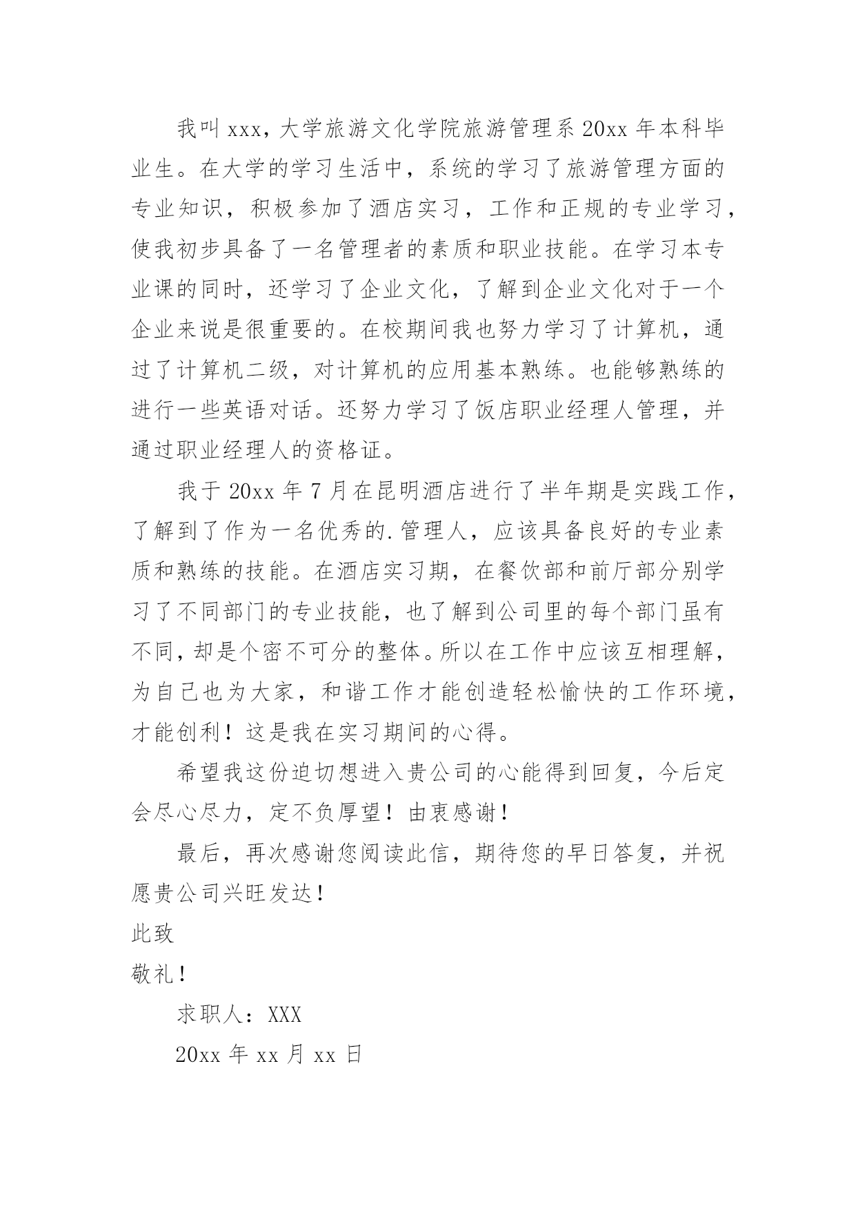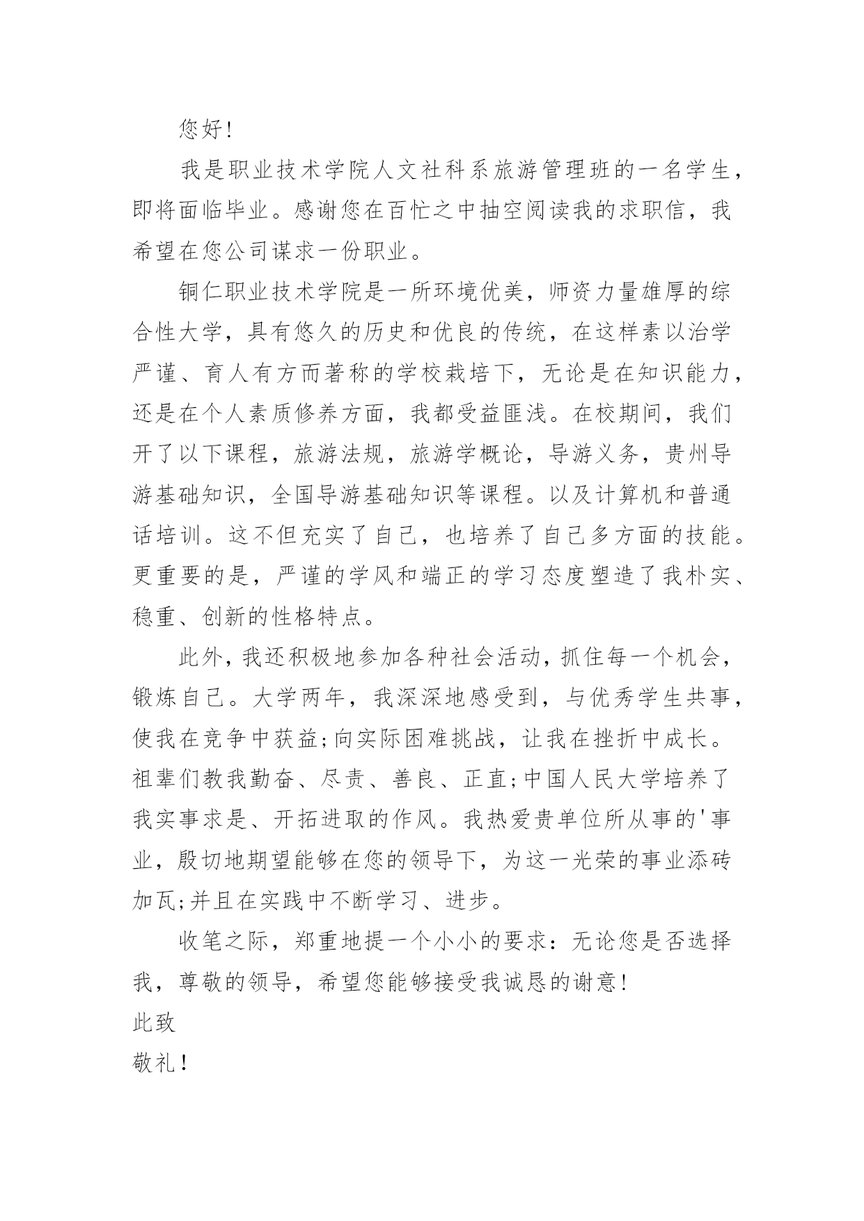 旅游求职信关于旅游求职信15篇时间是箭,去来迅疾,前方等待着我们的将是新的工作机会和挑战,是时候抽出时间写求职信了哦。写求职信需要注意哪些问题呢?以下是小编收集整理的关于旅游求职信,供大家参考借鉴,希望可以帮助到有需要的朋友。关于旅游求职信1尊敬的领导:您好!感谢您在百忙之中审阅我的自荐书,这对一个即将迈出校门的学子而言,将是一份莫大的鼓励。相信您在给予我一个机会的同时,您也多一份选择!即将走向社会的我怀着一颗热忱的`心,诚挚地向您推荐自己!我叫xxx,是陕西XXXX旅游管理20xx届毕业生的一名专科生,我怀着一颗赤诚的心和对事业的执著追求,真诚地向您推荐自己。在校期间,我认真学习,勤奋刻苦,努力做好本职工作,在实践中积累了大量的工作经验,使自己具有良好的身体素质和心理素质。几年来我努力学习专业知识,从各门课程的基础知识出发,努力掌握其基本技能技巧,深钻细研,寻求其内在规律,并取得了良好的成绩,在大学里,丰富多彩的社会生活和井然有序而又紧张的学习气氛,使我得到多方面不同程度的锻炼和考验;正直和努力是我做人的原则;沉着和冷静是我遇事的态度;爱好广泛使我非常充实;众多的朋友使我倍感富有!我很强的事业心和责任感使我能够面对任何困难和挑战。这样一个竞争激烈的社会里,不仅要掌握好专业知识,更加做到与社会与时代接轨。因此,学习之余,我注重知识与能力的平衡发展。刚踏出校门的我谈不上十分的成熟和足够的经验,但我有过人的胆识和自信心,正所谓:“是龙,就应该去大海搏击,是鹰,就应该去长空翱翔。”面临人生的重大抉择之际,我希望能加盟于归单位,展示自己的才能,实现个人的理想与价值。这就是我的大学生自荐书范文。简单的几面纸,只是我的“包装”和“广告”,自身的“质量”和“能力”有待于您通过使用来证明。此致敬礼!求职人:XXX20xx年xx月xx日关于旅游求职信2尊敬的领导:您好!承蒙厚爱,您在百忙之中翻阅我的自荐材料,给我一次迈向成功的机会,不胜感激!我是北京科技职业学院专科学校旅游管理专业20xx届毕业生。毕业将至,又一个新开始即将来到,等待着我继续努力奋斗、迎接挑战。时光飞梭,将带着童年的梦想、青年的理想离开学校,走上工作岗位。在完成学业,即将跨出象牙塔走出康乐园进入社会之际,我需要谋求一份适合自己发展的工作。借此择业之际,我怀着一颗赤诚的心和对电力事业的追求,真诚的向您推荐自己。在校的主要任务是学习,所以我掌握了较强的专业知识,并把理论知识运用到实践中去,期末总评成绩名列班级前茅。我深深认识到只有刻苦学习、掌握技能,才能为将来更好的工作打下基础。在努力学习文化知识的同时,不断与实践相联系,努力提高专业技能。注重各方面的发展。此外,我还曾担任学生干部工作,有较强的管理能力、活动组织策划能力和人际交往能力。工作勤勤恳恳,得到老师的.好评。同时积极参加各种公共文体社会实践活动。作为一名应届毕业生,我深知我现在取得的成绩和拥有的知识距生产实践还有一定的距离,但我会虚心学习、积极努力、尽职尽责做好本职工作。望贵单位能接收我,让我加入这个期盼以久的大家庭,我将尽我最大的能力为单位发挥我应有的水平。此致敬礼!求职人:XXX20xx年xx月xx日关于旅游求职信3尊敬的领导:感谢您在百忙之中,阅读我这份求职信,非常感谢您给我一次迈向成功的机遇和挑战。我叫xxx,大学旅游文化学院旅游管理系20xx年本科毕业生。在大学的学习生活中,系统的学习了旅游管理方面的专业知识,积极参加了酒店实习,工作和正规的专业学习,使我初步具备了一名管理者的素质和职业技能。在学习本专业课的同时,还学习了企业文化,了解到企业文化对于一个企业来说是很重要的。在校期间我也努力学习了计算机,通过了计算机二级,对计算机的应用基本熟练。也能够熟练的进行一些英语对话。还努力学习了饭店职业经理人管理,并通过职业经理人的资格证。我于20xx年7月在昆明酒店进行了半年期是实践工作,了解到了作为一名优秀的.管理人,应该具备良好的专业素质和熟练的技能。在酒店实习期,在餐饮部和前厅部分别学习了不同部门的专业技能,也了解到公司里的每个部门虽有不同,却是个密不可分的整体。所以在工作中应该互相理解,为自己也为大家,和谐工作才能创造轻松愉快的工作环境,才能创利!这是我在实习期间的心得。希望我这份迫切想进入贵公司的心能得到回复,今后定会尽心尽力,定不负厚望!由衷感谢!最后,再次感谢您阅读此信,期待您的早日答复,并祝愿贵公司兴旺发达!此致敬礼!求职人:XXX20xx年xx月xx日关于旅游求职信4各位领导:您好!感谢您在百忙之中阅读我的个人求职信,同时向您的企业和敬业的员工表示深深的敬意。我是陕西工业交通大学20xx级旅游英语专业的刘xx,即将毕业!虽然我不是一流名校出身,但我始终以高素质人才为榜样,脚踏实地为梦想而努力。以一种