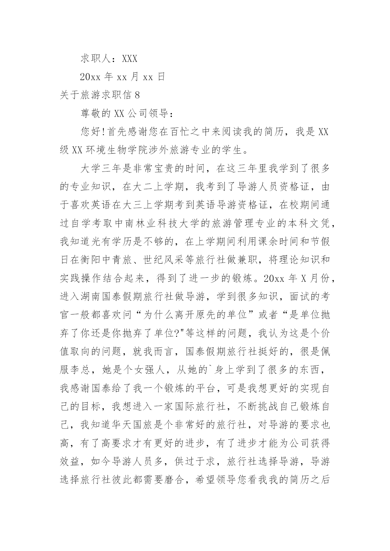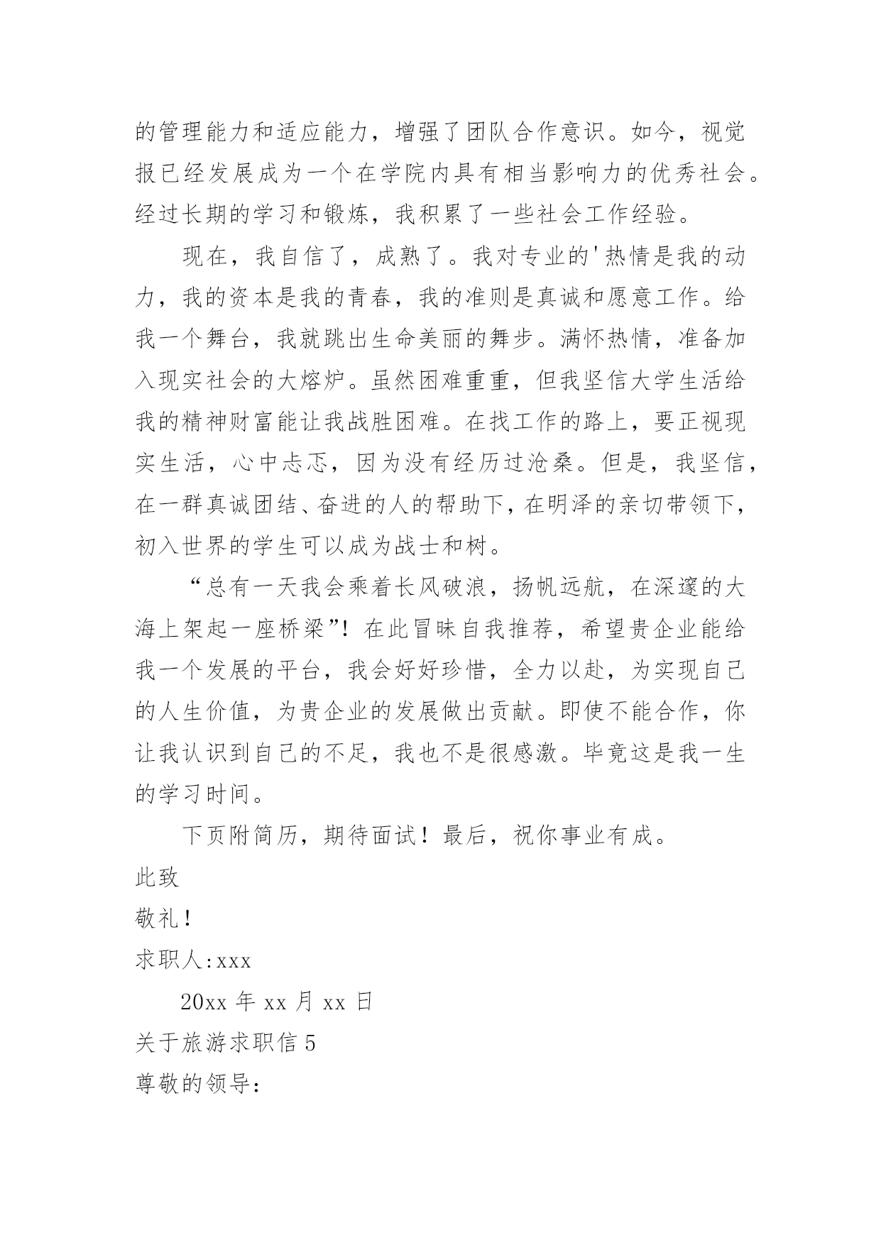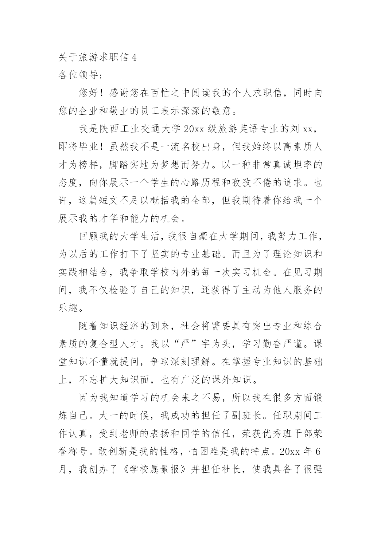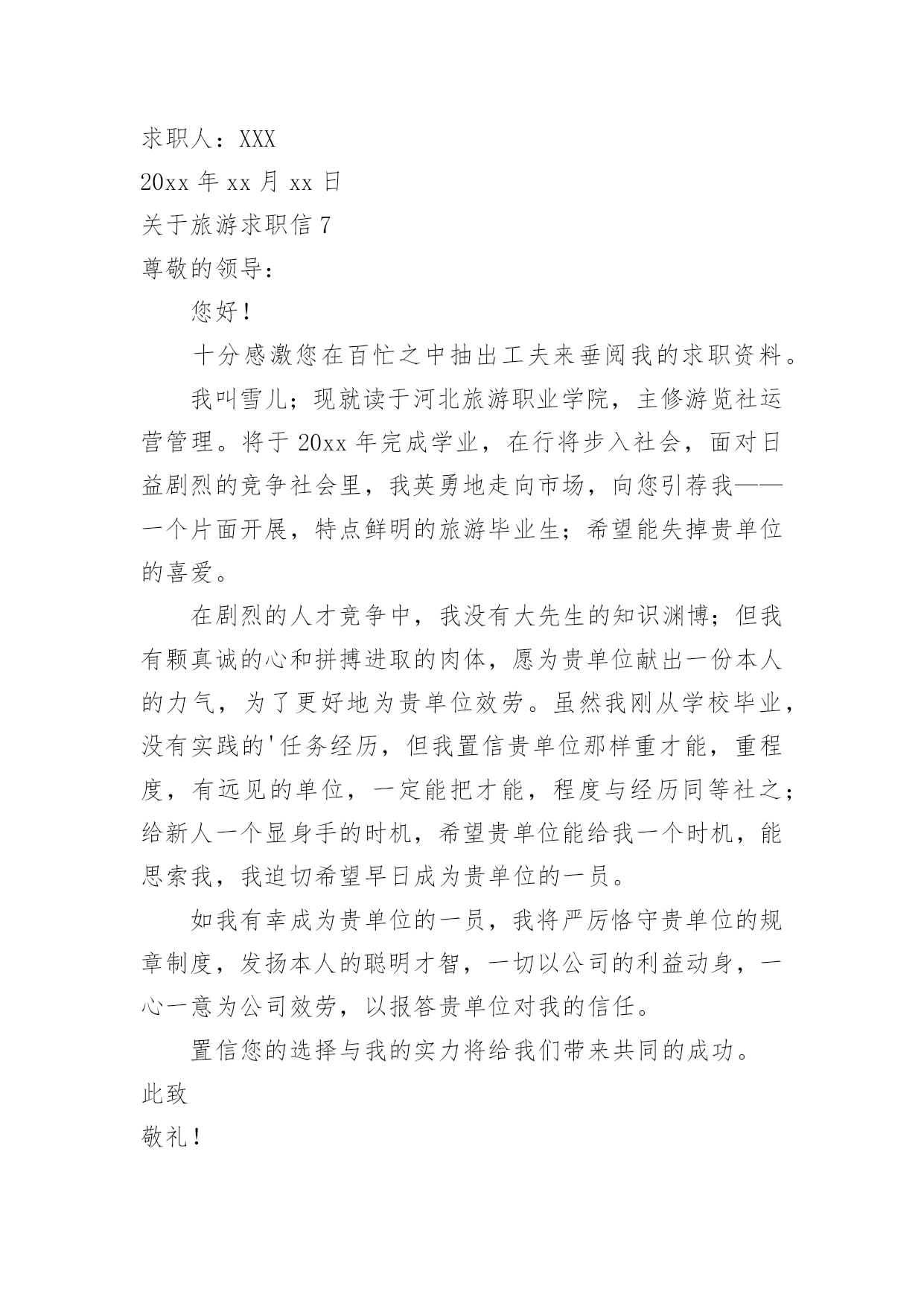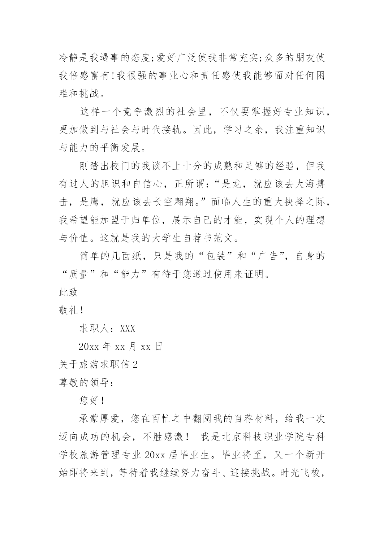 旅游求职信关于旅游求职信15篇时间是箭,去来迅疾,前方等待着我们的将是新的工作机会和挑战,是时候抽出时间写求职信了哦。写求职信需要注意哪些问题呢?以下是小编收集整理的关于旅游求职信,供大家参考借鉴,希望可以帮助到有需要的朋友。关于旅游求职信1尊敬的领导:您好!感谢您在百忙之中审阅我的自荐书,这对一个即将迈出校门的学子而言,将是一份莫大的鼓励。相信您在给予我一个机会的同时,您也多一份选择!即将走向社会的我怀着一颗热忱的`心,诚挚地向您推荐自己!我叫xxx,是陕西XXXX旅游管理20xx届毕业生的一名专科生,我怀着一颗赤诚的心和对事业的执著追求,真诚地向您推荐自己。在校期间,我认真学习,勤奋刻苦,努力做好本职工作,在实践中积累了大量的工作经验,使自己具有良好的身体素质和心理素质。几年来我努力学习专业知识,从各门课程的基础知识出发,努力掌握其基本技能技巧,深钻细研,寻求其内在规律,并取得了良好的成绩,在大学里,丰富多彩的社会生活和井然有序而又紧张的学习气氛,使我得到多方面不同程度的锻炼和考验;正直和努力是我做人的原则;沉着和冷静是我遇事的态度;爱好广泛使我非常充实;众多的朋友使我倍感富有!我很强的事业心和责任感使我能够面对任何困难和挑战。这样一个竞争激烈的社会里,不仅要掌握好专业知识,更加做到与社会与时代接轨。因此,学习之余,我注重知识与能力的平衡发展。刚踏出校门的我谈不上十分的成熟和足够的经验,但我有过人的胆识和自信心,正所谓:“是龙,就应该去大海搏击,是鹰,就应该去长空翱翔。”面临人生的重大抉择之际,我希望能加盟于归单位,展示自己的才能,实现个人的理想与价值。这就是我的大学生自荐书范文。简单的几面纸,只是我的“包装”和“广告”,自身的“质量”和“能力”有待于您通过使用来证明。此致敬礼!求职人:XXX20xx年xx月xx日关于旅游求职信2尊敬的领导:您好!承蒙厚爱,您在百忙之中翻阅我的自荐材料,给我一次迈向成功的机会,不胜感激!我是北京科技职业学院专科学校旅游管理专业20xx届毕业生。毕业将至,又一个新开始即将来到,等待着我继续努力奋斗、迎接挑战。时光飞梭,将带着童年的梦想、青年的理想离开学校,走上工作岗位。在完成学业,即将跨出象牙塔走出康乐园进入社会之际,我需要谋求一份适合自己发展的工作。借此择业之际,我怀着一颗赤诚的心和对电力事业的追求,真诚的向您推荐自己。在校的主要任务是学习,所以我掌握了较强的专业知识,并把理论知识运用到实践中去,期末总评成绩名列班级前茅。我深深认识到只有刻苦学习、掌握技能,才能为将来更好的工作打下基础。在努力学习文化知识的同时,不断与实践相联系,努力提高专业技能。注重各方面的发展。此外,我还曾担任学生干部工作,有较强的管理能力、活动组织策划能力和人际交往能力。工作勤勤恳恳,得到老师的.好评。同时积极参加各种公共文体社会实践活动。作为一名应届毕业生,我深知我现在取得的成绩和拥有的知识距生产实践还有一定的距离,但我会虚心学习、积极努力、尽职尽责做好本职工作。望贵单位能接收我,让我加入这个期盼以久的大家庭,我将尽我最大的能力为单位发挥我应有的水平。此致敬礼!求职人:XXX20xx年xx月xx日关于旅游求职信3尊敬的领导:感谢您在百忙之中,阅读我这份求职信,非常感谢您给我一次迈向成功的机遇和挑战。我叫xxx,大学旅游文化学院旅游管理系20xx年本科毕业生。在大学的学习生活中,系统的学习了旅游管理方面的专业知识,积极参加了酒店实习,工作和正规的专业学习,使我初步具备了一名管理者的素质和职业技能。在学习本专业课的同时,还学习了企业文化,了解到企业文化对于一个企业来说是很重要的。在校期间我也努力学习了计算机,通过了计算机二级,对计算机的应用基本熟练。也能够熟练的进行一些英语对话。还努力学习了饭店职业经理人管理,并通过职业经理人的资格证。我于20xx年7月在昆明酒店进行了半年期是实践工作,了解到了作为一名优秀的.管理人,应该具备良好的专业素质和熟练的技能。在酒店实习期,在餐饮部和前厅部分别学习了不同部门的专业技能,也了解到公司里的每个部门虽有不同,却是个密不可分的整体。所以在工作中应该互相理解,为自己也为大家,和谐工作才能创造轻松愉快的工作环境,才能创利!这是我在实习期间的心得。希望我这份迫切想进入贵公司的心能得到回复,今后定会尽心尽力,定不负厚望!由衷感谢!最后,再次感谢您阅读此信,期待您的早日答复,并祝愿贵公司兴旺发达!此致敬礼!求职人:XXX20xx年xx月xx日关于旅游求职信4各位领导:您好!感谢您在百忙之中阅读我的个人求职信,同时向您的企业和敬业的员工表示深深的敬意。我是陕西工业交通大学20xx级旅游英语专业的刘xx,即将毕业!虽然我不是一流名校出身,但我始终以高素质人才为榜样,脚踏实地为梦想而努力。以一种