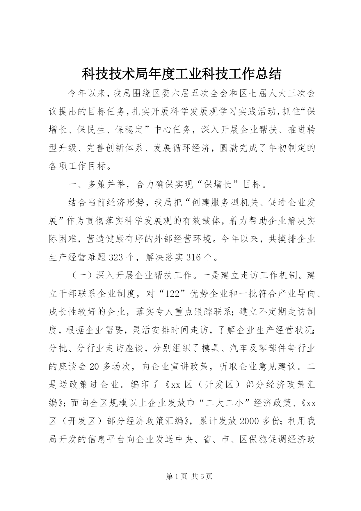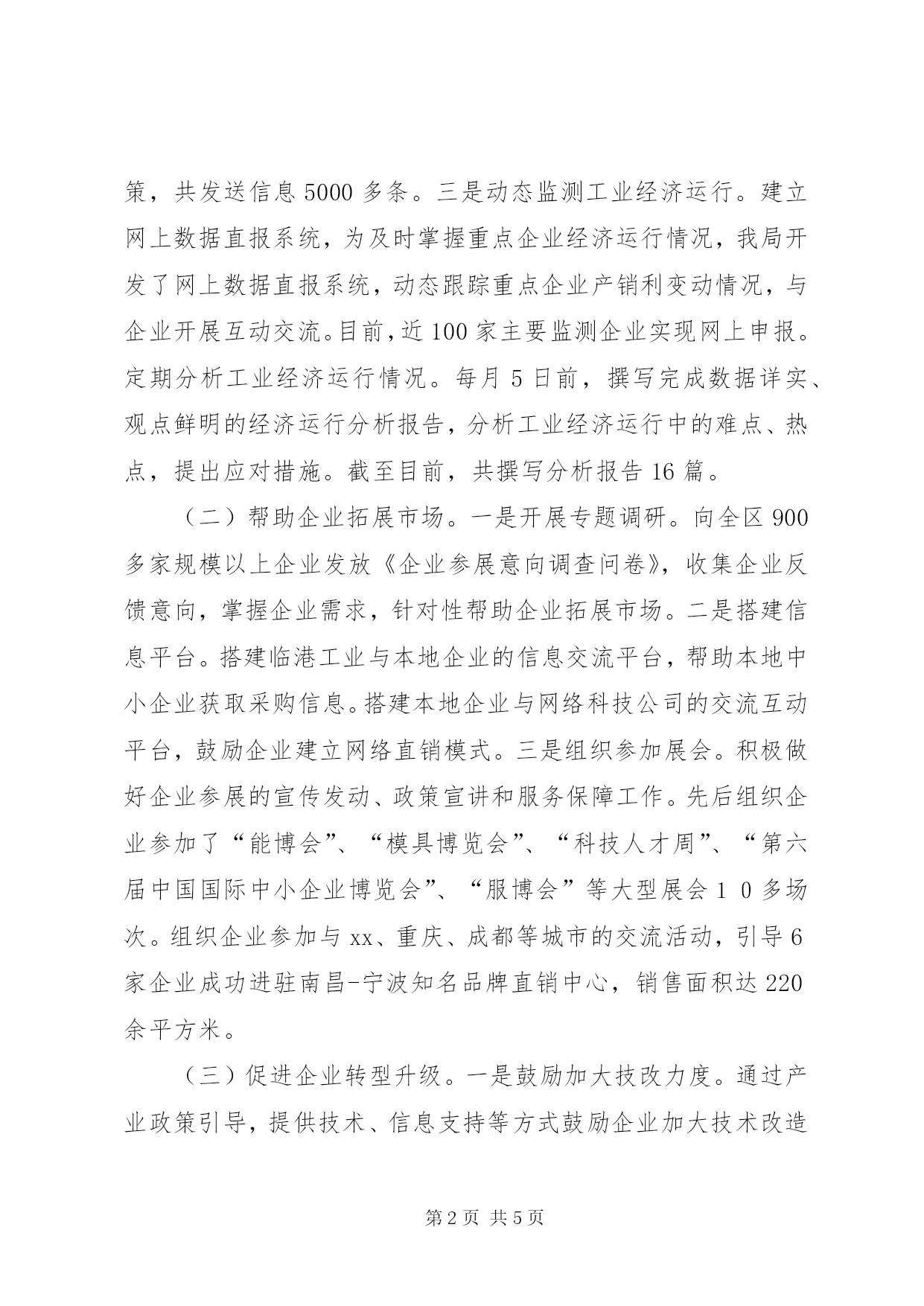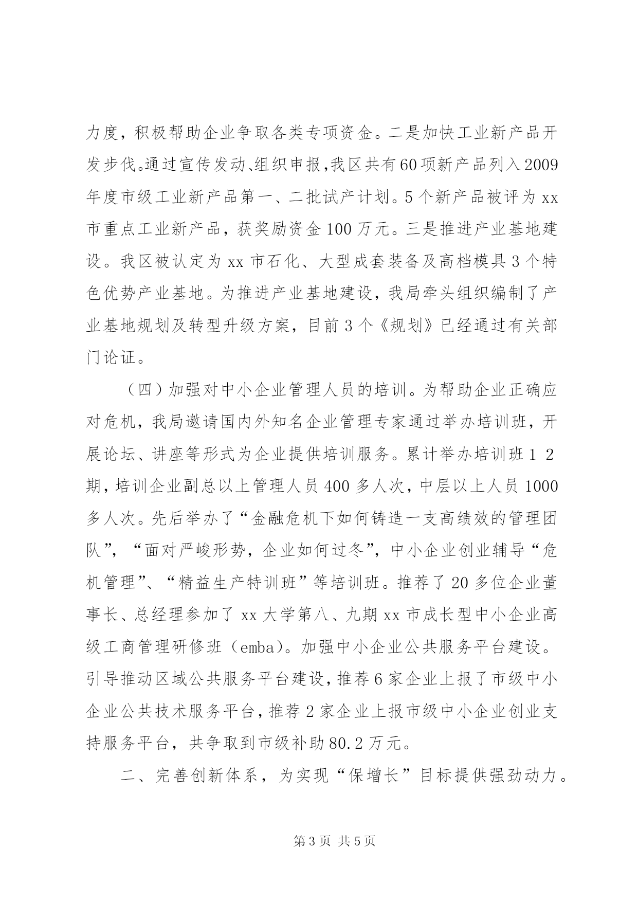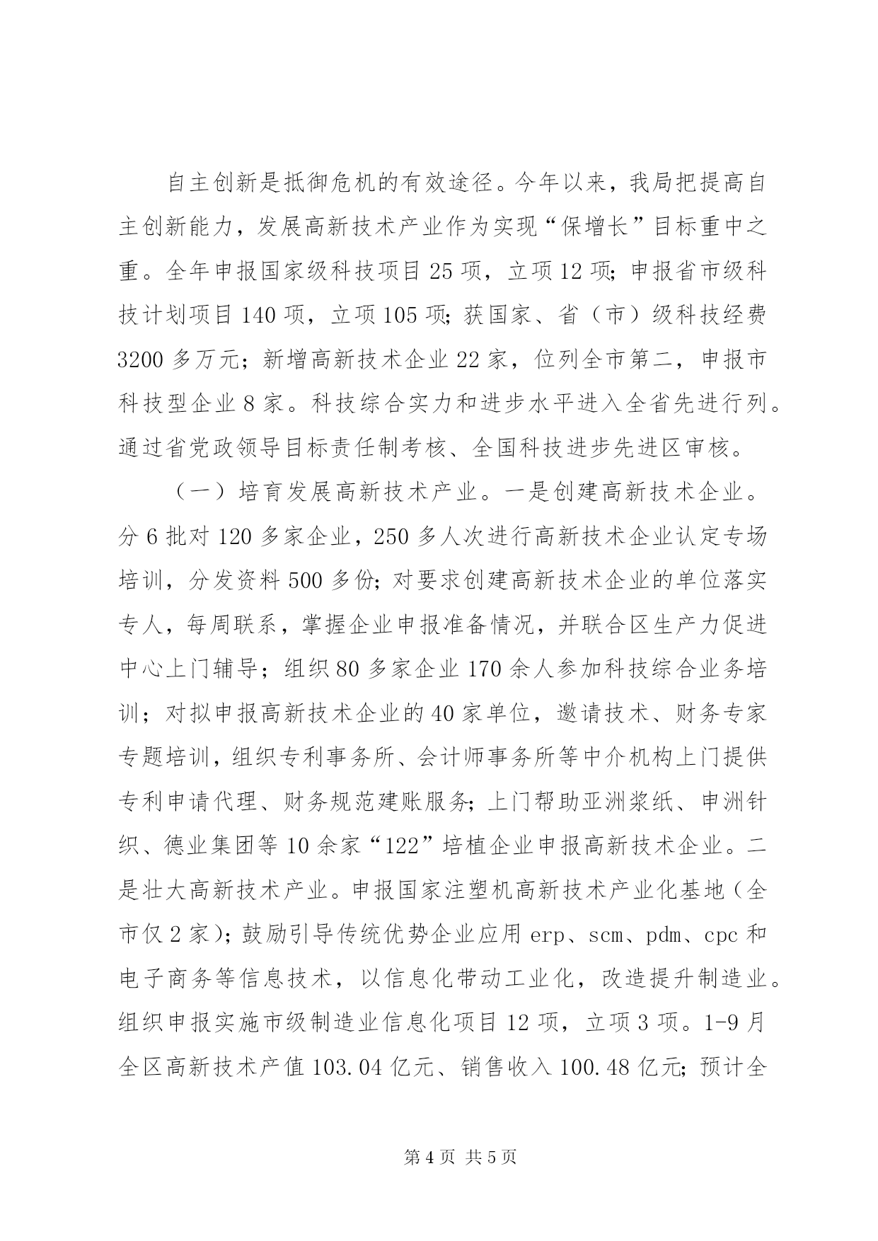 第PAGE\*Arabic\*MERGEFORMAT5页共NUMPAGES\*MERGEFORMAT5页科技技术局年度工业科技工作总结今年以来,我局围绕区委六届五次全会和区七届人大三次会议提出的目标任务,扎实开展科学发展观学习实践活动,抓住“保增长、保民生、保稳定”中心任务,深入开展企业帮扶、推进转型升级、完善创新体系、发展循环经济,圆满完成了年初制定的各项工作目标。一、多策并举,合力确保实现“保增长”目标。结合当前经济形势,我局把“创建服务型机关、促进企业发展”作为贯彻落实科学发展观的有效载体,着力帮助企业解决实际困难,营造健康有序的外部经营环境。今年以来,共摸排企业生产经营难题323个,解决落实316个。(一)深入开展企业帮扶工作。一是建立走访工作机制。建立干部联系企业制度,对“122”优势企业和一批符合产业导向、成长性较好的企业,落实专人重点跟踪联系;建立不定期走访制度,根据企业需要,灵活安排时间走访,了解企业生产经营状况;分批、分行业走访座谈,分别组织了模具、汽车及零部件等行业的座谈会20多场次,向企业宣讲政策,听取企业意见建议。二是送政策进企业。编印了《xx区(开发区)部分经济政策汇编》;面向全区规模以上企业发放市“二大二小”经济政策、《xx区(开发区)部分经济政策汇编》,累计发放2000多份;利用我局开发的信息平台向企业发送中央、省、市、区保稳促调经济政策,共发送信息5000多条。三是动态监测工业经济运行。建立网上数据直报系统,为及时掌握重点企业经济运行情况,我局开发了网上数据直报系统,动态跟踪重点企业产销利变动情况,与企业开展互动交流。目前,近100家主要监测企业实现网上申报。定期分析工业经济运行情况。每月5日前,撰写完成数据详实、观点鲜明的经济运行分析报告,分析工业经济运行中的难点、热点,提出应对措施。截至目前,共撰写分析报告16篇。(二)帮助企业拓展市场。一是开展专题调研。向全区900多家规模以上企业发放《企业参展意向调查问卷》,收集企业反馈意向,掌握企业需求,针对性帮助企业拓展市场。二是搭建信息平台。搭建临港工业与本地企业的信息交流平台,帮助本地中小企业获取采购信息。搭建本地企业与网络科技公司的交流互动平台,鼓励企业建立网络直销模式。三是组织参加展会。积极做好企业参展的宣传发动、政策宣讲和服务保障工作。先后组织企业参加了“能博会”、“模具博览会”、“科技人才周”、“第六届中国国际中小企业博览会”、“服博会”等大型展会10多场次。组织企业参加与xx、重庆、成都等城市的交流活动,引导6家企业成功进驻南昌-宁波知名品牌直销中心,销售面积达220余平方米。(三)促进企业转型升级。一是鼓励加大技改力度。通过产业政策引导,提供技术、信息支持等方式鼓励企业加大技术改造力度,积极帮助企业争取各类专项资金。二是加快工业新产品开发步伐。通过宣传发动、组织申报,我区共有60项新产品列入2009年度市级工业新产品第一、二批试产计划。5个新产品被评为xx市重点工业新产品,获奖励资金100万元。三是推进产业基地建设。我区被认定为xx市石化、大型成套装备及高档模具3个特色优势产业基地。为推进产业基地建设,我局牵头组织编制了产业基地规划及转型升级方案,目前3个《规划》已经通过有关部门论证。(四)加强对中小企业管理人员的培训。为帮助企业正确应对危机,我局邀请国内外知名企业管理专家通过举办培训班,开展论坛、讲座等形式为企业提供培训服务。累计举办培训班12期,培训企业副总以上管理人员400多人次,中层以上人员1000多人次。先后举办了“金融危机下如何铸造一支高绩效的管理团队”,“面对严峻形势,企业如何过冬”,中小企业创业辅导“危机管理”、“精益生产特训班”等培训班。推荐了20多位企业董事长、总经理参加了xx大学第八、九期xx市成长型中小企业高级工商管理研修班(emba)。加强中小企业公共服务平台建设。引导推动区域公共服务平台建设,推荐6家企业上报了市级中小企业公共技术服务平台,推荐2家企业上报市级中小企业创业支持服务平台,共争取到市级补助80.2万元。二、完善创新体系,为实现“保增长”目标提供强劲动力。自主创新是抵御危机的有效途径。今年以来,我局把提高自主创新能力,发展高新技术产业作为实现“保增长”目标重中之重。全年申报国家级科技项目25项,立项12项;申报省市级科技计划项目140项,立项105项;获国家、省(市)级科技经费3200多万元;新增高新技术企业22家,位列全市第二,申报市科技型企业8家。科技综合实力和进步水平进入全省先进行列。通过省党政领导目标责任制考核、全国科技进步先进区审核。(一)培育发展高新技术产业。一是创建高新技术企业。分6批对120多家企业,250多人次进行高新技术企业认定专场培训,分发资料500