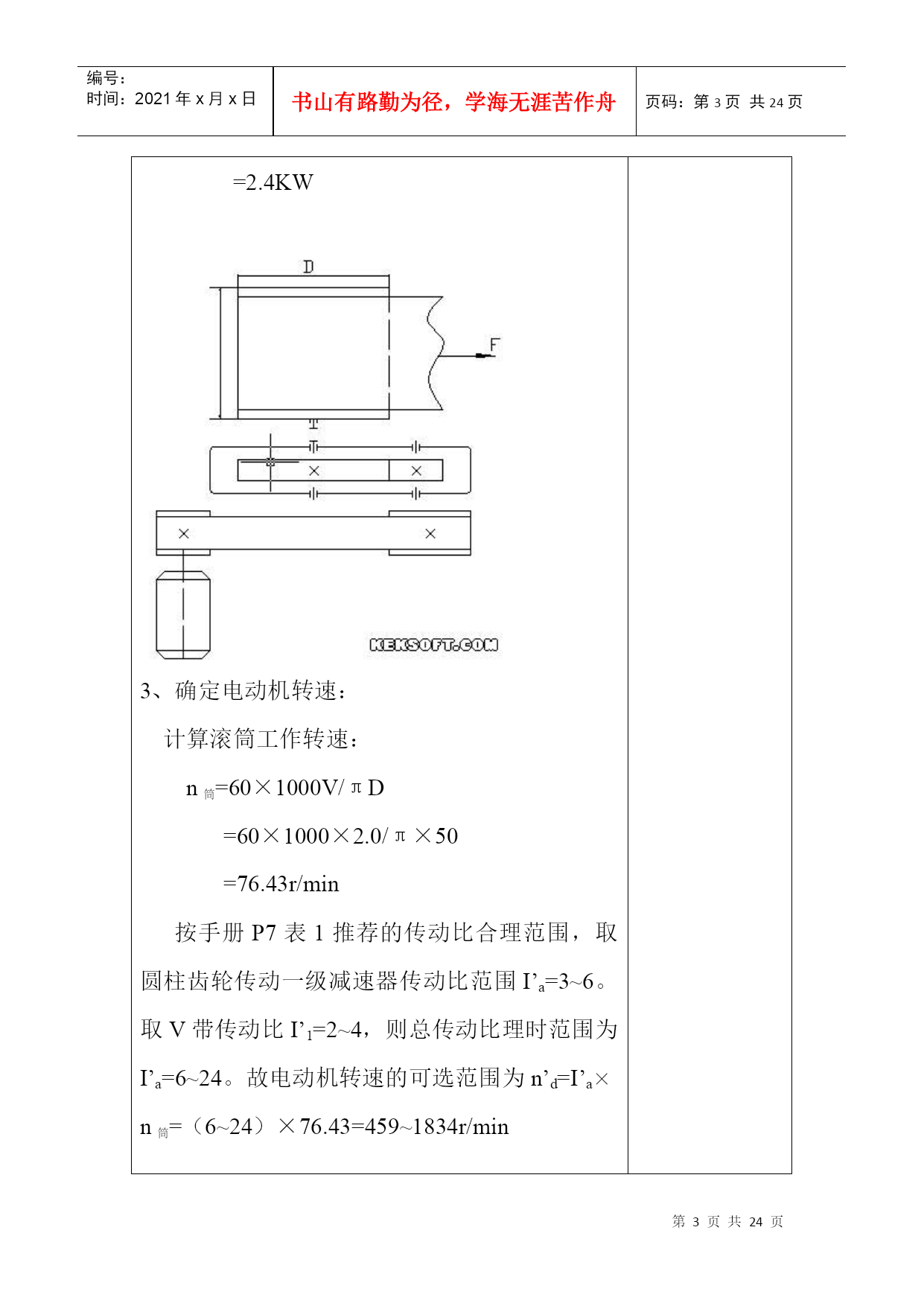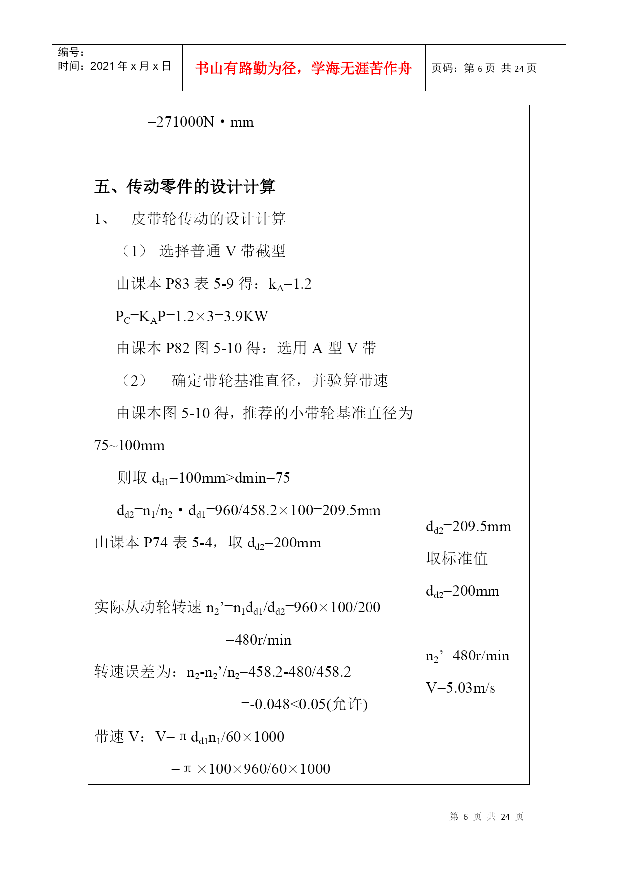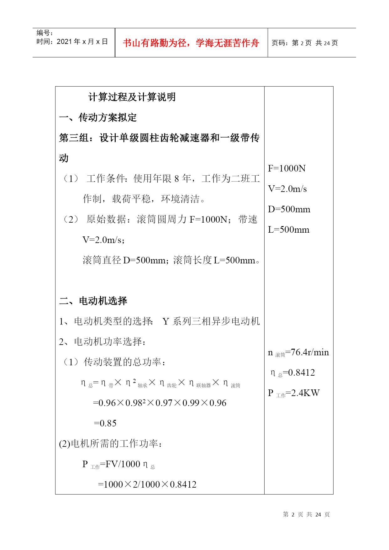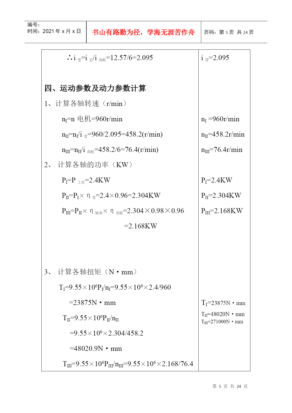 编号:时间:2021年x月x日书山有路勤为径,学海无涯苦作舟页码:第PAGE24页共NUMPAGES24页第PAGE\*MERGEFORMAT24页共NUMPAGES\*MERGEFORMAT24页机械设计课程设计计算说明书一、传动方案拟定…………….……………………………….2二、电动机的选择……………………………………….…….2三、计算总传动比及分配各级的传动比……………….…….4四、运动参数及动力参数计算………………………….…….5五、传动零件的设计计算………………………………….….6六、轴的设计计算………………………………………….....12七、滚动轴承的选择及校核计算………………………….…19八、键联接的选择及计算………..……………………………22设计题目:V带——单级圆柱减速器机电系01机电工程班设计者:学号:29号指导教师:二○○三年六月十四日计算过程及计算说明一、传动方案拟定第三组:设计单级圆柱齿轮减速器和一级带传动工作条件:使用年限8年,工作为二班工作制,载荷平稳,环境清洁。原始数据:滚筒圆周力F=1000N;带速V=2.0m/s;滚筒直径D=500mm;滚筒长度L=500mm。二、电动机选择1、电动机类型的选择:Y系列三相异步电动机2、电动机功率选择:(1)传动装置的总功率:η总=η带×η2轴承×η齿轮×η联轴器×η滚筒=0.96×0.982×0.97×0.99×0.96=0.85(2)电机所需的工作功率:P工作=FV/1000η总=1000×2/1000×0.8412=2.4KW3、确定电动机转速:计算滚筒工作转速:n筒=60×1000V/πD=60×1000×2.0/π×50=76.43r/min按手册P7表1推荐的传动比合理范围,取圆柱齿轮传动一级减速器传动比范围I’a=3~6。取V带传动比I’1=2~4,则总传动比理时范围为I’a=6~24。故电动机转速的可选范围为n’d=I’a×n筒=(6~24)×76.43=459~1834r/min符合这一范围的同步转速有750、1000、和1500r/min。根据容量和转速,由有关手册查出有三种适用的电动机型号:因此有三种传支比方案:如指导书P15页第一表。综合考虑电动机和传动装置尺寸、重量、价格和带传动、减速器的传动比,可见第2方案比较适合,则选n=1000r/min。4、确定电动机型号根据以上选用的电动机类型,所需的额定功率及同步转速,选定电动机型号为Y132S-6。其主要性能:额定功率:3KW,满载转速960r/min,额定转矩2.0。质量63kg。三、计算总传动比及分配各级的传动比1、总传动比:i总=n电动/n筒=960/76.4=12.572、分配各级伟动比据指导书P7表1,取齿轮i齿轮=6(单级减速器i=3~6合理)∵i总=i齿轮×I带∴i带=i总/i齿轮=12.57/6=2.095四、运动参数及动力参数计算1、计算各轴转速(r/min)nI=n电机=960r/minn=2\*ROMANII=nI/i带=960/2.095=458.2(r/min)n=3\*ROMANIII=n=2\*ROMANII/i齿轮=458.2/6=76.4(r/min)计算各轴的功率(KW)P=1\*ROMANI=P工作=2.4KWP=2\*ROMANII=P=1\*ROMANI×η带=2.4×0.96=2.304KWP=3\*ROMANIII=P=2\*ROMANII×η轴承×η齿轮=2.304×0.98×0.96=2.168KW计算各轴扭矩(N·mm)T=1\*ROMANI=9.55×106P=1\*ROMANI/n=1\*ROMANI=9.55×106×2.4/960=23875N·mmT=2\*ROMANII=9.55×106P=2\*ROMANII/n=2\*ROMANII=9.55×106×2.304/458.2=48020.9N·mmT=3\*ROMANIII=9.55×106P=3\*ROMANIII/n=3\*ROMANIII=9.55×106×2.168/76.4=271000N·mm五、传动零件的设计计算皮带轮传动的设计计算选择普通V带截型由课本P83表5-9得:kA=1.2PC=KAP=1.2×3=3.9KW由课本P82图5-10得:选用A型V带确定带轮基准直径,并验算带速由课本图5-10得,推荐的小带轮基准直径为7