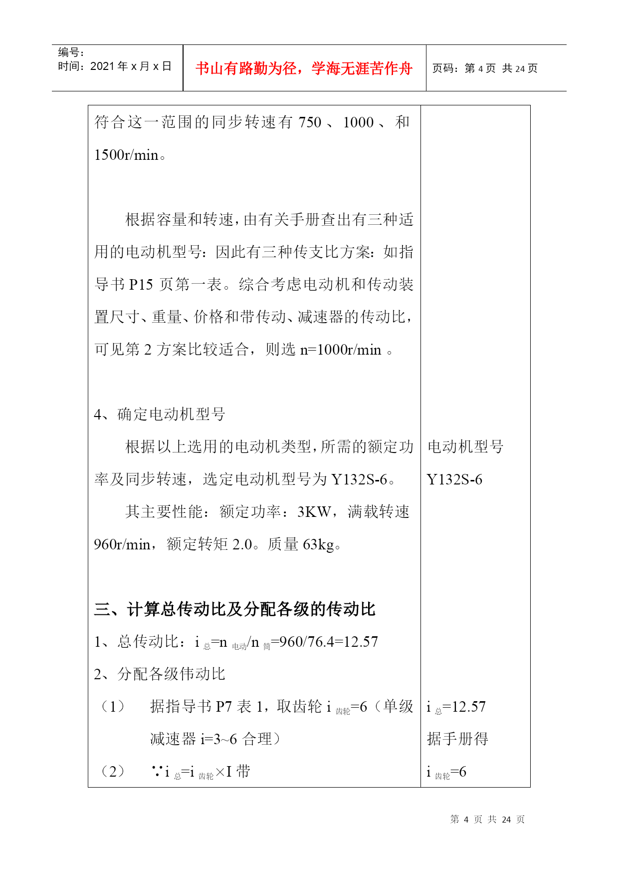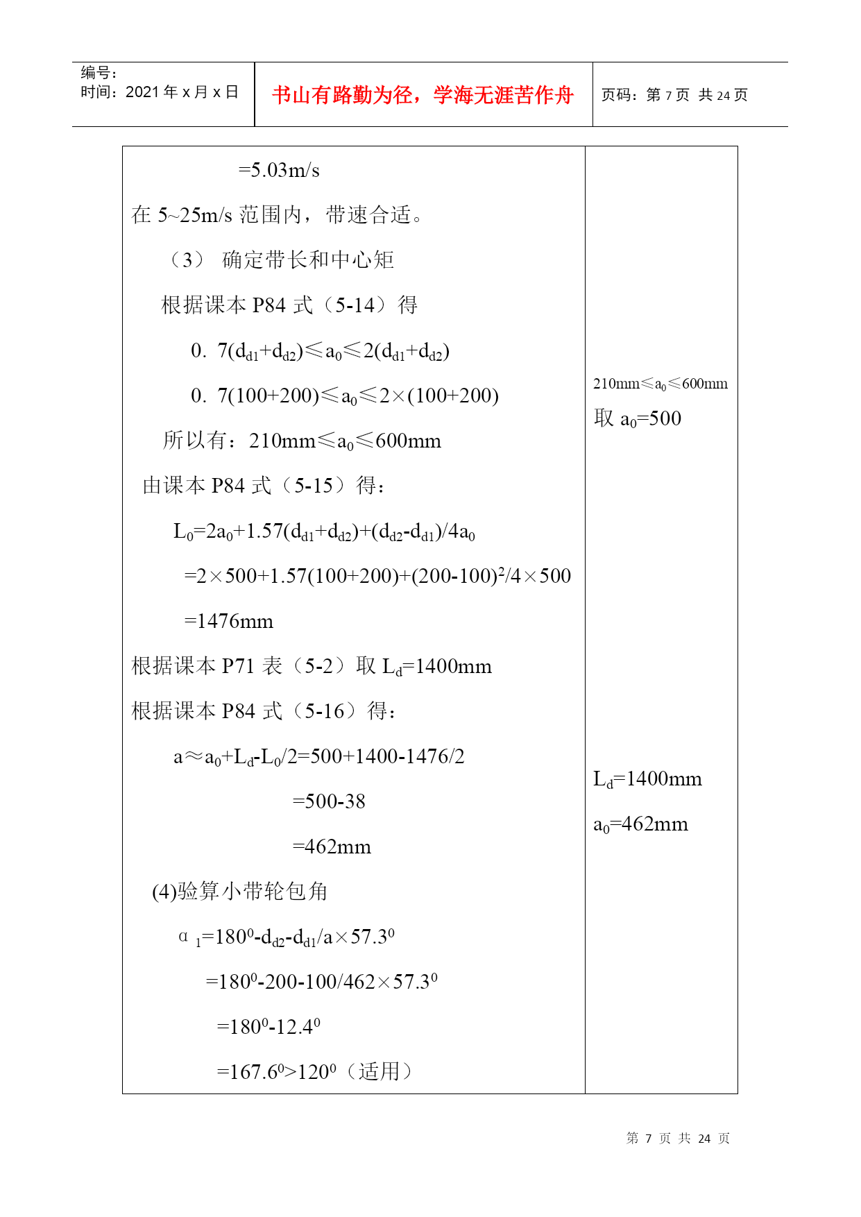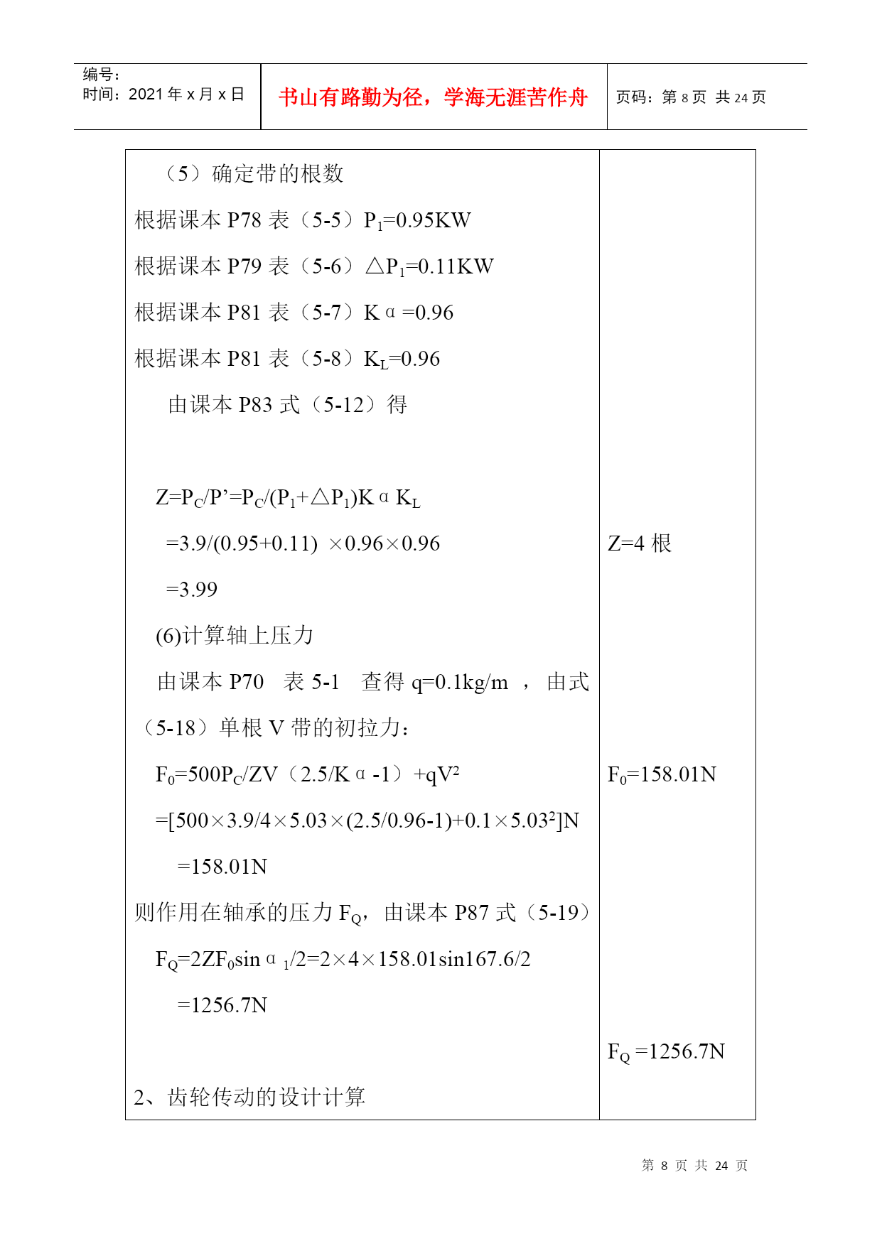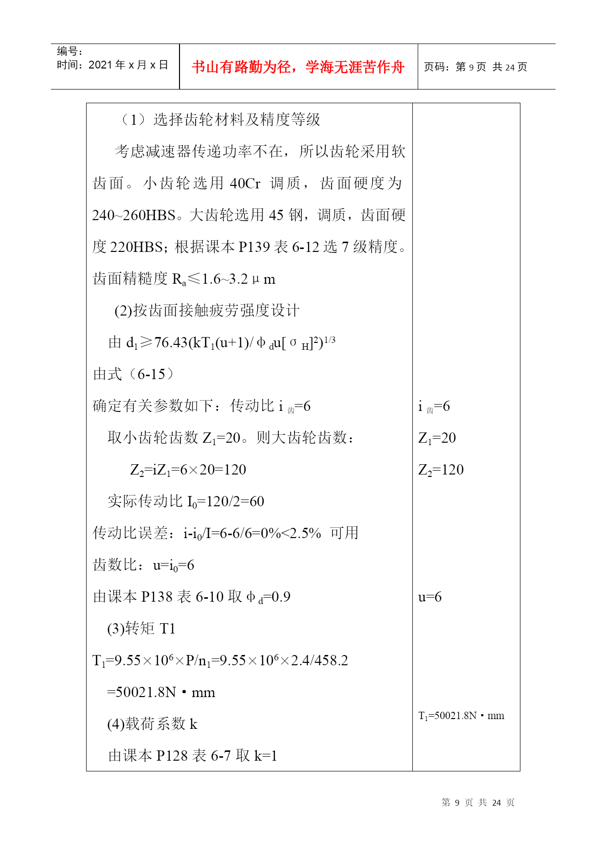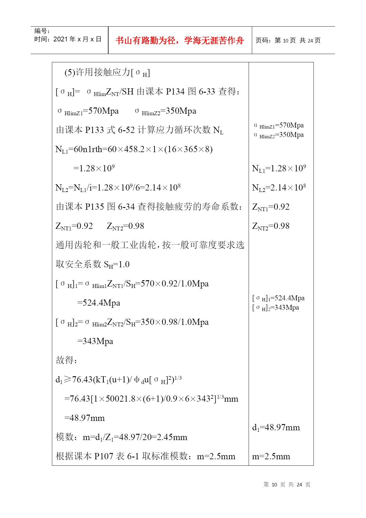 编号:时间:2021年x月x日书山有路勤为径,学海无涯苦作舟页码:第PAGE24页共NUMPAGES24页第PAGE\*MERGEFORMAT24页共NUMPAGES\*MERGEFORMAT24页机械设计课程设计计算说明书一、传动方案拟定…………….……………………………….2二、电动机的选择……………………………………….…….2三、计算总传动比及分配各级的传动比……………….…….4四、运动参数及动力参数计算………………………….…….5五、传动零件的设计计算………………………………….….6六、轴的设计计算………………………………………….....12七、滚动轴承的选择及校核计算………………………….…19八、键联接的选择及计算………..……………………………22设计题目:V带——单级圆柱减速器机电系01机电工程班设计者:学号:29号指导教师:二○○三年六月十四日计算过程及计算说明一、传动方案拟定第三组:设计单级圆柱齿轮减速器和一级带传动工作条件:使用年限8年,工作为二班工作制,载荷平稳,环境清洁。原始数据:滚筒圆周力F=1000N;带速V=2.0m/s;滚筒直径D=500mm;滚筒长度L=500mm。二、电动机选择1、电动机类型的选择:Y系列三相异步电动机2、电动机功率选择:(1)传动装置的总功率:η总=η带×η2轴承×η齿轮×η联轴器×η滚筒=0.96×0.982×0.97×0.99×0.96=0.85(2)电机所需的工作功率:P工作=FV/1000η总=1000×2/1000×0.8412=2.4KW3、确定电动机转速:计算滚筒工作转速:n筒=60×1000V/πD=60×1000×2.0/π×50=76.43r/min按手册P7表1推荐的传动比合理范围,取圆柱齿轮传动一级减速器传动比范围I’a=3~6。取V带传动比I’1=2~4,则总传动比理时范围为I’a=6~24。故电动机转速的可选范围为n’d=I’a×n筒=(6~24)×76.43=459~1834r/min符合这一范围的同步转速有750、1000、和1500r/min。根据容量和转速,由有关手册查出有三种适用的电动机型号:因此有三种传支比方案:如指导书P15页第一表。综合考虑电动机和传动装置尺寸、重量、价格和带传动、减速器的传动比,可见第2方案比较适合,则选n=1000r/min。4、确定电动机型号根据以上选用的电动机类型,所需的额定功率及同步转速,选定电动机型号为Y132S-6。其主要性能:额定功率:3KW,满载转速960r/min,额定转矩2.0。质量63kg。三、计算总传动比及分配各级的传动比1、总传动比:i总=n电动/n筒=960/76.4=12.572、分配各级伟动比据指导书P7表1,取齿轮i齿轮=6(单级减速器i=3~6合理)∵i总=i齿轮×I带∴i带=i总/i齿轮=12.57/6=2.095四、运动参数及动力参数计算1、计算各轴转速(r/min)nI=n电机=960r/minn=2\*ROMANII=nI/i带=960/2.095=458.2(r/min)n=3\*ROMANIII=n=2\*ROMANII/i齿轮=458.2/6=76.4(r/min)计算各轴的功率(KW)P=1\*ROMANI=P工作=2.4KWP=2\*ROMANII=P=1\*ROMANI×η带=2.4×0.96=2.304KWP=3\*ROMANIII=P=2\*ROMANII×η轴承×η齿轮=2.304×0.98×0.96=2.168KW计算各轴扭矩(N·mm)T=1\*ROMANI=9.55×106P=1\*ROMANI/n=1\*ROMANI=9.55×106×2.4/960=23875N·mmT=2\*ROMANII=9.55×106P=2\*ROMANII/n=2\*ROMANII=9.55×106×2.304/458.2=48020.9N·mmT=3\*ROMANIII=9.55×106P=3\*ROMANIII/n=3\*ROMANIII=9.55×106×2.168/76.4=271000N·mm五、传动零件的设计计算皮带轮传动的设计计算选择普通V带截型由课本P83表5-9得:kA=1.2PC=KAP=1.2×3=3.9KW由课本P82图5-10得:选用A型V带确定带轮基准直径,并验算带速由课本图5-10得,推荐的小带轮基准直径为7