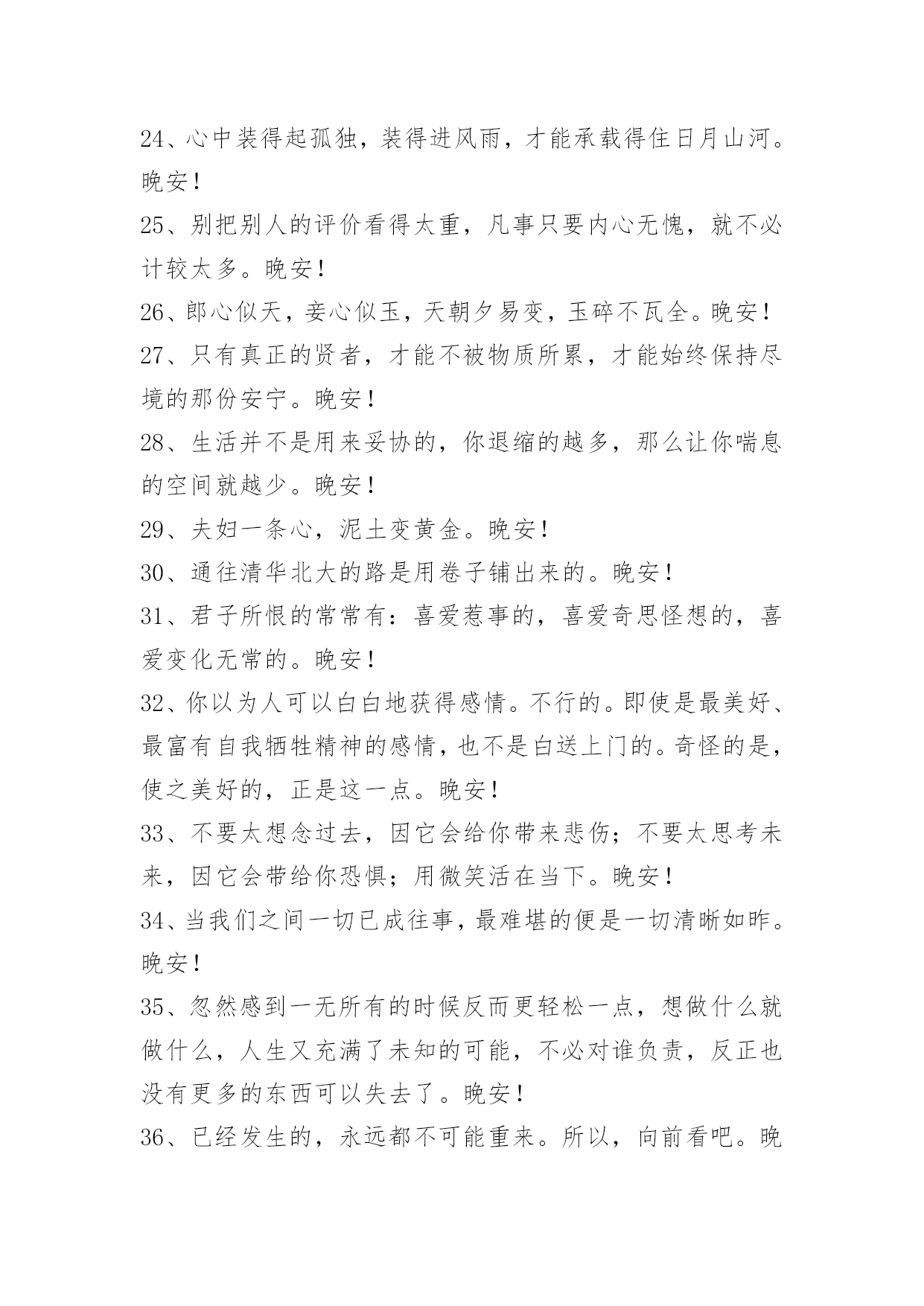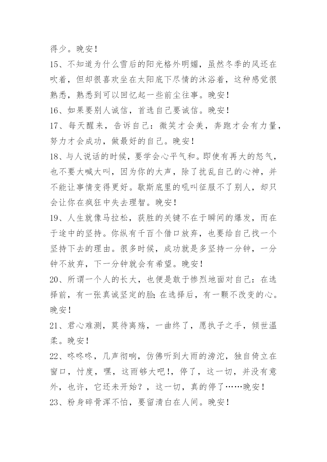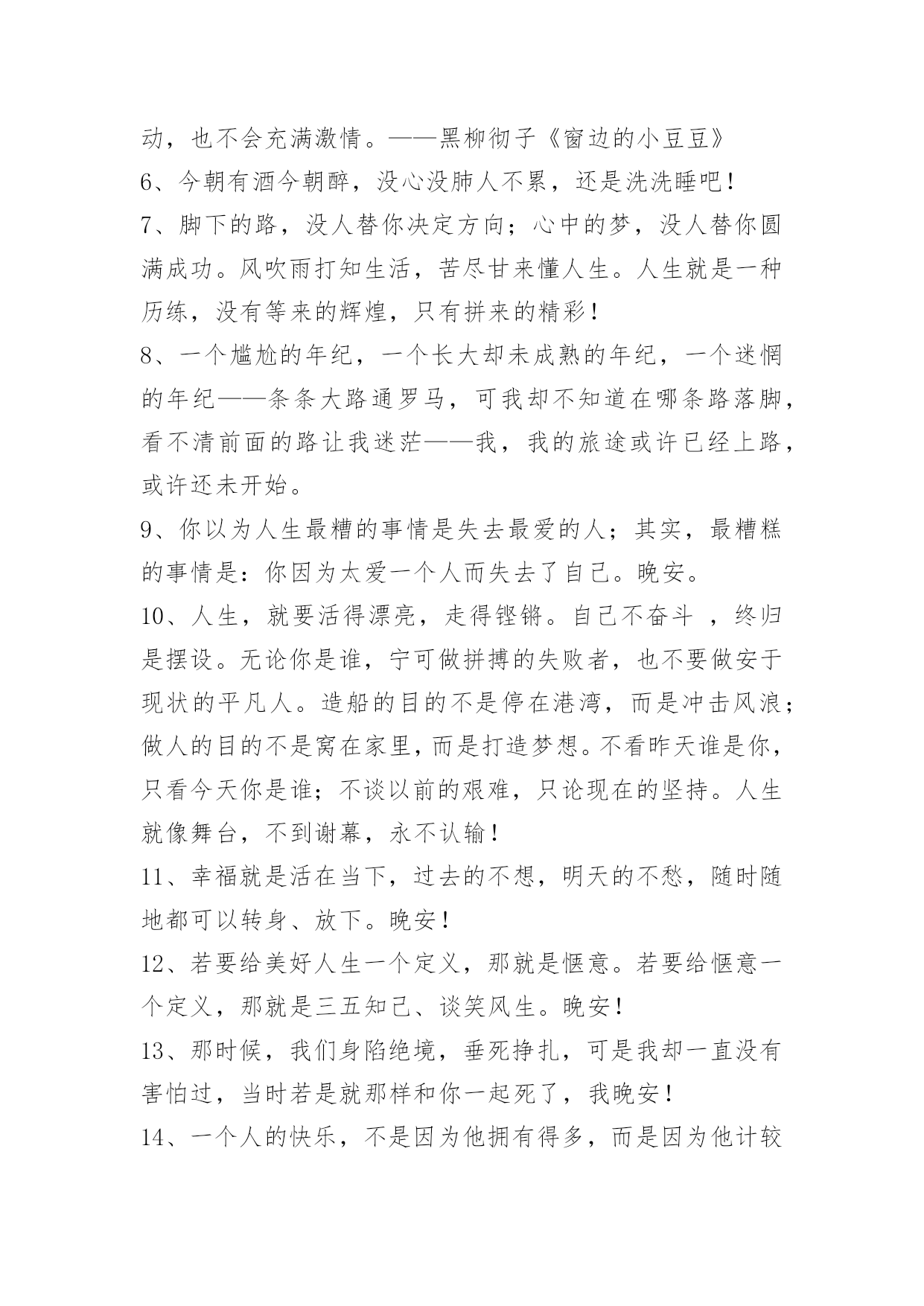 晚安语录37条通用晚安语录集锦37条海浪的品格,就是无数次被礁石击碎又无数闪地扑向礁石。晚安!下面是小编整理的晚安语录37条,欢迎阅读与收藏。1、凡觉得辛苦,即是强求。真正的爱情叫人欢愉,如果你觉得痛苦,一定出了错,需及时结束,重头再来。2、要珍惜生命中的每一天,珍惜这个词,透着几许沧桑,必然有所失,方才晓得去珍惜,对于失去的,已经失去,不必遗憾,但可留作一种回忆,时而嚼一嚼,那也是美味无穷。经营好心情,你就拥有了全部。人生苦短,千万不要活的太累。要活得舒心,活得快乐。晚安。3、小心你身边负能量的人,他们一般会用"因为我信任你"、"我当你是真朋友"、"我觉得你最懂我"等理由来绑架你,然后用他们的抱怨腐蚀你健康的心。4、人生难免会遇到坎坷、悲伤、愧疚、迷茫、无奈等等不如意,稍不留神,我们就会被自己亲手建造的心狱囚禁。不要指望别人的救赎,心灵的枷锁是你自己扣上的,也只有你自己才能够把它打开。哪怕一无所有,哪怕孤身一人,哪怕处境艰难,也要从容生活、笑对人生。只要你够坚强,命运又能把你怎么样呢?晚安!5、世界上最可怕的事情,莫过于有眼睛却发现不了美,有耳朵却不会欣赏音乐,有心灵却无法理解什么是真,不会感动,也不会充满激情。——黑柳彻子《窗边的小豆豆》6、今朝有酒今朝醉,没心没肺人不累,还是洗洗睡吧!7、脚下的路,没人替你决定方向;心中的梦,没人替你圆满成功。风吹雨打知生活,苦尽甘来懂人生。人生就是一种历练,没有等来的辉煌,只有拼来的精彩!8、一个尴尬的年纪,一个长大却未成熟的年纪,一个迷惘的年纪——条条大路通罗马,可我却不知道在哪条路落脚,看不清前面的路让我迷茫——我,我的旅途或许已经上路,或许还未开始。9、你以为人生最糟的事情是失去最爱的人;其实,最糟糕的事情是:你因为太爱一个人而失去了自己。晚安。10、人生,就要活得漂亮,走得铿锵。自己不奋斗,终归是摆设。无论你是谁,宁可做拼搏的失败者,也不要做安于现状的平凡人。造船的目的不是停在港湾,而是冲击风浪;做人的目的不是窝在家里,而是打造梦想。不看昨天谁是你,只看今天你是谁;不谈以前的艰难,只论现在的坚持。人生就像舞台,不到谢幕,永不认输!11、幸福就是活在当下,过去的不想,明天的不愁,随时随地都可以转身、放下。晚安!12、若要给美好人生一个定义,那就是惬意。若要给惬意一个定义,那就是三五知己、谈笑风生。晚安!13、那时候,我们身陷绝境,垂死挣扎,可是我却一直没有害怕过,当时若是就那样和你一起死了,我晚安!14、一个人的快乐,不是因为他拥有得多,而是因为他计较得少。晚安!15、不知道为什么雪后的阳光格外明媚,虽然冬季的风还在吹着,但却很喜欢坐在太阳底下尽情的沐浴着,这种感觉很熟悉,熟悉到可以回忆起一些前尘往事。晚安!16、如果要别人诚信,首选自己要诚信。晚安!17、每天醒来,告诉自己:微笑才会美,奔跑才会有力量,努力才会成功,做最好的自己。晚安!18、与人说话的时候,要学会心平气和。即使有再大的怒气,也不要大喊大叫,因为你的大声,除了扰乱自己的心神,并不能让事情变得更好。歇斯底里的吼叫征服不了别人,却只会让你在疯狂中失去理智。晚安!19、人生就像马拉松,获胜的关键不在于瞬间的爆发,而在于途中的坚持。你纵有千百个借口放弃,也要给自己找一个坚持下去的理由。很多时候,成功就是多坚持一分钟,一分钟不放弃,下一分钟就会有希望。晚安!20、所谓一个人的长大,也便是敢于惨烈地面对自己:在选择前,有一张真诚坚定的脸;在选择后,有一颗不改变的心。晚安!21、君心难测,莫待离殇,一曲终了,愿执子之手,倾世温柔。晚安!22、咚咚咚,几声彻响,仿佛听到大雨的滂沱,独自倚立在窗口,忖度,嘿,这雨够大吧!,停了,这一切,并没有意外,也许,它还未开始?,这一切,真的停了……晚安!23、粉身碎骨浑不怕,要留清白在人间。晚安!24、心中装得起孤独,装得进风雨,才能承载得住日月山河。晚安!25、别把别人的评价看得太重,凡事只要内心无愧,就不必计较太多。晚安!26、郎心似天,妾心似玉,天朝夕易变,玉碎不瓦全。晚安!27、只有真正的贤者,才能不被物质所累,才能始终保持尽境的那份安宁。晚安!28、生活并不是用来妥协的,你退缩的越多,那么让你喘息的空间就越少。晚安!29、夫妇一条心,泥土变黄金。晚安!30、通往清华北大的路是用卷子铺出来的。晚安!31、君子所恨的常常有:喜爱惹事的,喜爱奇思怪想的,喜爱变化无常的。晚安!32、你以为人可以白白地获得感情。不行的。即使是最美好、最富有自我牺牲精神的感情,也不是白送上门的。奇怪的是,使之美好的,正是这一点。晚安!33、不要太想念过去,因它会给你带来悲伤;不要太思考未来,因它会带给你恐惧;用微笑活在当下。晚安!34、当我们之间一切已成往事,最难堪的便是一切清晰如昨。晚安!35、忽然感到