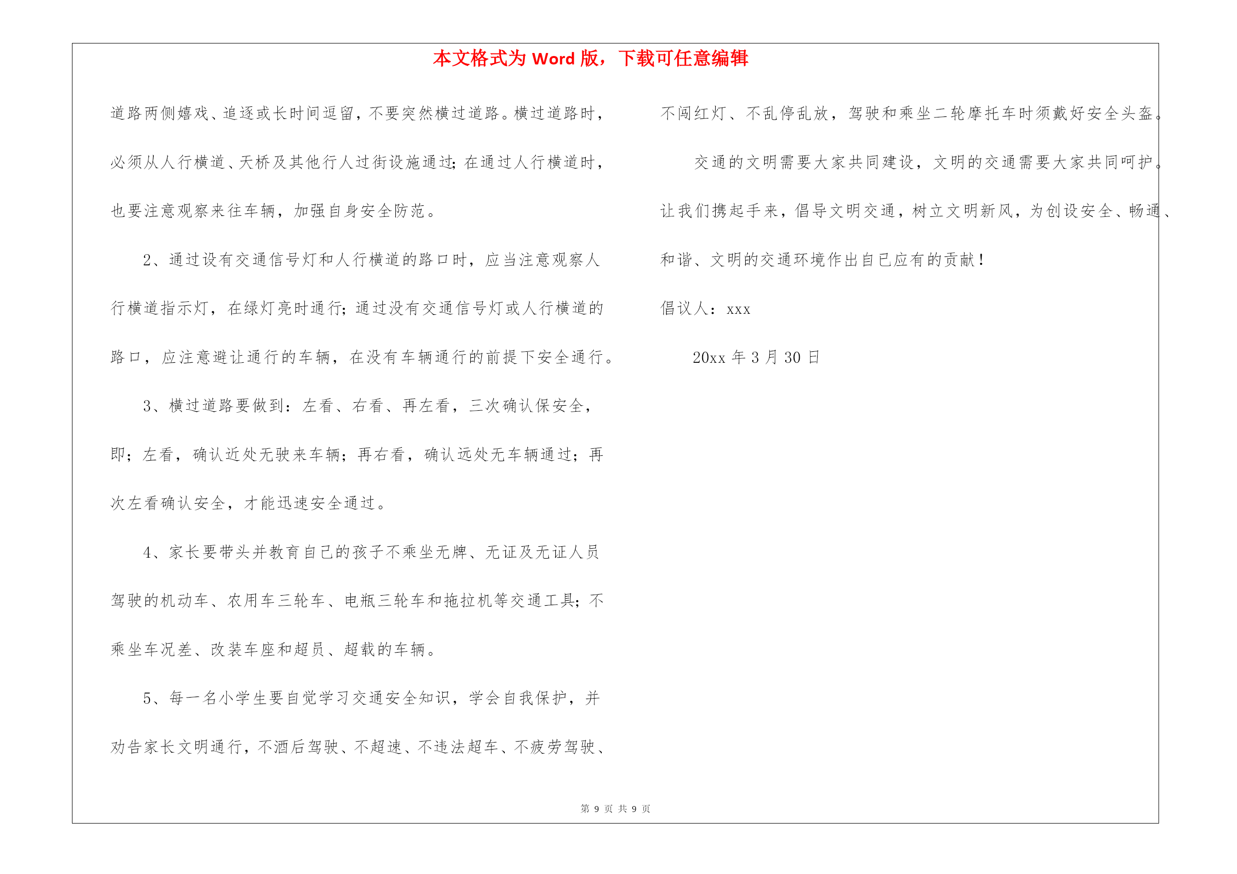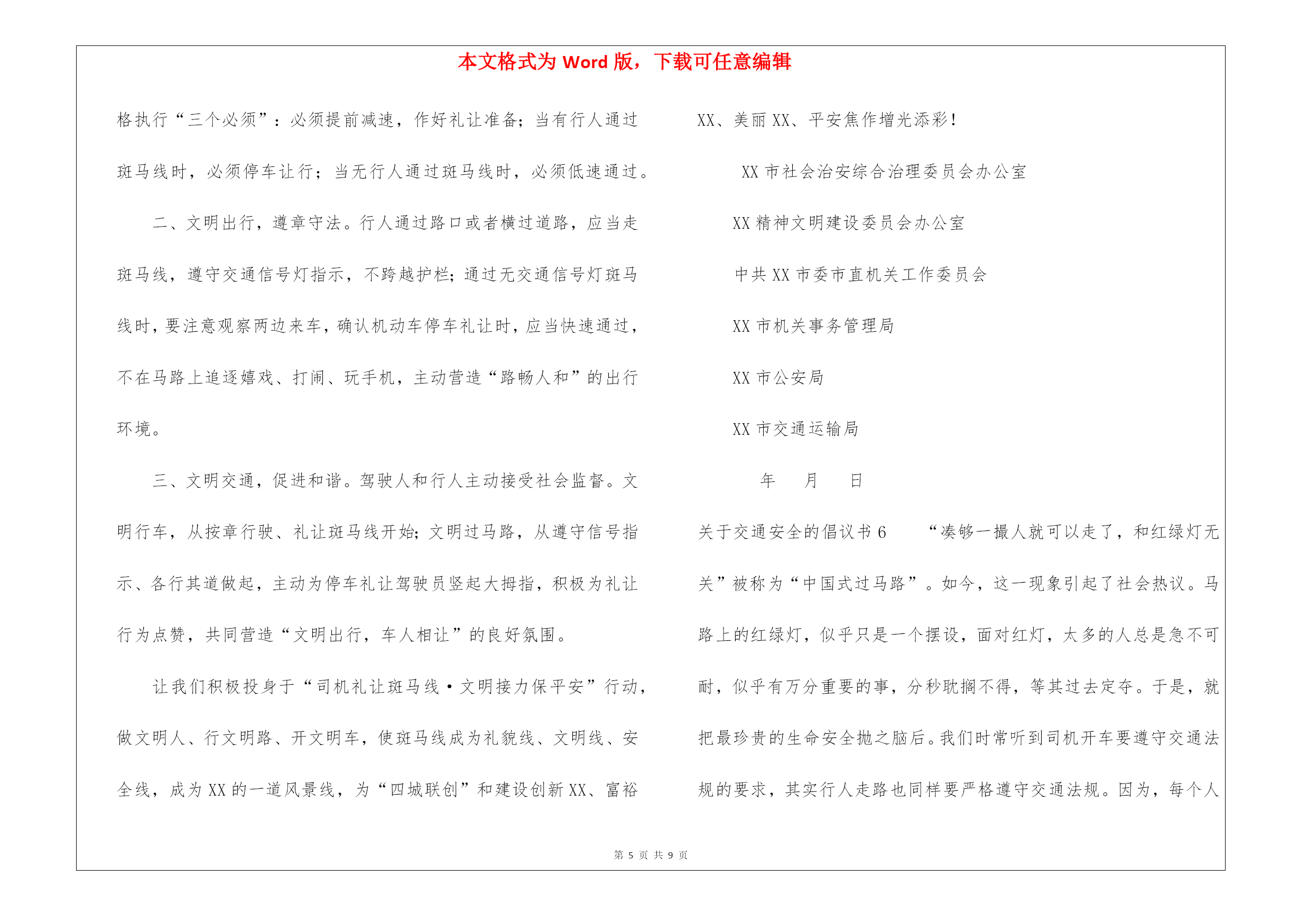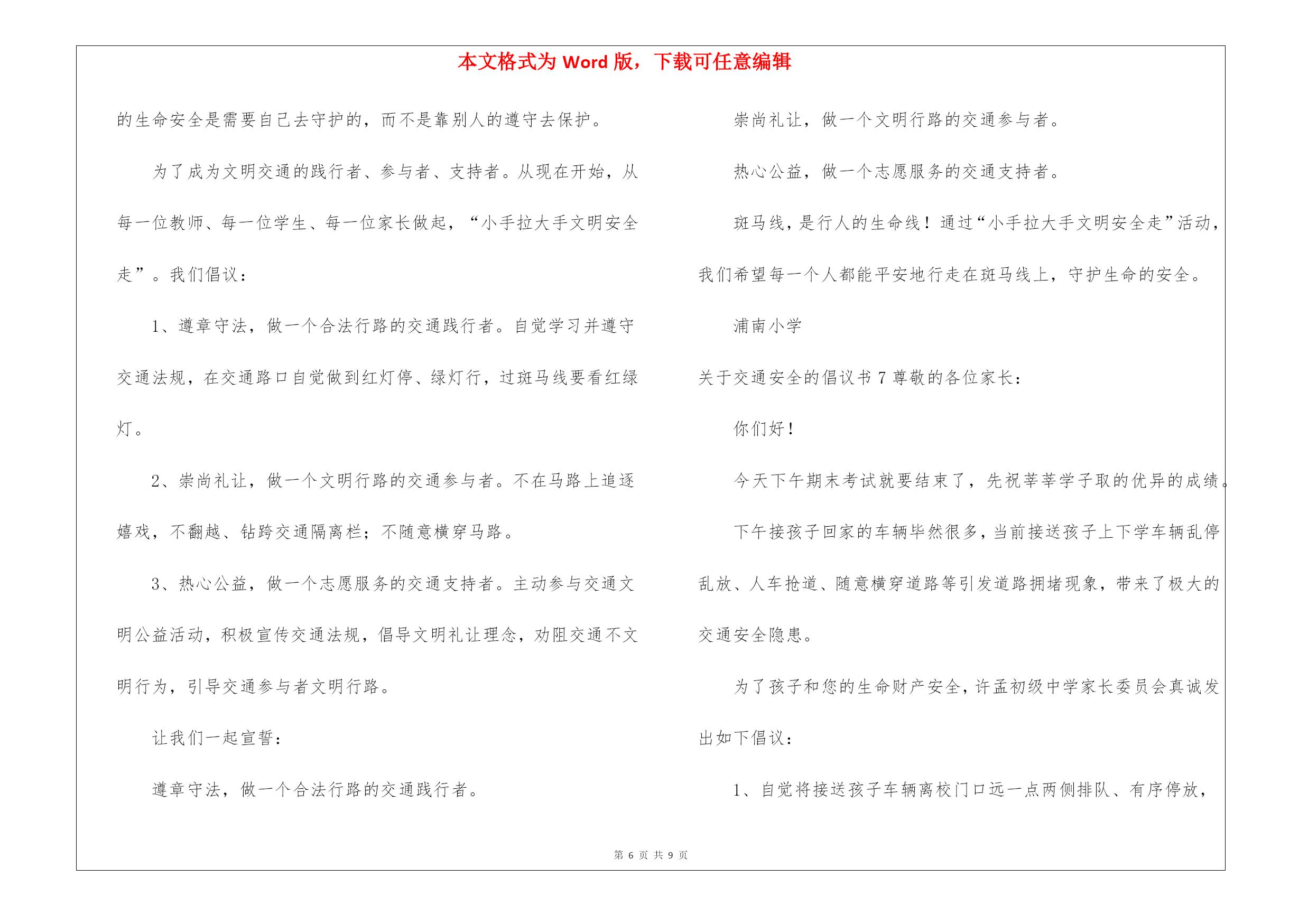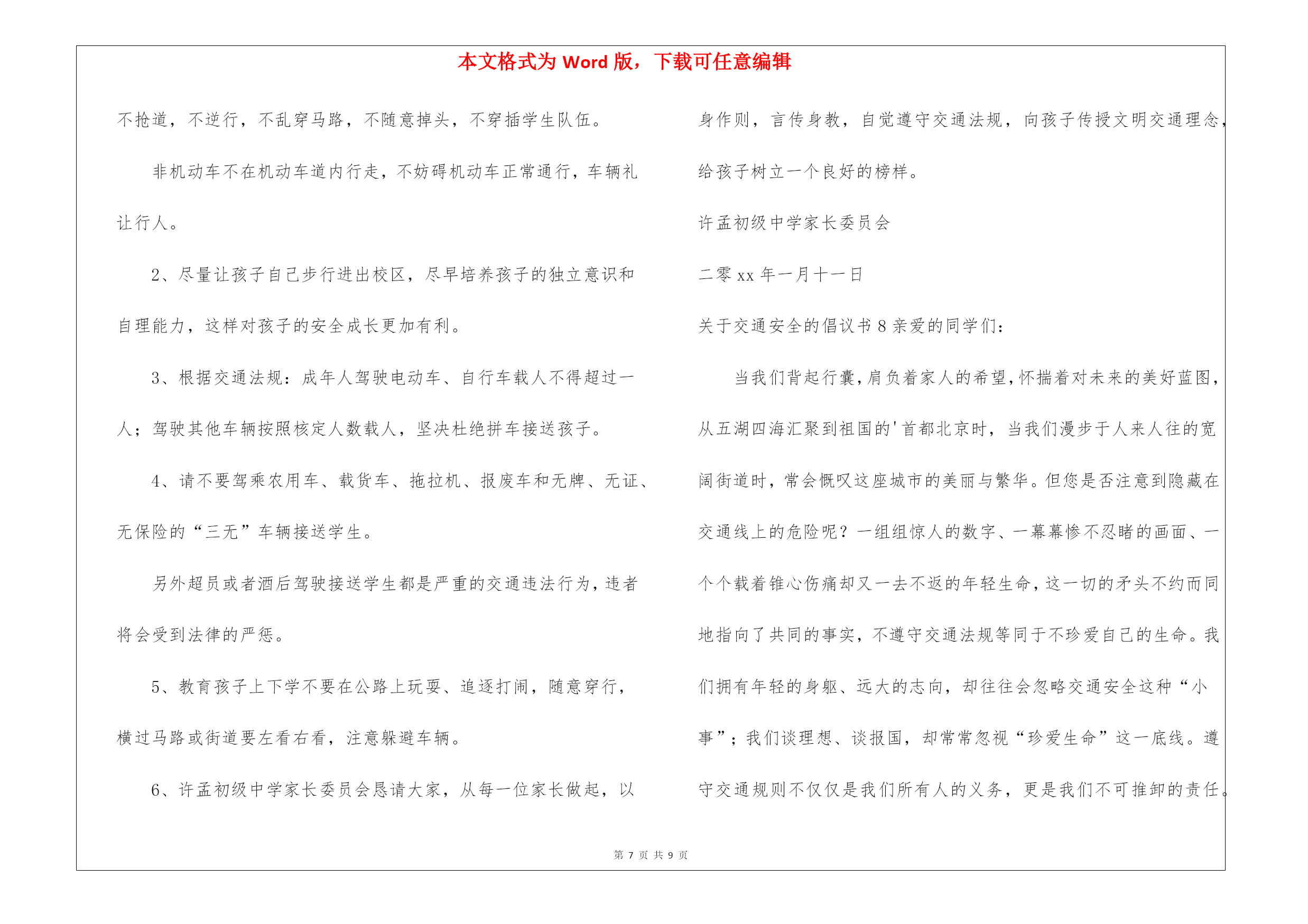 本文格式为Word版,下载可任意编辑第PAGE\*MERGEFORMAT9页共NUMPAGES\*MERGEFORMAT9页关于交通安全的倡议书关于交通安全的倡议书在当下社会,倡议书与我们的生活息息相关,倡议书是日常应用写作中的一种常用文体。怎么写倡议书才能避免踩雷呢?下面是我整理的关于交通安全的倡议书,供大家参考借鉴,希望可以帮助到有需要的朋友。关于交通安全的倡议书1各位家长朋友:5月11日下午,我区斜口发生一起在校初中生无证驾驶二轮摩托车与货车相撞的交通事故。致乘坐摩托车的1名7岁儿童现场死亡和3名驾乘摩托车的初中学生不同程度受伤,造成重大交通事故。这起涉及学生的重大交通事故,再次为我们敲响了校园交通安全警钟。为了进一步加强我校校园交通安全教育,切实提高小学生交通安全意识,坚决遏制涉及学生的交通事故发生,现就加强我校校园交通安全教育工作倡议如下:1、认真落实《中华人民共和国道路交通安全法》关于开展在校学生交通安全教育的法律要求,教育引导学生树立牢固的遵法守规意识,不断提高学生的交通安全防范能力,切实做到防患于未然。2、面向学生家加强交通安全宣传,确保学生上放学和节假日期间的交通安全,明确家长的校外监护责任。通过校园、家庭的共同携手,努力营造良好氛围,全力确保学生交通安全及人身安全。3、未满12周岁学生不得在马路上学骑自行车,12岁以上学生骑自行车上路,要严格遵守交通安全法。4、未满16周岁不得驾驶符合国标的电动自行车(设计时速不超过25公里,车辆自重不超过55公斤,且必须配置骑行动力脚踏)。5、严禁小学生驾驶、乘坐各种电动两轮、三轮摩托车、老年代步车,严禁小学生无证驾驶各类机动车辆。6、严禁非制式校车车辆集中接送学生,家长驾驶私家车接送孩子的,原则上只允许接送自家的学生。7、凡发现黑校车接送学生及其他违法接送学生行为的,要立即现场予以制止,并及时告知学校,也可以报警或联系交警中队,依法及时查处,坚决予以取缔,以确保学生的人身安全。关于交通安全的倡议书2___:俗话说:“没有规矩不成方圆”。遵守交通规则是我们应尽的责任和义务。在社会高速发展、交通面貌日新月异、交通路网四通八达、交通车辆川流不息的今天,道路交通安全对于我们每个人来说尤为重要。为了增强同学们的交通安全意识、交通法制意识、交通文明意识和自我保护能力,共同营造文明、和谐的交通环境,为了你我的生命安全,郑重地向全体同学提出点倡议。一、认真学习、宣传和自觉遵守交通安全法律法规,增强社会公德意识和交通安全意识,树立文明交通新风。自觉遵守交通信号、交通标志、交通标线,服从交通警察的指挥;通过路口要遵守“红灯停、绿灯行”。二、文明走路。必须在人行道行走,没有人行道的靠路右边行走。不闯红灯,不三五成群并肩走,不贪图方便翻越、钻跨交通隔离护栏,不在马路上追逐打闹嬉戏,不在马路上使用划板,旱冰鞋,不要穿越、倚坐在马路边的护栏、花台上;在路口不要急拐猛跑;不准在道路上扒车、追车、强行拦车和抛物击车。三、文明乘车。坐家长的摩托车请戴好头盔。坐公交车请在站台指定地点等候,做到车辆停稳后有序上下车,遵守“前门上车,后门下车”的规则,不将身体任何部位伸出车外,不向车外抛洒物品。同学们,平平安安出门,快快乐乐回家。交通安全进万家,幸福全靠你我他。学习和遵守交通安全法律法规是我们义不容辞的义务和责任,让我们从自己做起,从现在做起,自觉养成文明交通的良好习惯,为创造安全、畅通、有序的交通环境作出我们应有的贡献!倡议人:___时间:____年__月__日关于交通安全的倡议书3广大驾乘人员、人民群众:根据省、市、县道路交通安全工作部署,我镇深入开展交通安全综合整治“三年行动”和为期三个月(8至10月)的集中整治大会战。为确保交通安全整治期间道路交通的安全、畅通、有序,预防和杜绝交通事故的发生,确保群众出行中人身财产安全,我镇倡议广大驾乘人员、人民群众自觉遵守交通规则,谨慎、安全、文明驾乘车辆,杜绝事故发生。现倡议如下:一、积极参与道路交通安全宣传,支持、理解、配合我镇开展的道路交通安全综合整治“三年行动”暨交通安全集中整治大会战工作。二、自觉遵守交通规则和道路交通安全的有关规定。1、严禁超载(摩托车只限载1人,客车按核定座位运载),严禁超速行驶和疲劳驾驶;2、严禁农用车辆、拖拉机、“土车”(拖拉机变型)、“三脚虎”(柴油机农用车)等非客运车辆搭载人员;3、严禁无牌无证车辆上路行驶;4、严禁酒后驾驶机动车;5、严禁驾乘二轮摩托车不带安全头盔;6、严禁携带易燃易爆及危险物品(烟花爆竹等)乘车;7、严禁上、下石牛山风景区车辆超速行驶、拐弯不鸣喇叭等违章行为;8、严禁晚上10点到凌晨6点客运车辆在三级以下公路行驶。三、制止、检举客运车超载等违反交通安全的行为,举报查实将给予奖励。最后,祝愿