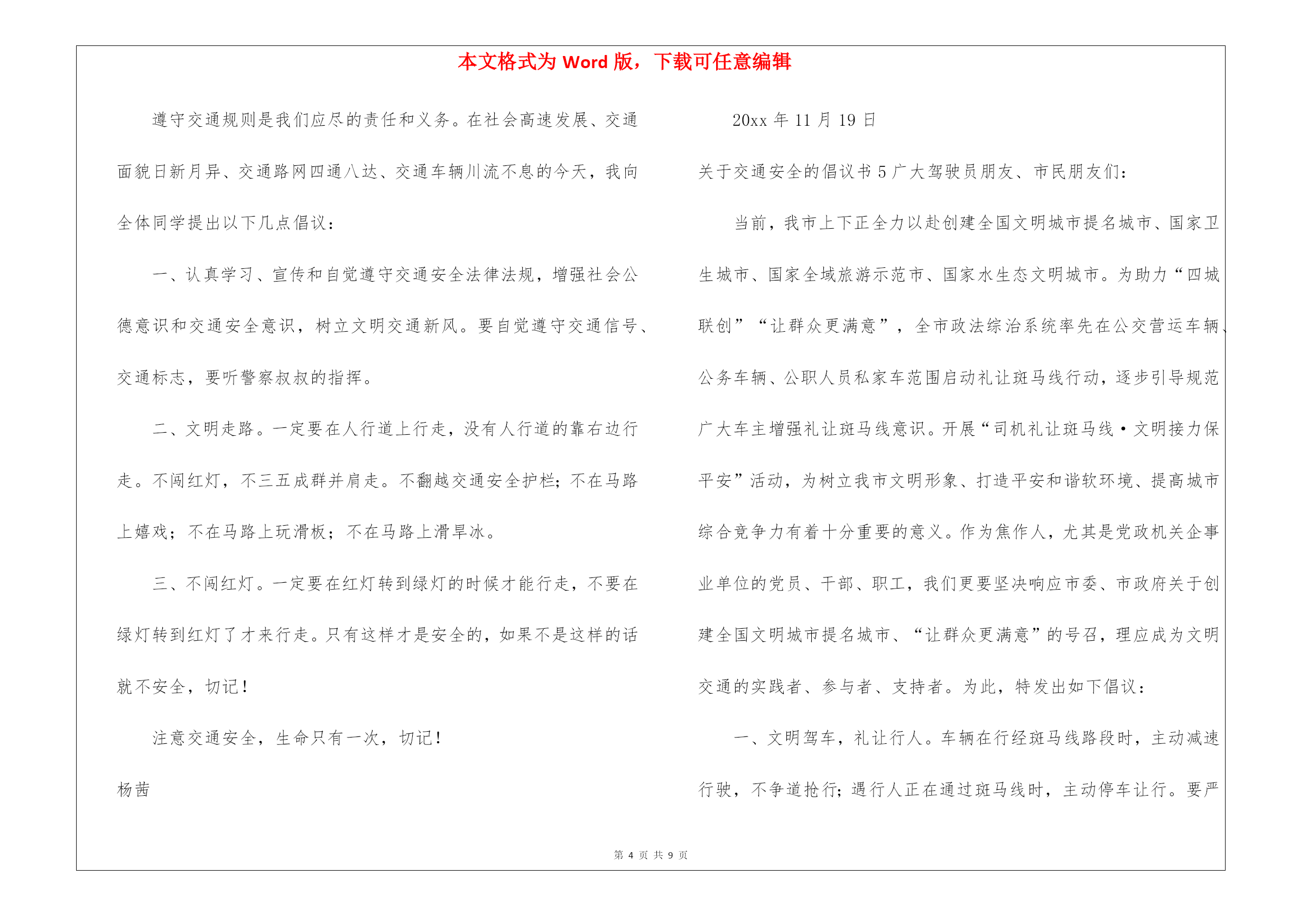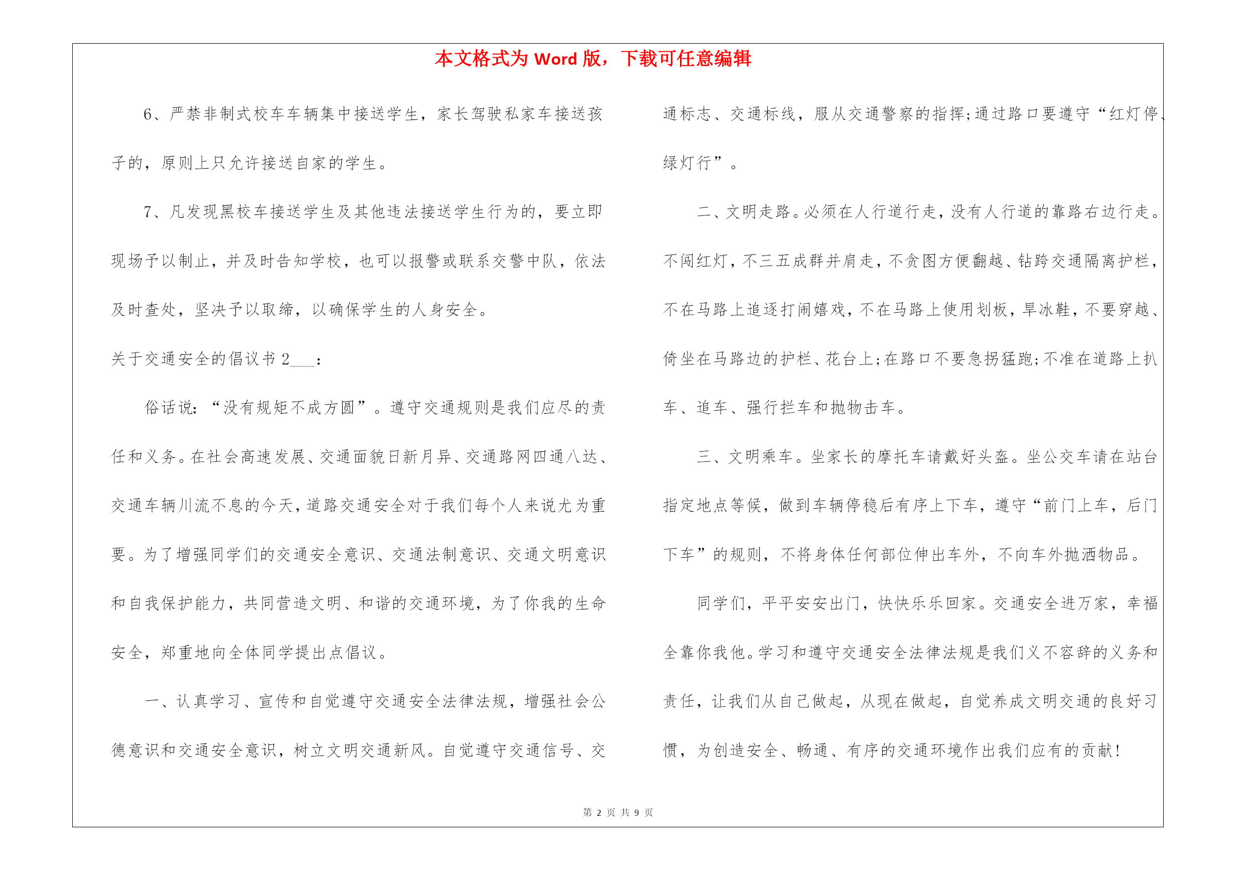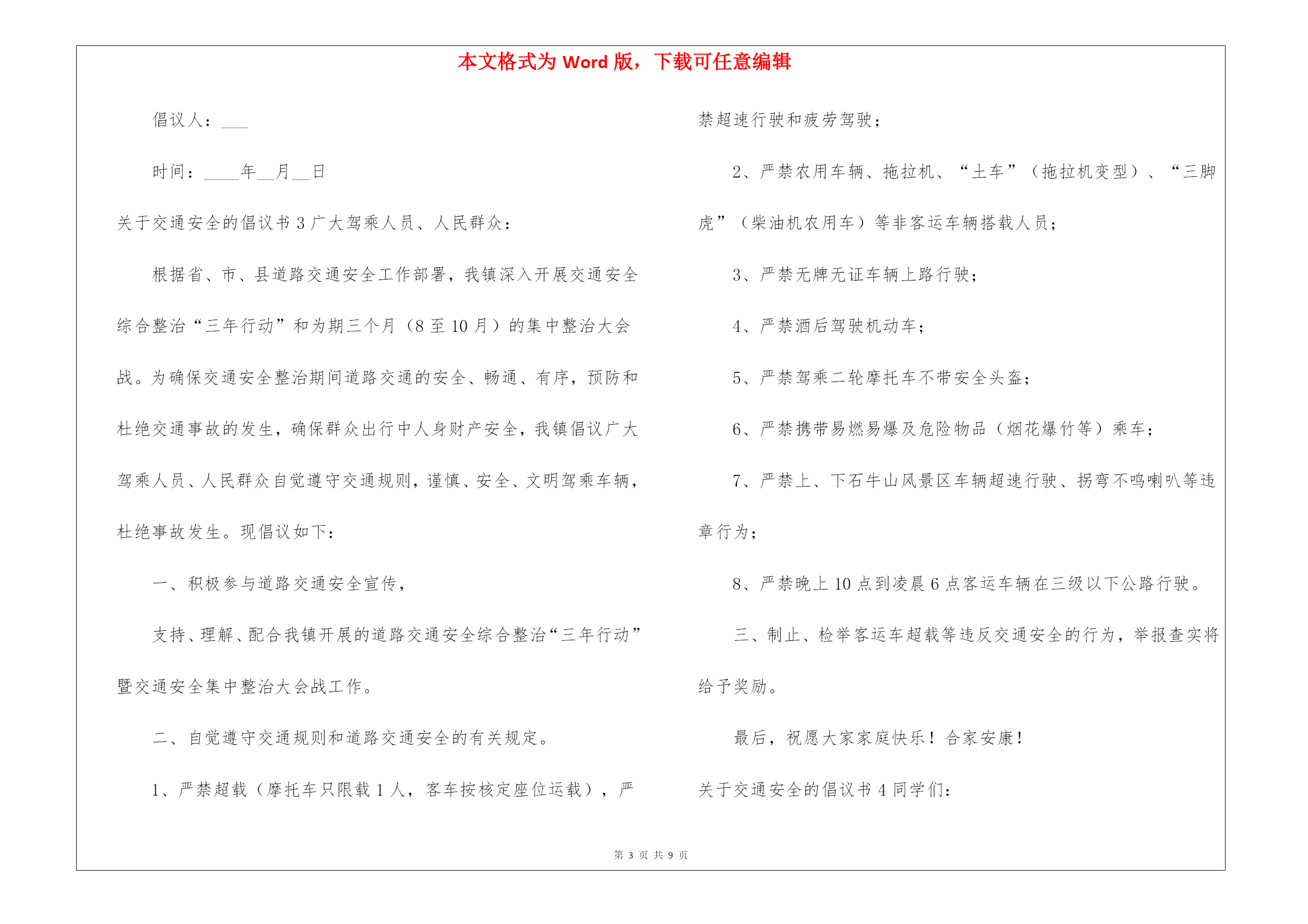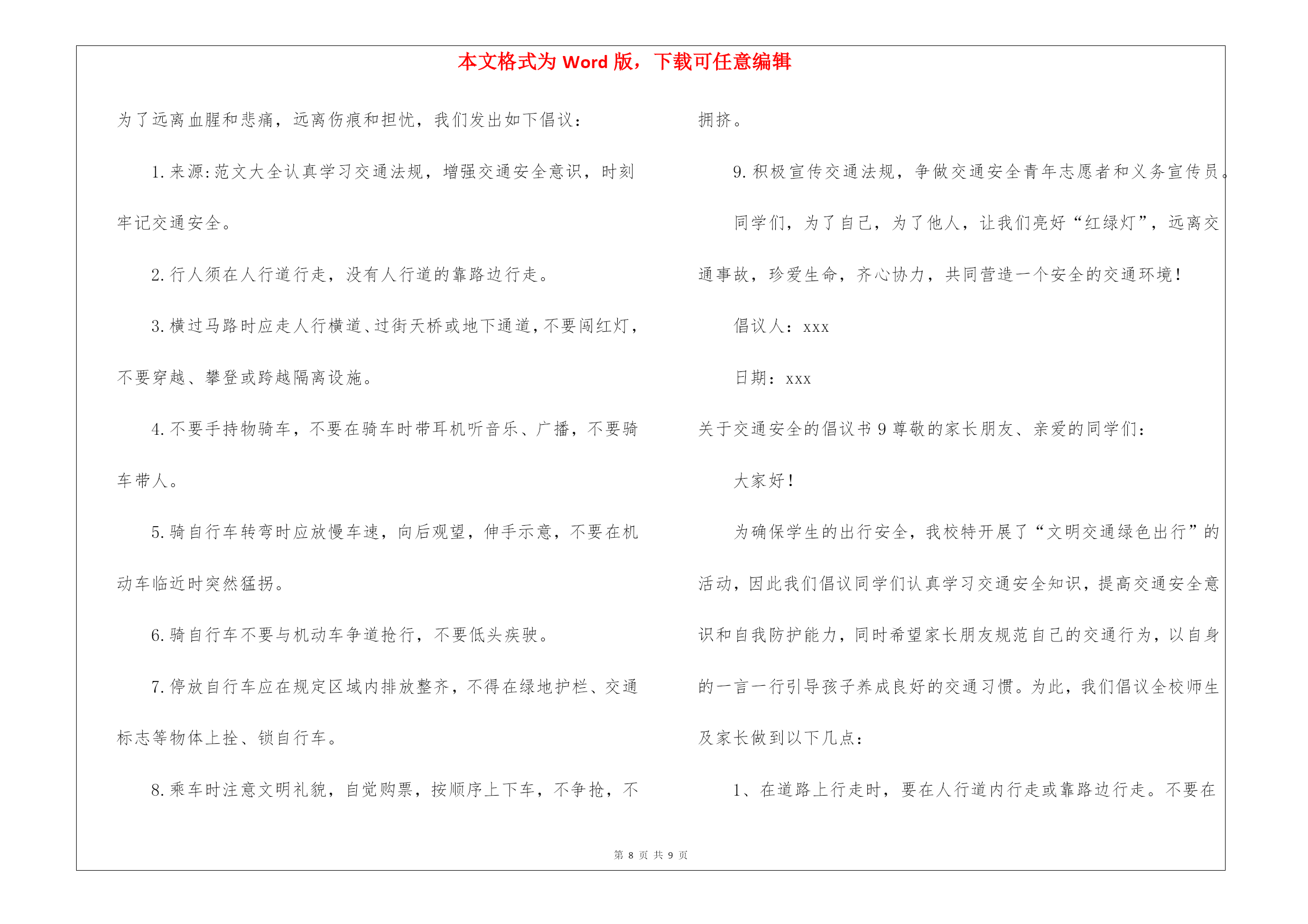 本文格式为Word版,下载可任意编辑第PAGE\*MERGEFORMAT9页共NUMPAGES\*MERGEFORMAT9页关于交通安全的倡议书关于交通安全的倡议书在当下社会,倡议书与我们的生活息息相关,倡议书是日常应用写作中的一种常用文体。怎么写倡议书才能避免踩雷呢?下面是我整理的关于交通安全的倡议书,供大家参考借鉴,希望可以帮助到有需要的朋友。关于交通安全的倡议书1各位家长朋友:5月11日下午,我区斜口发生一起在校初中生无证驾驶二轮摩托车与货车相撞的交通事故。致乘坐摩托车的1名7岁儿童现场死亡和3名驾乘摩托车的初中学生不同程度受伤,造成重大交通事故。这起涉及学生的重大交通事故,再次为我们敲响了校园交通安全警钟。为了进一步加强我校校园交通安全教育,切实提高小学生交通安全意识,坚决遏制涉及学生的交通事故发生,现就加强我校校园交通安全教育工作倡议如下:1、认真落实《中华人民共和国道路交通安全法》关于开展在校学生交通安全教育的法律要求,教育引导学生树立牢固的遵法守规意识,不断提高学生的交通安全防范能力,切实做到防患于未然。2、面向学生家加强交通安全宣传,确保学生上放学和节假日期间的交通安全,明确家长的校外监护责任。通过校园、家庭的共同携手,努力营造良好氛围,全力确保学生交通安全及人身安全。3、未满12周岁学生不得在马路上学骑自行车,12岁以上学生骑自行车上路,要严格遵守交通安全法。4、未满16周岁不得驾驶符合国标的电动自行车(设计时速不超过25公里,车辆自重不超过55公斤,且必须配置骑行动力脚踏)。5、严禁小学生驾驶、乘坐各种电动两轮、三轮摩托车、老年代步车,严禁小学生无证驾驶各类机动车辆。6、严禁非制式校车车辆集中接送学生,家长驾驶私家车接送孩子的,原则上只允许接送自家的学生。7、凡发现黑校车接送学生及其他违法接送学生行为的,要立即现场予以制止,并及时告知学校,也可以报警或联系交警中队,依法及时查处,坚决予以取缔,以确保学生的人身安全。关于交通安全的倡议书2___:俗话说:“没有规矩不成方圆”。遵守交通规则是我们应尽的责任和义务。在社会高速发展、交通面貌日新月异、交通路网四通八达、交通车辆川流不息的今天,道路交通安全对于我们每个人来说尤为重要。为了增强同学们的交通安全意识、交通法制意识、交通文明意识和自我保护能力,共同营造文明、和谐的交通环境,为了你我的生命安全,郑重地向全体同学提出点倡议。一、认真学习、宣传和自觉遵守交通安全法律法规,增强社会公德意识和交通安全意识,树立文明交通新风。自觉遵守交通信号、交通标志、交通标线,服从交通警察的指挥;通过路口要遵守“红灯停、绿灯行”。二、文明走路。必须在人行道行走,没有人行道的靠路右边行走。不闯红灯,不三五成群并肩走,不贪图方便翻越、钻跨交通隔离护栏,不在马路上追逐打闹嬉戏,不在马路上使用划板,旱冰鞋,不要穿越、倚坐在马路边的护栏、花台上;在路口不要急拐猛跑;不准在道路上扒车、追车、强行拦车和抛物击车。三、文明乘车。坐家长的摩托车请戴好头盔。坐公交车请在站台指定地点等候,做到车辆停稳后有序上下车,遵守“前门上车,后门下车”的规则,不将身体任何部位伸出车外,不向车外抛洒物品。同学们,平平安安出门,快快乐乐回家。交通安全进万家,幸福全靠你我他。学习和遵守交通安全法律法规是我们义不容辞的义务和责任,让我们从自己做起,从现在做起,自觉养成文明交通的良好习惯,为创造安全、畅通、有序的交通环境作出我们应有的贡献!倡议人:___时间:____年__月__日关于交通安全的倡议书3广大驾乘人员、人民群众:根据省、市、县道路交通安全工作部署,我镇深入开展交通安全综合整治“三年行动”和为期三个月(8至10月)的集中整治大会战。为确保交通安全整治期间道路交通的安全、畅通、有序,预防和杜绝交通事故的发生,确保群众出行中人身财产安全,我镇倡议广大驾乘人员、人民群众自觉遵守交通规则,谨慎、安全、文明驾乘车辆,杜绝事故发生。现倡议如下:一、积极参与道路交通安全宣传,支持、理解、配合我镇开展的道路交通安全综合整治“三年行动”暨交通安全集中整治大会战工作。二、自觉遵守交通规则和道路交通安全的有关规定。1、严禁超载(摩托车只限载1人,客车按核定座位运载),严禁超速行驶和疲劳驾驶;2、严禁农用车辆、拖拉机、“土车”(拖拉机变型)、“三脚虎”(柴油机农用车)等非客运车辆搭载人员;3、严禁无牌无证车辆上路行驶;4、严禁酒后驾驶机动车;5、严禁驾乘二轮摩托车不带安全头盔;6、严禁携带易燃易爆及危险物品(烟花爆竹等)乘车;7、严禁上、下石牛山风景区车辆超速行驶、拐弯不鸣喇叭等违章行为;8、严禁晚上10点到凌晨6点客运车辆在三级以下公路行驶。三、制止、检举客运车超载等违反交通安全的行为,举报查实将给予奖励。最后,祝愿