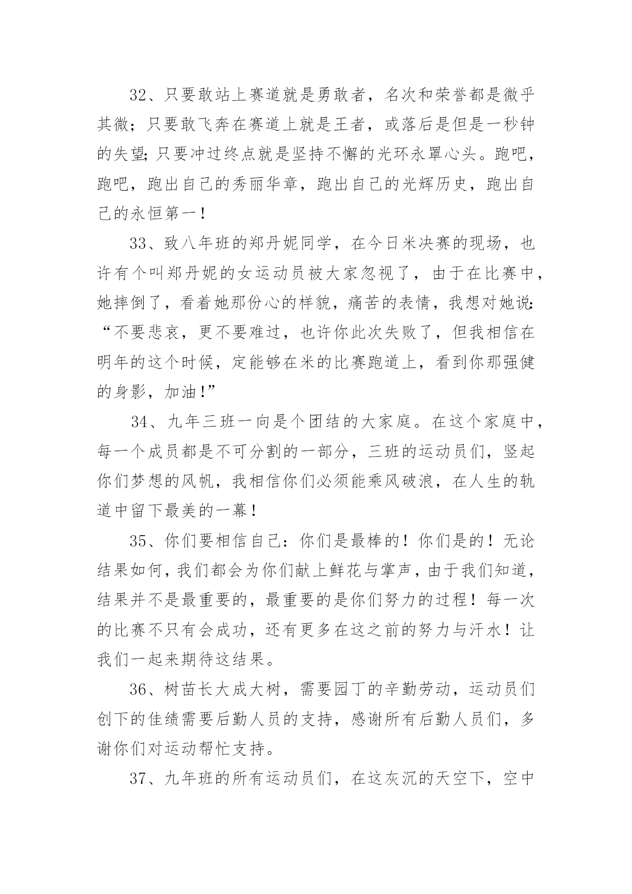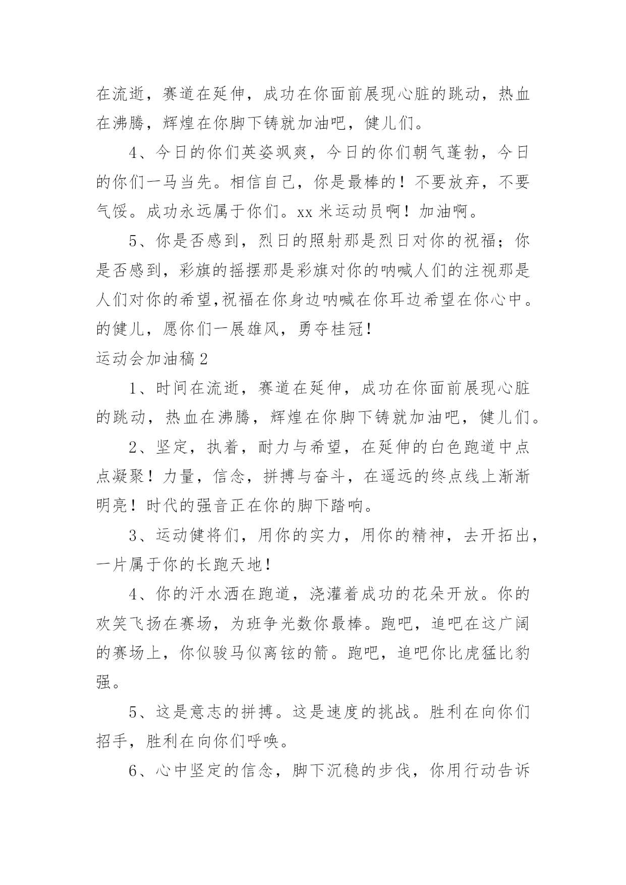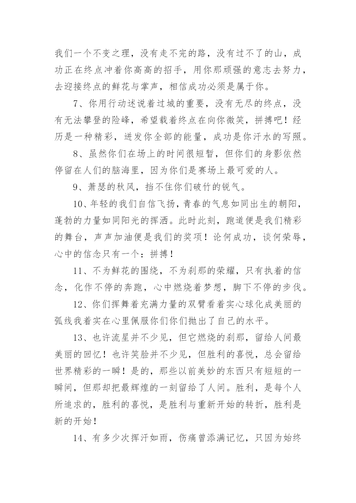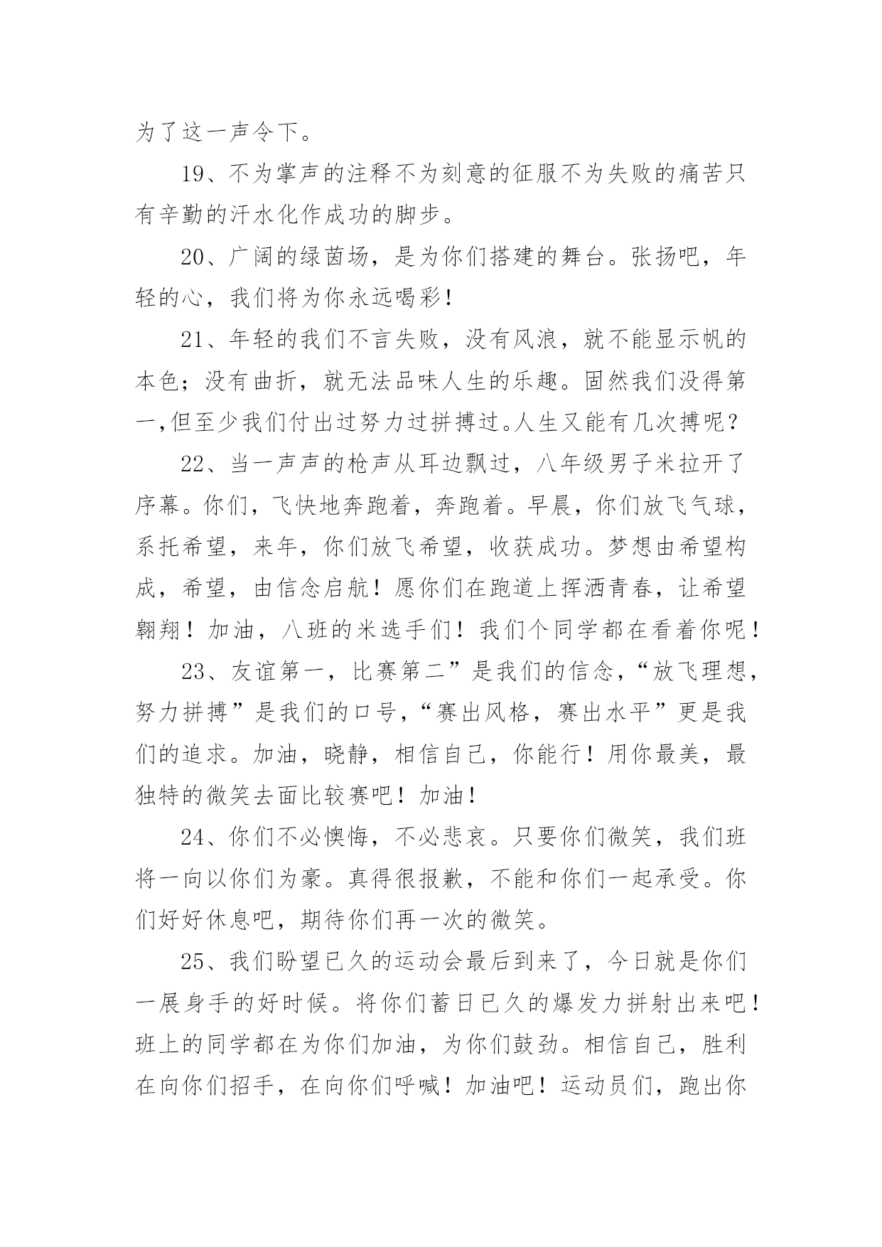 运动会加油稿运动会加油稿在现在社会,我们很多时候都不得不用到加油稿,借助加油稿可以点燃对方的激情,激发对方的斗志。那么你有了解过加油稿吗?以下是小编为大家收集的运动会加油稿,欢迎阅读,希望大家能够喜欢。运动会加油稿11、你和红色的地面有个约定,那上方,总有你奔跑的身影;你与绿色的草坪有个约定,那上方,浸着你辛劳的汗渍。你与我们有个约定,说你必须要赢,也必须会赢。你喊着跑着,迈开大步,跨过世纪。我们相信你,某某某。2、你赢得十分精彩,无需掩饰你的微笑,流露在你脸上。但我相信,你心中十分明白,征途刚刚开始,漫漫长路刚刚开头。加油啊,朋友,只有不断的拼搏,才能够不断战胜自己,战胜一切!向前向前向前!百米跑道虽不长,运动健儿志高扬。磨拳擦掌跃欲试,分秒必争勇夺魁。巾帼岂将须眉让。古有木兰冲杀场,今有跑百米。立志创新校记录,勇夺信管第一金。3、不长不短的`距离,需要的是全身心全程投入,自始至终你都在拼全力,此时此刻,你处在最风光的一刻,无论第几,只要有坚持胜利的信心跑下来,你们就是英雄。时间在流逝,赛道在延伸,成功在你面前展现心脏的跳动,热血在沸腾,辉煌在你脚下铸就加油吧,健儿们。4、今日的你们英姿飒爽,今日的你们朝气蓬勃,今日的你们一马当先。相信自己,你是最棒的!不要放弃,不要气馁。成功永远属于你们。xx米运动员啊!加油啊。5、你是否感到,烈日的照射那是烈日对你的祝福;你是否感到,彩旗的摇摆那是彩旗对你的呐喊人们的注视那是人们对你的希望,祝福在你身边呐喊在你耳边希望在你心中。的健儿,愿你们一展雄风,勇夺桂冠!运动会加油稿21、时间在流逝,赛道在延伸,成功在你面前展现心脏的跳动,热血在沸腾,辉煌在你脚下铸就加油吧,健儿们。2、坚定,执着,耐力与希望,在延伸的白色跑道中点点凝聚!力量,信念,拼搏与奋斗,在遥远的终点线上渐渐明亮!时代的强音正在你的脚下踏响。3、运动健将们,用你的实力,用你的精神,去开拓出,一片属于你的长跑天地!4、你的汗水洒在跑道,浇灌着成功的花朵开放。你的欢笑飞扬在赛场,为班争光数你最棒。跑吧,追吧在这广阔的赛场上,你似骏马似离铉的箭。跑吧,追吧你比虎猛比豹强。5、这是意志的拼搏。这是速度的挑战。胜利在向你们招手,胜利在向你们呼唤。6、心中坚定的信念,脚下沉稳的步伐,你用行动告诉我们一个不变之理,没有走不完的路,没有过不了的山,成功正在终点冲着你高高的招手,用你那顽强的意志去努力,去迎接终点的鲜花与掌声,相信成功必须是属于你。7、你用行动述说着过城的重要,没有无尽的终点,没有无法攀登的险峰,希望载着终点在向你微笑,拼搏吧!经历是一种精彩,迸发你全部的能量,成功是你汗水的写照。8、虽然你们在场上的时间很短暂,但你们的身影依然停留在人们的脑海里,因为你们是赛场上最可爱的人。9、萧瑟的秋风,挡不住你们破竹的锐气。10、年轻的我们自信飞扬,青春的气息如同出生的朝阳,蓬勃的力量如同阳光的挥洒。此时此刻,跑道便是我们精彩的舞台,声声加油便是我们的奖项!论何成功,谈何荣辱,心中的信念只有一个:拼搏!11、不为鲜花的围绕,不为刹那的荣耀,只有执着的信念,化作不停的奔跑,心中燃烧着梦想,脚下不停的步伐。12、你们挥舞着充满力量的双臂看着实心球化成美丽的弧线我着实在心里佩服你们你们抛出了自己的水平。13、也许流星并不少见,但它燃烧的刹那,留给人间最美丽的回忆!也许笑脸并不少见,但胜利的喜悦,总会留给世界精彩的一瞬!是的,那些以前美妙的东西只有短短的一瞬间,但那却把最辉煌的一刻留给了人间。胜利,是每个人所追求的,胜利的喜悦,是胜利与重新开始的转折,胜利是新的开始!14、有多少次挥汗如雨,伤痛曾添满记忆,只因为始终相信,去拼搏才能胜利。总在鼓舞自己,要成功就得努力。热血在赛场沸腾,巨人在赛场升起。相信自己,你将赢得胜利,创造奇迹;相信自己,梦想在你手中,这是你的天地。当一切过去,你们将是第一。相信自己,你们将超越极限,超越自己!相信自己,加油吧,健儿们,相信你自己。15、踏上跑道,是一种选择。离开起点,是一种勇气。驰骋赛场,是一种胜利。16、就像花儿准备了春秋冬,就是为了红透整个盛夏。就像雪花经历了春夏秋就是为了洁白整个严冬。蹲下,昂首,出发……轻轻的一抬脚,便牵动了全场的目光潇洒的迫挥挥手。便满足了那一份无言的等待。迎着朝阳,你们踏歌而去,背着希望,我们等待你们的归来。17、温暖的阳光洒在赛场上,男子乙组标枪的比赛即将开始。赛场上,一道道优美的弧线将轻盈地划过天空。健儿们用手中的标枪向距离的权限发起一轮又一轮的挑战。标枪在空中轻盈的姿态,是健儿们强健的力量和熟练的技巧的结合。谁能在这场激烈的竞争中获胜?让我们拭目以待,让我们为他们呐喊助威吧!只有将力量与技巧合二为一的人,才能获得胜利的桂冠!18、泰戈尔在诗中说,天空没有翅膀的影子,但我已