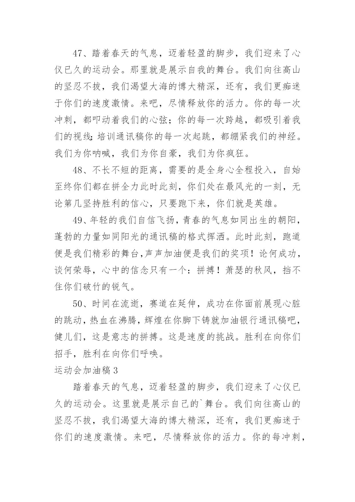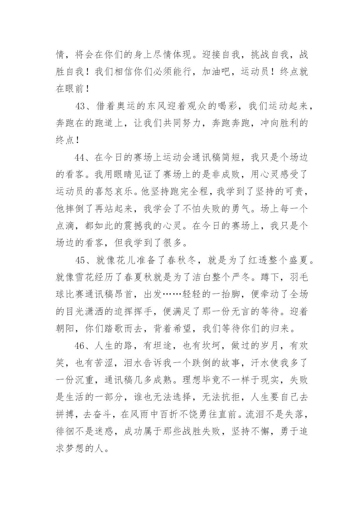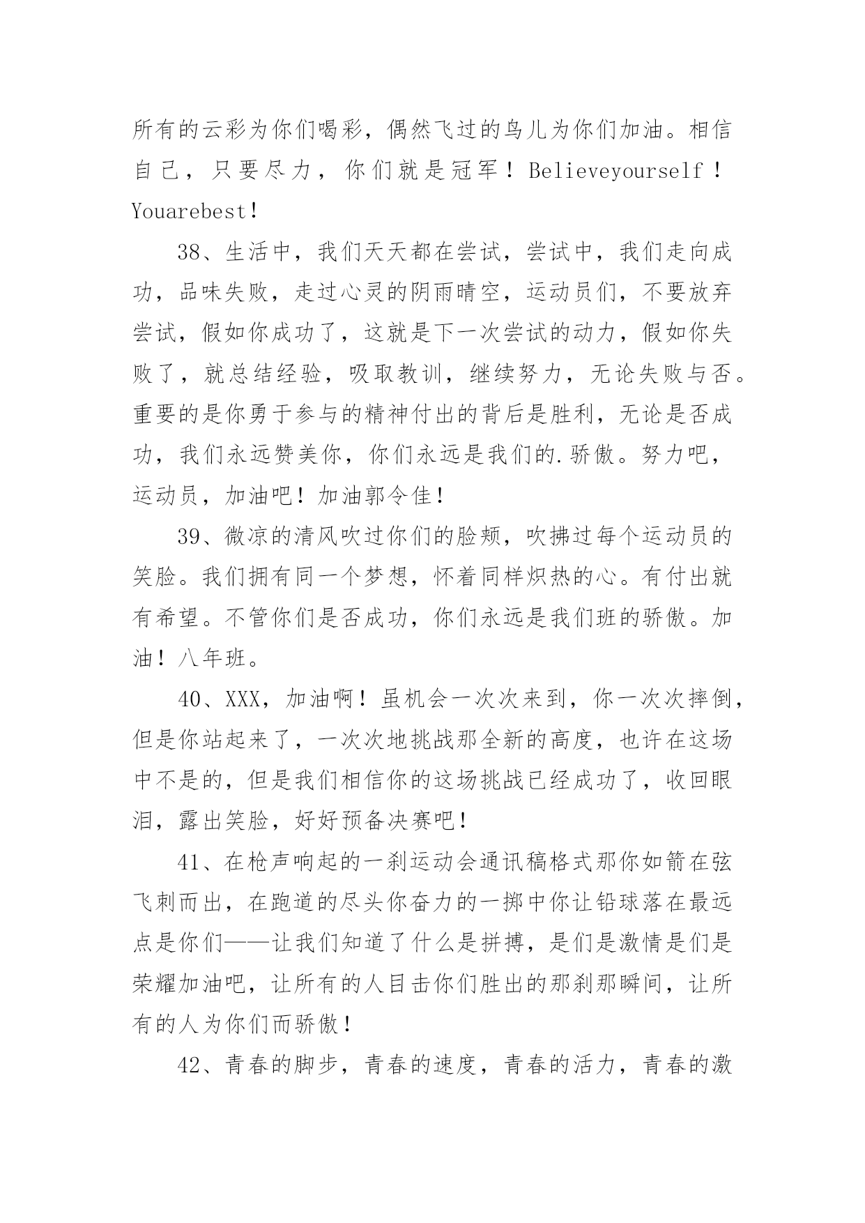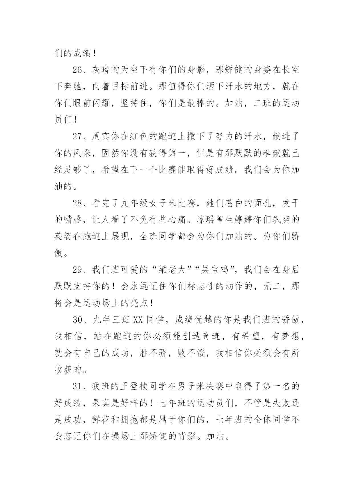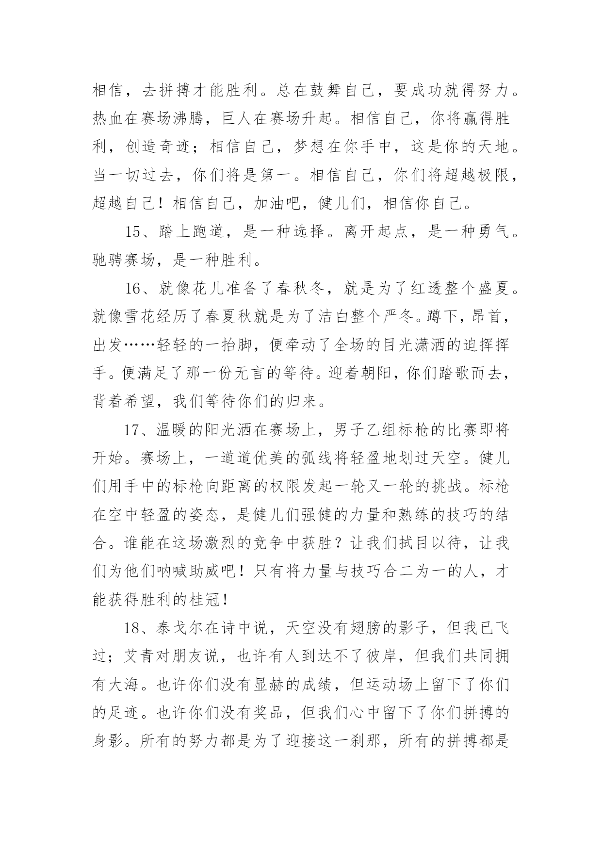 运动会加油稿运动会加油稿在现在社会,我们很多时候都不得不用到加油稿,借助加油稿可以点燃对方的激情,激发对方的斗志。那么你有了解过加油稿吗?以下是小编为大家收集的运动会加油稿,欢迎阅读,希望大家能够喜欢。运动会加油稿11、你和红色的地面有个约定,那上方,总有你奔跑的身影;你与绿色的草坪有个约定,那上方,浸着你辛劳的汗渍。你与我们有个约定,说你必须要赢,也必须会赢。你喊着跑着,迈开大步,跨过世纪。我们相信你,某某某。2、你赢得十分精彩,无需掩饰你的微笑,流露在你脸上。但我相信,你心中十分明白,征途刚刚开始,漫漫长路刚刚开头。加油啊,朋友,只有不断的拼搏,才能够不断战胜自己,战胜一切!向前向前向前!百米跑道虽不长,运动健儿志高扬。磨拳擦掌跃欲试,分秒必争勇夺魁。巾帼岂将须眉让。古有木兰冲杀场,今有跑百米。立志创新校记录,勇夺信管第一金。3、不长不短的`距离,需要的是全身心全程投入,自始至终你都在拼全力,此时此刻,你处在最风光的一刻,无论第几,只要有坚持胜利的信心跑下来,你们就是英雄。时间在流逝,赛道在延伸,成功在你面前展现心脏的跳动,热血在沸腾,辉煌在你脚下铸就加油吧,健儿们。4、今日的你们英姿飒爽,今日的你们朝气蓬勃,今日的你们一马当先。相信自己,你是最棒的!不要放弃,不要气馁。成功永远属于你们。xx米运动员啊!加油啊。5、你是否感到,烈日的照射那是烈日对你的祝福;你是否感到,彩旗的摇摆那是彩旗对你的呐喊人们的注视那是人们对你的希望,祝福在你身边呐喊在你耳边希望在你心中。的健儿,愿你们一展雄风,勇夺桂冠!运动会加油稿21、时间在流逝,赛道在延伸,成功在你面前展现心脏的跳动,热血在沸腾,辉煌在你脚下铸就加油吧,健儿们。2、坚定,执着,耐力与希望,在延伸的白色跑道中点点凝聚!力量,信念,拼搏与奋斗,在遥远的终点线上渐渐明亮!时代的强音正在你的脚下踏响。3、运动健将们,用你的实力,用你的精神,去开拓出,一片属于你的长跑天地!4、你的汗水洒在跑道,浇灌着成功的花朵开放。你的欢笑飞扬在赛场,为班争光数你最棒。跑吧,追吧在这广阔的赛场上,你似骏马似离铉的箭。跑吧,追吧你比虎猛比豹强。5、这是意志的拼搏。这是速度的挑战。胜利在向你们招手,胜利在向你们呼唤。6、心中坚定的信念,脚下沉稳的步伐,你用行动告诉我们一个不变之理,没有走不完的路,没有过不了的山,成功正在终点冲着你高高的招手,用你那顽强的意志去努力,去迎接终点的鲜花与掌声,相信成功必须是属于你。7、你用行动述说着过城的重要,没有无尽的终点,没有无法攀登的险峰,希望载着终点在向你微笑,拼搏吧!经历是一种精彩,迸发你全部的能量,成功是你汗水的写照。8、虽然你们在场上的时间很短暂,但你们的身影依然停留在人们的脑海里,因为你们是赛场上最可爱的人。9、萧瑟的秋风,挡不住你们破竹的锐气。10、年轻的我们自信飞扬,青春的气息如同出生的朝阳,蓬勃的力量如同阳光的挥洒。此时此刻,跑道便是我们精彩的舞台,声声加油便是我们的奖项!论何成功,谈何荣辱,心中的信念只有一个:拼搏!11、不为鲜花的围绕,不为刹那的荣耀,只有执着的信念,化作不停的奔跑,心中燃烧着梦想,脚下不停的步伐。12、你们挥舞着充满力量的双臂看着实心球化成美丽的弧线我着实在心里佩服你们你们抛出了自己的水平。13、也许流星并不少见,但它燃烧的刹那,留给人间最美丽的回忆!也许笑脸并不少见,但胜利的喜悦,总会留给世界精彩的一瞬!是的,那些以前美妙的东西只有短短的一瞬间,但那却把最辉煌的一刻留给了人间。胜利,是每个人所追求的,胜利的喜悦,是胜利与重新开始的转折,胜利是新的开始!14、有多少次挥汗如雨,伤痛曾添满记忆,只因为始终相信,去拼搏才能胜利。总在鼓舞自己,要成功就得努力。热血在赛场沸腾,巨人在赛场升起。相信自己,你将赢得胜利,创造奇迹;相信自己,梦想在你手中,这是你的天地。当一切过去,你们将是第一。相信自己,你们将超越极限,超越自己!相信自己,加油吧,健儿们,相信你自己。15、踏上跑道,是一种选择。离开起点,是一种勇气。驰骋赛场,是一种胜利。16、就像花儿准备了春秋冬,就是为了红透整个盛夏。就像雪花经历了春夏秋就是为了洁白整个严冬。蹲下,昂首,出发……轻轻的一抬脚,便牵动了全场的目光潇洒的迫挥挥手。便满足了那一份无言的等待。迎着朝阳,你们踏歌而去,背着希望,我们等待你们的归来。17、温暖的阳光洒在赛场上,男子乙组标枪的比赛即将开始。赛场上,一道道优美的弧线将轻盈地划过天空。健儿们用手中的标枪向距离的权限发起一轮又一轮的挑战。标枪在空中轻盈的姿态,是健儿们强健的力量和熟练的技巧的结合。谁能在这场激烈的竞争中获胜?让我们拭目以待,让我们为他们呐喊助威吧!只有将力量与技巧合二为一的人,才能获得胜利的桂冠!18、泰戈尔在诗中说,天空没有翅膀的影子,但我已