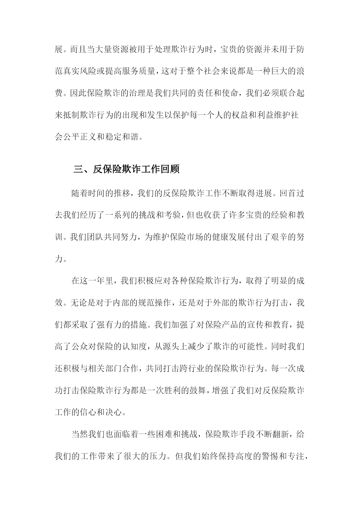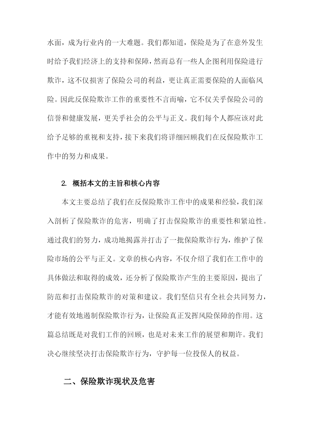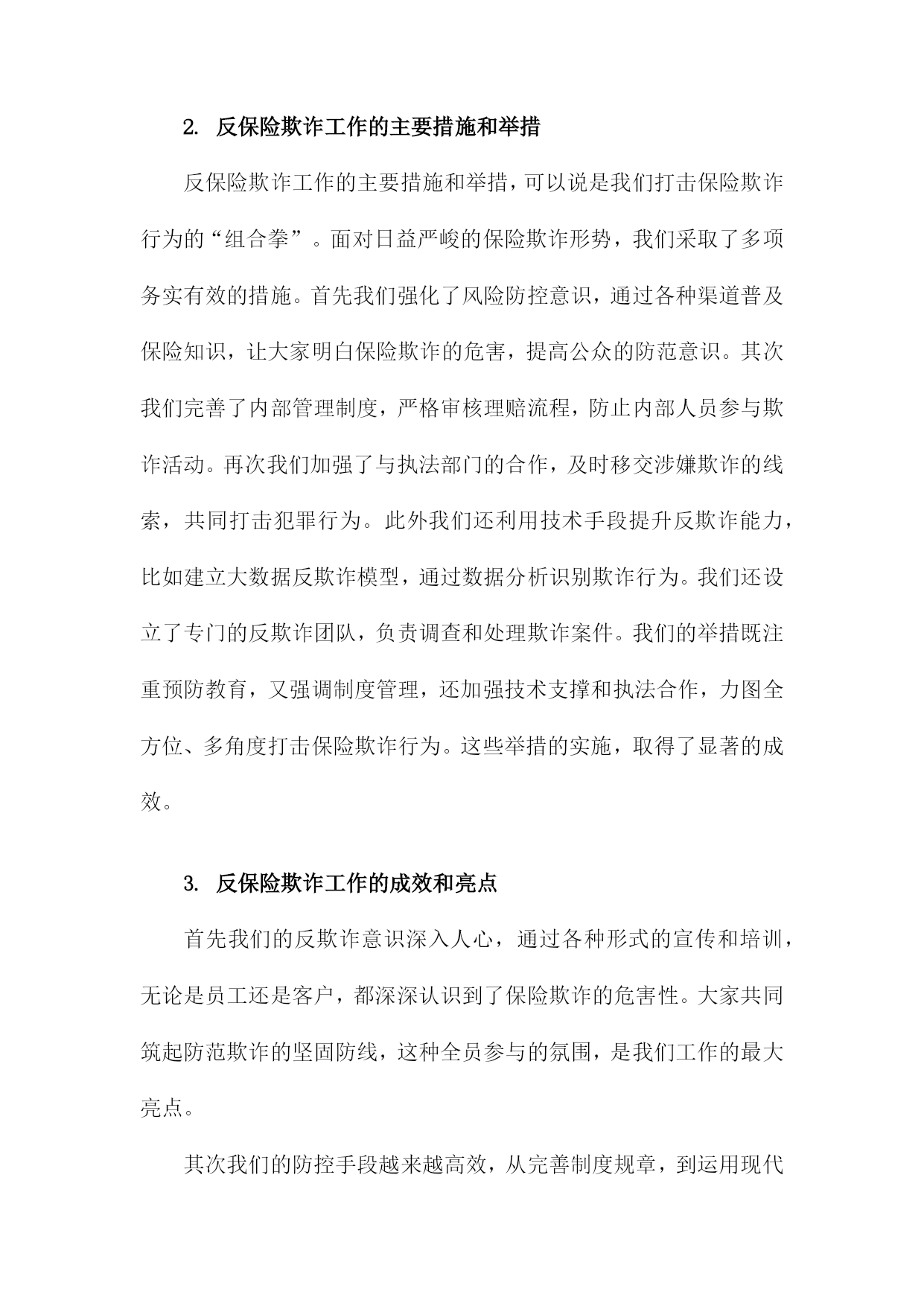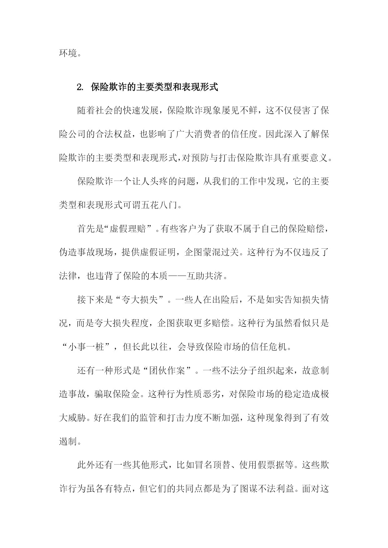 反保险欺诈工作总结一、内容概括回首过去的一年,我们在反保险欺诈工作中取得了不小的成绩,也有许多值得总结的经验和教训。我们的团队始终坚持以人民为中心,坚决打击保险欺诈行为,守护广大市民的合法权益。接下来就让我们一起回顾一下这一年的工作情况吧。首先我们加大了对保险欺诈行为的打击力度,我们接到各类保险欺诈的报案,积极展开调查,对涉嫌欺诈的行为进行严肃处理。无论是通过大数据分析,还是实地调查取证,我们都力求做到精准打击,让违法者无处遁形。其次我们注重宣传教育,通过各种渠道普及保险知识,让大家了解保险欺诈的危害性,提高公众的防范意识。此外我们还与各大保险公司紧密合作,共同制定防范措施,形成反保险欺诈的合力。当然我们也面临着一些挑战和困难,比如技术手段的更新、法律法规的完善等,但我们相信在大家的共同努力下,一定能够克服这些困难,取得更大的胜利。这一年的反保险欺诈工作虽然辛苦,但成果显著,我们深感欣慰和自豪。1.简述保险欺诈问题的背景和重要性在当今社会,随着保险行业的快速发展,保险欺诈问题逐渐浮出水面,成为行业内的一大难题。我们都知道,保险是为了在意外发生时给予我们经济上的支持和保障,然而总有一些人企图利用保险进行欺诈,这不仅损害了保险公司的利益,更让真正需要保险的人面临风险。因此反保险欺诈工作的重要性不言而喻,它不仅关乎保险公司的信誉和健康发展,更关乎社会的公平与正义。我们每个人都应该对此给予足够的重视和支持,接下来我们将详细回顾我们在反保险欺诈工作中的努力和成果。2.概括本文的主旨和核心内容本文主要总结了我们在反保险欺诈工作中的成果和经验,我们深入剖析了保险欺诈的危害,明确了打击保险欺诈的重要性和紧迫性。通过我们的努力,成功地揭露并打击了一批保险欺诈行为,维护了保险市场的公平与正义。文章的核心内容,不仅介绍了我们在工作中的具体做法和取得的成效,还分析了保险欺诈产生的主要原因,提出了防范和打击保险欺诈的对策和建议。我们坚信只有全社会共同努力,才能有效地遏制保险欺诈行为,让保险真正发挥风险保障的作用。这篇总结既是对我们工作的回顾,也是对未来工作的展望和期许。我们决心继续坚决打击保险欺诈行为,守护每一位投保人的权益。二、保险欺诈现状及危害当我们谈论保险时,不得不正视一个不可忽视的问题——保险欺诈。如今保险欺诈现象屡见不鲜,它就像一颗隐形炸弹,悄悄侵蚀着我们的信任体系和经济安全。说到现状真是让人忧心,有些人为了谋取私利,不惜利用保险政策进行欺诈行为。他们可能夸大损失,伪造事故甚至虚构疾病,企图骗取保险金。这种行为不仅让保险公司承受巨大损失,更重要的是,它破坏了社会的公平和正义,让真正需要保险的人得不到应有的保障。因此我们必须正视保险欺诈问题,不能视而不见。我们每个人都应该提高警惕,积极参与到反保险欺诈的行动中来。只有这样我们才能构建一个公平、公正、诚信的保险市场,让每个人都能享受到真正的保障和安心。1.保险欺诈的概述和定义保险欺诈简单来说,就是一些人利用保险制度的一些漏洞,通过虚假的信息、隐瞒真相等手段来获取不应得的保险金。这种行为不仅让保险公司受损,也会影响到那些真正需要保险保障的人。听起来这似乎是个离大家很远的词汇,但实际上在我们日常生活中,保险欺诈的例子并不少见。有时候可能是出于一时的贪念,或者是对保险条款的不了解,导致一些人在面对问题时,选择了走捷径。我们必须正视这个问题,了解保险欺诈的危害,提高警惕共同营造一个诚信的保险环境。2.保险欺诈的主要类型和表现形式随着社会的快速发展,保险欺诈现象屡见不鲜,这不仅侵害了保险公司的合法权益,也影响了广大消费者的信任度。因此深入了解保险欺诈的主要类型和表现形式,对预防与打击保险欺诈具有重要意义。保险欺诈一个让人头疼的问题,从我们的工作中发现,它的主要类型和表现形式可谓五花八门。首先是“虚假理赔”。有些客户为了获取不属于自己的保险赔偿,伪造事故现场,提供虚假证明,企图蒙混过关。这种行为不仅违反了法律,也违背了保险的本质——互助共济。接下来是“夸大损失”。一些人在出险后,不是如实告知损失情况,而是夸大损失程度,企图获取更多赔偿。这种行为虽然看似只是“小事一桩”,但长此以往,会导致保险市场的信任危机。还有一种形式是“团伙作案”。一些不法分子组织起来,故意制造事故,骗取保险金。这种行为性质恶劣,对保险市场的稳定造成极大威胁。好在我们的监管和打击力度不断加强,这种现象得到了有效遏制。此外还有一些其他形式,比如冒名顶替、使用假票据等。这些欺诈行为虽各有特点,但它们的共同点都是为了图谋不法利益。面对这些欺诈行为,我们需要保持警惕,坚决打击。3.保险欺诈对保险公司、被保险人和社会的影响与危害保险欺诈一直以来都是我们所警惕的问题,面对这一问题,了解其对保险公司、被保险人和