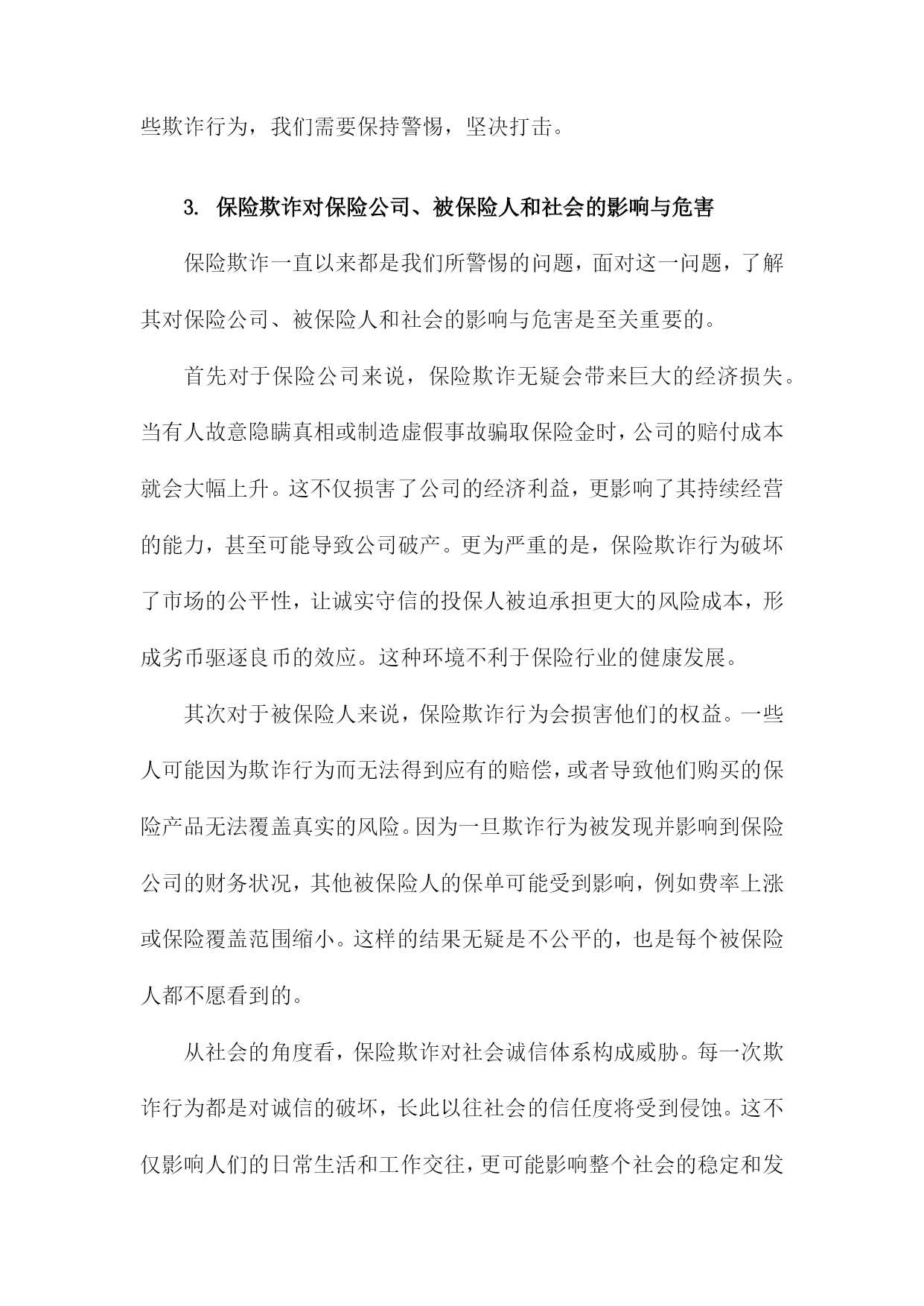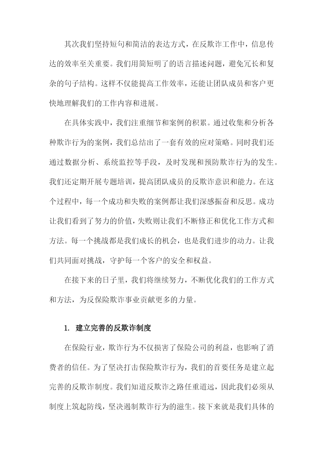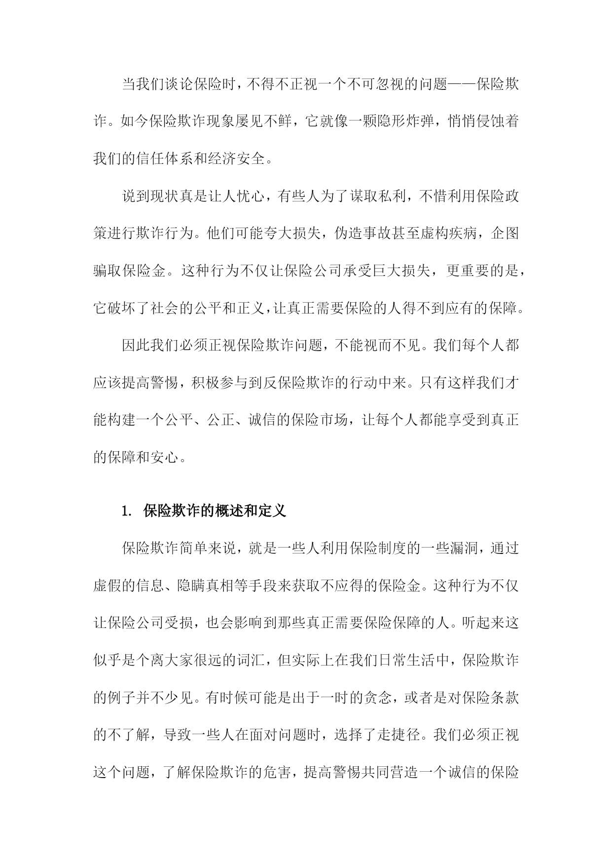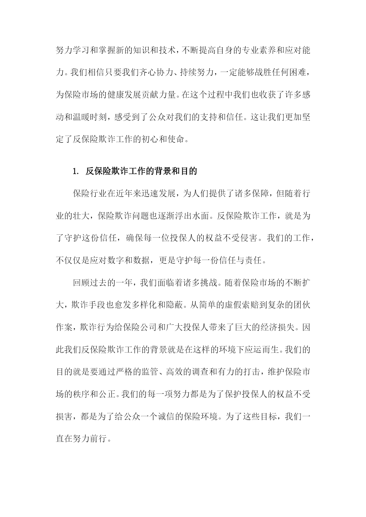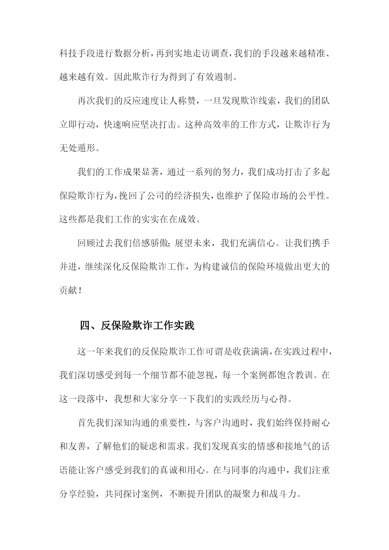 反保险欺诈工作总结一、内容概括回首过去的一年,我们在反保险欺诈工作中取得了不小的成绩,也有许多值得总结的经验和教训。我们的团队始终坚持以人民为中心,坚决打击保险欺诈行为,守护广大市民的合法权益。接下来就让我们一起回顾一下这一年的工作情况吧。首先我们加大了对保险欺诈行为的打击力度,我们接到各类保险欺诈的报案,积极展开调查,对涉嫌欺诈的行为进行严肃处理。无论是通过大数据分析,还是实地调查取证,我们都力求做到精准打击,让违法者无处遁形。其次我们注重宣传教育,通过各种渠道普及保险知识,让大家了解保险欺诈的危害性,提高公众的防范意识。此外我们还与各大保险公司紧密合作,共同制定防范措施,形成反保险欺诈的合力。当然我们也面临着一些挑战和困难,比如技术手段的更新、法律法规的完善等,但我们相信在大家的共同努力下,一定能够克服这些困难,取得更大的胜利。这一年的反保险欺诈工作虽然辛苦,但成果显著,我们深感欣慰和自豪。1.简述保险欺诈问题的背景和重要性在当今社会,随着保险行业的快速发展,保险欺诈问题逐渐浮出水面,成为行业内的一大难题。我们都知道,保险是为了在意外发生时给予我们经济上的支持和保障,然而总有一些人企图利用保险进行欺诈,这不仅损害了保险公司的利益,更让真正需要保险的人面临风险。因此反保险欺诈工作的重要性不言而喻,它不仅关乎保险公司的信誉和健康发展,更关乎社会的公平与正义。我们每个人都应该对此给予足够的重视和支持,接下来我们将详细回顾我们在反保险欺诈工作中的努力和成果。2.概括本文的主旨和核心内容本文主要总结了我们在反保险欺诈工作中的成果和经验,我们深入剖析了保险欺诈的危害,明确了打击保险欺诈的重要性和紧迫性。通过我们的努力,成功地揭露并打击了一批保险欺诈行为,维护了保险市场的公平与正义。文章的核心内容,不仅介绍了我们在工作中的具体做法和取得的成效,还分析了保险欺诈产生的主要原因,提出了防范和打击保险欺诈的对策和建议。我们坚信只有全社会共同努力,才能有效地遏制保险欺诈行为,让保险真正发挥风险保障的作用。这篇总结既是对我们工作的回顾,也是对未来工作的展望和期许。我们决心继续坚决打击保险欺诈行为,守护每一位投保人的权益。二、保险欺诈现状及危害当我们谈论保险时,不得不正视一个不可忽视的问题——保险欺诈。如今保险欺诈现象屡见不鲜,它就像一颗隐形炸弹,悄悄侵蚀着我们的信任体系和经济安全。说到现状真是让人忧心,有些人为了谋取私利,不惜利用保险政策进行欺诈行为。他们可能夸大损失,伪造事故甚至虚构疾病,企图骗取保险金。这种行为不仅让保险公司承受巨大损失,更重要的是,它破坏了社会的公平和正义,让真正需要保险的人得不到应有的保障。因此我们必须正视保险欺诈问题,不能视而不见。我们每个人都应该提高警惕,积极参与到反保险欺诈的行动中来。只有这样我们才能构建一个公平、公正、诚信的保险市场,让每个人都能享受到真正的保障和安心。1.保险欺诈的概述和定义保险欺诈简单来说,就是一些人利用保险制度的一些漏洞,通过虚假的信息、隐瞒真相等手段来获取不应得的保险金。这种行为不仅让保险公司受损,也会影响到那些真正需要保险保障的人。听起来这似乎是个离大家很远的词汇,但实际上在我们日常生活中,保险欺诈的例子并不少见。有时候可能是出于一时的贪念,或者是对保险条款的不了解,导致一些人在面对问题时,选择了走捷径。我们必须正视这个问题,了解保险欺诈的危害,提高警惕共同营造一个诚信的保险环境。2.保险欺诈的主要类型和表现形式随着社会的快速发展,保险欺诈现象屡见不鲜,这不仅侵害了保险公司的合法权益,也影响了广大消费者的信任度。因此深入了解保险欺诈的主要类型和表现形式,对预防与打击保险欺诈具有重要意义。保险欺诈一个让人头疼的问题,从我们的工作中发现,它的主要类型和表现形式可谓五花八门。首先是“虚假理赔”。有些客户为了获取不属于自己的保险赔偿,伪造事故现场,提供虚假证明,企图蒙混过关。这种行为不仅违反了法律,也违背了保险的本质——互助共济。接下来是“夸大损失”。一些人在出险后,不是如实告知损失情况,而是夸大损失程度,企图获取更多赔偿。这种行为虽然看似只是“小事一桩”,但长此以往,会导致保险市场的信任危机。还有一种形式是“团伙作案”。一些不法分子组织起来,故意制造事故,骗取保险金。这种行为性质恶劣,对保险市场的稳定造成极大威胁。好在我们的监管和打击力度不断加强,这种现象得到了有效遏制。此外还有一些其他形式,比如冒名顶替、使用假票据等。这些欺诈行为虽各有特点,但它们的共同点都是为了图谋不法利益。面对这些欺诈行为,我们需要保持警惕,坚决打击。3.保险欺诈对保险公司、被保险人和社会的影响与危害保险欺诈一直以来都是我们所警惕的问题,面对这一问题,了解其对保险公司、被保险人和
