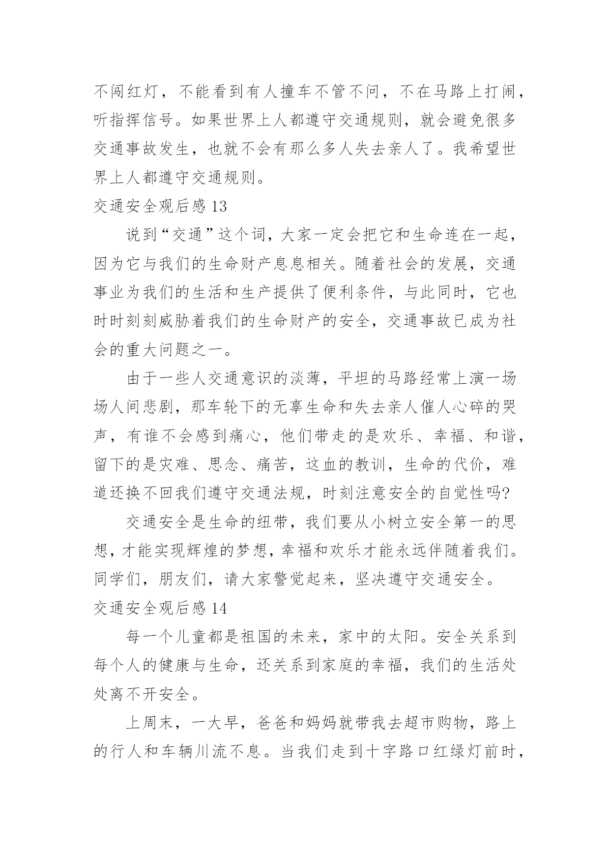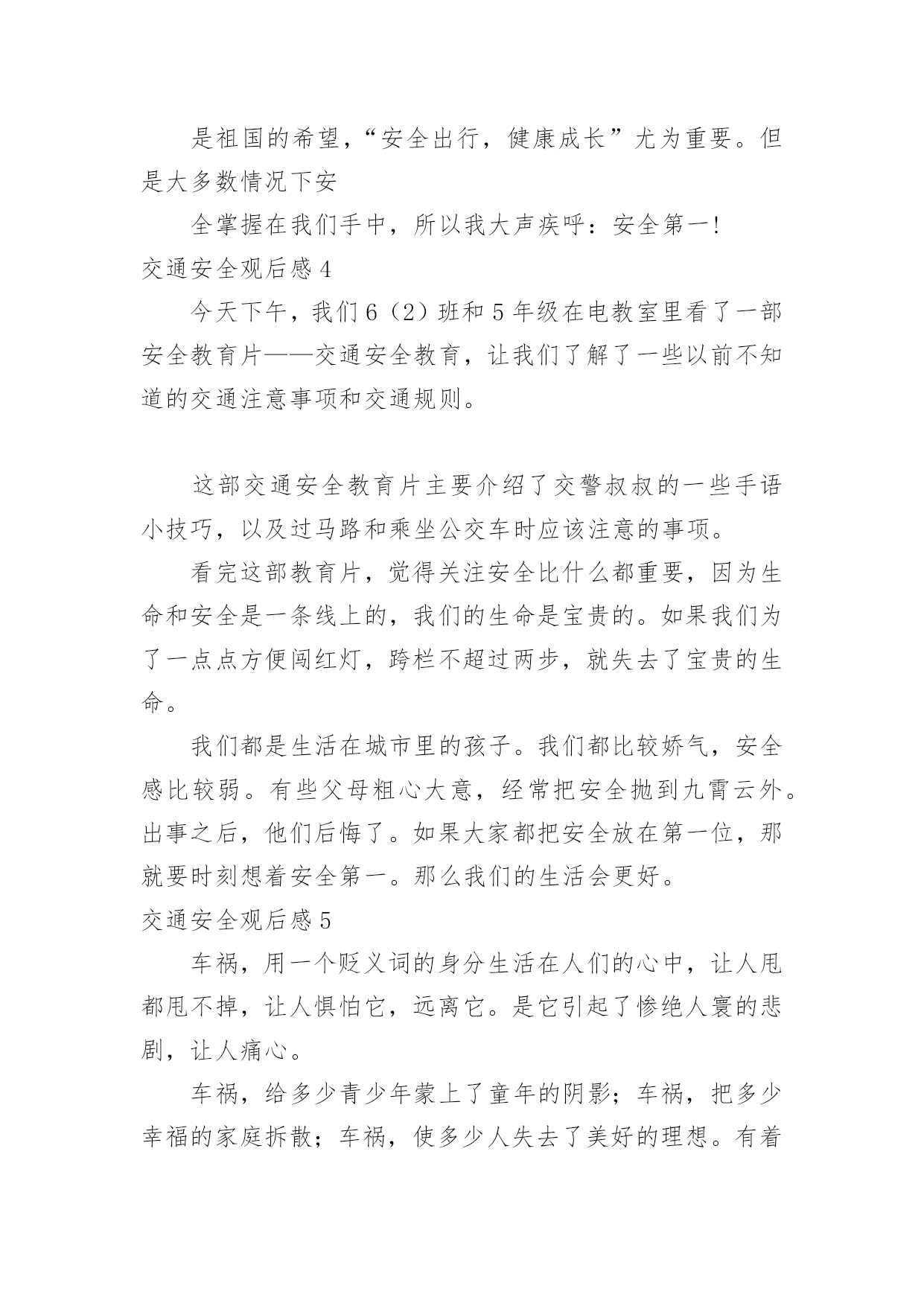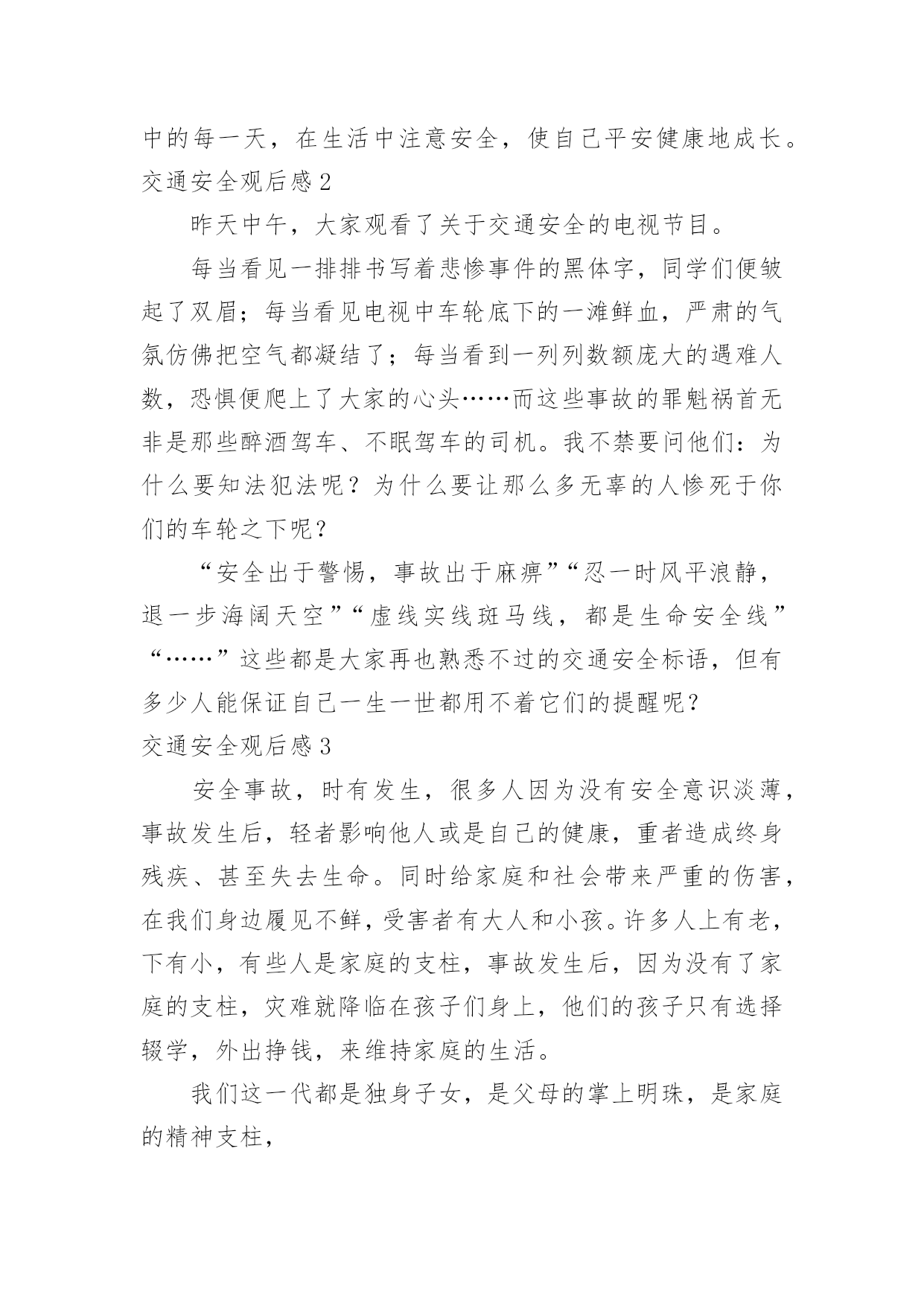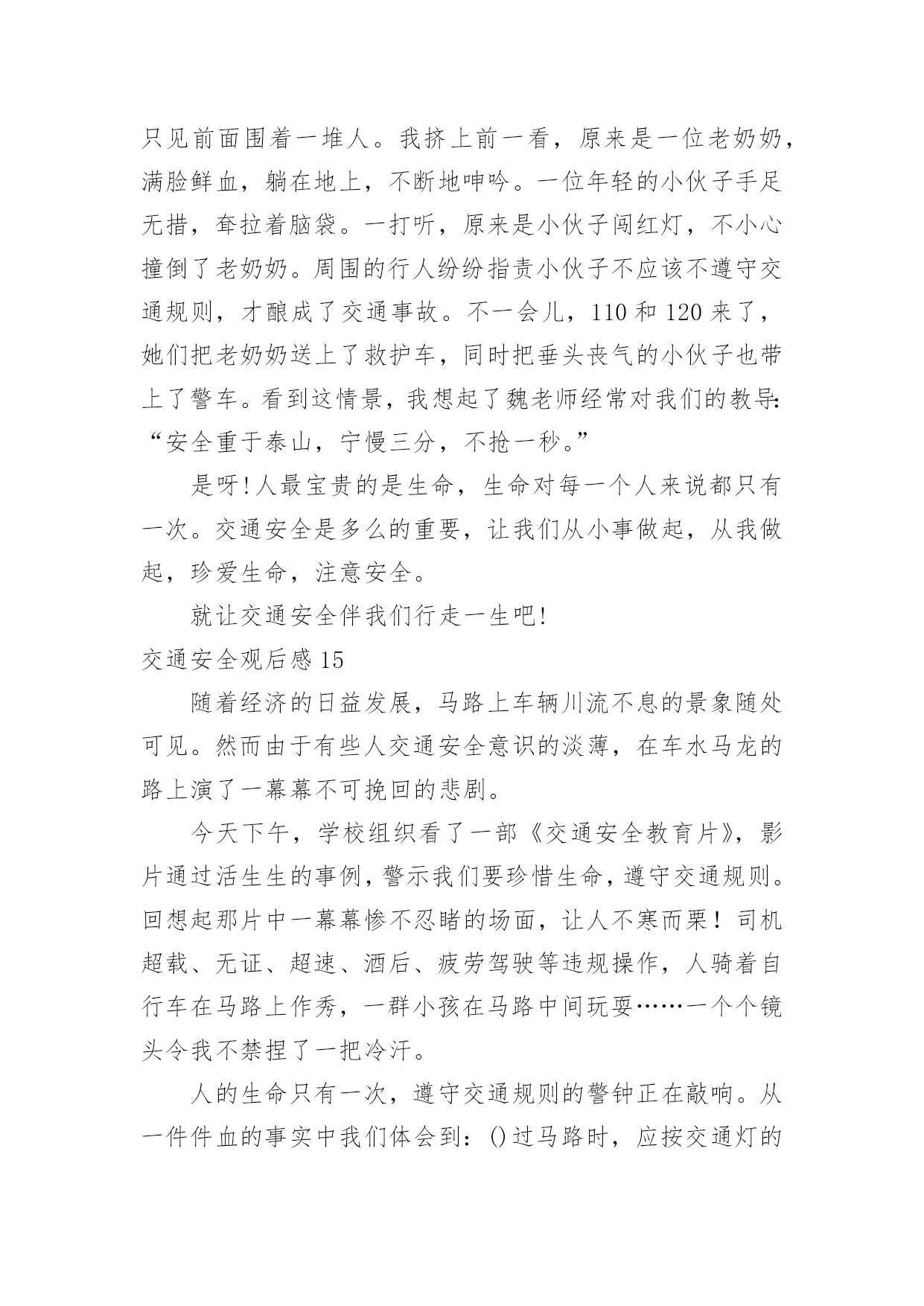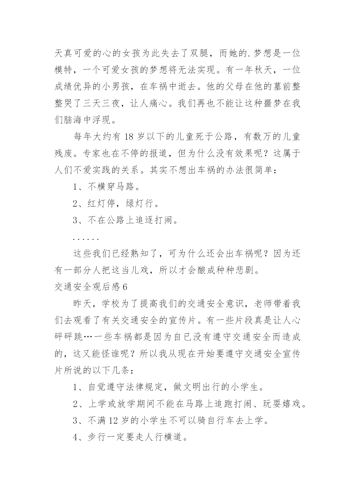 交通安全观后感交通安全观后感(精选15篇)当认真看完一部作品后,这次观看让你有什么体会呢?需要回过头来写一写观后感了。可是观后感怎么写才合适呢?下面是小编整理的交通安全观后感,希望对大家有所帮助。交通安全观后感1为了提高我们的交通安全意识,星期五上午,桥西区一大队的魏警官来到我们学校,给我们做了一次交通安全知识讲座。交警叔叔给我们讲了许多关于交通安全的事例:有个孩子蹲在小摊前玩儿,因为个头矮小,突然一辆面包车行驶过来,把孩子给轧死了。这件事告诉我们,不能在路边玩耍,因为危险随时会来临。听到这里,我不禁想起,每天上学或放学时,同学们不遵守交通规则的现象,如:骑车时在路上拉手,在路上嬉戏打闹,横穿马路等。我希望同学们能够珍惜生命,注意自己的安全,自觉地遵守道路交通法规。这次交通安全知识讲座让我明白了:生命是脆弱的,如果发生了什么意外,会给自己和家庭留下永远的伤痕。健康的身体一旦失去,将永远无法挽回。我们要珍惜自己的生命中的每一天,在生活中注意安全,使自己平安健康地成长。交通安全观后感2昨天中午,大家观看了关于交通安全的电视节目。每当看见一排排书写着悲惨事件的黑体字,同学们便皱起了双眉;每当看见电视中车轮底下的一滩鲜血,严肃的气氛仿佛把空气都凝结了;每当看到一列列数额庞大的遇难人数,恐惧便爬上了大家的心头……而这些事故的罪魁祸首无非是那些醉酒驾车、不眠驾车的司机。我不禁要问他们:为什么要知法犯法呢?为什么要让那么多无辜的人惨死于你们的车轮之下呢?“安全出于警惕,事故出于麻痹”“忍一时风平浪静,退一步海阔天空”“虚线实线斑马线,都是生命安全线”“……”这些都是大家再也熟悉不过的交通安全标语,但有多少人能保证自己一生一世都用不着它们的提醒呢?交通安全观后感3安全事故,时有发生,很多人因为没有安全意识淡薄,事故发生后,轻者影响他人或是自己的健康,重者造成终身残疾、甚至失去生命。同时给家庭和社会带来严重的伤害,在我们身边履见不鲜,受害者有大人和小孩。许多人上有老,下有小,有些人是家庭的支柱,事故发生后,因为没有了家庭的支柱,灾难就降临在孩子们身上,他们的孩子只有选择辍学,外出挣钱,来维持家庭的生活。我们这一代都是独身子女,是父母的掌上明珠,是家庭的精神支柱,是祖国的希望,“安全出行,健康成长”尤为重要。但是大多数情况下安全掌握在我们手中,所以我大声疾呼:安全第一!交通安全观后感4今天下午,我们6(2)班和5年级在电教室里看了一部安全教育片——交通安全教育,让我们了解了一些以前不知道的交通注意事项和交通规则。这部交通安全教育片主要介绍了交警叔叔的一些手语小技巧,以及过马路和乘坐公交车时应该注意的事项。看完这部教育片,觉得关注安全比什么都重要,因为生命和安全是一条线上的,我们的生命是宝贵的。如果我们为了一点点方便闯红灯,跨栏不超过两步,就失去了宝贵的生命。我们都是生活在城市里的孩子。我们都比较娇气,安全感比较弱。有些父母粗心大意,经常把安全抛到九霄云外。出事之后,他们后悔了。如果大家都把安全放在第一位,那就要时刻想着安全第一。那么我们的生活会更好。交通安全观后感5车祸,用一个贬义词的身分生活在人们的心中,让人甩都甩不掉,让人惧怕它,远离它。是它引起了惨绝人寰的悲剧,让人痛心。车祸,给多少青少年蒙上了童年的阴影;车祸,把多少幸福的家庭拆散;车祸,使多少人失去了美好的理想。有着天真可爱的心的女孩为此失去了双腿,而她的.梦想是一位模特,一个可爱女孩的梦想将无法实现。有一年秋天,一位成绩优异的小男孩,在车祸中逝去。他的父母在他的墓前整整哭了三天三夜,让人痛心。我们再也不能让这种噩梦在我们脑海中浮现。每年大约有18岁以下的儿童死于公路,有数万的儿童残废。专家也在不停的报道,但为什么没有效果呢?这属于人们不爱实践的关系。其实不想出车祸的办法很简单:1、不横穿马路。2、红灯停,绿灯行。3、不在公路上追逐打闹。......这些我们已经熟知了,可为什么还会出车祸呢?因为还有一部分人把这当儿戏,所以才会酿成种种悲剧。交通安全观后感6昨天,学校为了提高我们的交通安全意识,老师带着我们去观看了有关交通安全的宣传片。有一些片段真是让人心砰砰跳…一些车祸都是因为自已没有遵守交通安全而造成的,这又能怪谁呢?所以我从现在开始要遵守交通安全宣传片所说的以下几条:1、自觉遵守法律规定,做文明出行的小学生。2、上学或放学期间不能在马路上追跑打闹、玩耍嬉戏。3、不满12岁的小学生不可以骑自行车去上学。4、步行一定要走人行横道。5、不能闯红灯、跨越护栏、毁坏交通设施。我们每一个的生命都是有限的,也是宝贵的,让我们每一个人都遵守交通规则,珍惜、爱护我们的生命,做为一名小学生我们更应该珍爱生命,要时刻提醒自己重视交通安全,我们要让交通安全的警钟永远伴随在我们的身边。我一定会遵守交通秩序