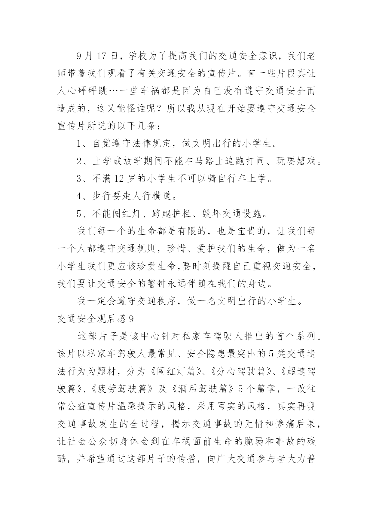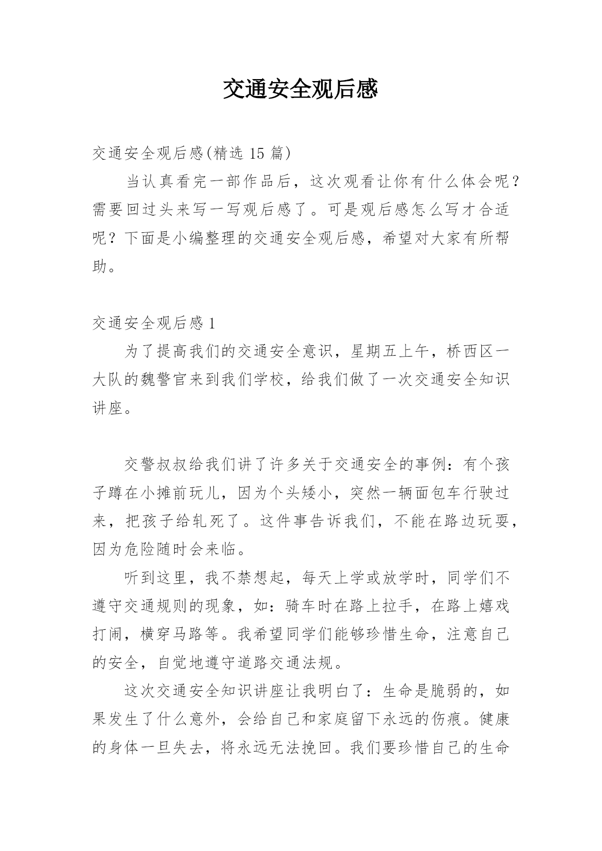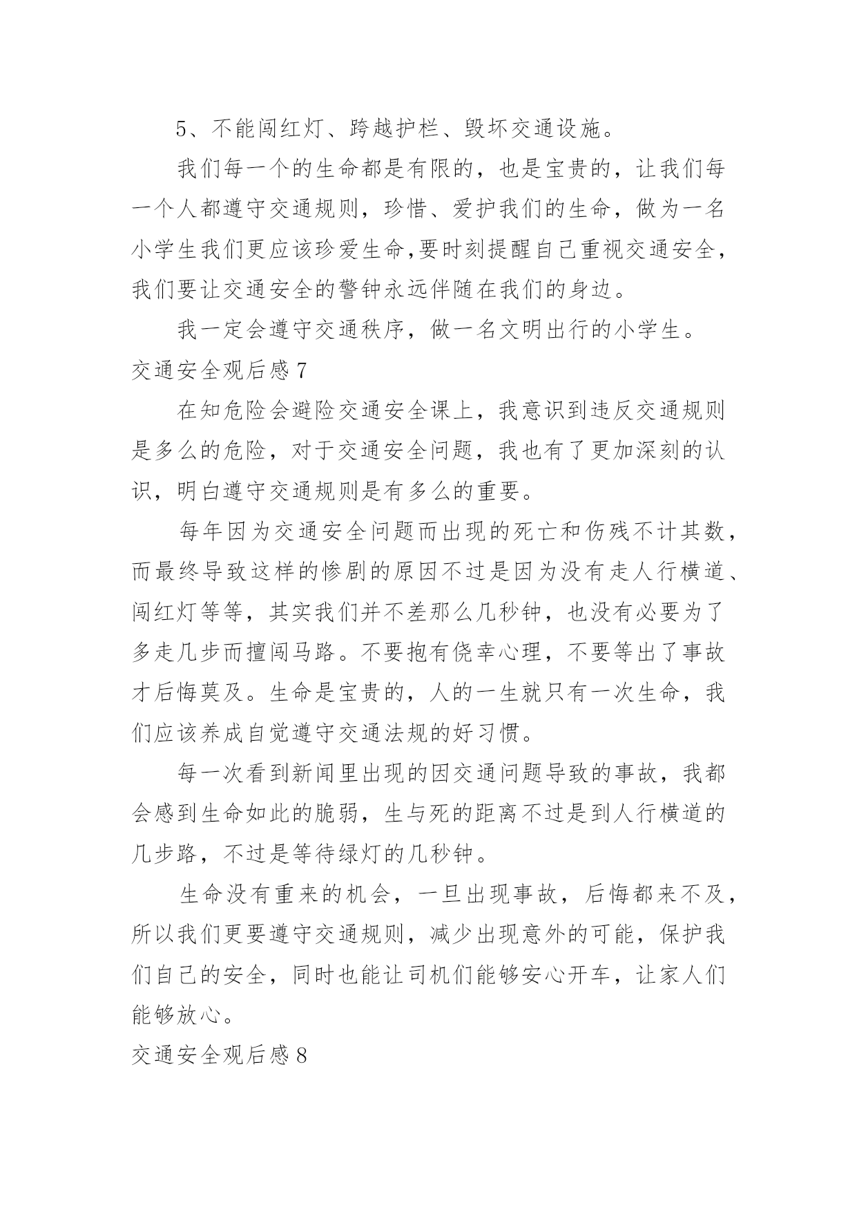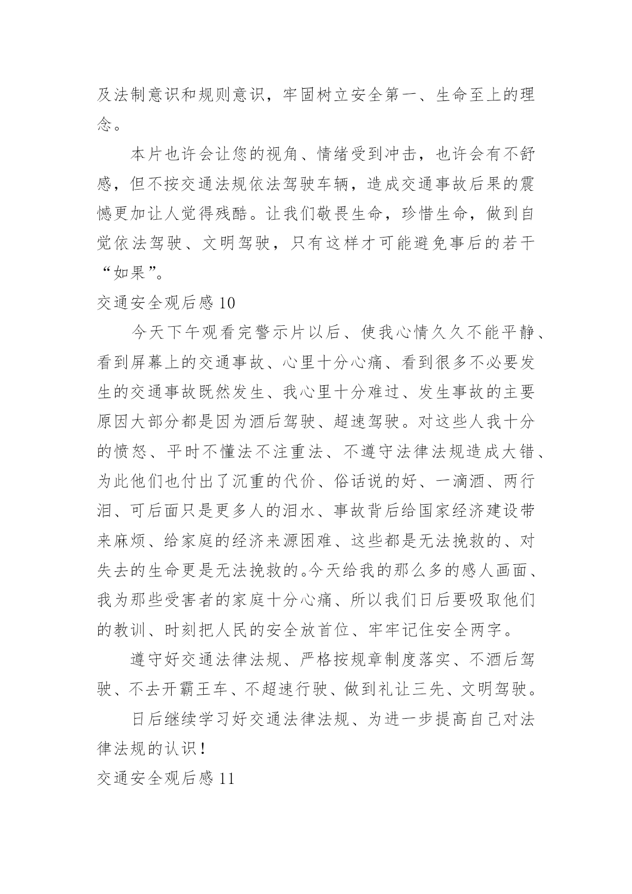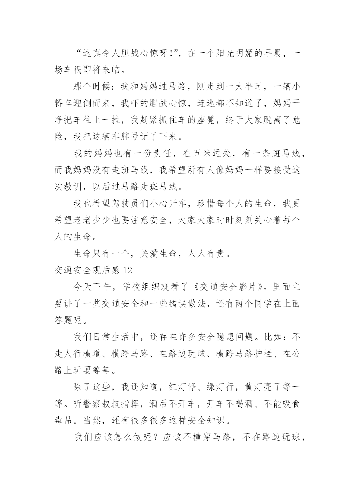 交通安全观后感交通安全观后感(精选15篇)当认真看完一部作品后,这次观看让你有什么体会呢?需要回过头来写一写观后感了。可是观后感怎么写才合适呢?下面是小编整理的交通安全观后感,希望对大家有所帮助。交通安全观后感1为了提高我们的交通安全意识,星期五上午,桥西区一大队的魏警官来到我们学校,给我们做了一次交通安全知识讲座。交警叔叔给我们讲了许多关于交通安全的事例:有个孩子蹲在小摊前玩儿,因为个头矮小,突然一辆面包车行驶过来,把孩子给轧死了。这件事告诉我们,不能在路边玩耍,因为危险随时会来临。听到这里,我不禁想起,每天上学或放学时,同学们不遵守交通规则的现象,如:骑车时在路上拉手,在路上嬉戏打闹,横穿马路等。我希望同学们能够珍惜生命,注意自己的安全,自觉地遵守道路交通法规。这次交通安全知识讲座让我明白了:生命是脆弱的,如果发生了什么意外,会给自己和家庭留下永远的伤痕。健康的身体一旦失去,将永远无法挽回。我们要珍惜自己的生命中的每一天,在生活中注意安全,使自己平安健康地成长。交通安全观后感2昨天中午,大家观看了关于交通安全的电视节目。每当看见一排排书写着悲惨事件的黑体字,同学们便皱起了双眉;每当看见电视中车轮底下的一滩鲜血,严肃的气氛仿佛把空气都凝结了;每当看到一列列数额庞大的遇难人数,恐惧便爬上了大家的心头……而这些事故的罪魁祸首无非是那些醉酒驾车、不眠驾车的司机。我不禁要问他们:为什么要知法犯法呢?为什么要让那么多无辜的人惨死于你们的车轮之下呢?“安全出于警惕,事故出于麻痹”“忍一时风平浪静,退一步海阔天空”“虚线实线斑马线,都是生命安全线”“……”这些都是大家再也熟悉不过的交通安全标语,但有多少人能保证自己一生一世都用不着它们的提醒呢?交通安全观后感3安全事故,时有发生,很多人因为没有安全意识淡薄,事故发生后,轻者影响他人或是自己的健康,重者造成终身残疾、甚至失去生命。同时给家庭和社会带来严重的伤害,在我们身边履见不鲜,受害者有大人和小孩。许多人上有老,下有小,有些人是家庭的支柱,事故发生后,因为没有了家庭的支柱,灾难就降临在孩子们身上,他们的孩子只有选择辍学,外出挣钱,来维持家庭的生活。我们这一代都是独身子女,是父母的掌上明珠,是家庭的精神支柱,是祖国的希望,“安全出行,健康成长”尤为重要。但是大多数情况下安全掌握在我们手中,所以我大声疾呼:安全第一!交通安全观后感4今天下午,我们6(2)班和5年级在电教室里看了一部安全教育片——交通安全教育,让我们了解了一些以前不知道的交通注意事项和交通规则。这部交通安全教育片主要介绍了交警叔叔的一些手语小技巧,以及过马路和乘坐公交车时应该注意的事项。看完这部教育片,觉得关注安全比什么都重要,因为生命和安全是一条线上的,我们的生命是宝贵的。如果我们为了一点点方便闯红灯,跨栏不超过两步,就失去了宝贵的生命。我们都是生活在城市里的孩子。我们都比较娇气,安全感比较弱。有些父母粗心大意,经常把安全抛到九霄云外。出事之后,他们后悔了。如果大家都把安全放在第一位,那就要时刻想着安全第一。那么我们的生活会更好。交通安全观后感5车祸,用一个贬义词的身分生活在人们的心中,让人甩都甩不掉,让人惧怕它,远离它。是它引起了惨绝人寰的悲剧,让人痛心。车祸,给多少青少年蒙上了童年的阴影;车祸,把多少幸福的家庭拆散;车祸,使多少人失去了美好的理想。有着天真可爱的心的女孩为此失去了双腿,而她的.梦想是一位模特,一个可爱女孩的梦想将无法实现。有一年秋天,一位成绩优异的小男孩,在车祸中逝去。他的父母在他的墓前整整哭了三天三夜,让人痛心。我们再也不能让这种噩梦在我们脑海中浮现。每年大约有18岁以下的儿童死于公路,有数万的儿童残废。专家也在不停的报道,但为什么没有效果呢?这属于人们不爱实践的关系。其实不想出车祸的办法很简单:1、不横穿马路。2、红灯停,绿灯行。3、不在公路上追逐打闹。......这些我们已经熟知了,可为什么还会出车祸呢?因为还有一部分人把这当儿戏,所以才会酿成种种悲剧。交通安全观后感6昨天,学校为了提高我们的交通安全意识,老师带着我们去观看了有关交通安全的宣传片。有一些片段真是让人心砰砰跳…一些车祸都是因为自已没有遵守交通安全而造成的,这又能怪谁呢?所以我从现在开始要遵守交通安全宣传片所说的以下几条:1、自觉遵守法律规定,做文明出行的小学生。2、上学或放学期间不能在马路上追跑打闹、玩耍嬉戏。3、不满12岁的小学生不可以骑自行车去上学。4、步行一定要走人行横道。5、不能闯红灯、跨越护栏、毁坏交通设施。我们每一个的生命都是有限的,也是宝贵的,让我们每一个人都遵守交通规则,珍惜、爱护我们的生命,做为一名小学生我们更应该珍爱生命,要时刻提醒自己重视交通安全,我们要让交通安全的警钟永远伴随在我们的身边。我一定会遵守交通秩序