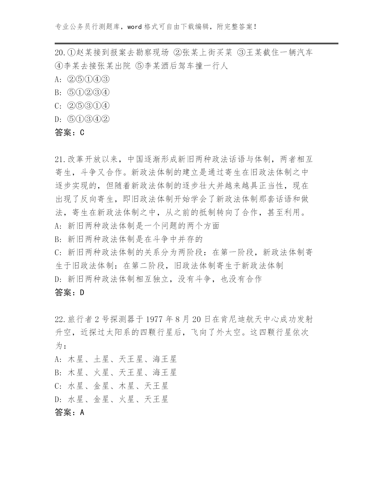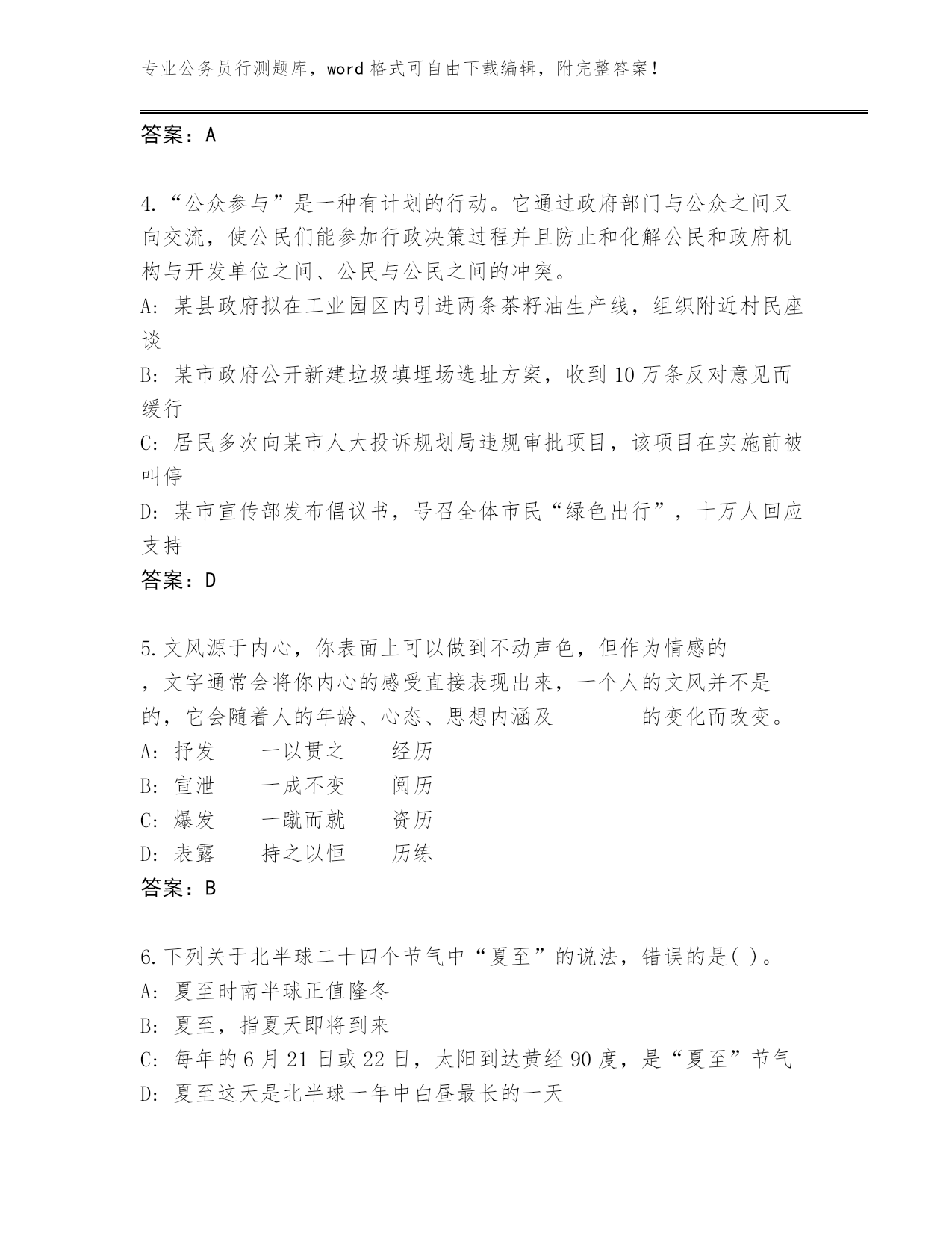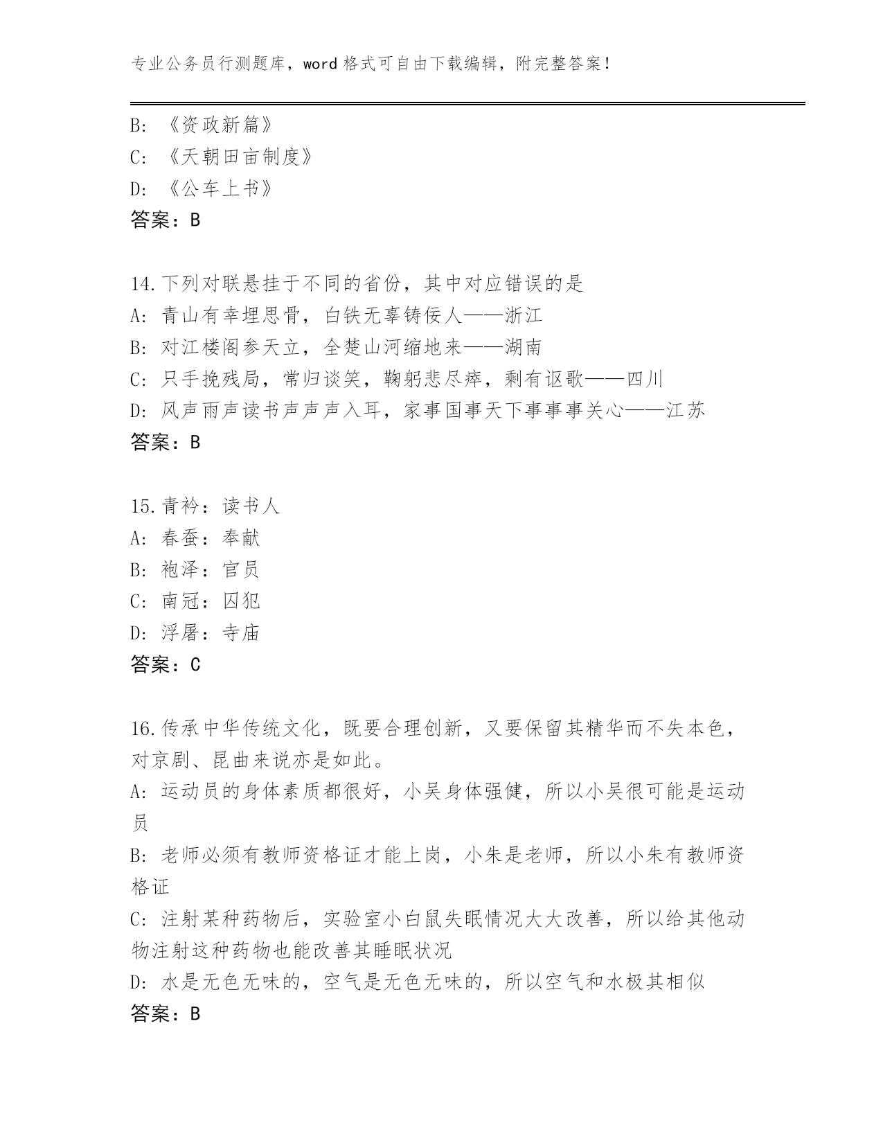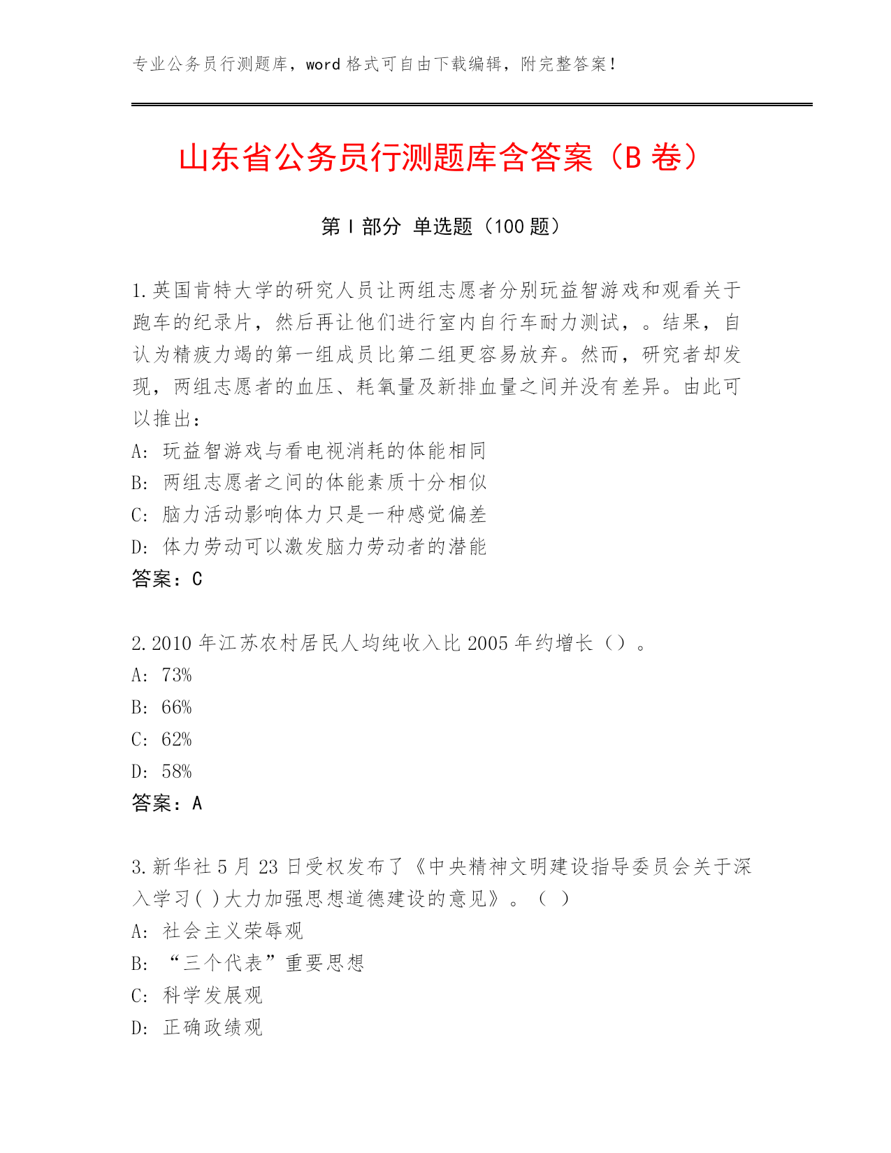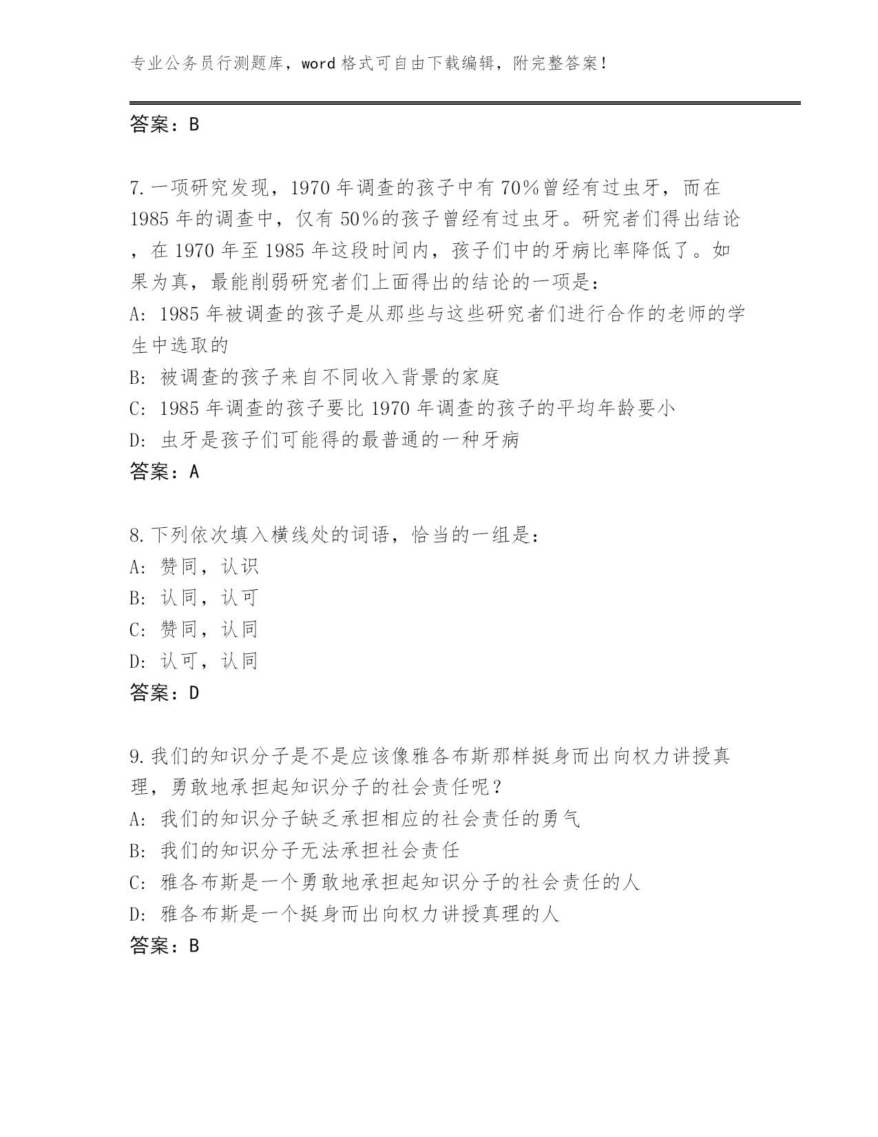 专业公务员行测题库,word格式可自由下载编辑,附完整答案!山东省公务员行测题库含答案(B卷)第I部分单选题(100题)1.英国肯特大学的研究人员让两组志愿者分别玩益智游戏和观看关于跑车的纪录片,然后再让他们进行室内自行车耐力测试,。结果,自认为精疲力竭的第一组成员比第二组更容易放弃。然而,研究者却发现,两组志愿者的血压、耗氧量及新排血量之间并没有差异。由此可以推出:A:玩益智游戏与看电视消耗的体能相同B:两组志愿者之间的体能素质十分相似C:脑力活动影响体力只是一种感觉偏差D:体力劳动可以激发脑力劳动者的潜能答案:C2.2010年江苏农村居民人均纯收入比2005年约增长()。A:73%B:66%C:62%D:58%答案:A3.新华社5月23日受权发布了《中央精神文明建设指导委员会关于深入学习()大力加强思想道德建设的意见》。()A:社会主义荣辱观B:“三个代表”重要思想C:科学发展观D:正确政绩观答案:A4.“公众参与”是一种有计划的行动。它通过政府部门与公众之间又向交流,使公民们能参加行政决策过程并且防止和化解公民和政府机构与开发单位之间、公民与公民之间的冲突。A:某县政府拟在工业园区内引进两条茶籽油生产线,组织附近村民座谈B:某市政府公开新建垃圾填埋场选址方案,收到10万条反对意见而缓行C:居民多次向某市人大投诉规划局违规审批项目,该项目在实施前被叫停D:某市宣传部发布倡议书,号召全体市民“绿色出行”,十万人回应支持答案:D5.文风源于内心,你表面上可以做到不动声色,但作为情感的,文字通常会将你内心的感受直接表现出来,一个人的文风并不是的,它会随着人的年龄、心态、思想内涵及的变化而改变。A:抒发一以贯之经历B:宣泄一成不变阅历C:爆发一蹴而就资历D:表露持之以恒历练答案:B6.下列关于北半球二十四个节气中“夏至”的说法,错误的是()。A:夏至时南半球正值隆冬B:夏至,指夏天即将到来C:每年的6月21日或22日,太阳到达黄经90度,是“夏至”节气D:夏至这天是北半球一年中白昼最长的一天答案:B7.一项研究发现,1970年调查的孩子中有70%曾经有过虫牙,而在1985年的调查中,仅有50%的孩子曾经有过虫牙。研究者们得出结论,在1970年至1985年这段时间内,孩子们中的牙病比率降低了。如果为真,最能削弱研究者们上面得出的结论的一项是:A:1985年被调查的孩子是从那些与这些研究者们进行合作的老师的学生中选取的B:被调查的孩子来自不同收入背景的家庭C:1985年调查的孩子要比1970年调查的孩子的平均年龄要小D:虫牙是孩子们可能得的最普通的一种牙病答案:A8.下列依次填入横线处的词语,恰当的一组是:A:赞同,认识B:认同,认可C:赞同,认同D:认可,认同答案:D9.我们的知识分子是不是应该像雅各布斯那样挺身而出向权力讲授真理,勇敢地承担起知识分子的社会责任呢?A:我们的知识分子缺乏承担相应的社会责任的勇气B:我们的知识分子无法承担社会责任C:雅各布斯是一个勇敢地承担起知识分子的社会责任的人D:雅各布斯是一个挺身而出向权力讲授真理的人答案:B10.林辉在自助餐店就餐,他准备挑选三种肉类中的一种肉类,四种蔬菜中的二种不同蔬菜,以及四种点心中的一种点心。若不考虑食物的挑选次序,则他可以有多少不同选择方法?()A:24B:4C:72D:144答案:C11.划分就是把一个概念所反映的对象分为几小类来眀确概念外延的逻辑方法,也可以说是把一个外延较大的属概念分成几个并列的种概念的逻辑方法。分解是在思维中将一个对象分成几个部分,反映部分的概念和反映整体的概念之间不是种属关系。A:宇宙中的天体可分为自然天体和人造天体B:呼和浩特市分为新城区、回民区、赛罕区、玉泉区C:定义分为被定义项、定义项和定义联项D:刑罚分为主刑、剥夺政治权利、没收财产等答案:A12.-7012()A:3B:6C:9D:10答案:C13.洪仁轩是洪秀全的弟弟,他在太平天国后期一度主持朝政,并向洪秀全提出了一个带有资本主义色彩的改革纲领,这就是A:《日本辩证考》B:《资政新篇》C:《天朝田亩制度》D:《公车上书》答案:B14.下列对联悬挂于不同的省份,其中对应错误的是A:青山有幸埋思骨,白铁无辜铸佞人——浙江B:对江楼阁参天立,全楚山河缩地来——湖南C:只手挽残局,常归谈笑,鞠躬悲尽瘁,剩有讴歌——四川D:风声雨声读书声声声入耳,家事国事天下事事事关心——江苏答案:B15.青衿:读书人A:春蚕:奉献B:袍泽:官员C:南冠:囚犯D:浮屠:寺庙答案:C16