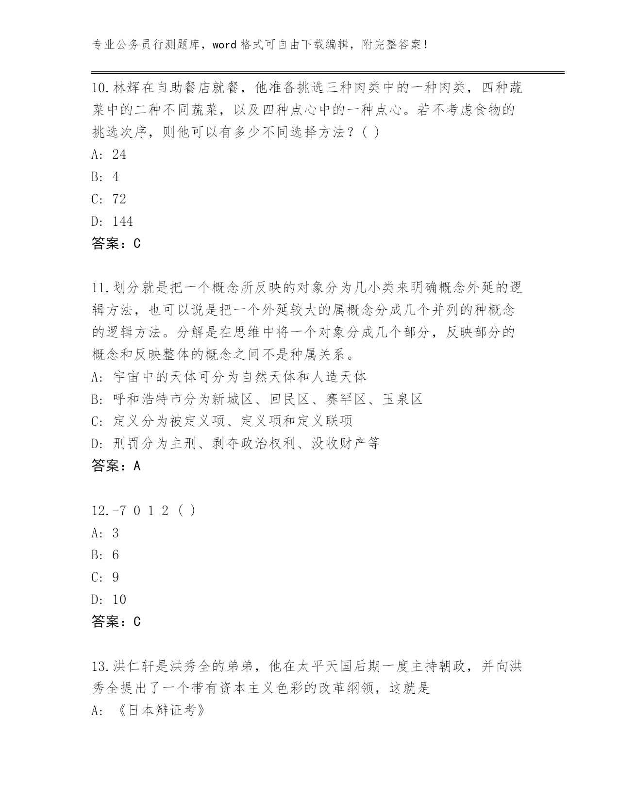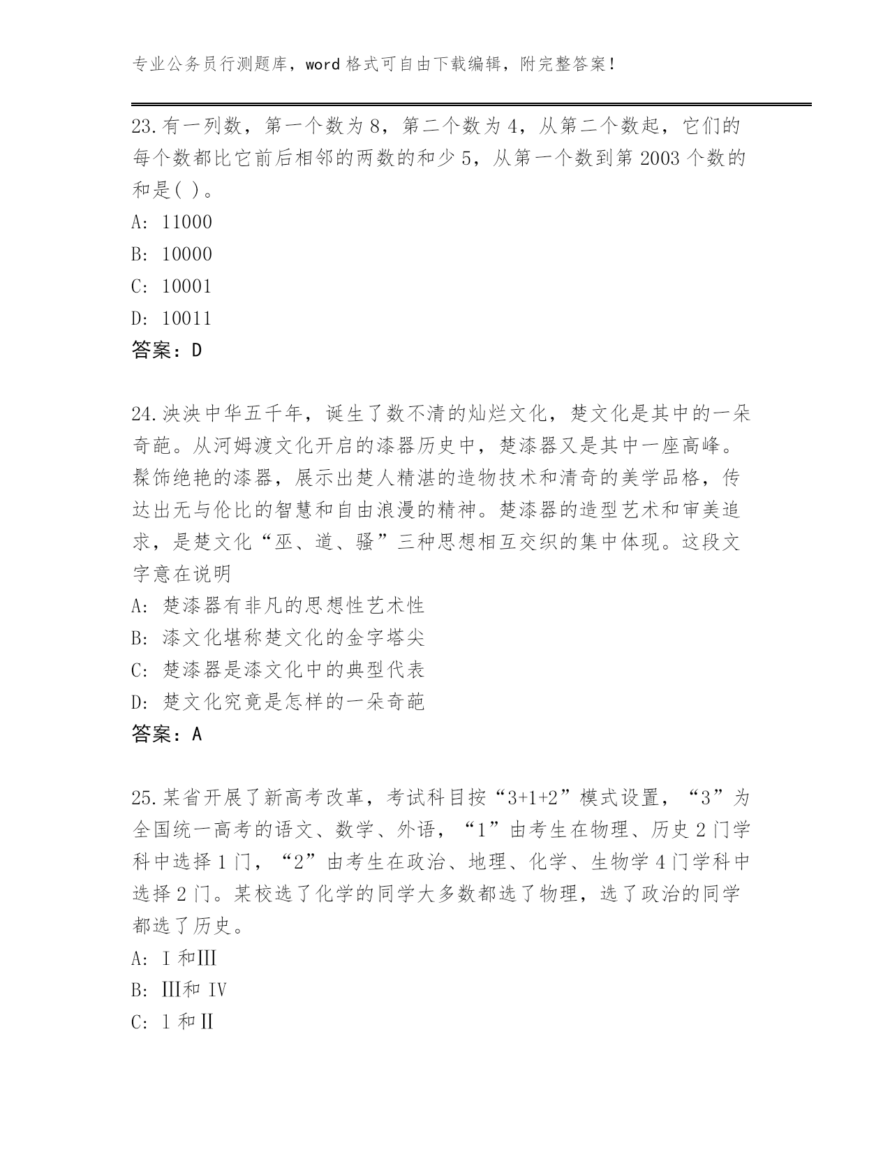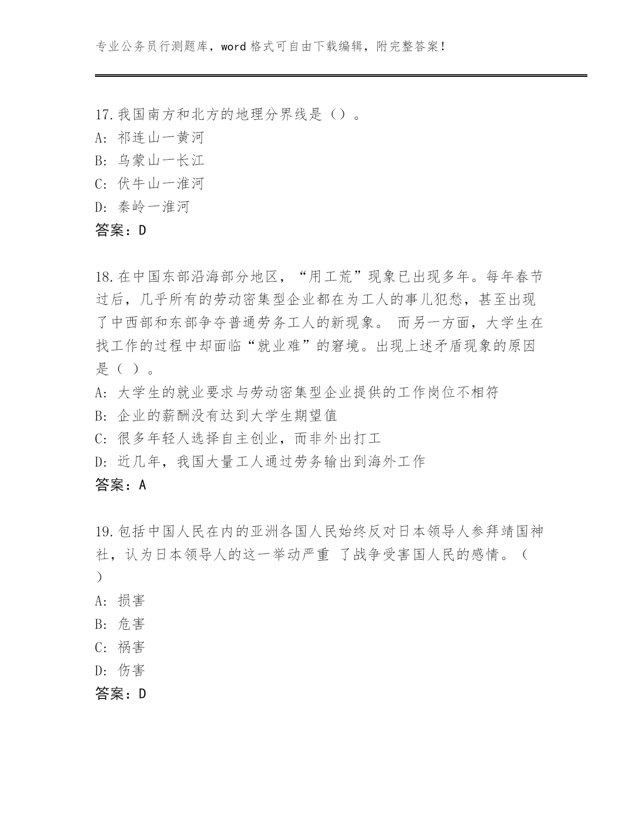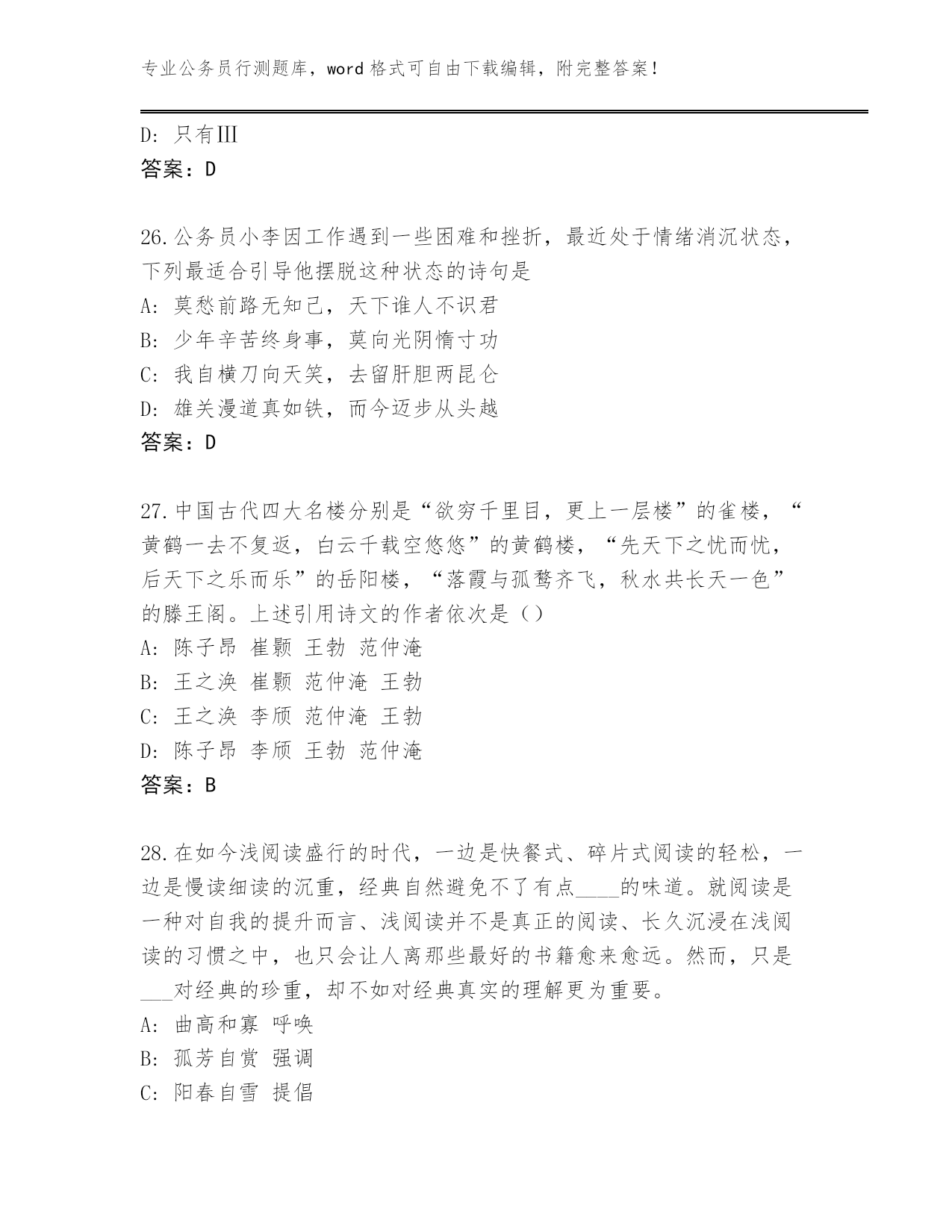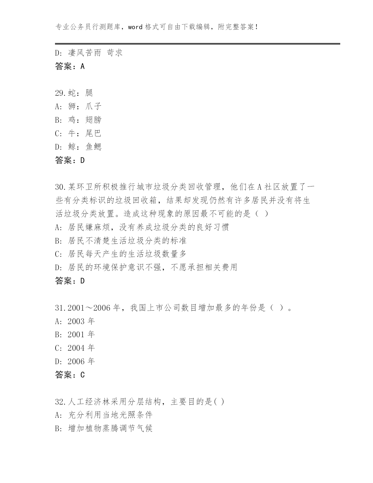 专业公务员行测题库,word格式可自由下载编辑,附完整答案!山东省公务员行测题库含答案(B卷)第I部分单选题(100题)1.英国肯特大学的研究人员让两组志愿者分别玩益智游戏和观看关于跑车的纪录片,然后再让他们进行室内自行车耐力测试,。结果,自认为精疲力竭的第一组成员比第二组更容易放弃。然而,研究者却发现,两组志愿者的血压、耗氧量及新排血量之间并没有差异。由此可以推出:A:玩益智游戏与看电视消耗的体能相同B:两组志愿者之间的体能素质十分相似C:脑力活动影响体力只是一种感觉偏差D:体力劳动可以激发脑力劳动者的潜能答案:C2.2010年江苏农村居民人均纯收入比2005年约增长()。A:73%B:66%C:62%D:58%答案:A3.新华社5月23日受权发布了《中央精神文明建设指导委员会关于深入学习()大力加强思想道德建设的意见》。()A:社会主义荣辱观B:“三个代表”重要思想C:科学发展观D:正确政绩观答案:A4.“公众参与”是一种有计划的行动。它通过政府部门与公众之间又向交流,使公民们能参加行政决策过程并且防止和化解公民和政府机构与开发单位之间、公民与公民之间的冲突。A:某县政府拟在工业园区内引进两条茶籽油生产线,组织附近村民座谈B:某市政府公开新建垃圾填埋场选址方案,收到10万条反对意见而缓行C:居民多次向某市人大投诉规划局违规审批项目,该项目在实施前被叫停D:某市宣传部发布倡议书,号召全体市民“绿色出行”,十万人回应支持答案:D5.文风源于内心,你表面上可以做到不动声色,但作为情感的,文字通常会将你内心的感受直接表现出来,一个人的文风并不是的,它会随着人的年龄、心态、思想内涵及的变化而改变。A:抒发一以贯之经历B:宣泄一成不变阅历C:爆发一蹴而就资历D:表露持之以恒历练答案:B6.下列关于北半球二十四个节气中“夏至”的说法,错误的是()。A:夏至时南半球正值隆冬B:夏至,指夏天即将到来C:每年的6月21日或22日,太阳到达黄经90度,是“夏至”节气D:夏至这天是北半球一年中白昼最长的一天答案:B7.一项研究发现,1970年调查的孩子中有70%曾经有过虫牙,而在1985年的调查中,仅有50%的孩子曾经有过虫牙。研究者们得出结论,在1970年至1985年这段时间内,孩子们中的牙病比率降低了。如果为真,最能削弱研究者们上面得出的结论的一项是:A:1985年被调查的孩子是从那些与这些研究者们进行合作的老师的学生中选取的B:被调查的孩子来自不同收入背景的家庭C:1985年调查的孩子要比1970年调查的孩子的平均年龄要小D:虫牙是孩子们可能得的最普通的一种牙病答案:A8.下列依次填入横线处的词语,恰当的一组是:A:赞同,认识B:认同,认可C:赞同,认同D:认可,认同答案:D9.我们的知识分子是不是应该像雅各布斯那样挺身而出向权力讲授真理,勇敢地承担起知识分子的社会责任呢?A:我们的知识分子缺乏承担相应的社会责任的勇气B:我们的知识分子无法承担社会责任C:雅各布斯是一个勇敢地承担起知识分子的社会责任的人D:雅各布斯是一个挺身而出向权力讲授真理的人答案:B10.林辉在自助餐店就餐,他准备挑选三种肉类中的一种肉类,四种蔬菜中的二种不同蔬菜,以及四种点心中的一种点心。若不考虑食物的挑选次序,则他可以有多少不同选择方法?()A:24B:4C:72D:144答案:C11.划分就是把一个概念所反映的对象分为几小类来眀确概念外延的逻辑方法,也可以说是把一个外延较大的属概念分成几个并列的种概念的逻辑方法。分解是在思维中将一个对象分成几个部分,反映部分的概念和反映整体的概念之间不是种属关系。A:宇宙中的天体可分为自然天体和人造天体B:呼和浩特市分为新城区、回民区、赛罕区、玉泉区C:定义分为被定义项、定义项和定义联项D:刑罚分为主刑、剥夺政治权利、没收财产等答案:A12.-7012()A:3B:6C:9D:10答案:C13.洪仁轩是洪秀全的弟弟,他在太平天国后期一度主持朝政,并向洪秀全提出了一个带有资本主义色彩的改革纲领,这就是A:《日本辩证考》B:《资政新篇》C:《天朝田亩制度》D:《公车上书》答案:B14.下列对联悬挂于不同的省份,其中对应错误的是A:青山有幸埋思骨,白铁无辜铸佞人——浙江B:对江楼阁参天立,全楚山河缩地来——湖南C:只手挽残局,常归谈笑,鞠躬悲尽瘁,剩有讴歌——四川D:风声雨声读书声声声入耳,家事国事天下事事事关心——江苏答案:B15.青衿:读书人A:春蚕:奉献B:袍泽:官员C:南冠:囚犯D:浮屠:寺庙答案:C16