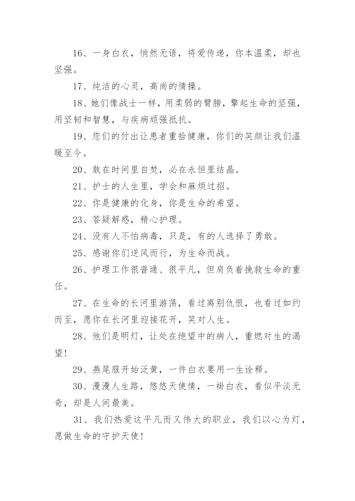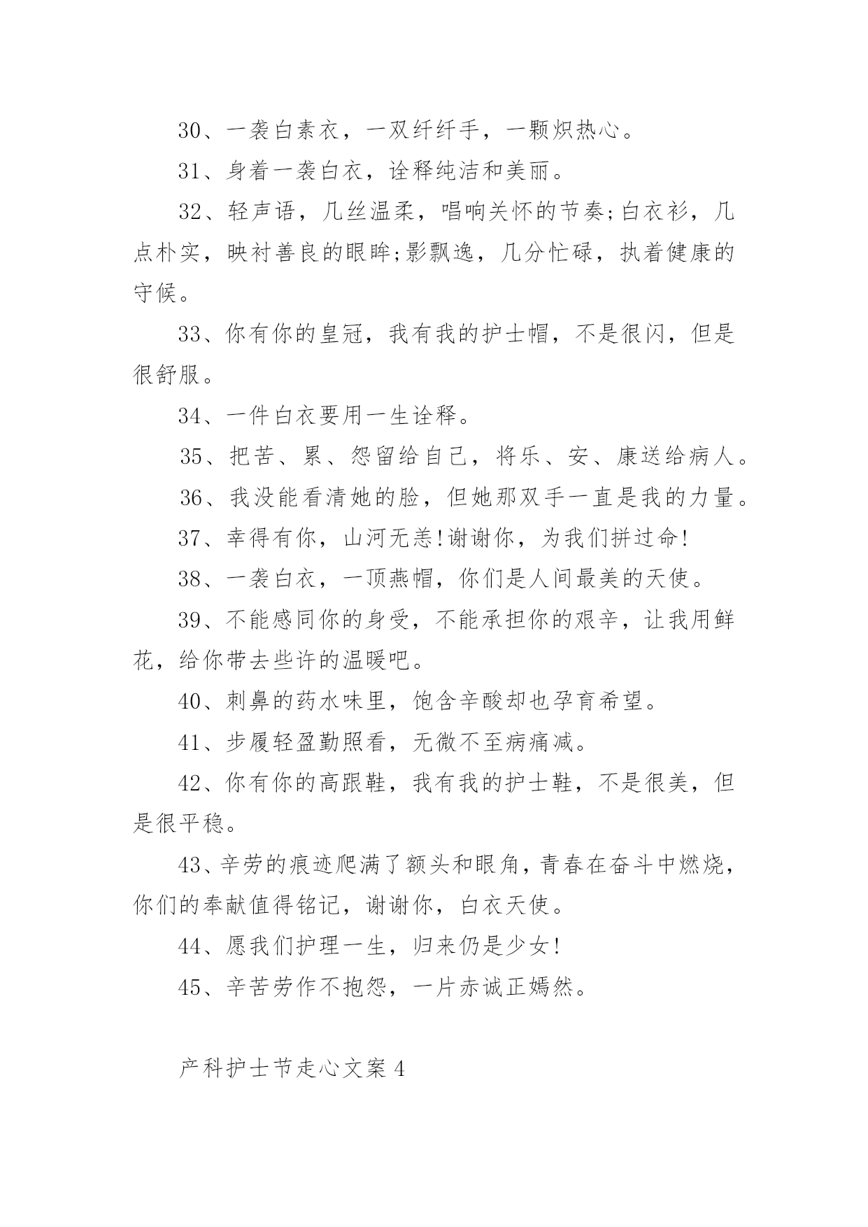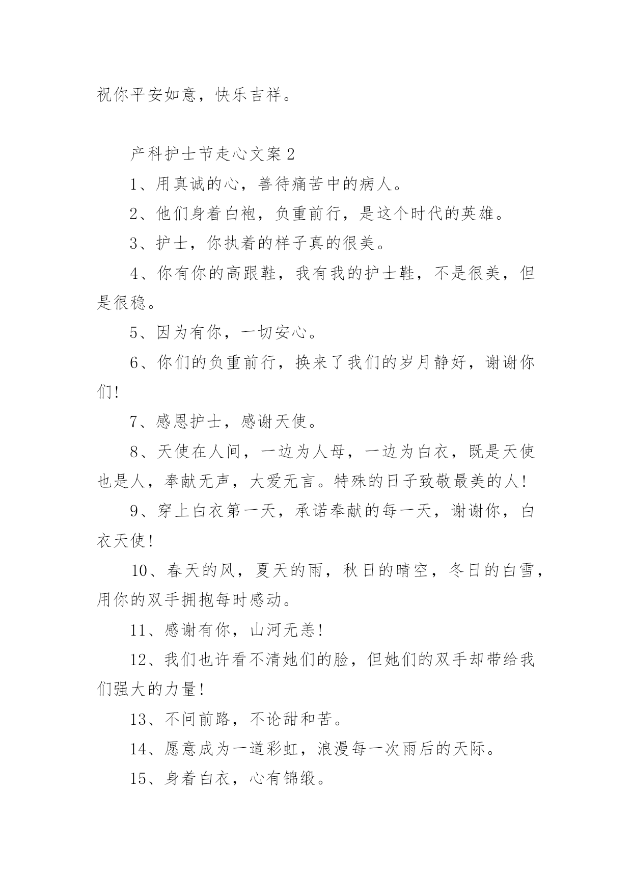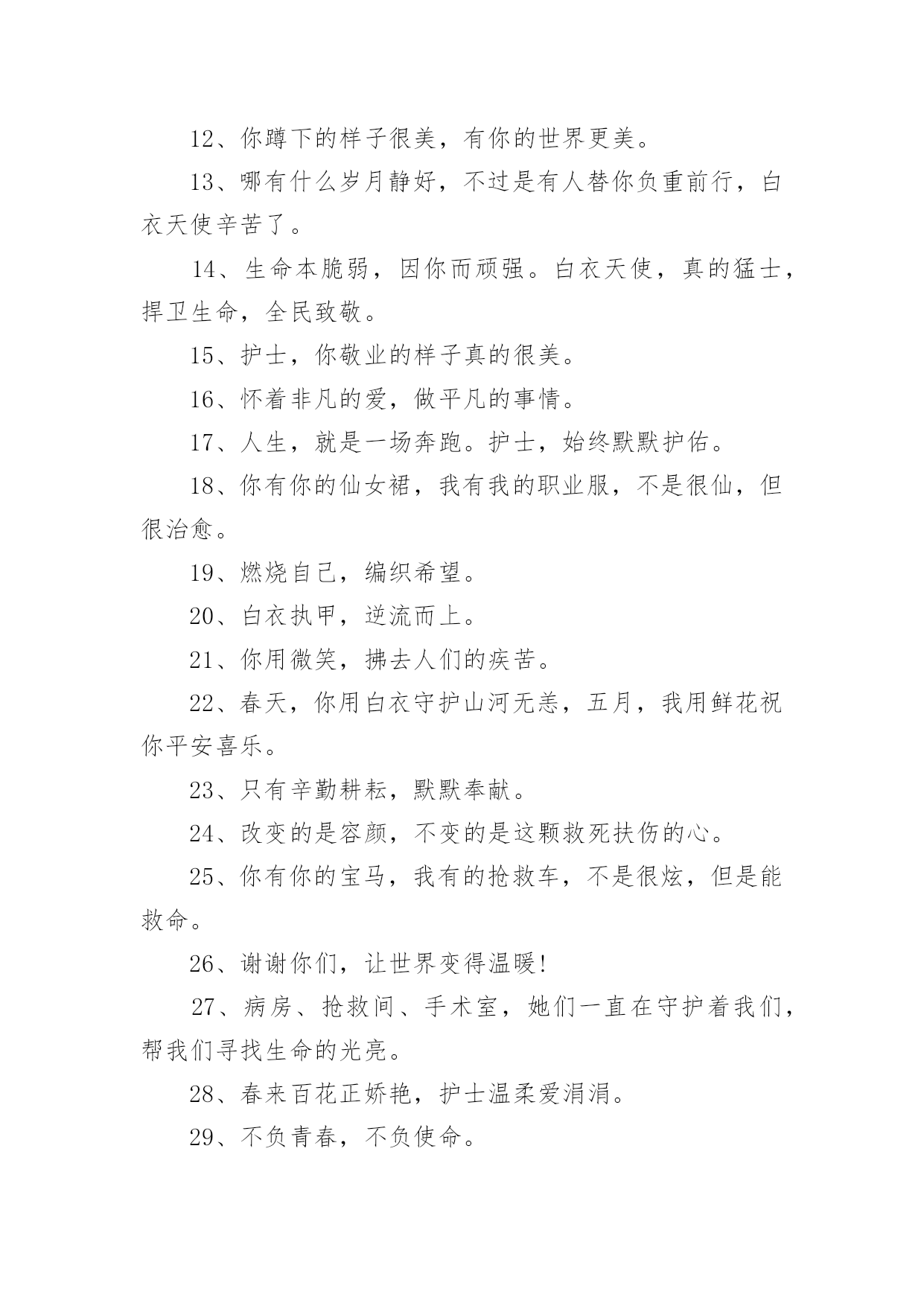 产科护士节走心文案在日常学习、工作和生活中,越来越多人喜欢发表文案,文案用于分享自己的奇闻趣事和生活日常。你知道什么样的文案才有创意吗?以下是小编帮大家整理的产科护士节走心文案,仅供参考,欢迎大家阅读。产科护士节走心文案11、国际护士节之际衷心祝原線和您们的家人身体健康!做白衣天使,不做刀斧手,您做得到。2、洁白,是你的衣案微笑,是你的形象无私,是你的奉献。白衣天使,你是健康的化身,你是生命的希望。护士节至,祝你吉祥。3、身体要护理,要加强营养,方可壮杜滴:心情要护理,要拒绝忧仿,方可美美滴;国际护士节,祝你做好全方位护理,幸福多多滴!4、我是你贴身的健康护卫,扫走你所有的烦恼忧慈,清除你所有的污杂念,消灭你所有的電运厄运。国际护士节,祝你一生平安快乐!5、那知烂的微笑,让病痛散云消,那细心的呵护,让病魔意身无处,那圣洁的白衣,让健康常伴一起,护士节,我们一起祝福白衣天使。6、护士一到来,健康就来临。七上又八下,三下五除二。烦恼全扫光,病全赶跑。快乐从天降幸福从东来。护士节祝好心人一生平安!7、像白云一样纯洁无瑕,像百合一样充满芳香,像哈达一样圣神。向最纯洁、高雅、美丽的护士道一声,护士节快乐!8、微笑是你的名片,周到是你的诺言,分明素装丽人,俨然白衣天仙。当代的南丁格尔们:护士节到了,祝你们节日快乐!9、国际护士节到,此短信有特殊功效,可为你做全方位护理,调节情绪,消除疲劳,养眼怡心,看后微笑。愿你多瞧,祝你常笑!护士节快乐!10、你们拥有:天使般的微笑,阳光般普照。工作细心又周到,忙忙碌碌,不知疲劳。赶走疾病,带来健康和美好。像白衣天使致敬,祝护士节快乐!11、甜美笑容是名片,周到尽责是诺言,一身白衣加素颜,纯洁高雅似天仙。救死扶伤是天职,病人与你心相连,欢度神圣护士节,愿你幸福每一天!12、看到万物饥渴,上帝创造了水;看到世界黑暗,上帝创造了火;看到人间病苦,上帝派来了你。于是———上帝失去了一位天使,祝你护士节快乐!13、读书最多的是博士,牺牲最多的是死士,杀敌最多的是战士,救人最多的是护士,爱心与真情才是化解一切的力量,祝愿医务工作者们护士节快乐!14、国际护士节到了,愿你避免受到虎视,不会心惊肉跳。愿你减少受到忽视,不会心苦行劳。愿你享受爱护扶侍,心定神安,幸福如意。护士节快乐。15、在护士最神圣的节日里我美她们纯洁的心灵,高尚的情操,善良的微笑,无私的献。你们都是美丽的天使,愿你们健健康康,快快乐乐!16、一天ー苹果医生远高我,一天ー个梨护士远离你,今天是护士节,祝愿你永远身体健康,示远远离医院,远离护士,远离病魇。节日快乐!17、留长发的不ー定是术家,有可能是乞丐;会飞的不ー定是超人,有可能是李宁穿白色的不一定是天使,有可能是护士;祝你护士节快乐!18、世界上最重要的人是你们:我们的出生,我们的终结是你们伴随。你是最平凡而又最伟大的,祝你——白衣天使护士节快乐!19、给患者以信心,给家属以宽心,给工作以恒心,给同事以热心,给亲人以欢心,给朋友以真心。5.12国际护士节,愿你开心!20、心到,想到,看到,闻到,听到,人到,手到,脚到,说到,做到,得到,时间到,你的礼物没到,只有我的祝福传到21、护理病人不怕脏,士气高晶不怕苦,节日加班不怕累,快速反应不怕忙,乐观处理不怕乱。祝白衣天使护士节快乐!22、你用爱心的翅,呵护着脆弱的生命;你用耐心和细心,体现着崇高的夷任;你用你的笑脸,演绎着人间真情。护士节来临,祝你:节日快乐、心想事成!23、天使下凡成护士,镇守健康的源泉,杜绝伤病的开始,迎接幸福的开端,国际护士节来到,祝福护士体健安,一生幸福又无忧!24、你的美丽是为了人们的健康,你的快乐是为了人们的快乐,护士节,愿我们每一个人都呵护好自己的事业,保护好自己的健康。25、一身身洁白无瑕,一声声关爱问候,身心疲惫已非常,微笑服务总尽责,今天是您的节日,祝普天下的护士,护士节快乐永驻。26、给欢乐打个点滴,给舒心测下温度,给平安量次血压,给如意缠点纱布。5.12国际护士节,愿你的开心没有不适,幸福永远健康!27、你有洁白醒目的衣裳,你有可人温柔的微笑,你有无私奉献的品质,你有生活延续的希望。护士节来到,祝你吉祥平安,幸福一生!28、病魔在你的微笑里萎缩,病痛在你的圣洁中归零,病症在你的呵护下消亡,护士节,愿护士朋友,幸福安康,吉祥如意,护士节快乐!29、今天是白衣天使的节日,她们用对生命的爱,实践着南丁格尔的诺言,用温柔的话语,激励人们战胜病魔的信心,护士节祝您健康平安!30、你用微笑作剑,斩断病痛之恶魔;你用呵护作盾,抵挡伤病之袭击;你用责任说话,让健康常伴一生。护士节,祝你平安如意,快乐吉祥。产科护士节走心文案21、用真诚的心,善待痛苦中的病人。2、他们身着白袍,负重前行,是这个时代的英雄。3、护士,你执着的样