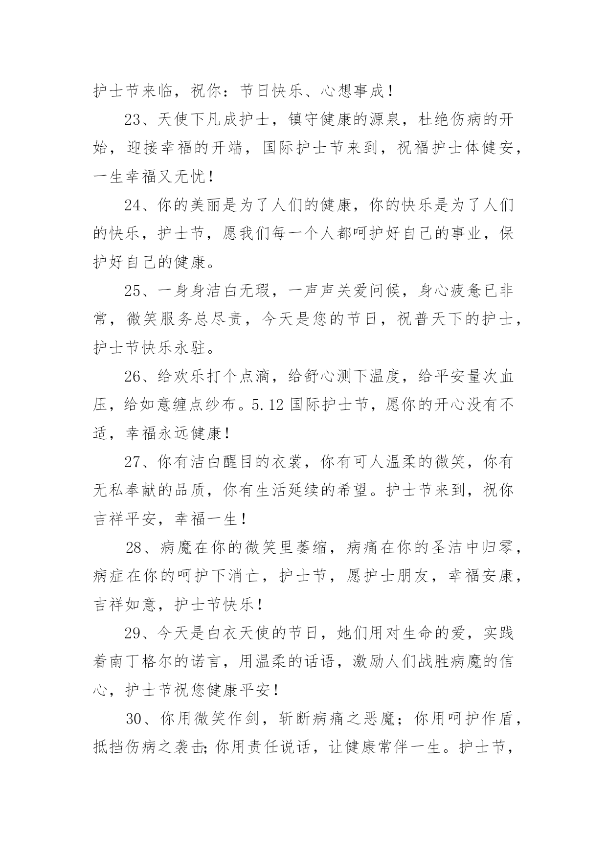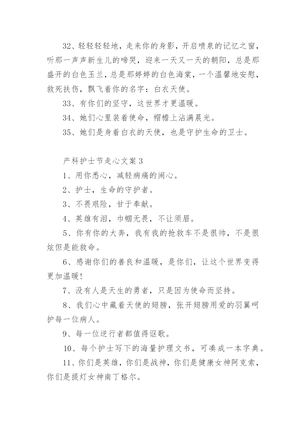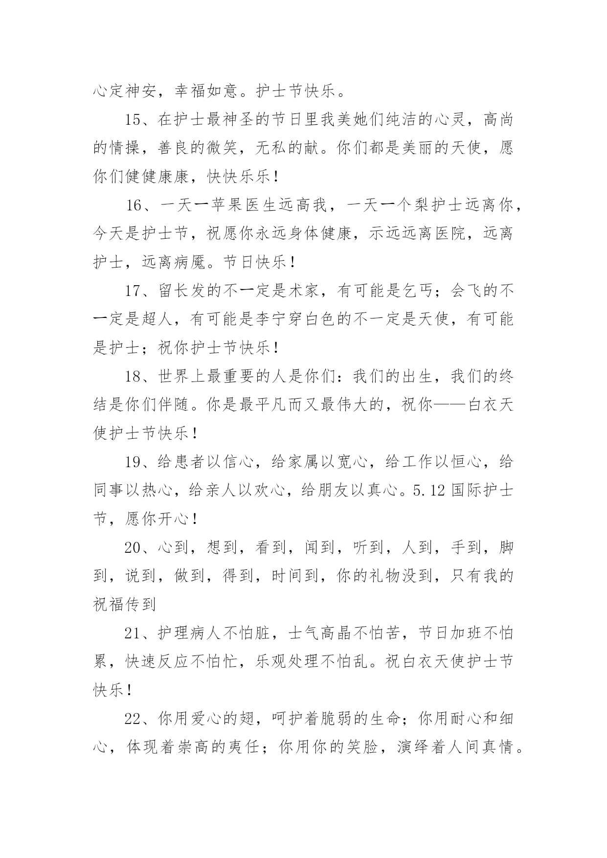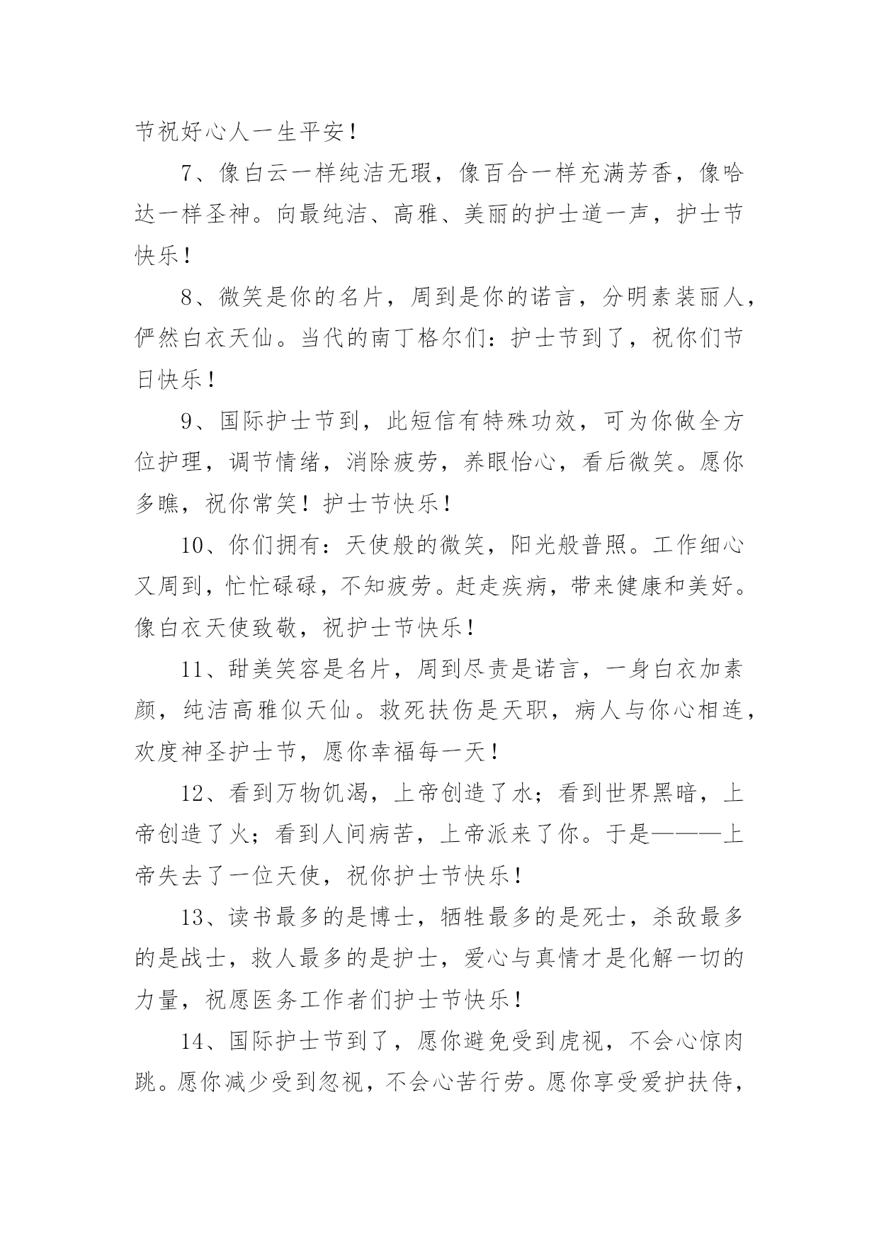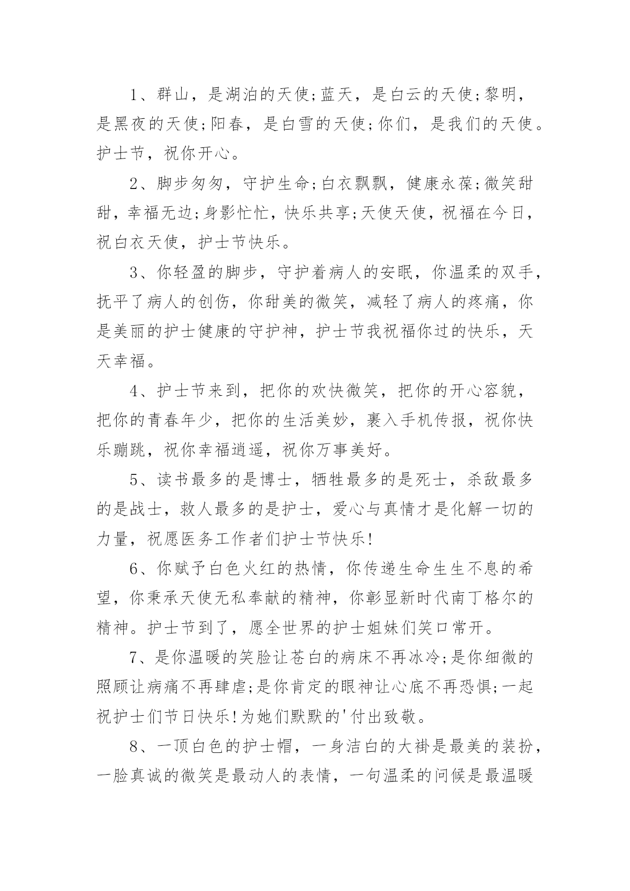 产科护士节走心文案在日常学习、工作和生活中,越来越多人喜欢发表文案,文案用于分享自己的奇闻趣事和生活日常。你知道什么样的文案才有创意吗?以下是小编帮大家整理的产科护士节走心文案,仅供参考,欢迎大家阅读。产科护士节走心文案11、国际护士节之际衷心祝原線和您们的家人身体健康!做白衣天使,不做刀斧手,您做得到。2、洁白,是你的衣案微笑,是你的形象无私,是你的奉献。白衣天使,你是健康的化身,你是生命的希望。护士节至,祝你吉祥。3、身体要护理,要加强营养,方可壮杜滴:心情要护理,要拒绝忧仿,方可美美滴;国际护士节,祝你做好全方位护理,幸福多多滴!4、我是你贴身的健康护卫,扫走你所有的烦恼忧慈,清除你所有的污杂念,消灭你所有的電运厄运。国际护士节,祝你一生平安快乐!5、那知烂的微笑,让病痛散云消,那细心的呵护,让病魔意身无处,那圣洁的白衣,让健康常伴一起,护士节,我们一起祝福白衣天使。6、护士一到来,健康就来临。七上又八下,三下五除二。烦恼全扫光,病全赶跑。快乐从天降幸福从东来。护士节祝好心人一生平安!7、像白云一样纯洁无瑕,像百合一样充满芳香,像哈达一样圣神。向最纯洁、高雅、美丽的护士道一声,护士节快乐!8、微笑是你的名片,周到是你的诺言,分明素装丽人,俨然白衣天仙。当代的南丁格尔们:护士节到了,祝你们节日快乐!9、国际护士节到,此短信有特殊功效,可为你做全方位护理,调节情绪,消除疲劳,养眼怡心,看后微笑。愿你多瞧,祝你常笑!护士节快乐!10、你们拥有:天使般的微笑,阳光般普照。工作细心又周到,忙忙碌碌,不知疲劳。赶走疾病,带来健康和美好。像白衣天使致敬,祝护士节快乐!11、甜美笑容是名片,周到尽责是诺言,一身白衣加素颜,纯洁高雅似天仙。救死扶伤是天职,病人与你心相连,欢度神圣护士节,愿你幸福每一天!12、看到万物饥渴,上帝创造了水;看到世界黑暗,上帝创造了火;看到人间病苦,上帝派来了你。于是———上帝失去了一位天使,祝你护士节快乐!13、读书最多的是博士,牺牲最多的是死士,杀敌最多的是战士,救人最多的是护士,爱心与真情才是化解一切的力量,祝愿医务工作者们护士节快乐!14、国际护士节到了,愿你避免受到虎视,不会心惊肉跳。愿你减少受到忽视,不会心苦行劳。愿你享受爱护扶侍,心定神安,幸福如意。护士节快乐。15、在护士最神圣的节日里我美她们纯洁的心灵,高尚的情操,善良的微笑,无私的献。你们都是美丽的天使,愿你们健健康康,快快乐乐!16、一天ー苹果医生远高我,一天ー个梨护士远离你,今天是护士节,祝愿你永远身体健康,示远远离医院,远离护士,远离病魇。节日快乐!17、留长发的不ー定是术家,有可能是乞丐;会飞的不ー定是超人,有可能是李宁穿白色的不一定是天使,有可能是护士;祝你护士节快乐!18、世界上最重要的人是你们:我们的出生,我们的终结是你们伴随。你是最平凡而又最伟大的,祝你——白衣天使护士节快乐!19、给患者以信心,给家属以宽心,给工作以恒心,给同事以热心,给亲人以欢心,给朋友以真心。5.12国际护士节,愿你开心!20、心到,想到,看到,闻到,听到,人到,手到,脚到,说到,做到,得到,时间到,你的礼物没到,只有我的祝福传到21、护理病人不怕脏,士气高晶不怕苦,节日加班不怕累,快速反应不怕忙,乐观处理不怕乱。祝白衣天使护士节快乐!22、你用爱心的翅,呵护着脆弱的生命;你用耐心和细心,体现着崇高的夷任;你用你的笑脸,演绎着人间真情。护士节来临,祝你:节日快乐、心想事成!23、天使下凡成护士,镇守健康的源泉,杜绝伤病的开始,迎接幸福的开端,国际护士节来到,祝福护士体健安,一生幸福又无忧!24、你的美丽是为了人们的健康,你的快乐是为了人们的快乐,护士节,愿我们每一个人都呵护好自己的事业,保护好自己的健康。25、一身身洁白无瑕,一声声关爱问候,身心疲惫已非常,微笑服务总尽责,今天是您的节日,祝普天下的护士,护士节快乐永驻。26、给欢乐打个点滴,给舒心测下温度,给平安量次血压,给如意缠点纱布。5.12国际护士节,愿你的开心没有不适,幸福永远健康!27、你有洁白醒目的衣裳,你有可人温柔的微笑,你有无私奉献的品质,你有生活延续的希望。护士节来到,祝你吉祥平安,幸福一生!28、病魔在你的微笑里萎缩,病痛在你的圣洁中归零,病症在你的呵护下消亡,护士节,愿护士朋友,幸福安康,吉祥如意,护士节快乐!29、今天是白衣天使的节日,她们用对生命的爱,实践着南丁格尔的诺言,用温柔的话语,激励人们战胜病魔的信心,护士节祝您健康平安!30、你用微笑作剑,斩断病痛之恶魔;你用呵护作盾,抵挡伤病之袭击;你用责任说话,让健康常伴一生。护士节,祝你平安如意,快乐吉祥。产科护士节走心文案21、用真诚的心,善待痛苦中的病人。2、他们身着白袍,负重前行,是这个时代的英雄。3、护士,你执着的样