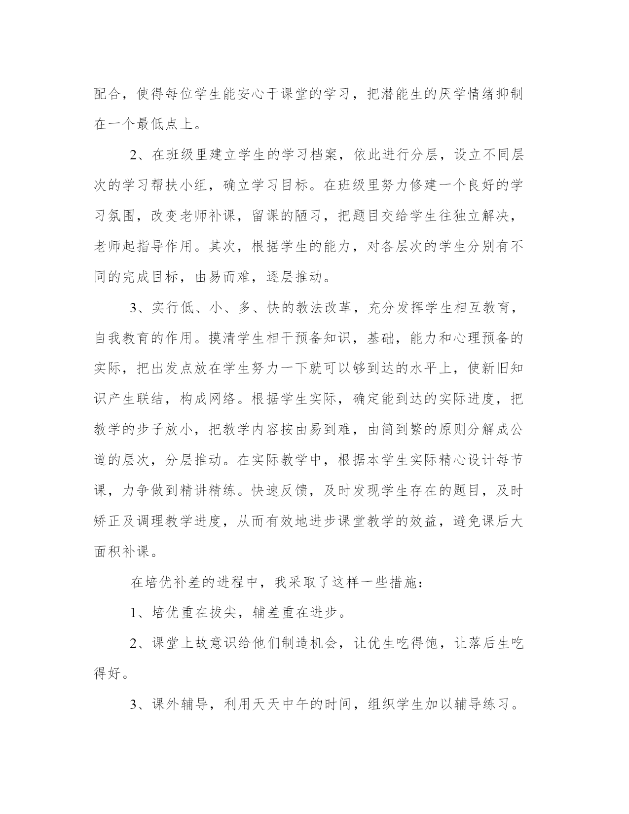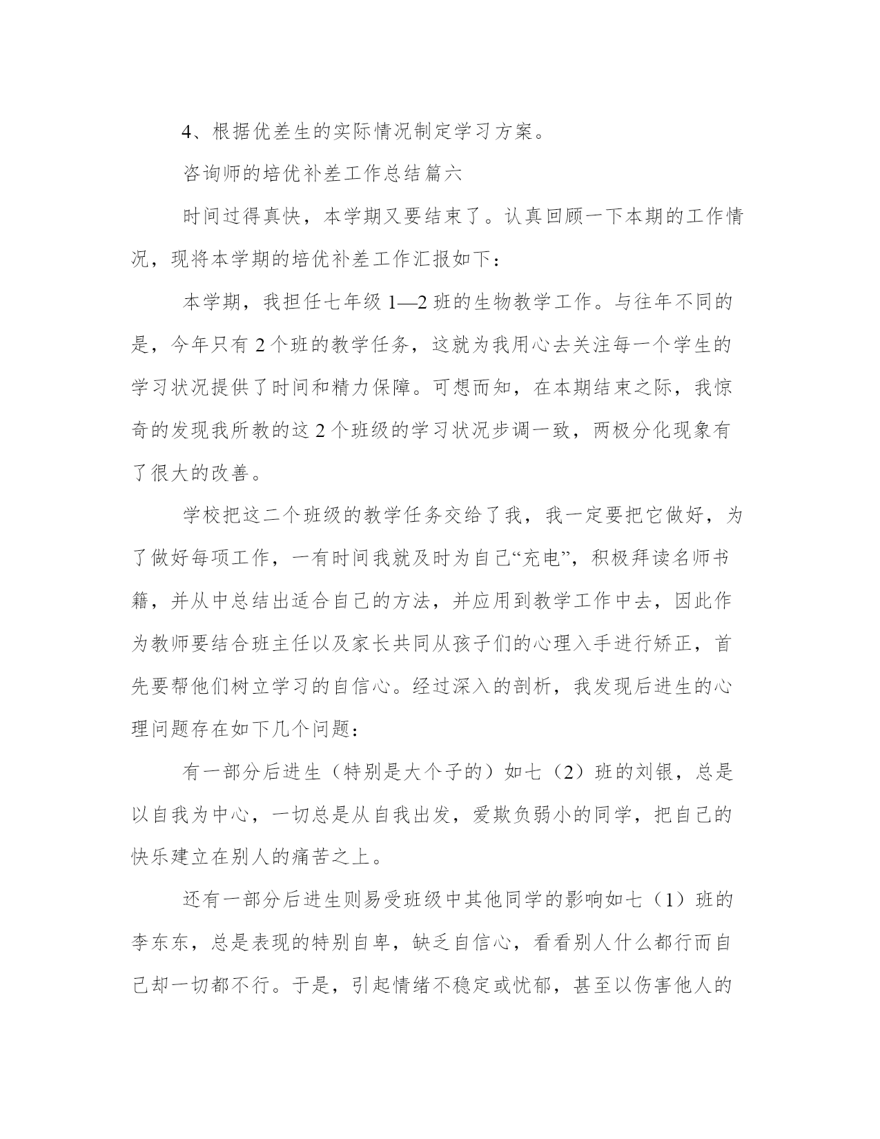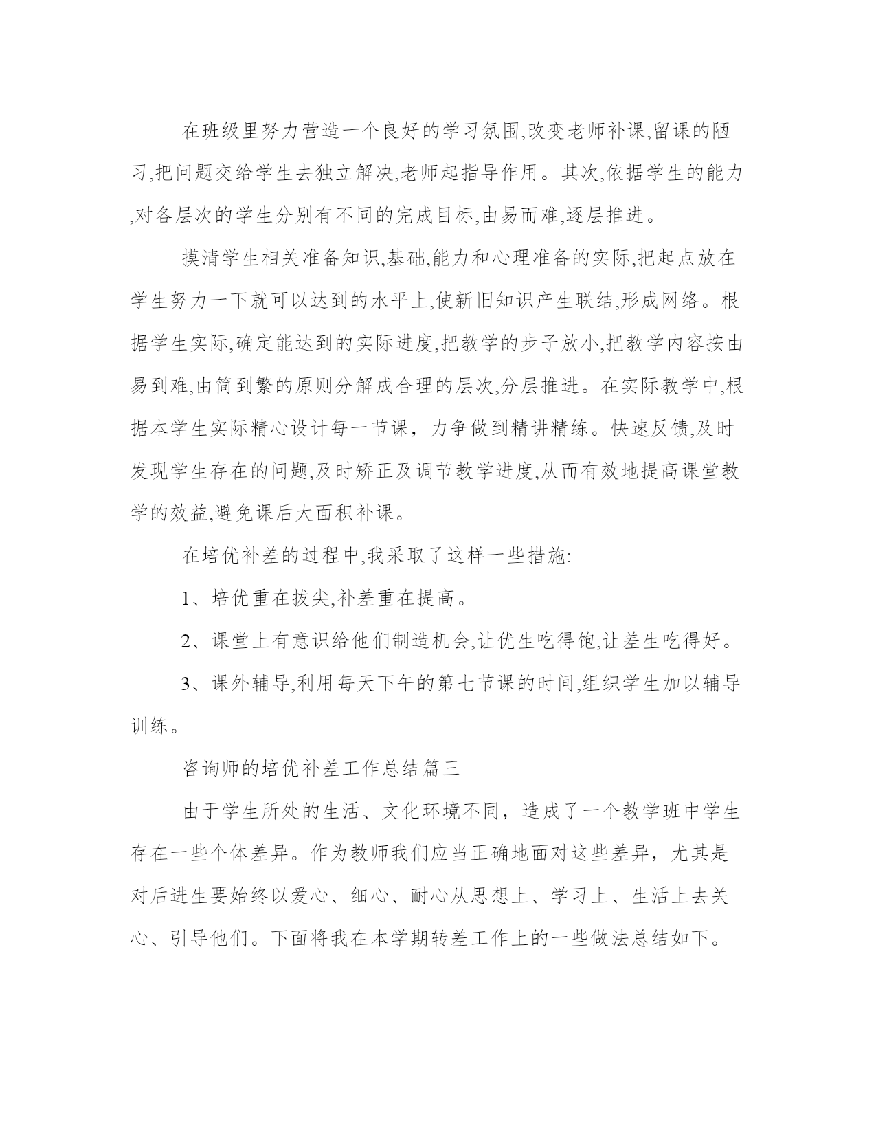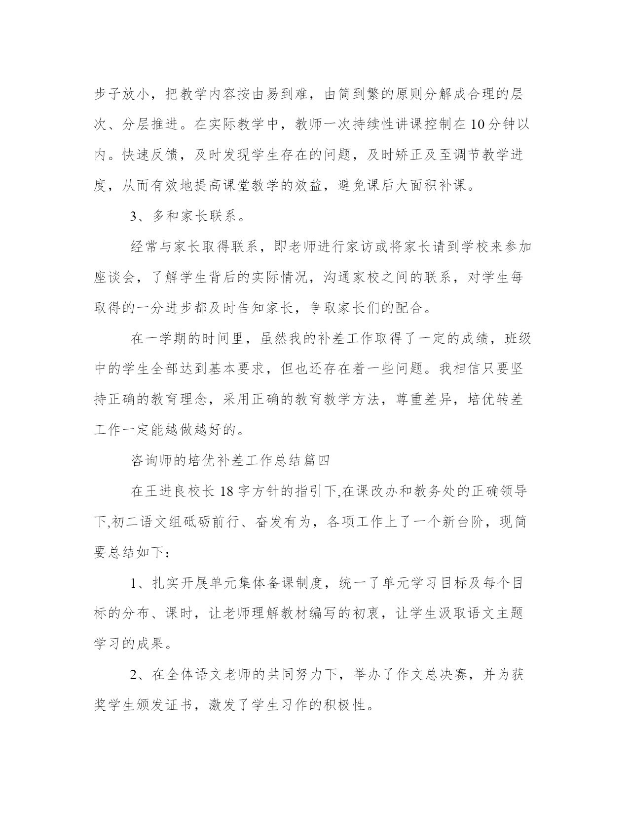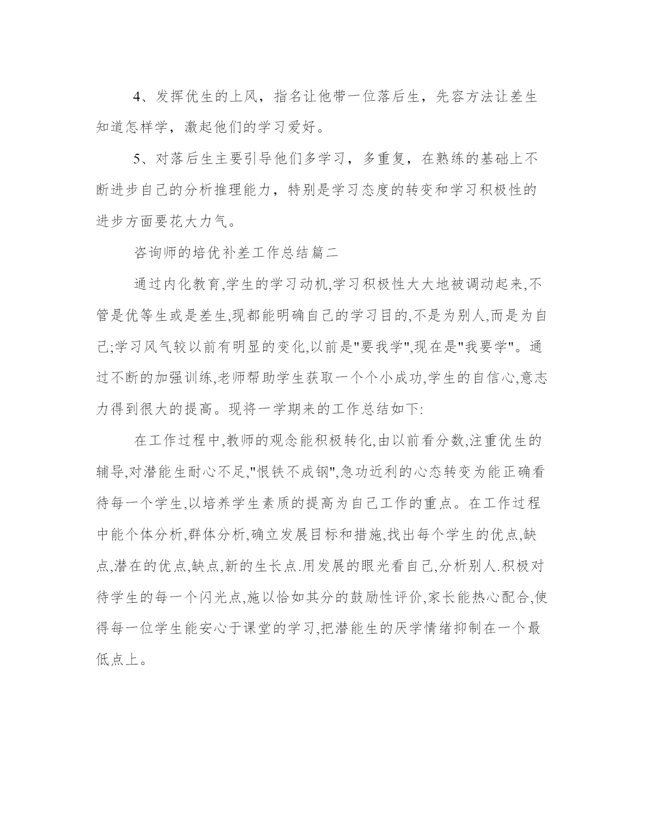咨询师的培优补差工作总结(优质21篇)写总结可以帮助我们回顾和反思自己的学习、工作、生活等方面的表现。写总结之前可以先梳理思路,列出重要的内容和要点,做好提纲。接下来,我们将分享一些优秀的总结样例,希望能给大家带来一些灵感。咨询师的培优补差工作总结篇一一学期以来,我在培优辅差工作进程中,能根据实际情况,有步骤、有措施地实施落实培优补差的内容,使学生能较好的得到发展。通过内化教育,学生的学习动机,学习积极性大大地被调动起来,不论是优等生或是落后生,现都能明确的学习目的,不是为他人,而是为自己;学习风气较之前有明显的变化,之前是要我学,现在是我要学。通过不断的加强练习,老师帮助学生获得一个个小成功,学生的自信心,意志力得到很大的。1、教学观念的积极转化,家长的热情配合。在工作进程中,教师的观念能积极转化,由之前看分数,重视优生的辅导,对潜能生耐心不足,恨铁不成钢,急功近利的心态转变成能正确看待每个学生,以培养学生素质的进步为自己工作的重点。在工作进程中能个体分析,群体分析,确立发展目标和措施,找出每个学生的优点,缺点,潜伏的优点,缺点,新的生长点。用发展的眼光看自己,分析他人。积极对待学生的每个闪光点,施以恰如其分的鼓励性评价,家长能热情配合,使得每位学生能安心于课堂的学习,把潜能生的厌学情绪抑制在一个最低点上。2、在班级里建立学生的学习档案,依此进行分层,设立不同层次的学习帮扶小组,确立学习目标。在班级里努力修建一个良好的学习氛围,改变老师补课,留课的陋习,把题目交给学生往独立解决,老师起指导作用。其次,根据学生的能力,对各层次的学生分别有不同的完成目标,由易而难,逐层推动。3、实行低、小、多、快的教法改革,充分发挥学生相互教育,自我教育的作用。摸清学生相干预备知识,基础,能力和心理预备的实际,把出发点放在学生努力一下就可以够到达的水平上,使新旧知识产生联结,构成网络。根据学生实际,确定能到达的实际进度,把教学的步子放小,把教学内容按由易到难,由简到繁的原则分解成公道的层次,分层推动。在实际教学中,根据本学生实际精心设计每节课,力争做到精讲精练。快速反馈,及时发现学生存在的题目,及时矫正及调理教学进度,从而有效地进步课堂教学的效益,避免课后大面积补课。在培优补差的进程中,我采取了这样一些措施:1、培优重在拔尖,辅差重在进步。2、课堂上故意识给他们制造机会,让优生吃得饱,让落后生吃得好。3、课外辅导,利用天天中午的时间,组织学生加以辅导练习。4、发挥优生的上风,指名让他带一位落后生,先容方法让差生知道怎样学,激起他们的学习爱好。5、对落后生主要引导他们多学习,多重复,在熟练的基础上不断进步自己的分析推理能力,特别是学习态度的转变和学习积极性的进步方面要花大力气。咨询师的培优补差工作总结篇二通过内化教育,学生的学习动机,学习积极性大大地被调动起来,不管是优等生或是差生,现都能明确自己的学习目的,不是为别人,而是为自己;学习风气较以前有明显的变化,以前是"要我学",现在是"我要学"。通过不断的加强训练,老师帮助学生获取一个个小成功,学生的自信心,意志力得到很大的提高。现将一学期来的工作总结如下:在工作过程中,教师的观念能积极转化,由以前看分数,注重优生的辅导,对潜能生耐心不足,"恨铁不成钢",急功近利的心态转变为能正确看待每一个学生,以培养学生素质的提高为自己工作的重点。在工作过程中能个体分析,群体分析,确立发展目标和措施,找出每个学生的优点,缺点,潜在的优点,缺点,新的生长点.用发展的眼光看自己,分析别人.积极对待学生的每一个闪光点,施以恰如其分的鼓励性评价,家长能热心配合,使得每一位学生能安心于课堂的学习,把潜能生的厌学情绪抑制在一个最低点上。在班级里努力营造一个良好的学习氛围,改变老师补课,留课的陋习,把问题交给学生去独立解决,老师起指导作用。其次,依据学生的能力,对各层次的学生分别有不同的完成目标,由易而难,逐层推进。摸清学生相关准备知识,基础,能力和心理准备的实际,把起点放在学生努力一下就可以达到的水平上,使新旧知识产生联结,形成网络。根据学生实际,确定能达到的实际进度,把教学的步子放小,把教学内容按由易到难,由简到繁的原则分解成合理的层次,分层推进。在实际教学中,根据本学生实际精心设计每一节课,力争做到精讲精练。快速反馈,及时发现学生存在的问题,及时矫正及调节教学进度,从而有效地提高课堂教学的效益,避免课后大面积补课。在培优补差的过程中,我采取了这样一些措施:1、培优重在拔尖,补差重在提高。2、课堂上有意识给他们制造机会,让优生吃得饱,让差生吃得好。3、课外辅导,利用每天下午的第七节课的时间,组织学生加以辅导训练。咨询师的培优补差工作总结篇三由于学生所处的生活、文化环境不同,