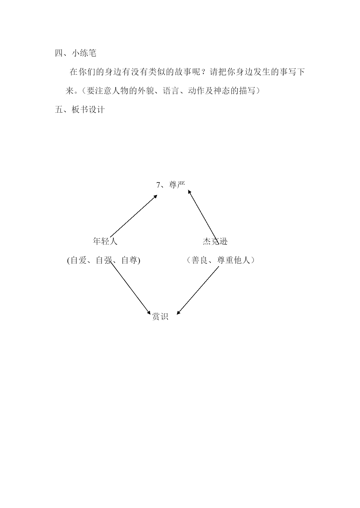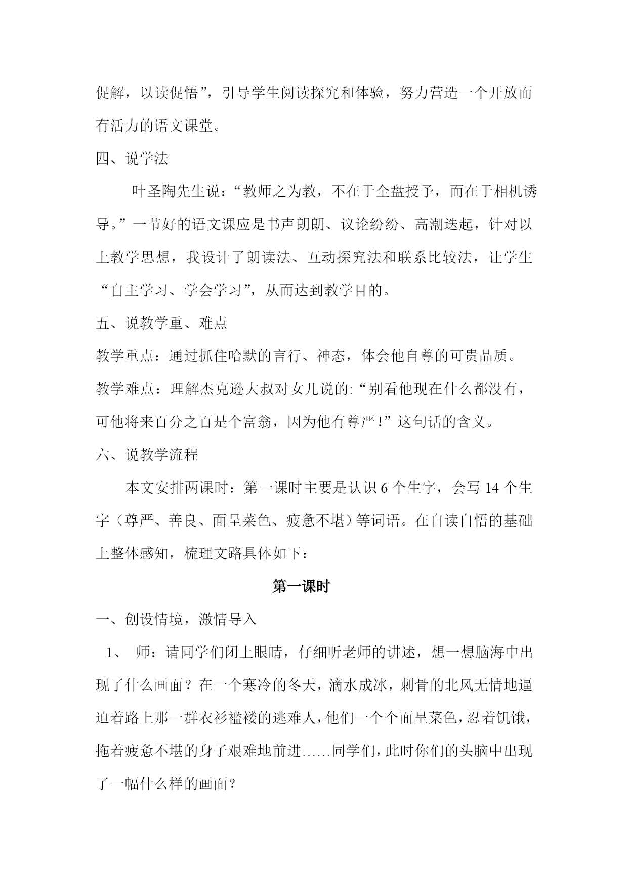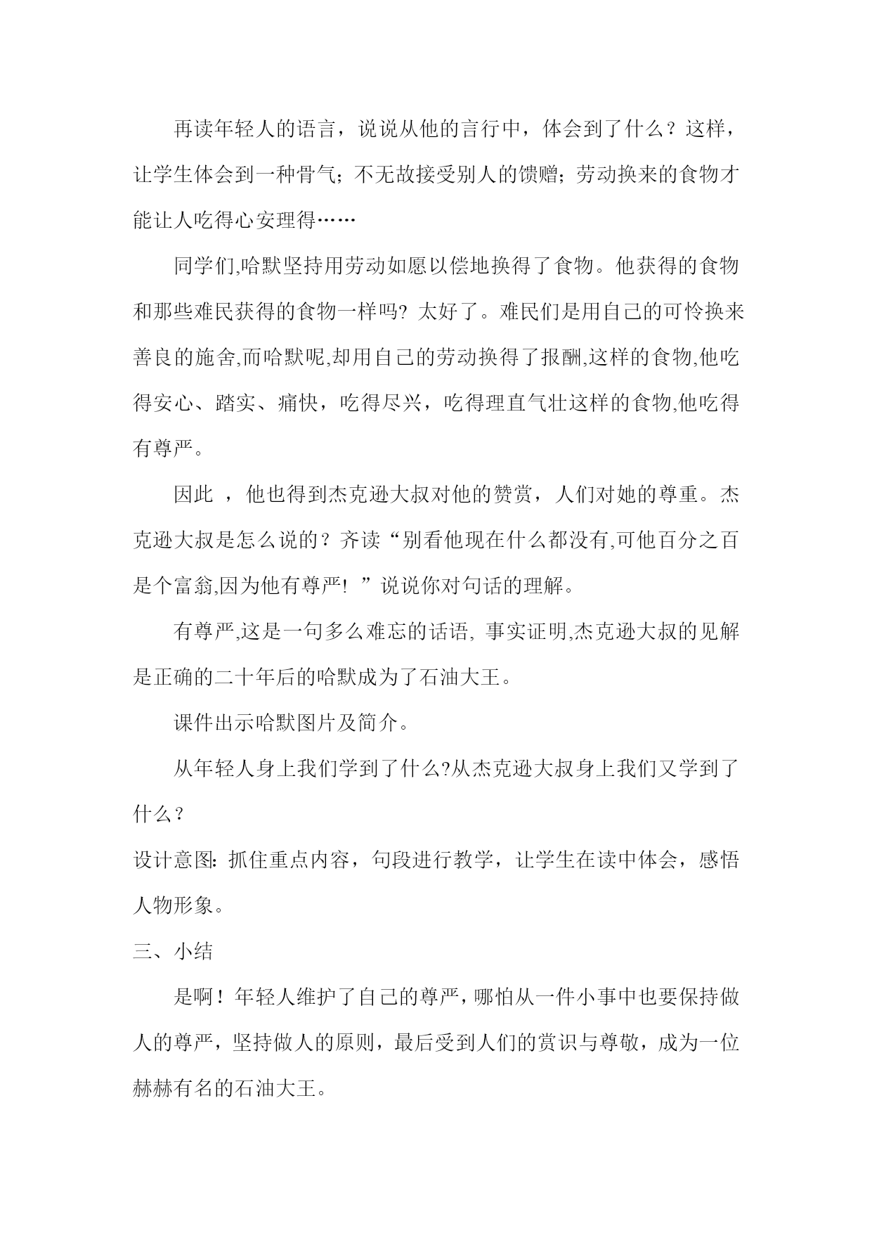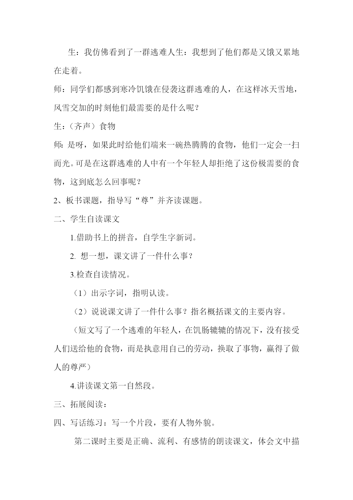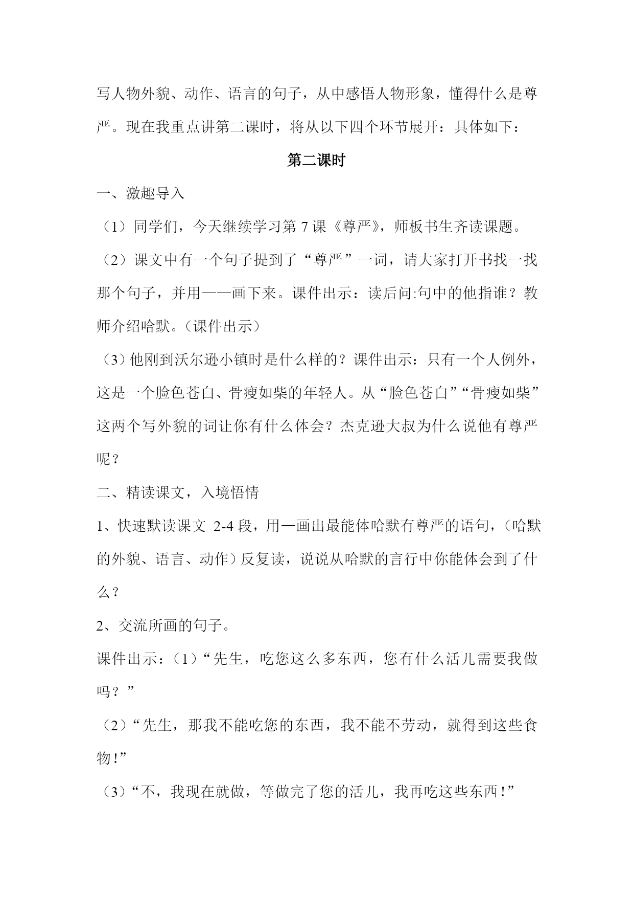 《尊严》说课稿及教学设计一、说教材《尊严》是人教版小学四年级下册第二组“以诚待人”主题中的一篇精读课文。这篇课文写的是美国石油大王哈默年轻时的一个故事。在一个寒冷的冬天,在逃难的路上,他饥寒难忍,但是他拒绝了送到面前的食物,理由是他不能白吃人家的东西,只能在帮忙干完活以后,他才吃这份食物。后来,他留在杰克逊家里干活,成为庄园里的一把好手。这个故事告诉人们:人可以没有财富,但必须要有做人的尊严,这是一个人最大的财富;只要有了做人的尊严,就有可能拥有财富乃至一切。二、说目标:1、认识6个生字,会写14个生字(尊严、善良、面呈菜色、疲惫不堪)等词语;2、正确、流利、有感情地朗读课文。引导学生抓住人物的神态、动作、语言体现人物的品质。3、让学生体会哈默美好的形象和人格魅力。从中感受“自尊者自立”的道理。三、说教法新课程要求:“语文教师应在师生平等对话的过程中进行;倡导自主学习,让学生成为学习的主人。”为了充分调动学生的学习积极性和主动性,根据学生的阅读特点,教学时我主要采用导读法、讨论法和点拨法进行教学,利用现代化教学手段,通过“以读促知,以读促解,以读促悟”,引导学生阅读探究和体验,努力营造一个开放而有活力的语文课堂。四、说学法叶圣陶先生说:“教师之为教,不在于全盘授予,而在于相机诱导。”一节好的语文课应是书声朗朗、议论纷纷、高潮迭起,针对以上教学思想,我设计了朗读法、互动探究法和联系比较法,让学生“自主学习、学会学习”,从而达到教学目的。五、说教学重、难点教学重点:通过抓住哈默的言行、神态,体会他自尊的可贵品质。教学难点:理解杰克逊大叔对女儿说的:“别看他现在什么都没有,可他将来百分之百是个富翁,因为他有尊严!”这句话的含义。六、说教学流程本文安排两课时:第一课时主要是认识6个生字,会写14个生字(尊严、善良、面呈菜色、疲惫不堪)等词语。在自读自悟的基础上整体感知,梳理文路具体如下:第一课时一、创设情境,激情导入1、师:请同学们闭上眼睛,仔细听老师的讲述,想一想脑海中出现了什么画面?在一个寒冷的冬天,滴水成冰,刺骨的北风无情地逼迫着路上那一群衣衫褴褛的逃难人,他们一个个面呈菜色,忍着饥饿,拖着疲惫不堪的身子艰难地前进……同学们,此时你们的头脑中出现了一幅什么样的画面?生:我仿佛看到了一群逃难人生:我想到了他们都是又饿又累地在走着。师:同学们都感到寒冷饥饿在侵袭这群逃难的人,在这样冰天雪地,风雪交加的时刻他们最需要的是什么呢?生:(齐声)食物师:是呀,如果此时给他们端来一碗热腾腾的食物,他们一定会一扫而光。可是在这群逃难的人中有一个年轻人却拒绝了这份极需要的食物,这到底怎么回事呢?2、板书课题,指导写“尊”并齐读课题。二、学生自读课文1.借助书上的拼音,自学生字新词。2.想一想,课文讲了一件什么事?3.检查自读情况。(1)出示字词,指明认读。(2)说说课文讲了一件什么事?指名概括课文的主要内容。(短文写了一个逃难的年轻人,在饥肠辘辘的情况下,没有接受人们送给他的食物,而是执意用自己的劳动,换取了事物,赢得了做人的尊严)4.讲读课文第一自然段。三、拓展阅读:四、写话练习:写一个片段,要有人物外貌。第二课时主要是正确、流利、有感情的朗读课文,体会文中描写人物外貌、动作、语言的句子,从中感悟人物形象,懂得什么是尊严。现在我重点讲第二课时,将从以下四个环节展开:具体如下:第二课时一、激趣导入(1)同学们,今天继续学习第7课《尊严》,师板书生齐读课题。(2)课文中有一个句子提到了“尊严”一词,请大家打开书找一找那个句子,并用——画下来。课件出示:读后问:句中的他指谁?教师介绍哈默。(课件出示)(3)他刚到沃尔逊小镇时是什么样的?课件出示:只有一个人例外,这是一个脸色苍白、骨瘦如柴的年轻人。从“脸色苍白”“骨瘦如柴”这两个写外貌的词让你有什么体会?杰克逊大叔为什么说他有尊严呢?二、精读课文,入境悟情1、快速默读课文2-4段,用—画出最能体哈默有尊严的语句,(哈默的外貌、语言、动作)反复读,说说从哈默的言行中你能体会到了什么?2、交流所画的句子。课件出示:(1)“先生,吃您这么多东西,您有什么活儿需要我做吗?”(2)“先生,那我不能吃您的东西,我不能不劳动,就得到这些食物!”(3)“不,我现在就做,等做完了您的活儿,我再吃这些东西!”再读年轻人的语言,说说从他的言行中,体会到了什么?这样,让学生体会到一种骨气;不无故接受别人的馈赠;劳动换来的食物才能让人吃得心安理得……同学们,哈默坚持用劳动如愿以偿地换得了食物。他获得的食物和那些难民获得的食物一样吗?太好了。难民们是用自己的可怜换来善良的施舍,而哈默呢,却用自己的劳动换得了报酬,这样的食物,他吃得安心、踏实、痛