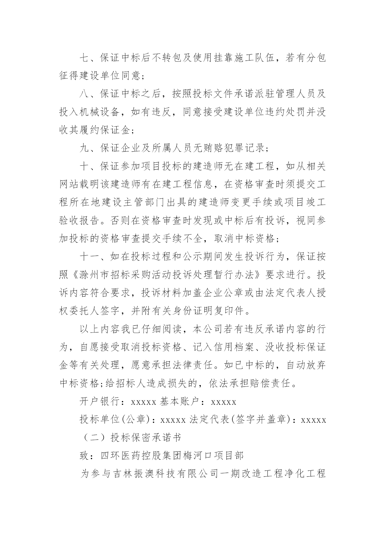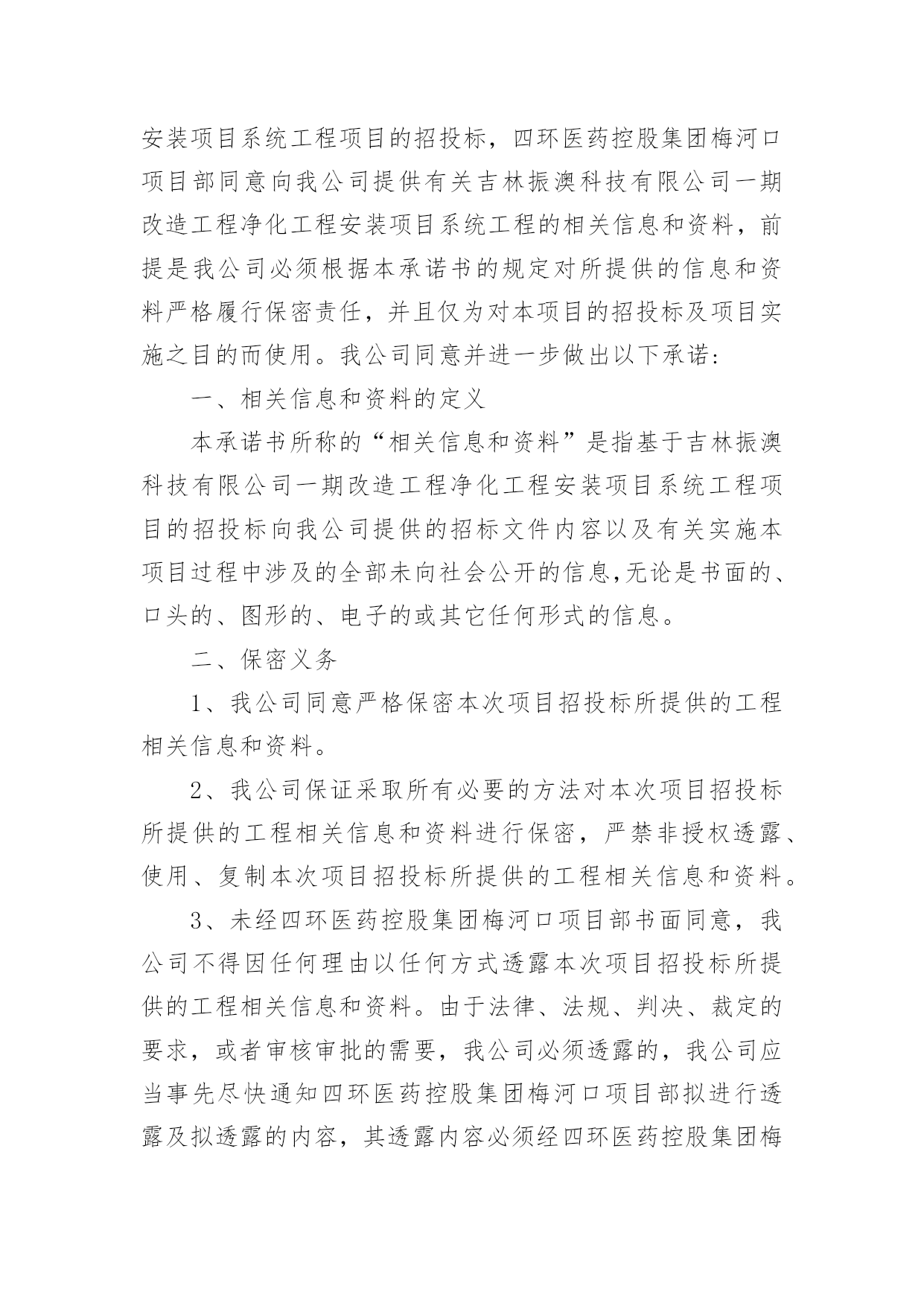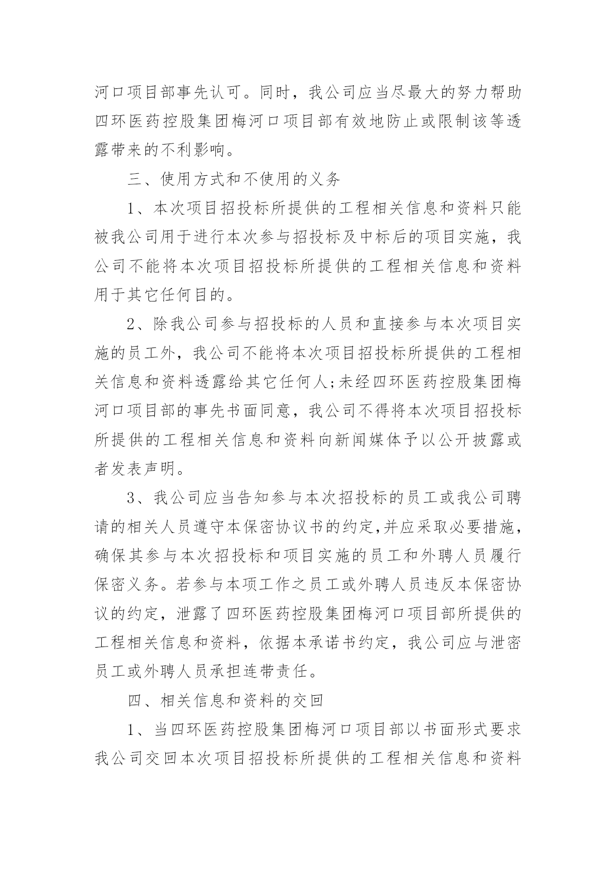 投标保密承诺书投标保密承诺书(15篇)在生活中,我们使用上承诺书的情况与日俱增,承诺书在写作上具有一定的格式要求。相信许多人会觉得承诺书很难写吧,以下是小编整理的投标保密承诺书,欢迎阅读与收藏。投标保密承诺书1沈阳市苏家屯区人民政府陈相街道办事处(招标人全称):我方沈阳丰联市政工程有限公司(投标人)拟参加中粮集团30万吨大米深加工项目基础设施配套工程(项目名称)一(标段编号)标段投标。现就有关保密事宜承诺如下:1.我方在投标活动过程中将严格遵守《中华人民共和国保密法》及其它相关法律法规,否则自行承担相应的法律责任。2.如中标,我方将与发包人签订保密协议,认真履行保密协议义务,承担保密责任。3.如中标,我方在签订合同、执行合同过程中将严格遵守《中华人民共和国保密法》及其它相关法律法规,同时认真履行合同中承包人的`保密义务,否则自行承担相应的法律责任。4.如中标,我方将遵守合同约定的有关专利技术保密及使用要求。投标人:(盖单位章)法定代表人或授权代理人:(签字)日期:20xx年xx月xx日投标保密承诺书2致:________项目部为参与________公司一期改造工程净化工程安装项目系统工程项目的招投标,________项目部同意向我公司带给有关吉林振澳科技有限公司一期改造工程净化工程安装项目系统工程的相关信息和资料,前提是我公司务必根据本承诺书的规定对所带给的信息和资料严格履行保密职责,并且仅为对本项目的招投标及项目实施之目的而使用。我公司同意并进一步做出以下承诺:一、相关信息和资料的定义本承诺书所称的“相关信息和资料”是指基于吉林振澳科技有限公司一期改造工程净化工程安装项目系统工程项目的招投标向我公司带给的招标文件资料以及有关实施本项目过程中涉及的全部未向社会公开的信息,无论是书面的、口头的、图形的、电子的或其它任何形式的信息。二、保密义务1、我公司同意严格保密本次项目招投标所带给的工程相关信息和资料。2、我公司保证采取所有必要的方法对本次项目招投标所带给的工程相关信息和资料进行保密,严禁非授权透露、使用、复制本次项目招投标所带给的工程相关信息和资料。3、未经________项目部书面同意,我公司不得因任何理由以任何方式透露本次项目招投标所带给的工程相关信息和资料。由于法律、法规、判决、裁定的要求,或者审核审批的需要,我公司务必透露的,我公司应当事先尽快通知________项目部拟进行透露及拟透露的资料,其透露资料务必经________项目部事先认可。同时,我公司应当尽最大的努力帮忙________项目部有效地防止或限制该等透露带来的不利影响。三、使用方式和不使用的义务1、本次项目招投标所带给的`工程相关信息和资料只能被我公司用于进行本次参与招投标及中标后的项目实施,我公司不能将本次项目招投标所带给的工程相关信息和资料用于其它任何目的。2、除我公司参与招投标的人员和直接参与本次项目实施的员工外,我公司不能将本次项目招投标所带给的工程相关信息和资料透露给其它任何人;未经________项目部的事先书面同意,我公司不得将本次项目招投标所带给的工程相关信息和资料向新闻媒体予以公开披露或者发表声明。3、我公司应当告知参与本次招投标的员工或我公司聘请的相关人员遵守本保密协议书的约定,并应采取必要措施,确保其参与本次招投标和项目实施的员工和外聘人员履行保密义务。若参与本项工作之员工或外聘人员违反本保密协议的约定,泄露了________项目部所带给的工程相关信息和资料,依据本承诺书约定,我公司应与泄密员工或外聘人员承担连带职责。四、相关信息和资料的交回1、当________项目部以书面形式要求我公司交回本次项目招投标所带给的工程相关信息和资料时,我公司应立即交回所有书面的或其他有形的相关信息和资料以及所有描述和概括该相关信息和资料的文件。我公司在交回以上有关资料前未经________项目部的允许不得采取抄写、复印、拷贝等任何方式留存相关信息和资料。2、没有________项目部的书面许可,我公司不得丢弃和处理任何书面的或其他有形的相关信息和资料。五、违约职责1、我公司如违约泄露本次项目招投标所带给的工程相关信息和资料,应当按照________项目部的指示采取一切必要措施对违约行为予以补救,包括采取有效方法对该专有信息进行保密,所需费用由我公司承担。2、我公司应当赔偿________项目部因我公司违约而造成的所有损失。六、保密期限1、自本承诺书生效之日起,双方的合作交流都要贴合本承诺书的约定。2、除非________项目部透过书面通知明确说明本承诺书所涉及的某项信息和资料能够不用保密,我公司务必按照本承诺书所承担的保密义务在所理解的信息和资料被社会公知前对所收到的相关信息和资料进行保密,保密期限不受本承诺书有效期限的限制。七、其他1、本承