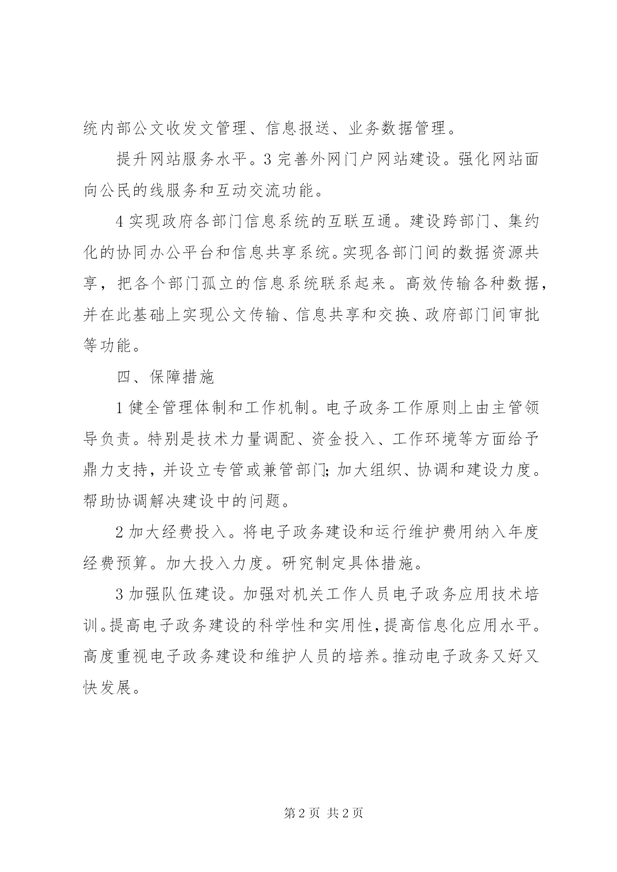 第PAGE\*Arabic\*MERGEFORMAT2页共NUMPAGES\*MERGEFORMAT2页司法局电子政务工作计划一、发展现状提供网上法律服务和法律咨询;各级司法行政机关都已普及计算机和网络应用。本系统网上公文传输系统、公文电子公章系统、视频会议系统均已完全开通使用;市司法局开通门户网站。二、发展思路和目标1发展思路。以提高应用水平为重点。以政府电子政务网络为依托,以信息资源开发利用为主线。建立信息共享和业务协同机制,完善信息安全保障体系,加强各项基础工作,带动信息化发展,面向政务要求,服务人民群众。2发展目标。依托现有电子政务基础设施。基本建立信息资源共享和政务信息公开机制;提升拓展内网功能,构建功能相对完善、安全可靠的电子政务基础平台;完善外网门户网站在线服务和互动功能。加强业务应用系统建设,实现机关内部办公信息化。三、重点内容1继续推进政务信息公开。严格执行国务院《政府信息公开条例》和市政府关于信息公开的各项制度。做好各类主动公开信息的加载及各类依申请公开信息的答复工作,以市政务信息公开平台为依托。做到及时、准确、便民。真正实现办公自动化。2加强内网应用系统建设。规范本系统内部公文收发文管理、信息报送、业务数据管理。提升网站服务水平。3完善外网门户网站建设。强化网站面向公民的线服务和互动交流功能。4实现政府各部门信息系统的互联互通。建设跨部门、集约化的协同办公平台和信息共享系统。实现各部门间的数据资源共享,把各个部门孤立的信息系统联系起来。高效传输各种数据,并在此基础上实现公文传输、信息共享和交换、政府部门间审批等功能。四、保障措施1健全管理体制和工作机制。电子政务工作原则上由主管领导负责。特别是技术力量调配、资金投入、工作环境等方面给予鼎力支持,并设立专管或兼管部门;加大组织、协调和建设力度。帮助协调解决建设中的问题。2加大经费投入。将电子政务建设和运行维护费用纳入年度经费预算。加大投入力度。研究制定具体措施。3加强队伍建设。加强对机关工作人员电子政务应用技术培训。提高电子政务建设的科学性和实用性,提高信息化应用水平。高度重视电子政务建设和维护人员的培养。推动电子政务又好又快发展。