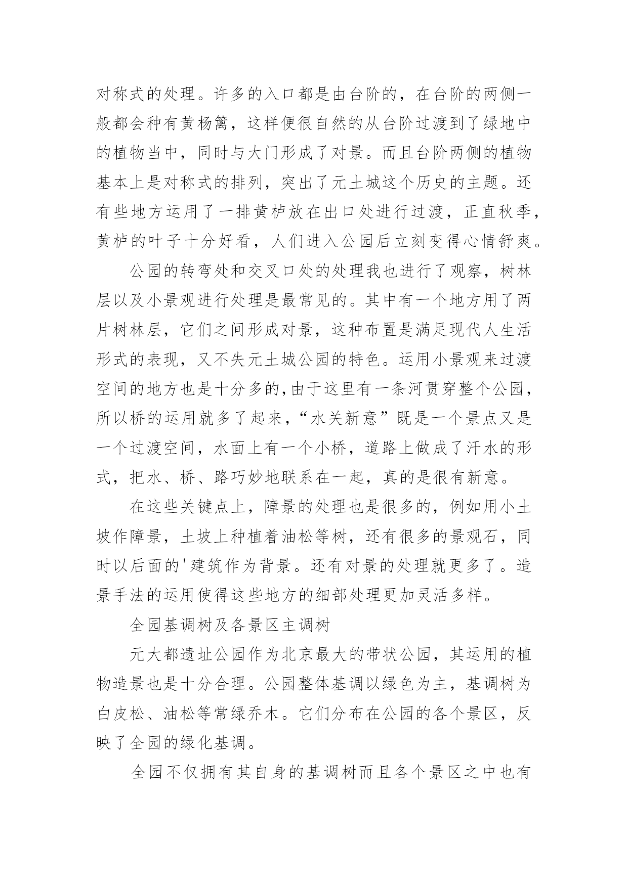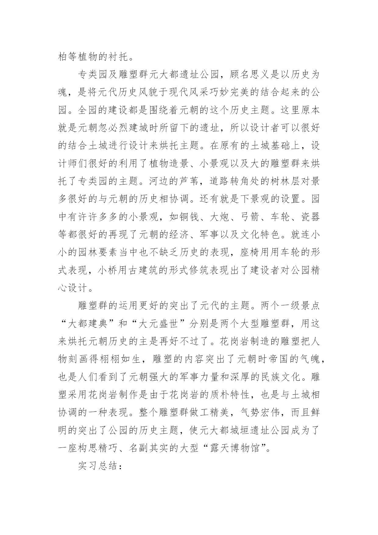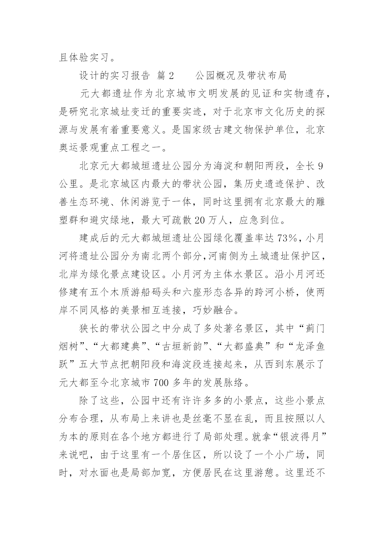 设计的实习报告优秀设计的实习报告在当下这个社会中,报告有着举足轻重的地位,我们在写报告的时候要注意涵盖报告的基本要素。你还在对写报告感到一筹莫展吗?下面是小编精心整理的设计的实习报告(优秀5篇),希望对大家有所帮助。设计的实习报告篇1题目名称:毕业实习报告院系名称:亚太国际学院班级:057班学号:200560014745学生姓名:周文超指导教师:胡洛燕20xx年8月1实习基本情况1.1实习要求实习在于培养实践动手能力,使所学的专业理论知识与实践相结合,为更好的适应社会的需求打下良好的基础。通过到服装企业生产一线实践的方式,对服装生产从设计、裁剪、工艺制作到检验、整理、包装的整个过程中所需的专业技能与生产管理能力得到系统的、强化的、实战的训练。1.2实习时间20xx年7月25日至20xx年8月15日1.3实习地点天津市尼彼欧制衣有限公司、瑞贝卡服装工作室1.4实习公司简介天津尼彼欧制衣有限公司成立于20xx年,由原天津服装四厂、服装五厂等老厂为基础组建而成,有着50多年的服装制造经验。是拥有上千人的大型国有企业。是天津市有关部门批准组建的以国有股为主体,吸纳社会法人和自然人入股的股份有限公司,,注册资本金6000万元,拥有60000多平方米的厂房,5000多人的劳动工人,拥有ERP系统管理和先进的生产设备。公司连续多年被评为全国出口最大500家企业和天津市出口50强企业之一,拥有时装、女装、休闲、裤业、运动等五个联系在一起的分公司。主要经营服装出口加工生意,主要从事各类服装、服饰制品、纺织制成品的生产、销售和进出口业务。经营品种包括各种优质棉布、棉涤纶、毛呢、化纤、混纺织物、丝绸、裘皮等面料制成的70余个品种的服装以及床上用品、旅游用品及杂品等。市场遍及美国、加拿大、澳大利亚、日本、韩国、南美洲等国家。2实习内容2.1面料调查1、调查各大原料厂的相关背景,供应物料的质量和价格状况。进行对比,选择合理的.原料供应商。在实习的过程中,首要的就是要找到合适的面料、辅料,并且具备一些简单判断面料好坏的方法。天津市尼彼欧制衣有限公司昰天津工业大学的实习基地,这次也是借由这个机会,和天津工业大的同学一起,才能进入公司进行参观,并且体验实习。设计的实习报告篇2公园概况及带状布局元大都遗址作为北京城市文明发展的见证和实物遗存,是研究北京城址变迁的重要实迹,对于北京市文化历史的探源与发展有着重要意义。是国家级古建文物保护单位,北京奥运景观重点工程之一。北京元大都城垣遗址公园分为海淀和朝阳两段,全长9公里。是北京城区内最大的带状公园,集历史遗迹保护、改善生态环境、休闲游览于一体,同时这里拥有北京最大的雕塑群和避灾绿地,最大可疏散20万人,应急到位。建成后的元大都城垣遗址公园绿化覆盖率达73%,小月河将遗址公园分为南北两个部分,河南侧为土城遗址保护区,北岸为绿化景点建设区。小月河为主体水景区。沿小月河还修建有五个木质游船码头和六座形态各异的跨河小桥,使两岸不同风格的美景相互连接,巧妙融合。狭长的带状公园之中分成了多处著名景区,其中“蓟门烟树”、“大都建典”、“古垣新韵”、“大都盛典”和“龙泽鱼跃”五大节点把朝阳段和海淀段连接起来,从西到东展示了元大都至今北京城市700多年的发展脉络。除了这些,公园中还有许许多多的小景点,这些小景点分布合理,从布局上来讲也是丝毫不显在乱,而且按照以人为本的原则在各个地方都进行了局部处理。就拿“银波得月”来说吧,由于这里有一个居住区,所以设了一个小广场,同时,对水面也是局部加宽,方便居民在这里游憩。这里还不乏郊野风光,水面芦苇与土城相协调,也十分有野趣。细部处理园路的转弯处、交叉口处、以及出入口处都是公园组成的重要连接点。人们从这里进入一个公园,从一个空间向另一个空间进行过渡,所以这些地方的细部处理便成为了一个公园好坏的关键点。这些地方在处理上要依靠植物的配置以及小品要素来完成的,同时还要巧妙地运用园林造景的手法。元大都遗址公园在这些地方所作的细部处理都是十分到位,使人们从一个景区到另一个景区是不显突兀,使空间的转换十分自然,同时把各个景区连接成为了一个整体。由于元大都遗址公园是一个狭长的带状公园,全长有九公里,周围又有很多的居住小区,所以公园的入口十分的多,处理这些入口时的方法也就十分的多。在公园最西端的入口处,有一块大的景观石,石头上注明了公园的名称“元土城公园”。入口并不像许多公园一样,在门前做出一个尺度很大的小广场,这里只有一个很小的开敞空间,这可能与带状公园有关吧。公园门前所种植的高大树木是人们很自然的从喧闹的城市当中过渡到了安静的空间当中。大门里面有一片开敞空间,在这里有老年人活动。大门旁边的椅子设计得很巧妙,椅子的位置正好在阳光透过大树所能照射到的位置,突出了以人为本的特性。门口处还作了障景的处理,一大