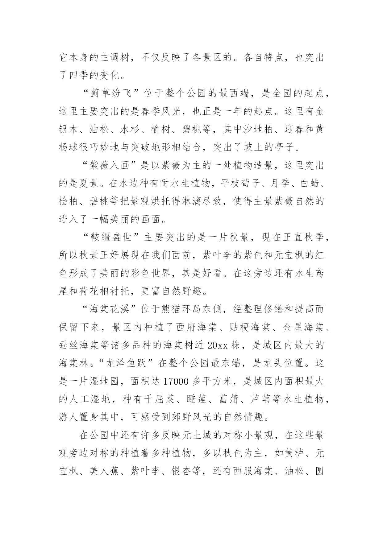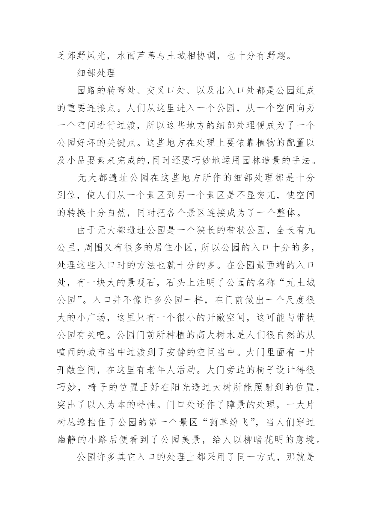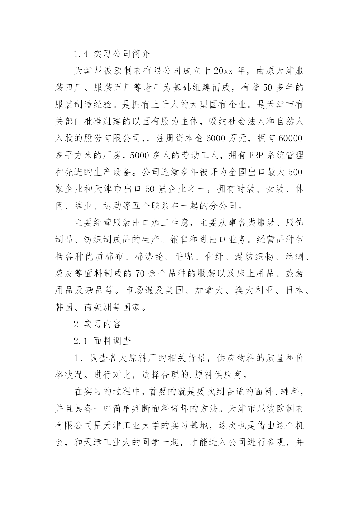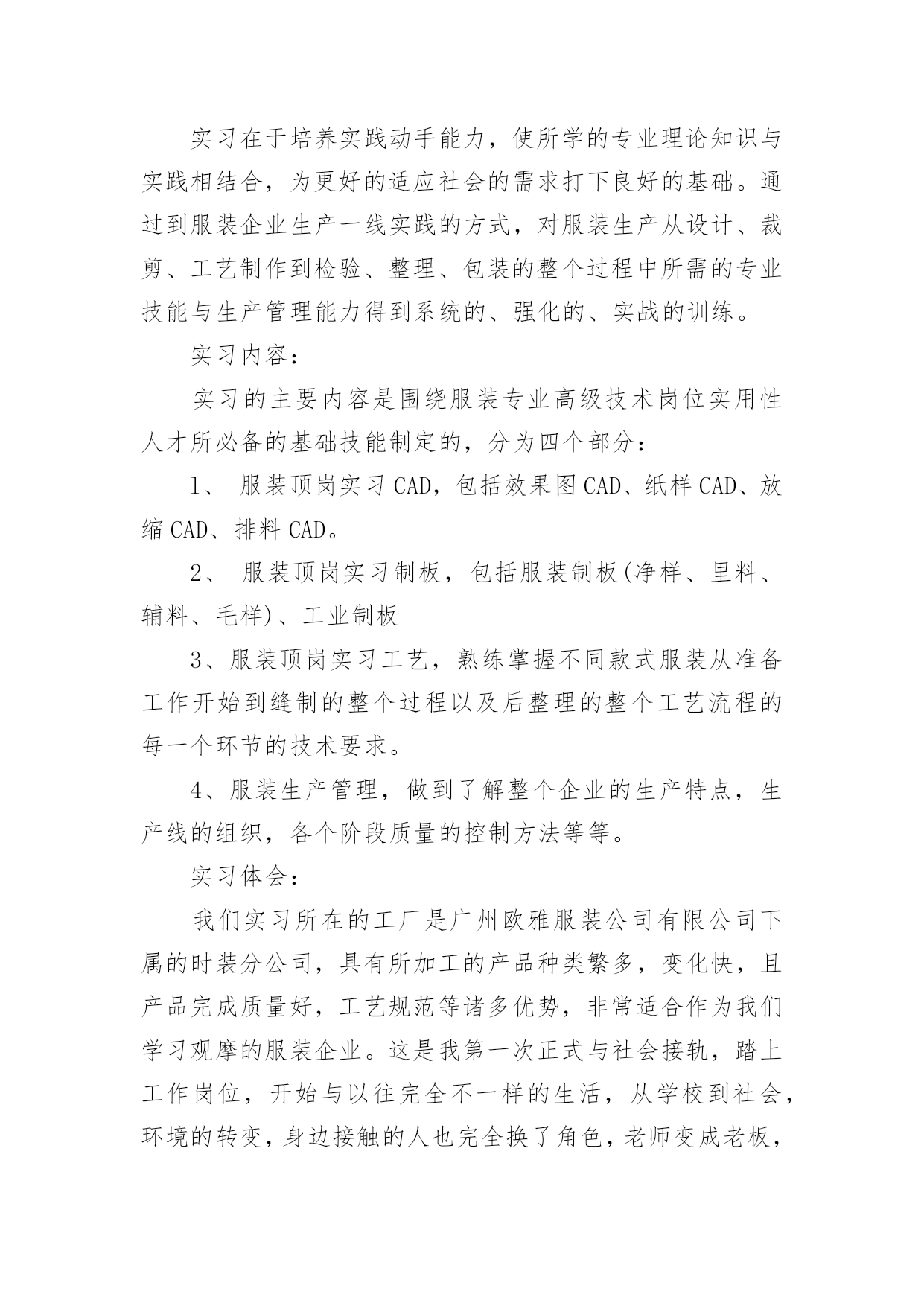 设计的实习报告优秀设计的实习报告在当下这个社会中,报告有着举足轻重的地位,我们在写报告的时候要注意涵盖报告的基本要素。你还在对写报告感到一筹莫展吗?下面是小编精心整理的设计的实习报告(优秀5篇),希望对大家有所帮助。设计的实习报告篇1题目名称:毕业实习报告院系名称:亚太国际学院班级:057班学号:200560014745学生姓名:周文超指导教师:胡洛燕20xx年8月1实习基本情况1.1实习要求实习在于培养实践动手能力,使所学的专业理论知识与实践相结合,为更好的适应社会的需求打下良好的基础。通过到服装企业生产一线实践的方式,对服装生产从设计、裁剪、工艺制作到检验、整理、包装的整个过程中所需的专业技能与生产管理能力得到系统的、强化的、实战的训练。1.2实习时间20xx年7月25日至20xx年8月15日1.3实习地点天津市尼彼欧制衣有限公司、瑞贝卡服装工作室1.4实习公司简介天津尼彼欧制衣有限公司成立于20xx年,由原天津服装四厂、服装五厂等老厂为基础组建而成,有着50多年的服装制造经验。是拥有上千人的大型国有企业。是天津市有关部门批准组建的以国有股为主体,吸纳社会法人和自然人入股的股份有限公司,,注册资本金6000万元,拥有60000多平方米的厂房,5000多人的劳动工人,拥有ERP系统管理和先进的生产设备。公司连续多年被评为全国出口最大500家企业和天津市出口50强企业之一,拥有时装、女装、休闲、裤业、运动等五个联系在一起的分公司。主要经营服装出口加工生意,主要从事各类服装、服饰制品、纺织制成品的生产、销售和进出口业务。经营品种包括各种优质棉布、棉涤纶、毛呢、化纤、混纺织物、丝绸、裘皮等面料制成的70余个品种的服装以及床上用品、旅游用品及杂品等。市场遍及美国、加拿大、澳大利亚、日本、韩国、南美洲等国家。2实习内容2.1面料调查1、调查各大原料厂的相关背景,供应物料的质量和价格状况。进行对比,选择合理的.原料供应商。在实习的过程中,首要的就是要找到合适的面料、辅料,并且具备一些简单判断面料好坏的方法。天津市尼彼欧制衣有限公司昰天津工业大学的实习基地,这次也是借由这个机会,和天津工业大的同学一起,才能进入公司进行参观,并且体验实习。设计的实习报告篇2公园概况及带状布局元大都遗址作为北京城市文明发展的见证和实物遗存,是研究北京城址变迁的重要实迹,对于北京市文化历史的探源与发展有着重要意义。是国家级古建文物保护单位,北京奥运景观重点工程之一。北京元大都城垣遗址公园分为海淀和朝阳两段,全长9公里。是北京城区内最大的带状公园,集历史遗迹保护、改善生态环境、休闲游览于一体,同时这里拥有北京最大的雕塑群和避灾绿地,最大可疏散20万人,应急到位。建成后的元大都城垣遗址公园绿化覆盖率达73%,小月河将遗址公园分为南北两个部分,河南侧为土城遗址保护区,北岸为绿化景点建设区。小月河为主体水景区。沿小月河还修建有五个木质游船码头和六座形态各异的跨河小桥,使两岸不同风格的美景相互连接,巧妙融合。狭长的带状公园之中分成了多处著名景区,其中“蓟门烟树”、“大都建典”、“古垣新韵”、“大都盛典”和“龙泽鱼跃”五大节点把朝阳段和海淀段连接起来,从西到东展示了元大都至今北京城市700多年的发展脉络。除了这些,公园中还有许许多多的小景点,这些小景点分布合理,从布局上来讲也是丝毫不显在乱,而且按照以人为本的原则在各个地方都进行了局部处理。就拿“银波得月”来说吧,由于这里有一个居住区,所以设了一个小广场,同时,对水面也是局部加宽,方便居民在这里游憩。这里还不乏郊野风光,水面芦苇与土城相协调,也十分有野趣。细部处理园路的转弯处、交叉口处、以及出入口处都是公园组成的重要连接点。人们从这里进入一个公园,从一个空间向另一个空间进行过渡,所以这些地方的细部处理便成为了一个公园好坏的关键点。这些地方在处理上要依靠植物的配置以及小品要素来完成的,同时还要巧妙地运用园林造景的手法。元大都遗址公园在这些地方所作的细部处理都是十分到位,使人们从一个景区到另一个景区是不显突兀,使空间的转换十分自然,同时把各个景区连接成为了一个整体。由于元大都遗址公园是一个狭长的带状公园,全长有九公里,周围又有很多的居住小区,所以公园的入口十分的多,处理这些入口时的方法也就十分的多。在公园最西端的入口处,有一块大的景观石,石头上注明了公园的名称“元土城公园”。入口并不像许多公园一样,在门前做出一个尺度很大的小广场,这里只有一个很小的开敞空间,这可能与带状公园有关吧。公园门前所种植的高大树木是人们很自然的从喧闹的城市当中过渡到了安静的空间当中。大门里面有一片开敞空间,在这里有老年人活动。大门旁边的椅子设计得很巧妙,椅子的位置正好在阳光透过大树所能照射到的位置,突出了以人为本的特性。门口处还作了障景的处理,一大