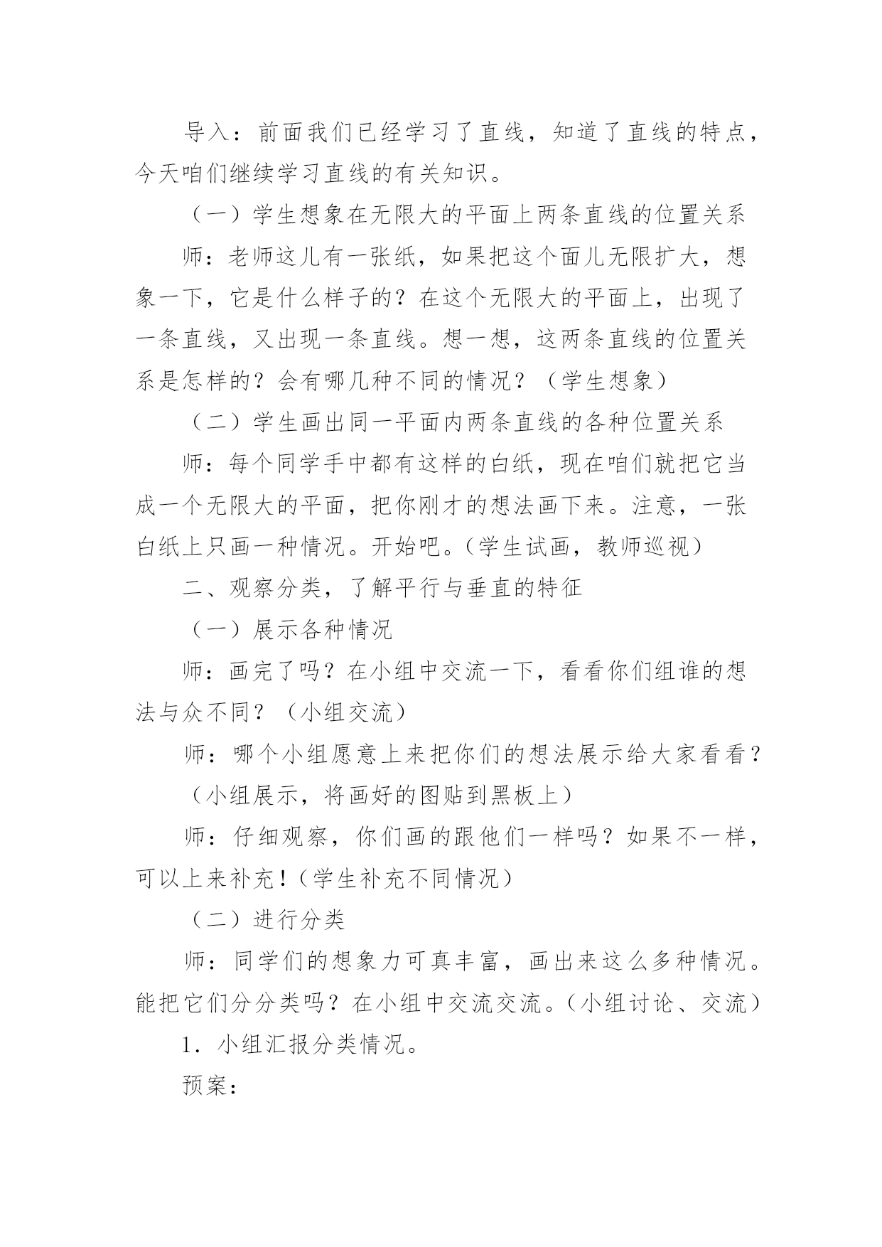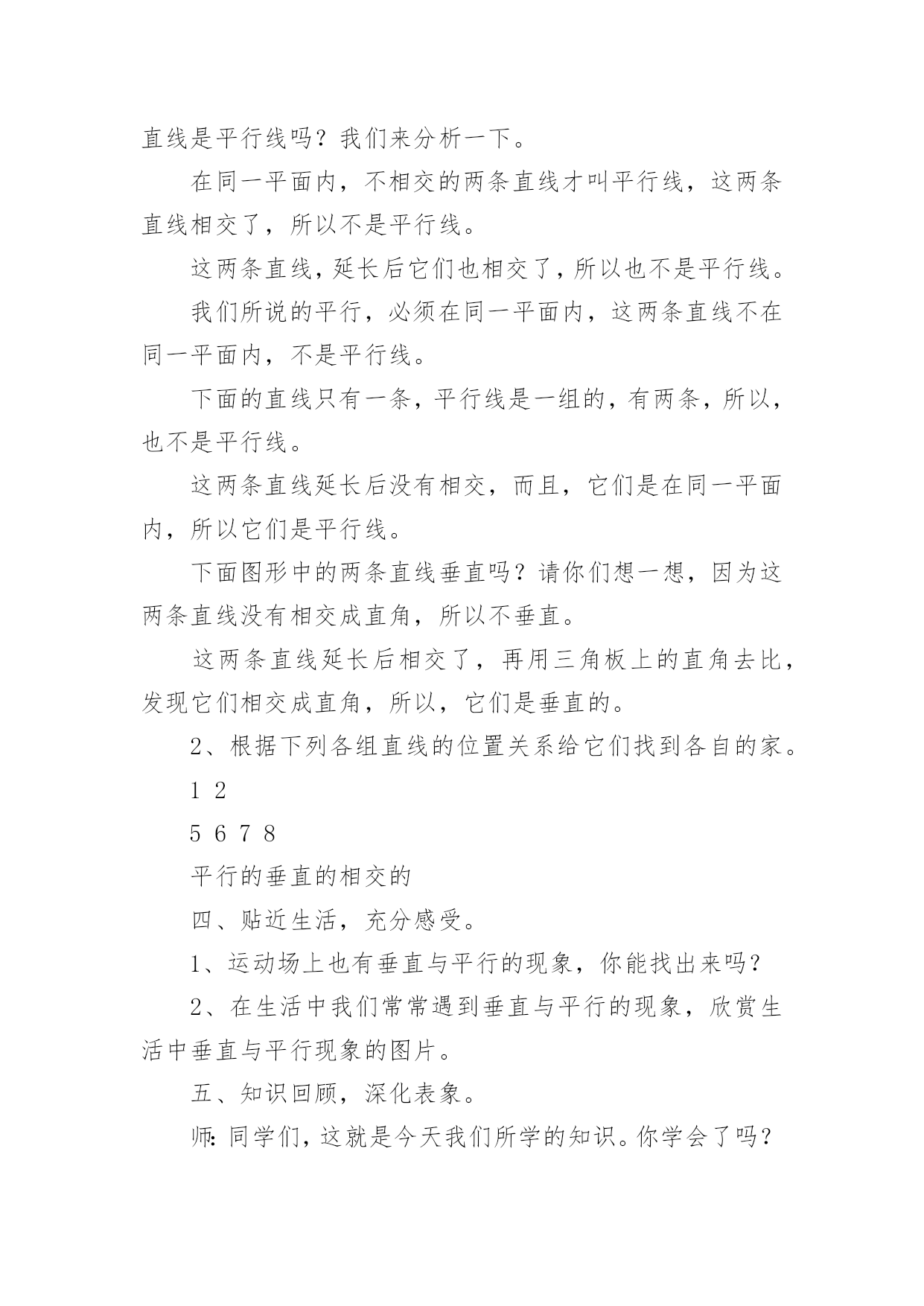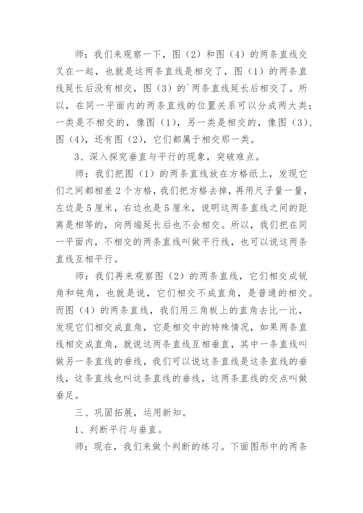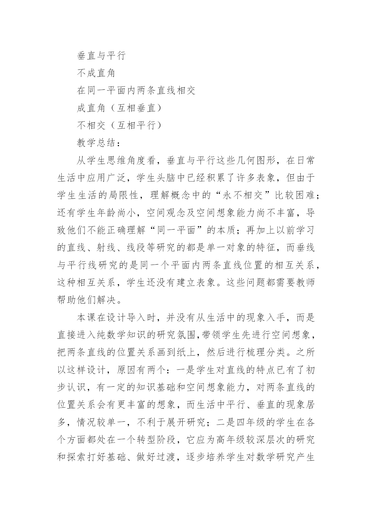 《平行与垂直》教学设计《平行与垂直》教学设计20篇作为一名教学工作者,就有可能用到教学设计,教学设计是教育技术的组成部分,它的功能在于运用系统方法设计教学过程,使之成为一种具有操作性的程序。我们该怎么去写教学设计呢?以下是小编为大家收集的《平行与垂直》教学设计,欢迎阅读与收藏。《平行与垂直》教学设计1教学背景:《垂直与平行》是人教版义务教育课程标准实验教科书四年级上册第四单元第一课时的教学内容。它是在学生认识了直线、线段、射线的性质、学习了角及角的度量等知识的基础上学习的。在“空间与图形”的领域中,垂直与平行是学生以后认识平行四边形、梯形以及长方体、正方体等几何形体的基础,也为培养学生空间观念提供了一个很好的载体。教学目标:1、引导学生初步理解垂直与平行是同一平面内两条直线的两种特殊的位置关系,初步认识垂线和平行线,并通过观察,感知生活中的垂直与平行的现象。2、使学生通过探究活动知道在同一个平面内两条直线存在着相交、平行的位置关系,掌握垂直、平行的概念。培养学生的空间观念及空间想象能力。教学重难点:1、正确理解“相交”“互相平行”“互相垂直”等概念,发展学生的空间想象能力。2、相关现象的正确理解(尤其是对看似不相交,而实际上是相交现象的理解)。教学方法:想象法、情境法、直观演示法、演练法教学过程:一、设置情景,想象感知。1、进入纯数学知识的研究氛围,带领学生进行空间想象。导入:大家好,今天我们一起来学习《垂直与平行》这节课。请同学们拿出一张白纸,再用手摸一摸它的平面,然后闭上眼睛,我们一起来想像,这个平面变大了,又变大了,变得无限大,在这个无限大的平面上出现了一条直线,又出现了一条直线,你想像的这两条直线的位置关系是怎样的……它又有哪几种情况呢?2、让学生把它们画在白纸上。二、探索比较,掌握特征。1、展示典型图形,强化图形表征。师:同学们,你们画的跟老师的一样吗?2、引导学生分类,通过演示让学生明白,在同一平面内的两条直线可以分成几类?根据什么来分?师:我们来观察一下,图(2)和图(4)的两条直线交叉在一起,也就是这两条直线是相交了,图(1)的两条直线延长后没有相交,图(3)的`两条直线延长后相交了。所以,在同一平面内的两条直线的位置关系可以分成两大类:一类是不相交的,像图(1),另一类是相交的,像图(3)、图(4),还有图(2),它们都属于相交那一类。3、深入探究垂直与平行的现象,突破难点。师:我们把图(1)的两条直线放在方格纸上,发现它们之间都相差2个方格,我们把方格去掉,再用尺子量一量,左边是5厘米,右边也是5厘米,说明这两条直线之间的距离是相等的,向两端延长后也不会相交。所以,我们把在同一平面内,不相交的两条直线叫做平行线,也可以说这两条直线互相平行。师:我们再来观察图(2)的两条直线,它们相交成锐角和钝角,也就是说,它们相交不成直角,是普通的相交。而图(4)的两条直线,我们用三角板上的直角去比一比,发现它们相交成直角,它是相交中的特殊情况,如果两条直线相交成直角,就说这两条直线互相垂直,其中一条直线叫做另一条直线的垂线,我们可以说这条直线是这条直线的垂线,这条直线也叫这条直线的垂线,这两条直线的交点叫做垂足。三、巩固拓展,运用新知。1、判断平行与垂直。师:现在,我们来做个判断的练习。下面图形中的两条直线是平行线吗?我们来分析一下。在同一平面内,不相交的两条直线才叫平行线,这两条直线相交了,所以不是平行线。这两条直线,延长后它们也相交了,所以也不是平行线。我们所说的平行,必须在同一平面内,这两条直线不在同一平面内,不是平行线。下面的直线只有一条,平行线是一组的,有两条,所以,也不是平行线。这两条直线延长后没有相交,而且,它们是在同一平面内,所以它们是平行线。下面图形中的两条直线垂直吗?请你们想一想,因为这两条直线没有相交成直角,所以不垂直。这两条直线延长后相交了,再用三角板上的直角去比,发现它们相交成直角,所以,它们是垂直的。2、根据下列各组直线的位置关系给它们找到各自的家。125678平行的垂直的相交的四、贴近生活,充分感受。1、运动场上也有垂直与平行的现象,你能找出来吗?2、在生活中我们常常遇到垂直与平行的现象,欣赏生活中垂直与平行现象的图片。五、知识回顾,深化表象。师:同学们,这就是今天我们所学的知识。你学会了吗?垂直与平行不成直角在同一平面内两条直线相交成直角(互相垂直)不相交(互相平行)教学总结:从学生思维角度看,垂直与平行这些几何图形,在日常生活中应用广泛,学生头脑中已经积累了许多表象,但由于学生生活的局限性,理解概念中的“永不相交”比较困难;还有学生年龄尚小,空间观念及空间想象能力尚不丰富,导致他们不能正确理解“同一平面”的本质;再加上以前学习的直线、射线、线段等研究的都是单一对象的特征,而垂线与平行