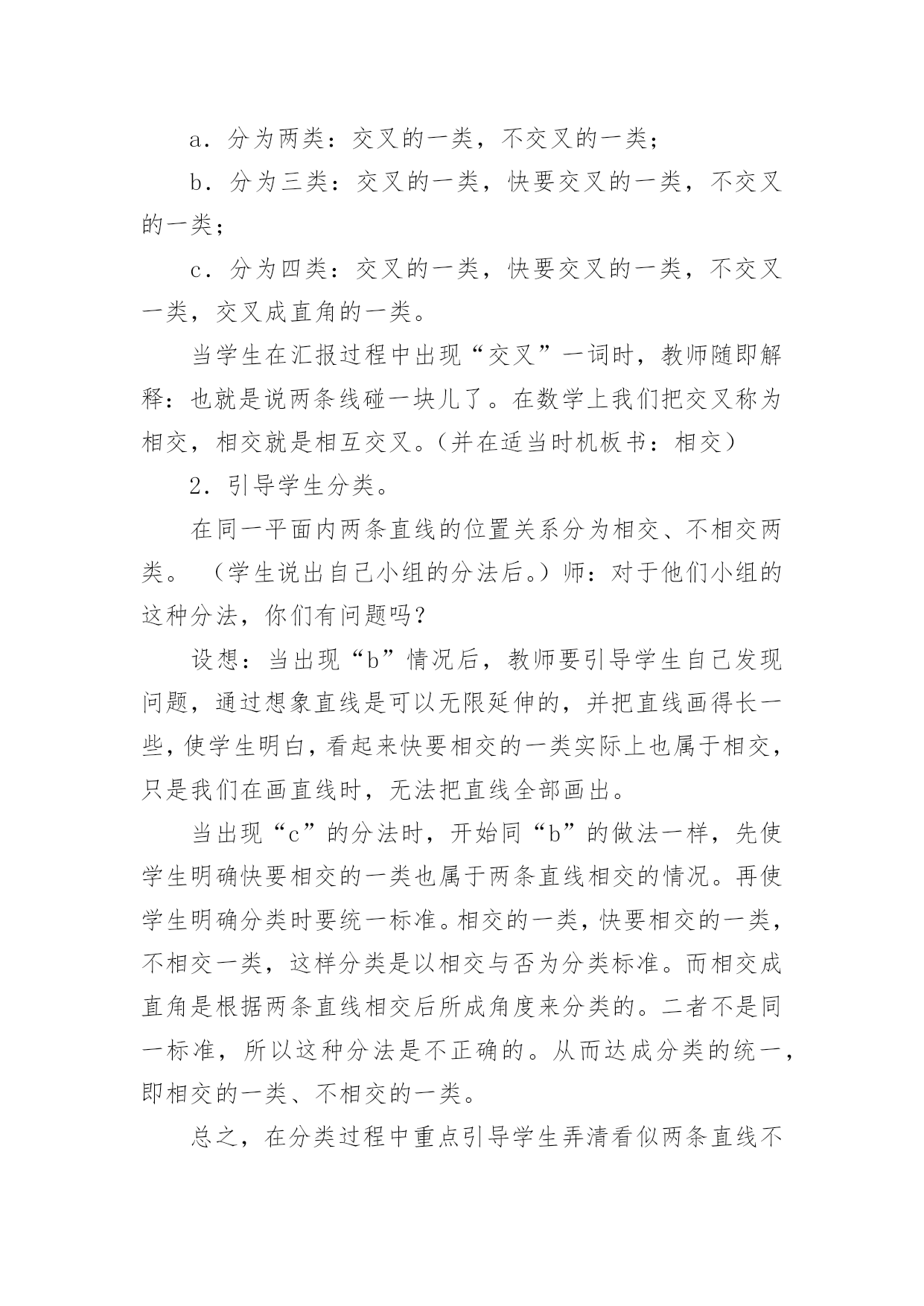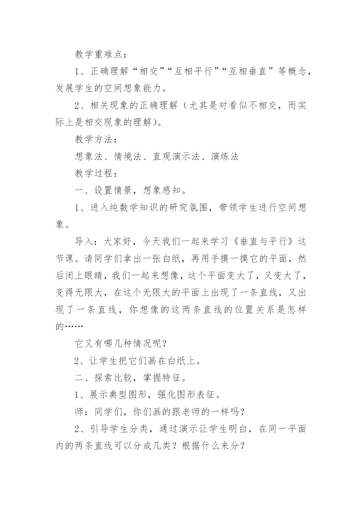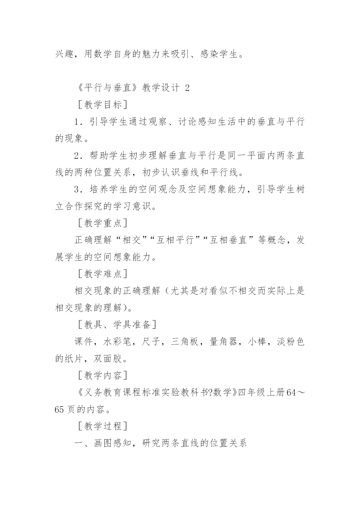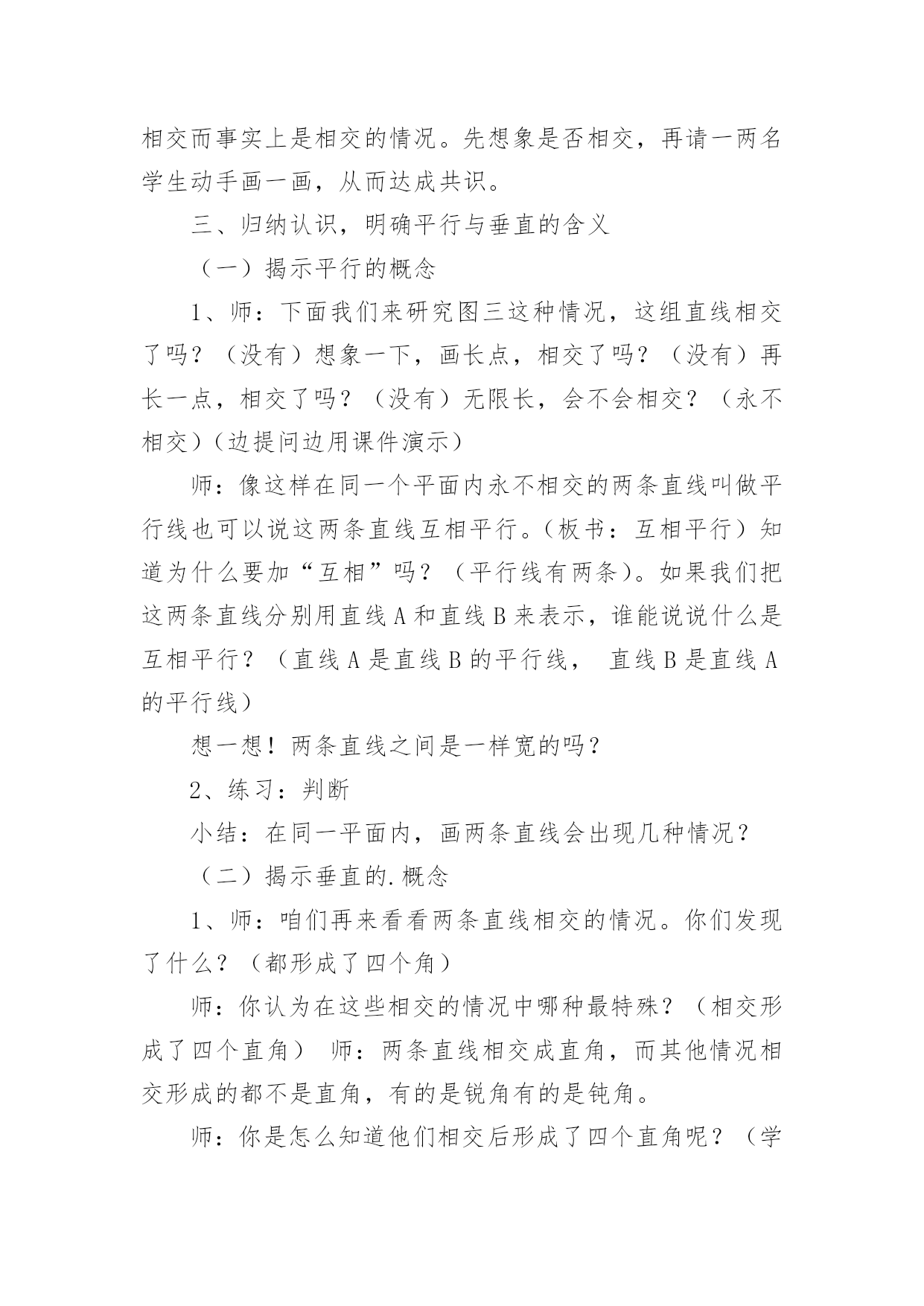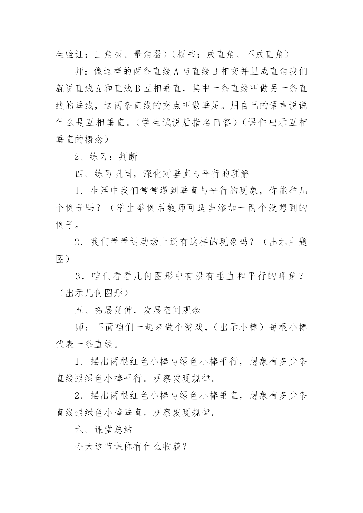 《平行与垂直》教学设计《平行与垂直》教学设计20篇作为一名教学工作者,就有可能用到教学设计,教学设计是教育技术的组成部分,它的功能在于运用系统方法设计教学过程,使之成为一种具有操作性的程序。我们该怎么去写教学设计呢?以下是小编为大家收集的《平行与垂直》教学设计,欢迎阅读与收藏。《平行与垂直》教学设计1教学背景:《垂直与平行》是人教版义务教育课程标准实验教科书四年级上册第四单元第一课时的教学内容。它是在学生认识了直线、线段、射线的性质、学习了角及角的度量等知识的基础上学习的。在“空间与图形”的领域中,垂直与平行是学生以后认识平行四边形、梯形以及长方体、正方体等几何形体的基础,也为培养学生空间观念提供了一个很好的载体。教学目标:1、引导学生初步理解垂直与平行是同一平面内两条直线的两种特殊的位置关系,初步认识垂线和平行线,并通过观察,感知生活中的垂直与平行的现象。2、使学生通过探究活动知道在同一个平面内两条直线存在着相交、平行的位置关系,掌握垂直、平行的概念。培养学生的空间观念及空间想象能力。教学重难点:1、正确理解“相交”“互相平行”“互相垂直”等概念,发展学生的空间想象能力。2、相关现象的正确理解(尤其是对看似不相交,而实际上是相交现象的理解)。教学方法:想象法、情境法、直观演示法、演练法教学过程:一、设置情景,想象感知。1、进入纯数学知识的研究氛围,带领学生进行空间想象。导入:大家好,今天我们一起来学习《垂直与平行》这节课。请同学们拿出一张白纸,再用手摸一摸它的平面,然后闭上眼睛,我们一起来想像,这个平面变大了,又变大了,变得无限大,在这个无限大的平面上出现了一条直线,又出现了一条直线,你想像的这两条直线的位置关系是怎样的……它又有哪几种情况呢?2、让学生把它们画在白纸上。二、探索比较,掌握特征。1、展示典型图形,强化图形表征。师:同学们,你们画的跟老师的一样吗?2、引导学生分类,通过演示让学生明白,在同一平面内的两条直线可以分成几类?根据什么来分?师:我们来观察一下,图(2)和图(4)的两条直线交叉在一起,也就是这两条直线是相交了,图(1)的两条直线延长后没有相交,图(3)的`两条直线延长后相交了。所以,在同一平面内的两条直线的位置关系可以分成两大类:一类是不相交的,像图(1),另一类是相交的,像图(3)、图(4),还有图(2),它们都属于相交那一类。3、深入探究垂直与平行的现象,突破难点。师:我们把图(1)的两条直线放在方格纸上,发现它们之间都相差2个方格,我们把方格去掉,再用尺子量一量,左边是5厘米,右边也是5厘米,说明这两条直线之间的距离是相等的,向两端延长后也不会相交。所以,我们把在同一平面内,不相交的两条直线叫做平行线,也可以说这两条直线互相平行。师:我们再来观察图(2)的两条直线,它们相交成锐角和钝角,也就是说,它们相交不成直角,是普通的相交。而图(4)的两条直线,我们用三角板上的直角去比一比,发现它们相交成直角,它是相交中的特殊情况,如果两条直线相交成直角,就说这两条直线互相垂直,其中一条直线叫做另一条直线的垂线,我们可以说这条直线是这条直线的垂线,这条直线也叫这条直线的垂线,这两条直线的交点叫做垂足。三、巩固拓展,运用新知。1、判断平行与垂直。师:现在,我们来做个判断的练习。下面图形中的两条直线是平行线吗?我们来分析一下。在同一平面内,不相交的两条直线才叫平行线,这两条直线相交了,所以不是平行线。这两条直线,延长后它们也相交了,所以也不是平行线。我们所说的平行,必须在同一平面内,这两条直线不在同一平面内,不是平行线。下面的直线只有一条,平行线是一组的,有两条,所以,也不是平行线。这两条直线延长后没有相交,而且,它们是在同一平面内,所以它们是平行线。下面图形中的两条直线垂直吗?请你们想一想,因为这两条直线没有相交成直角,所以不垂直。这两条直线延长后相交了,再用三角板上的直角去比,发现它们相交成直角,所以,它们是垂直的。2、根据下列各组直线的位置关系给它们找到各自的家。125678平行的垂直的相交的四、贴近生活,充分感受。1、运动场上也有垂直与平行的现象,你能找出来吗?2、在生活中我们常常遇到垂直与平行的现象,欣赏生活中垂直与平行现象的图片。五、知识回顾,深化表象。师:同学们,这就是今天我们所学的知识。你学会了吗?垂直与平行不成直角在同一平面内两条直线相交成直角(互相垂直)不相交(互相平行)教学总结:从学生思维角度看,垂直与平行这些几何图形,在日常生活中应用广泛,学生头脑中已经积累了许多表象,但由于学生生活的局限性,理解概念中的“永不相交”比较困难;还有学生年龄尚小,空间观念及空间想象能力尚不丰富,导致他们不能正确理解“同一平面”的本质;再加上以前学习的直线、射线、线段等研究的都是单一对象的特征,而垂线与平行