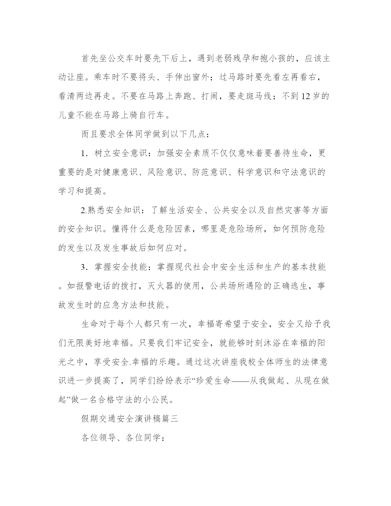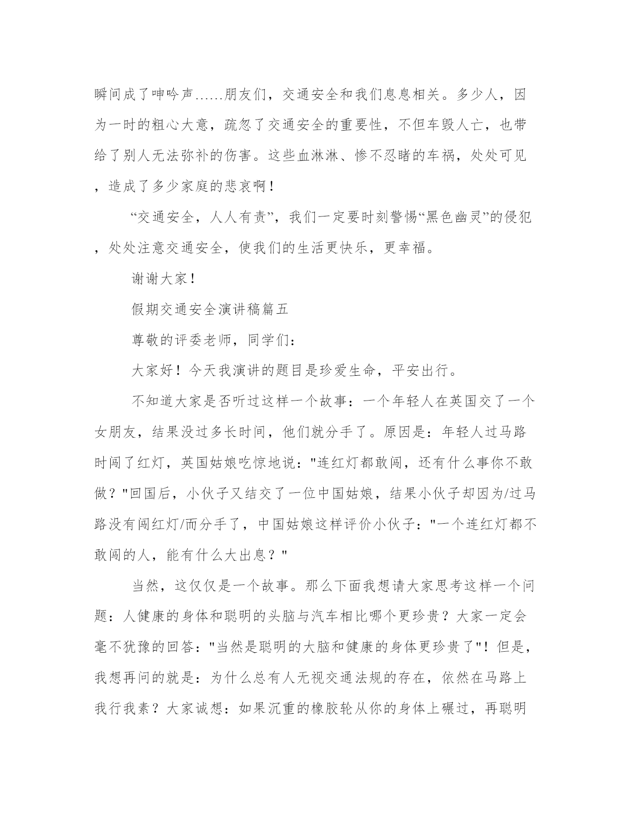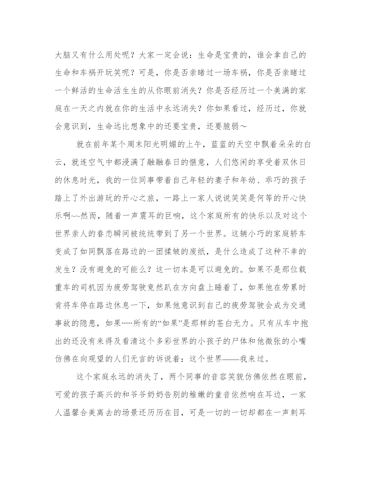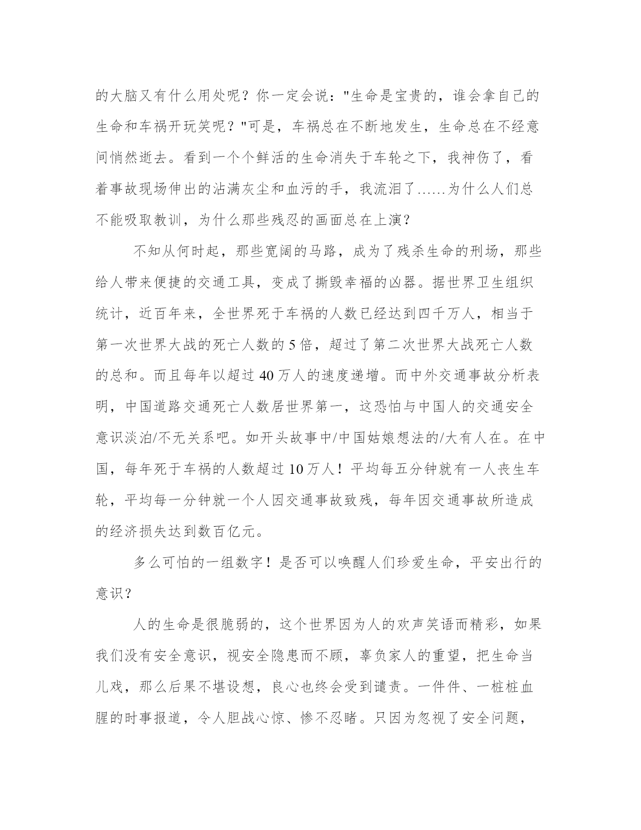 假期交通安全演讲稿(12篇)要写好演讲稿,首先必须要了解听众对象,了解他们的心理、愿望和要求是什么,使演讲有针对性,能解决实际问题。优质的演讲稿该怎么样去写呢?以下是我帮大家整理的演讲稿模板范文,欢迎大家借鉴与参考,希望对大家有所帮助。假期交通安全演讲稿篇一大家下午好:随着经济繁荣的发展,交通事业猛发达,车辆川流不息地在公路上行驶,交通事故时常走进我们的生活,直接应对,而无法回避。所以,交通安全,人人须知,而我就有过这样的经历。记得有一个晚上,爸爸刚喝过酒,就准备坐摩托车回家,我和妈妈坐在爸爸驾驶的摩托车上,就在行驶过程中,一辆轿车开了过来,前面出现一个坑,由于爸爸的车速过快,来了一个急刹,就在那一刹那,爸爸把方向盘拐了一下,迎面正好开来一辆大货车,“咚。”的一声,辆车相撞了,当时,我可吓坏了,这是关系到我们一家人的生命安全呀!这次幸好没有出什么大事,只是我和爸爸的额头破了一点皮,妈妈的脚拐了一下,但也给了我很大的启示,让我懂得了酒后不能驾驶车辆,如果稍微有一点失误,就有可能丧失生命。小朋友们,我们在玩耍的时候,千万不能到通行的公路边去玩,这样也会出现交通事故的,在我的印象中有这么一件事。那是一个阳光明媚的早晨,一个四年级的学生在路边踢毽子,毽子掉在马路中间去了,她跑去捡,就在她玩得高兴的时候,一辆卡车迎面驶来,便毫不留情地从她身上压过去,就在这短暂的一刹那,她丧失了宝贵的生命。可想而知,她此刻已读四年级了,父母用自我的心血把她养大,最终却招来这样的结果,你说,这是一个人的命运吗不是的,这并不是你所想的那样。命运给每个人的待遇都相同的,这要看你自我怎样去应对,怎样去珍惜,交通安全对我们来说太重要了。作为一名即将小学毕业的学生,我想告诉大家:只要我们人人遵守交通规则,学习交通有关知识,必须会让那些感到遗憾的事故一件件地消失。交通安全不是针对某一个人,而是针对所有的人,它让我们明白:我们必须学习和遵守交通规则,做到高高兴兴上学,平平安安回家。人的生命是短暂的,一去不返,它就像一只小小的贝壳,在大海中遨游,一路总是有一些坎坷。我们要敲响交通安全的警钟,永远铭记血的教训,学习交通全知识,遵守交通规则,提高交通安全意识,让生命之树矗立挺拔。假期交通安全演讲稿篇二今天,市交警大队为我们全校师生讲了关于交通安全知识的讲座。从“坐公交车、走文明路、骑车的注意事项”等几个方面,用身边血淋淋的事实,深入浅出地给我们上了生动的一课。首先坐公交车时要先下后上,遇到老弱残孕和抱小孩的,应该主动让座。乘车时不要将头、手伸出窗外;过马路时要先看左再看右,看清两边再走。不要在马路上奔跑、打闹,要走斑马线;不到12岁的儿童不能在马路上骑自行车。而且要求全体同学做到以下几点:1.树立安全意识:加强安全素质不仅仅意味着要善待生命,更重要的是对健康意识、风险意识、防范意识、科学意识和守法意识的学习和提高。2.熟悉安全知识:了解生活安全、公共安全以及自然灾害等方面的安全知识。懂得什么是危险因素,哪里是危险场所,如何预防危险的发生以及发生事故后如何应对。3.掌握安全技能:掌握现代社会中安全生活和生产的基本技能。如报警电话的拨打,灭火器的使用,公共场所遇险的正确逃生,事故发生时的应急方法和技能。生命对于每个人都只有一次,幸福寄希望于安全,安全又给予我们无限美好地幸福。只要我们牢记安全,就能够时刻沐浴在幸福的阳光之中,享受安全.幸福的乐趣。通过这次讲座我校全体师生的法律意识进一步提高了,同学们纷纷表示“珍爱生命——从我做起、从现在做起”做一名合格守法的小公民。假期交通安全演讲稿篇三各位领导、各位同学:下午好!谁不希望有个完整的家?谁不希望自己有婀娜的仪态?谁不希望能够愉快的渡过自己的花季一般灿烂的岁月?这对于大多数人来说是一件并不难的事情,然而这一切对于一个被车祸毁于一旦的家庭来说有多难啊!她,本是一个活泼开朗、天真可爱的小女孩,和其它的小朋友一样拥有幸福快乐的童年,拥有灿烂的微笑,可就是在她与同伴过马路的一刹那,就在司机没有集中精力开车的一瞬间,在这触目惊心的一刻,车从她的腿上一下子碾了过去,鲜红的血迹染红了马路,剧烈的疼痛使她晕了过去,失去了知觉,医生对她的父母说:“要命还是要腿!”她的家人为了让她活下去,只好让医生为她做了截肢手术,同时这场车祸的肇事者也受到了法律的制裁。剧烈的疼痛使女孩从昏迷中醒来,她使劲睁开双眼,朦朦胧胧中女孩下意识地摸摸双腿,顿时眼前一黑,眼泪夺眶而出,大声哭喊道:“爸爸妈妈救救我,我的腿呢?我的腿到哪里去了?我的腿呢?”爸爸妈妈与女孩哭着抱在一起,一家人似乎已经绝望了。顿感天塌地陷,一切变得灰暗。到了该上学的时候,女孩哭着闹着要上学,父母看着这一切,心都碎了。爸爸无奈只好用一个篮球支撑她那娇小的身体