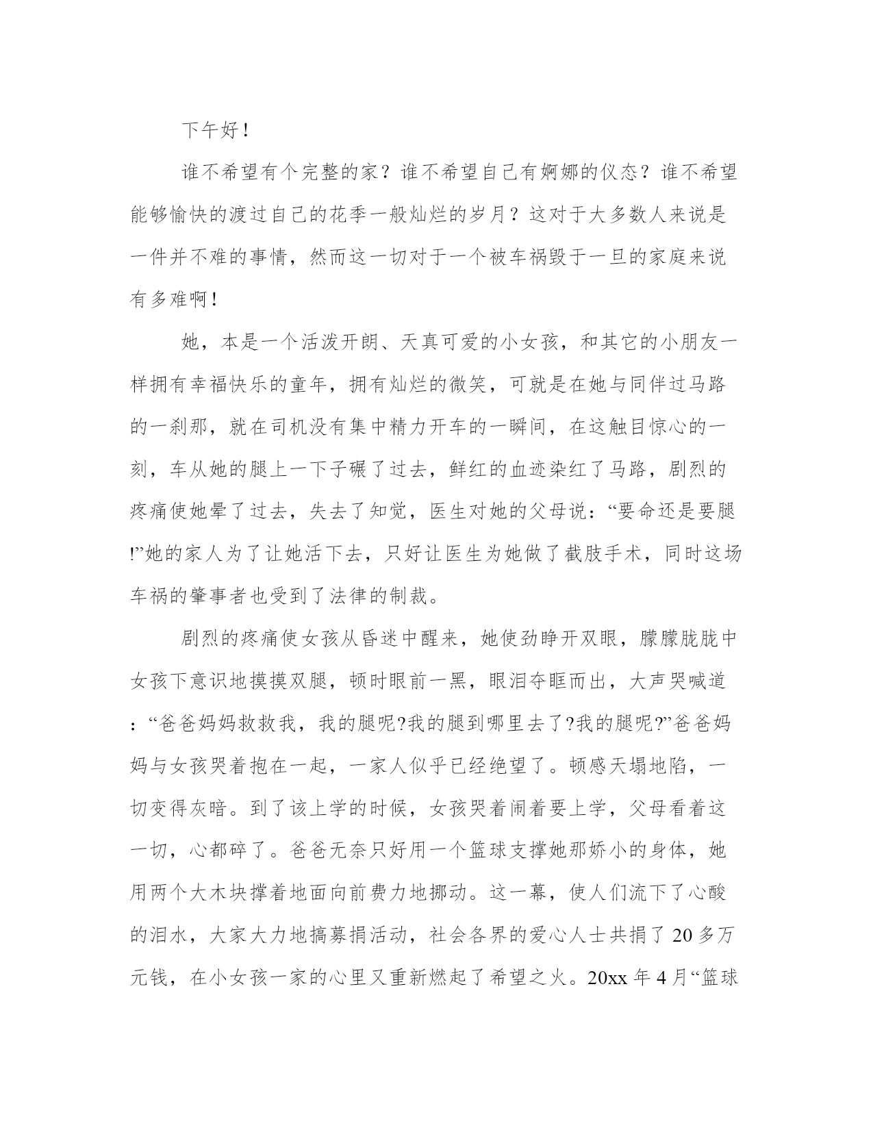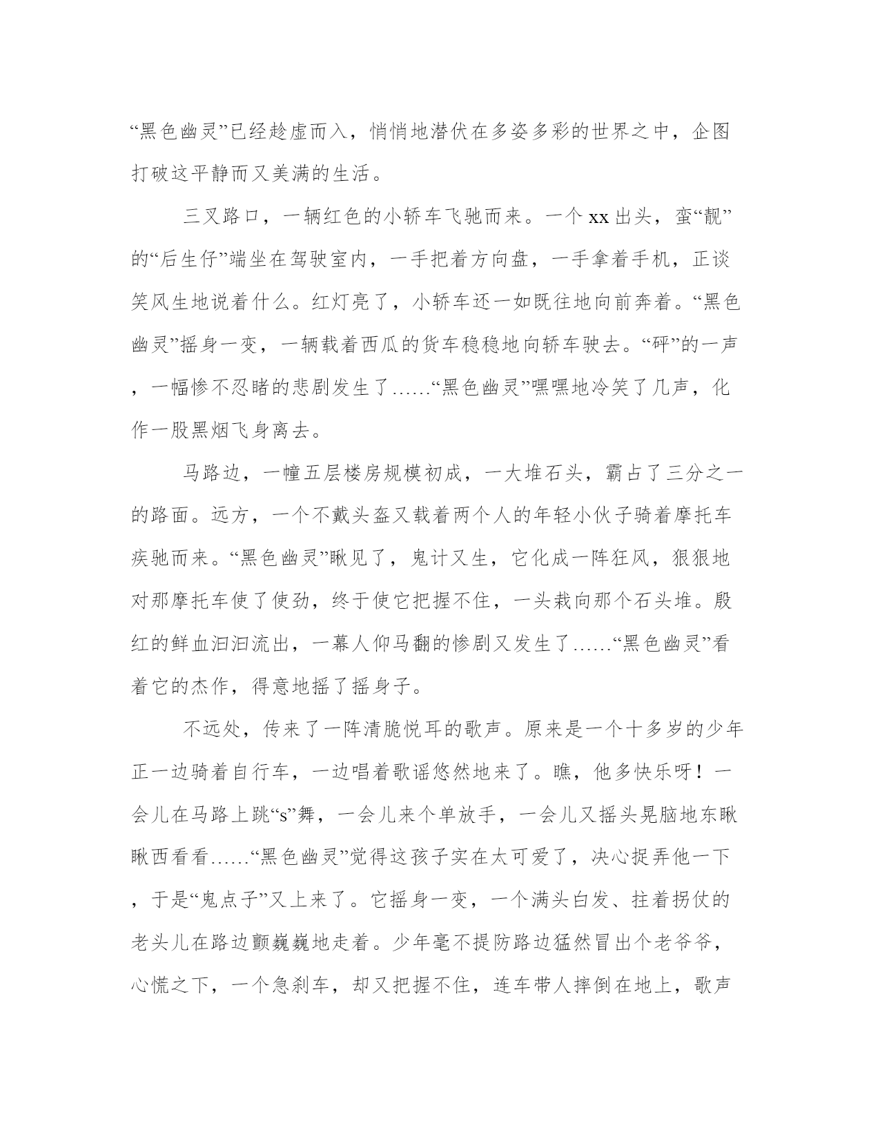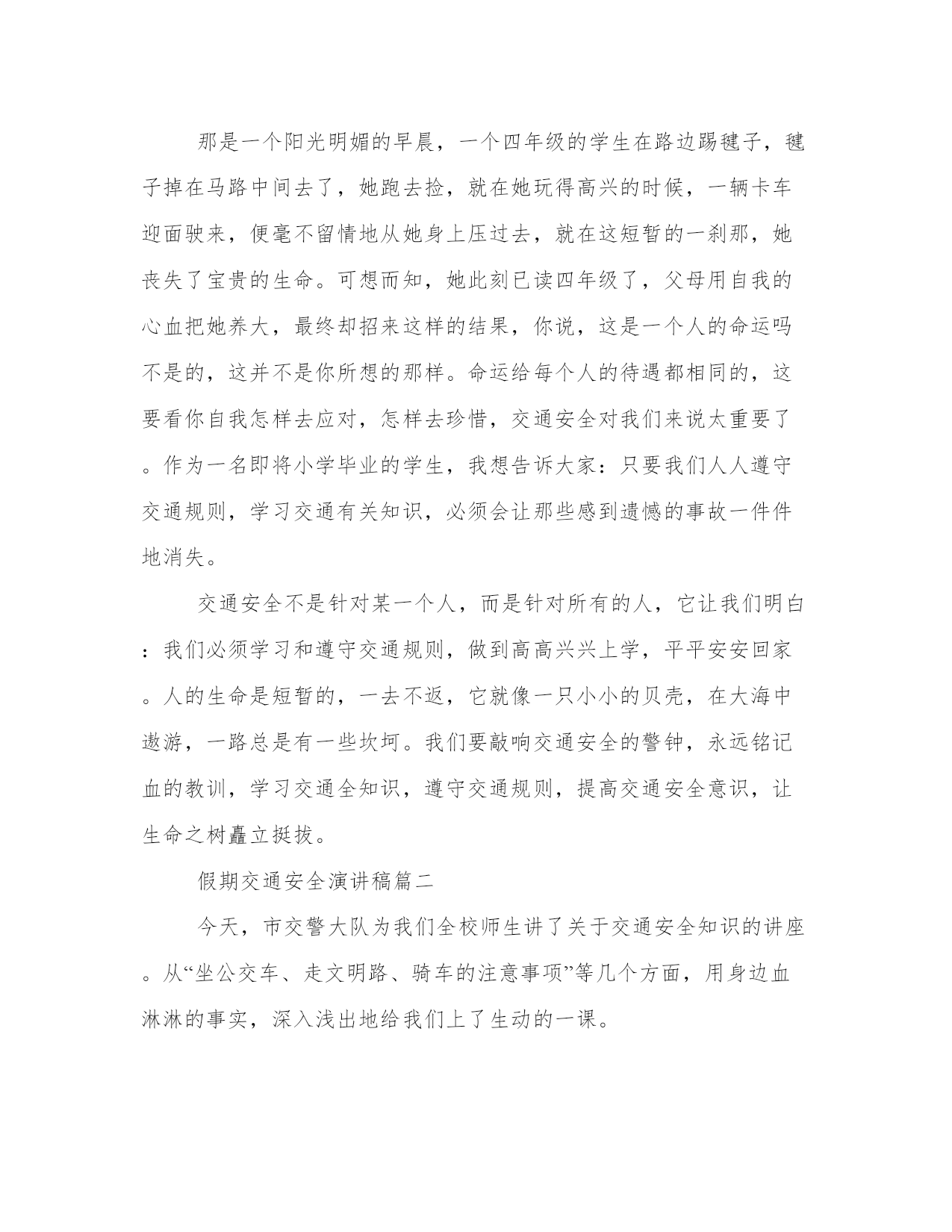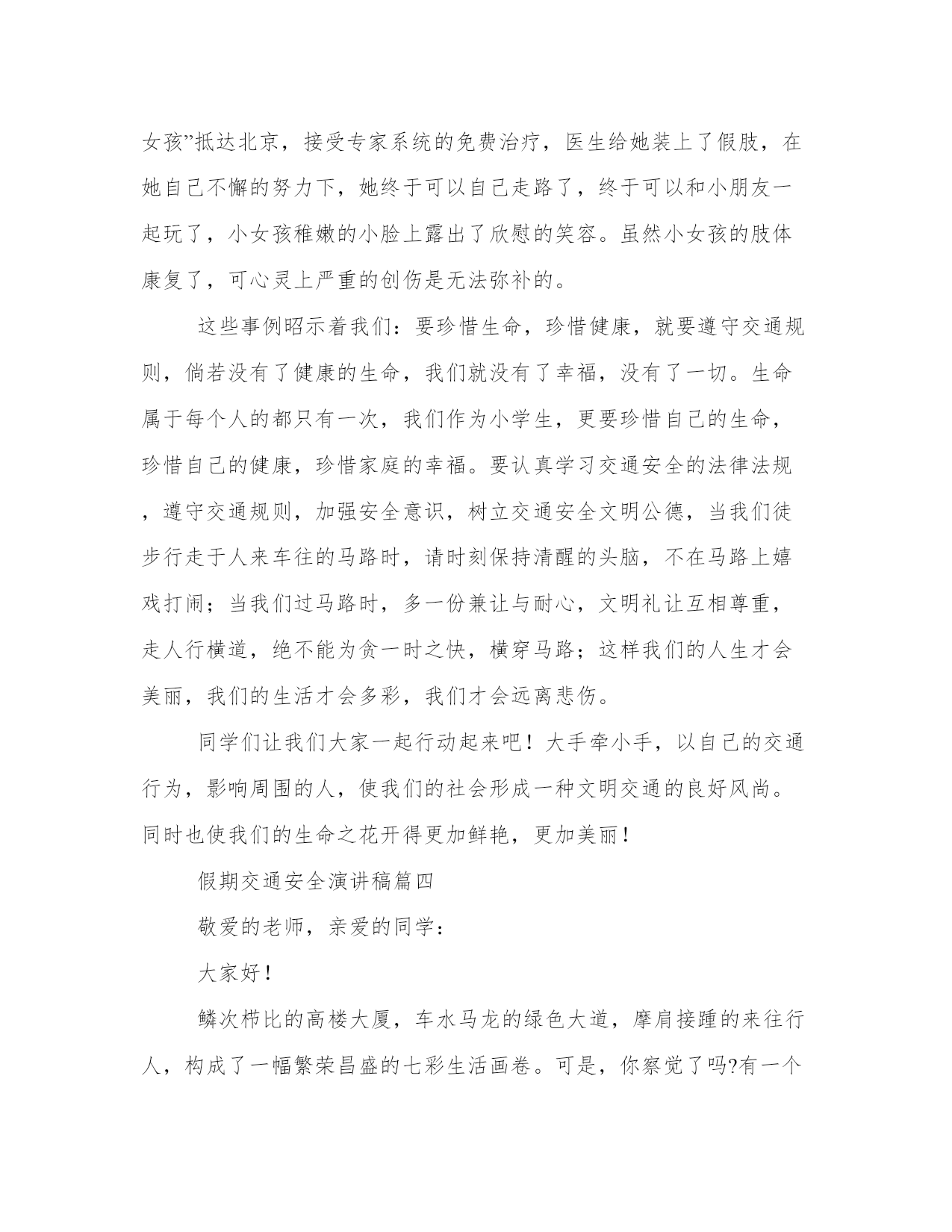 假期交通安全演讲稿(12篇)要写好演讲稿,首先必须要了解听众对象,了解他们的心理、愿望和要求是什么,使演讲有针对性,能解决实际问题。优质的演讲稿该怎么样去写呢?以下是我帮大家整理的演讲稿模板范文,欢迎大家借鉴与参考,希望对大家有所帮助。假期交通安全演讲稿篇一大家下午好:随着经济繁荣的发展,交通事业猛发达,车辆川流不息地在公路上行驶,交通事故时常走进我们的生活,直接应对,而无法回避。所以,交通安全,人人须知,而我就有过这样的经历。记得有一个晚上,爸爸刚喝过酒,就准备坐摩托车回家,我和妈妈坐在爸爸驾驶的摩托车上,就在行驶过程中,一辆轿车开了过来,前面出现一个坑,由于爸爸的车速过快,来了一个急刹,就在那一刹那,爸爸把方向盘拐了一下,迎面正好开来一辆大货车,“咚。”的一声,辆车相撞了,当时,我可吓坏了,这是关系到我们一家人的生命安全呀!这次幸好没有出什么大事,只是我和爸爸的额头破了一点皮,妈妈的脚拐了一下,但也给了我很大的启示,让我懂得了酒后不能驾驶车辆,如果稍微有一点失误,就有可能丧失生命。小朋友们,我们在玩耍的时候,千万不能到通行的公路边去玩,这样也会出现交通事故的,在我的印象中有这么一件事。那是一个阳光明媚的早晨,一个四年级的学生在路边踢毽子,毽子掉在马路中间去了,她跑去捡,就在她玩得高兴的时候,一辆卡车迎面驶来,便毫不留情地从她身上压过去,就在这短暂的一刹那,她丧失了宝贵的生命。可想而知,她此刻已读四年级了,父母用自我的心血把她养大,最终却招来这样的结果,你说,这是一个人的命运吗不是的,这并不是你所想的那样。命运给每个人的待遇都相同的,这要看你自我怎样去应对,怎样去珍惜,交通安全对我们来说太重要了。作为一名即将小学毕业的学生,我想告诉大家:只要我们人人遵守交通规则,学习交通有关知识,必须会让那些感到遗憾的事故一件件地消失。交通安全不是针对某一个人,而是针对所有的人,它让我们明白:我们必须学习和遵守交通规则,做到高高兴兴上学,平平安安回家。人的生命是短暂的,一去不返,它就像一只小小的贝壳,在大海中遨游,一路总是有一些坎坷。我们要敲响交通安全的警钟,永远铭记血的教训,学习交通全知识,遵守交通规则,提高交通安全意识,让生命之树矗立挺拔。假期交通安全演讲稿篇二今天,市交警大队为我们全校师生讲了关于交通安全知识的讲座。从“坐公交车、走文明路、骑车的注意事项”等几个方面,用身边血淋淋的事实,深入浅出地给我们上了生动的一课。首先坐公交车时要先下后上,遇到老弱残孕和抱小孩的,应该主动让座。乘车时不要将头、手伸出窗外;过马路时要先看左再看右,看清两边再走。不要在马路上奔跑、打闹,要走斑马线;不到12岁的儿童不能在马路上骑自行车。而且要求全体同学做到以下几点:1.树立安全意识:加强安全素质不仅仅意味着要善待生命,更重要的是对健康意识、风险意识、防范意识、科学意识和守法意识的学习和提高。2.熟悉安全知识:了解生活安全、公共安全以及自然灾害等方面的安全知识。懂得什么是危险因素,哪里是危险场所,如何预防危险的发生以及发生事故后如何应对。3.掌握安全技能:掌握现代社会中安全生活和生产的基本技能。如报警电话的拨打,灭火器的使用,公共场所遇险的正确逃生,事故发生时的应急方法和技能。生命对于每个人都只有一次,幸福寄希望于安全,安全又给予我们无限美好地幸福。只要我们牢记安全,就能够时刻沐浴在幸福的阳光之中,享受安全.幸福的乐趣。通过这次讲座我校全体师生的法律意识进一步提高了,同学们纷纷表示“珍爱生命——从我做起、从现在做起”做一名合格守法的小公民。假期交通安全演讲稿篇三各位领导、各位同学:下午好!谁不希望有个完整的家?谁不希望自己有婀娜的仪态?谁不希望能够愉快的渡过自己的花季一般灿烂的岁月?这对于大多数人来说是一件并不难的事情,然而这一切对于一个被车祸毁于一旦的家庭来说有多难啊!她,本是一个活泼开朗、天真可爱的小女孩,和其它的小朋友一样拥有幸福快乐的童年,拥有灿烂的微笑,可就是在她与同伴过马路的一刹那,就在司机没有集中精力开车的一瞬间,在这触目惊心的一刻,车从她的腿上一下子碾了过去,鲜红的血迹染红了马路,剧烈的疼痛使她晕了过去,失去了知觉,医生对她的父母说:“要命还是要腿!”她的家人为了让她活下去,只好让医生为她做了截肢手术,同时这场车祸的肇事者也受到了法律的制裁。剧烈的疼痛使女孩从昏迷中醒来,她使劲睁开双眼,朦朦胧胧中女孩下意识地摸摸双腿,顿时眼前一黑,眼泪夺眶而出,大声哭喊道:“爸爸妈妈救救我,我的腿呢?我的腿到哪里去了?我的腿呢?”爸爸妈妈与女孩哭着抱在一起,一家人似乎已经绝望了。顿感天塌地陷,一切变得灰暗。到了该上学的时候,女孩哭着闹着要上学,父母看着这一切,心都碎了。爸爸无奈只好用一个篮球支撑她那娇小的身体