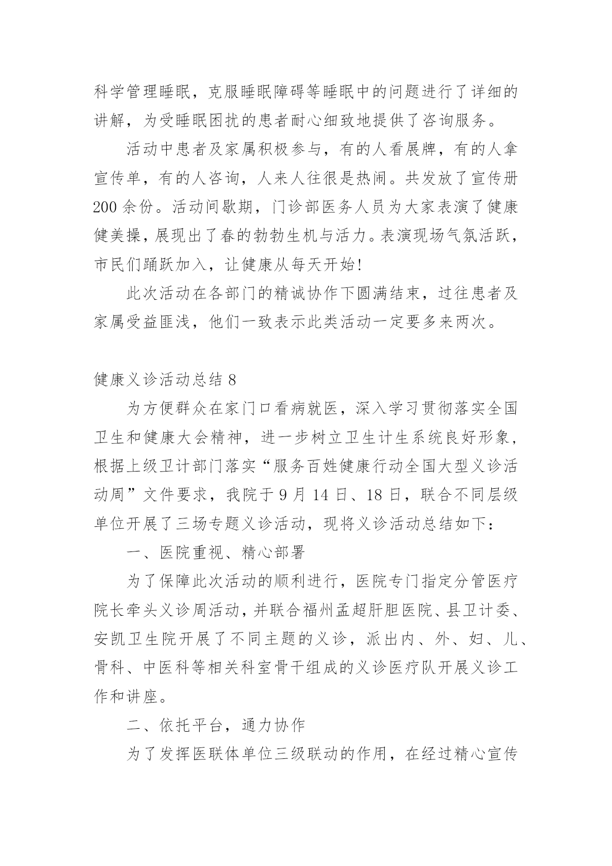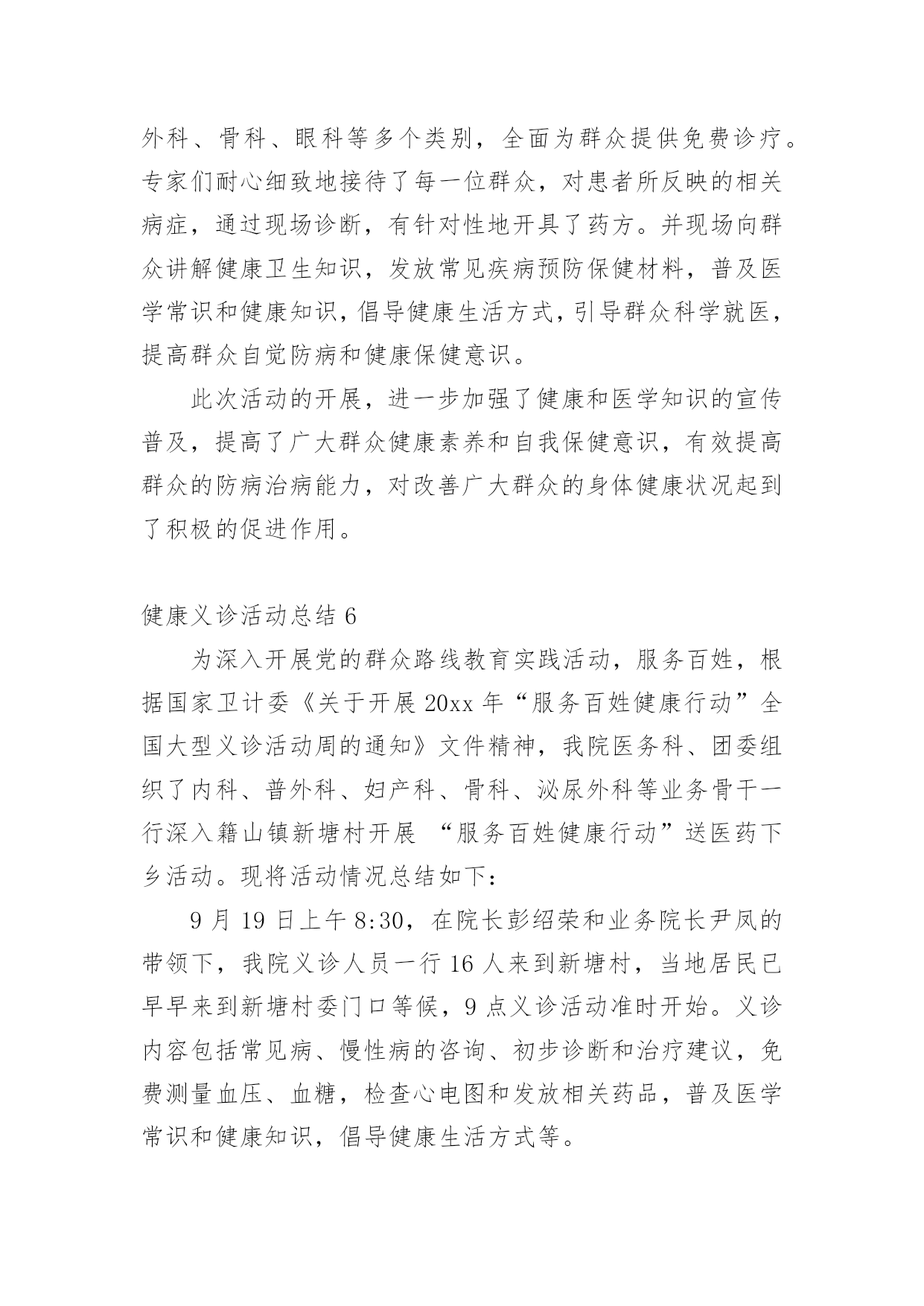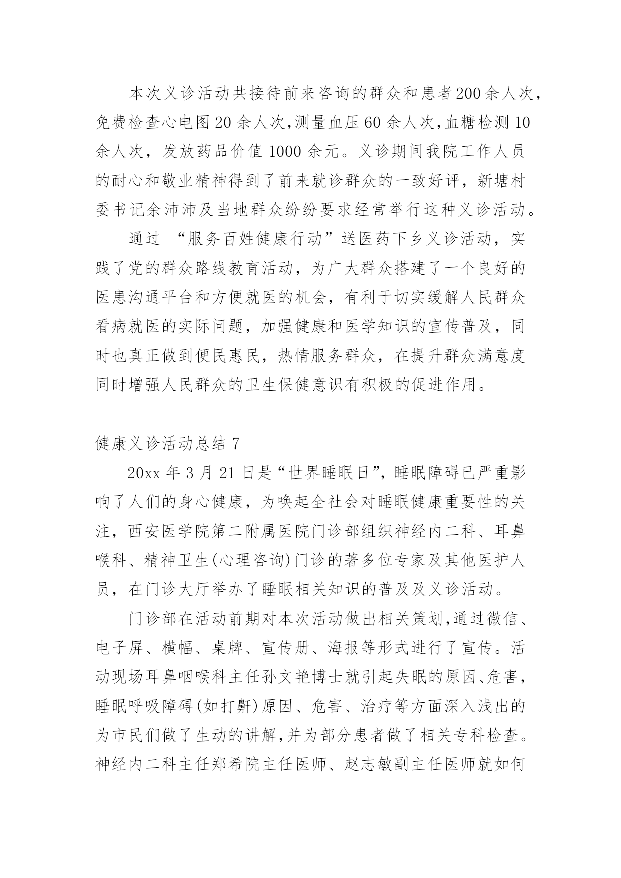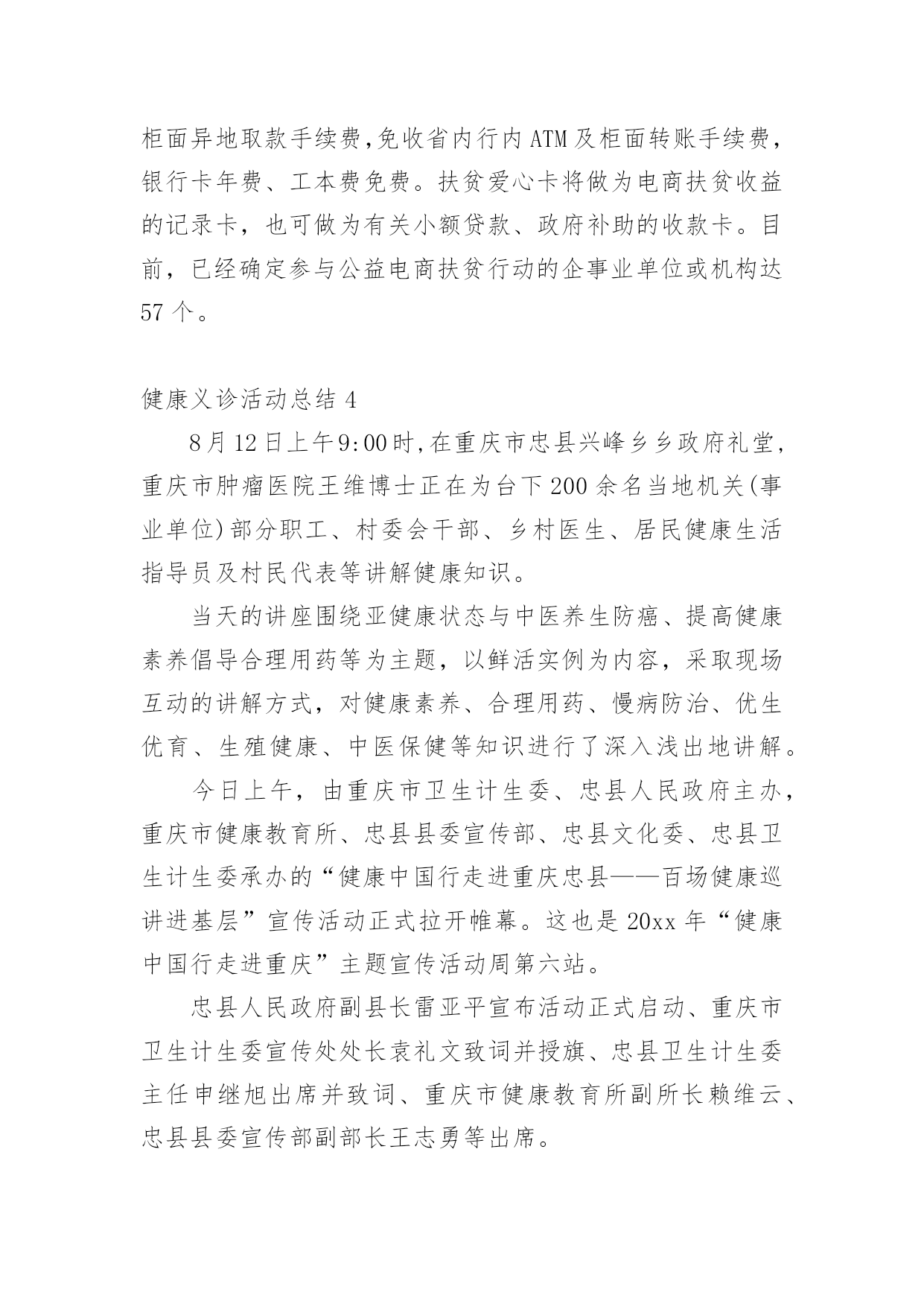 健康义诊活动总结健康义诊活动总结(14篇)总结是指对某一阶段的工作、学习或思想中的经验或情况加以总结和概括的书面材料,它可以帮助我们有寻找学习和工作中的规律,不如静下心来好好写写总结吧。总结你想好怎么写了吗?下面是小编整理的健康义诊活动总结,希望对大家有所帮助。健康义诊活动总结18月10日,呼和浩特市玉泉区五塔前街社区开展“关爱健康”义诊活动。此次活动由五塔前街社区、呼市祥瑞便民服务中心、五洲女子医院联合举办,吸引了辖区30多名居民参与。内蒙古晨报全媒体记者获悉,此次义诊涉及全科医生咨询、测量血压、妇科检查、B超等项目。活动现场,医生们各司其职,认真为居民们答疑解惑、排查病症。“方便居民是我们社区的宗旨,替居民办好事、办实事也是我们一直努力在做的工作。这次社区义诊活动,不仅使辖区居民在家门口享受到咨询服务和健康检查,还增强了他们科学防病养生的健康意识,增进了社区与居民之间的沟通联系。”玉泉区五塔前街社区主任杨佳奇表示。据了解,此次活动是五塔前街社区众多惠民项目活动之一。此外,作为亮点服务的“一站式邮政便民缴费平台”的上线,将为社区居民日常缴纳电费、煤气费、电话费等提供更多便捷服务。健康义诊活动总结2根据市卫计委《关于开展20xx年“服务百姓健康行动”大型义诊活动周的通知》精神,为进一步深入开展党的群众路线教育实践活动,xx区卫生局在辖区范围内开展了“服务百姓健康行动”大型义诊活动,现将情况总结如下:xx区卫生局医政科组织的义诊活动于20xx年9月25日在xx区xx广场举行。8:30之前参加义诊的医疗机构到达现场准备就绪,9:00义诊活动准时开始。此次活动分别在省中医附属医院、xx区人民医院等辖区共15家医疗机构中派出人员,副高以上职称特色专科专家18人及医务人员共计70余人为辖区内1500余名社区群众进行了义诊及健康咨询。活动中,专家们为前来咨询的群众免费测血压、测血糖,热情细致的为群众进行各种常见病、慢性病的初步筛查、诊断和一般治疗,尤其省中医的两位专家为每一位前来咨询的患者细心诊断,给出专业的建议,医疗水平得到群众认可,现场看病的群众排起了长龙。活动中共发放常见传染病防控知识手册、计划生育服务指南及健康教育处方等宣传材料近10000份,义诊期间减免患者费用50000余元。本次义诊活动紧紧围绕创服务百姓、创先争优活动、医院提升服务能力等要求,在各级医疗机构的大力支持下,取得了良好的效果,为百姓提高个人健康保健意识提供了很好的平台,使百姓们了解到自己的健康状况,同时了解未病先防、既病防变的治疗理念,取得了满意效果。健康义诊活动总结310月17日是第三个全国扶贫日。江西省扶贫和移民办日前召开新闻发布会宣布,启动“全国扶贫日”系列活动,重点开展电商、健康等扶贫公益行动,推动社会各方资源向农村贫困人口汇聚整合。17日,全省有300余家省市县级医疗机构、1100余支医疗队、万名医疗专家到定点帮扶贫困乡村或辖区内贫困乡村进行义诊,助力健康扶贫。全省1100余支医疗队下乡义诊国家最新调查数据显示,全国因病致贫返贫的人数占建档立卡贫困户的44.1%,我省因病致贫占总贫困户数的比例由20xx年的57.1%下降至20xx年的44.4%,因病致贫户数比五年前降了12.7%,在各种致贫原因中,因病致贫仍然最为突出。在全国第三个扶贫日到来之际,全省同步启动全省大型义诊活动,动员省、市、县三级医院组派医疗队到医院定点帮扶贫困乡村或辖区内贫困乡村进行义诊活动,确保全省每个贫困村所在的乡镇义诊活动全覆盖。预计全省有300余家省市县级医疗机构、1100余支医疗队、近万名医疗专家参加义诊活动。除了定点义诊外,我省还开展定点扶贫公益行动,帮助一批贫困户解决吃穿难、上学难、就医难、住房难等困难,扶助贫困户脱贫消号。我省2人荣获全国脱贫攻坚奖16日在北京举行的全国脱贫攻坚奖表彰大会上出现了2名江西人的身影。一个是全国脱贫攻坚奖“奋进奖”获得者——瑞金市壬田镇凤岗村农民廖秀英,一个是全国脱贫攻坚奖“贡献奖”获得者——九江市人民检察院原调研员王晓阳。廖秀英今年84岁,是红军烈士的后代,有腌制咸鸭蛋的好手艺。通过江西电商脱贫工程的扶持,在网上销售“廖奶奶咸鸭蛋”,成为畅销产品。她动员周边贫困户一起成立“廖奶奶咸鸭蛋合作社”,帮助32户贫困户社员年均增收2万余元。王晓阳今年71岁,曾是一名基层检察院检察长,20xx年从领导岗位退下来后主动请缨扶贫,拖着患糖尿病的身子先后在4个贫困村驻村帮扶,帮助近百个建档立卡贫困户实现增收脱贫,被当地村民称赞为焦裕禄式的好干部。持扶贫联名卡可享“六免”政策本月14日至26日,省邮政分公司牵头组织开展电商扶贫公益行动。目前我省邮政部门已经上线扶贫农产品135款,覆盖110个贫困村,关联上万名贫困户,所有农产品全部来自贫困户或扶贫产业。同时