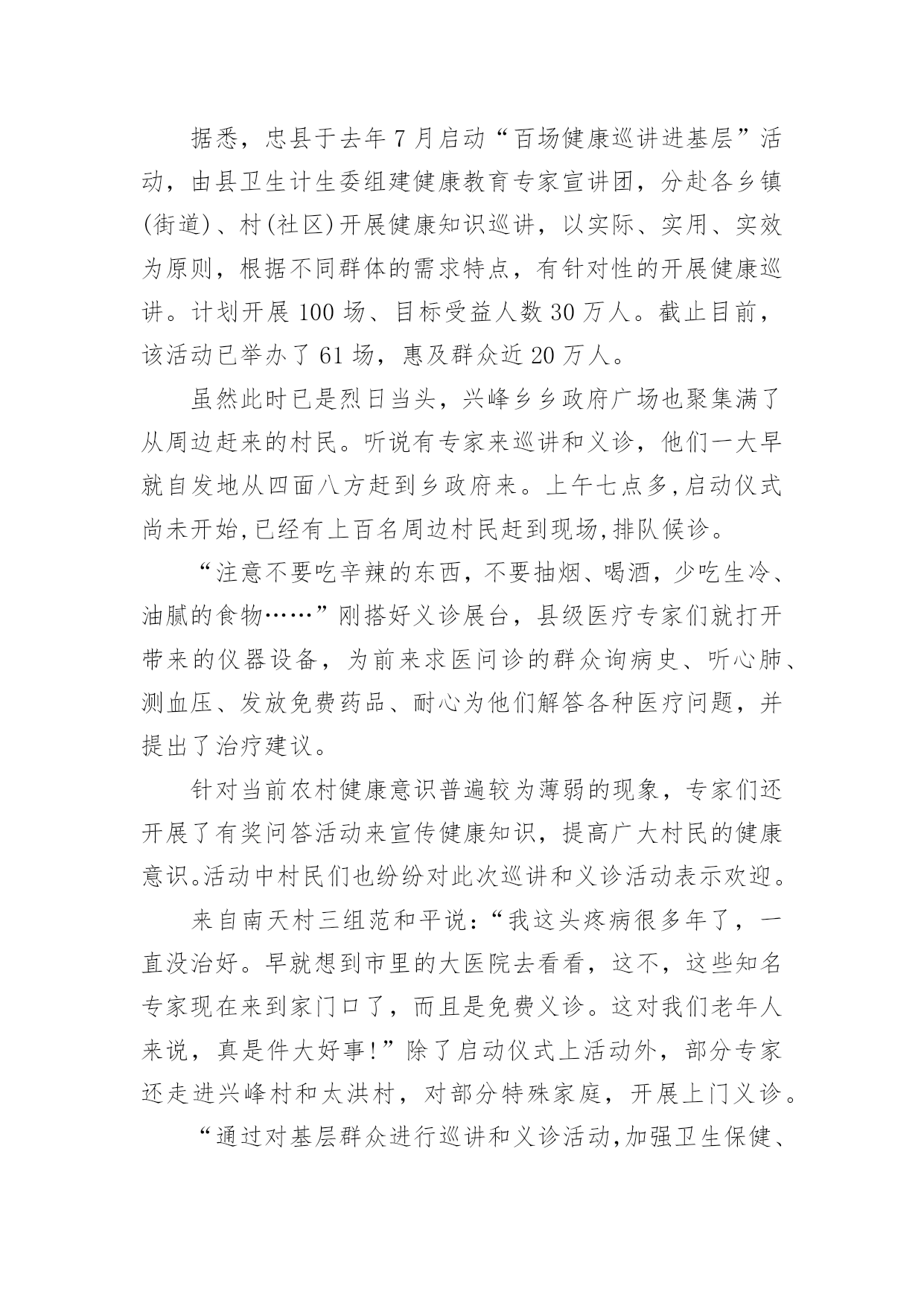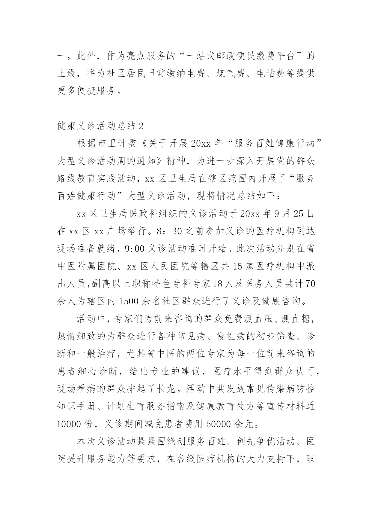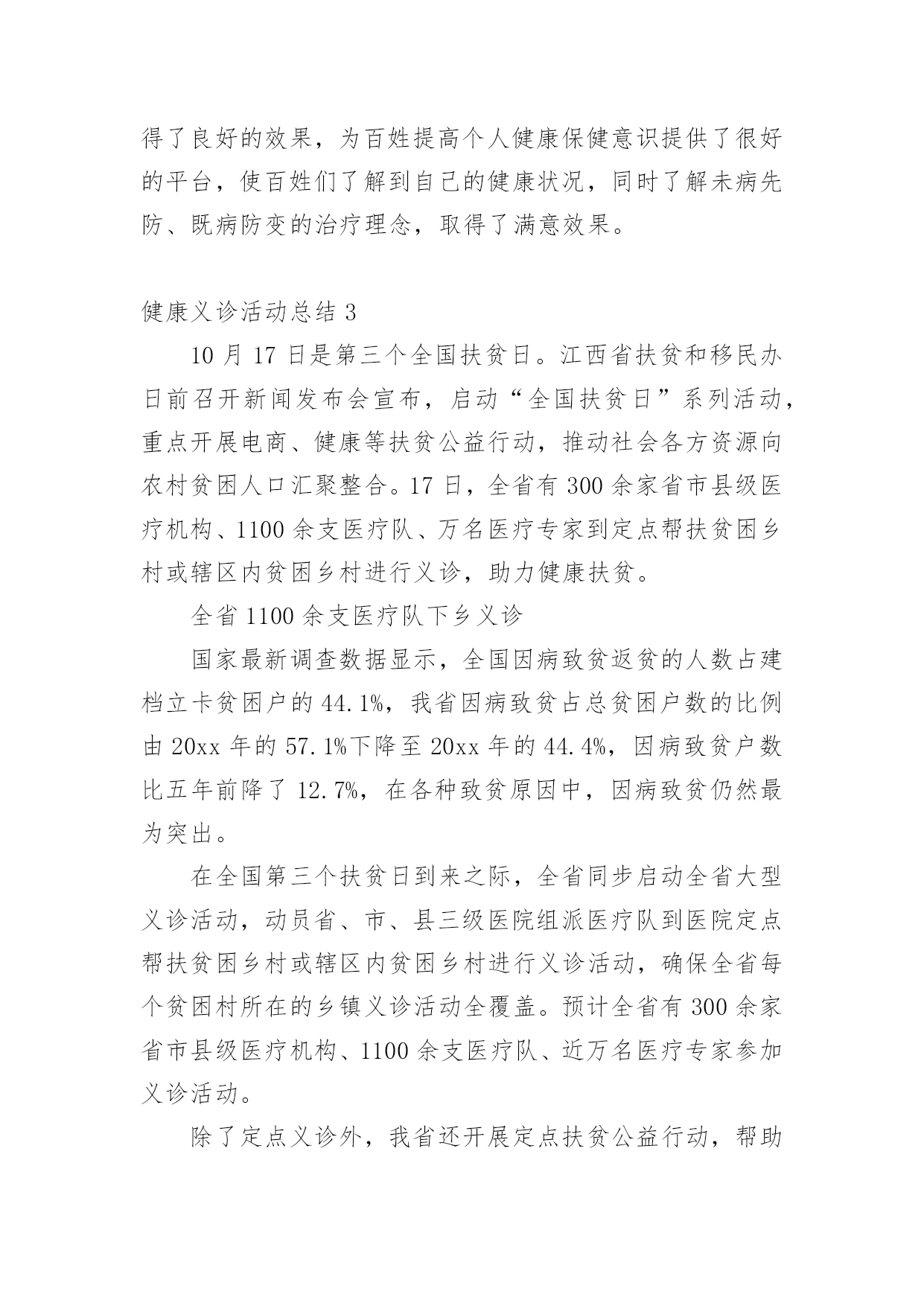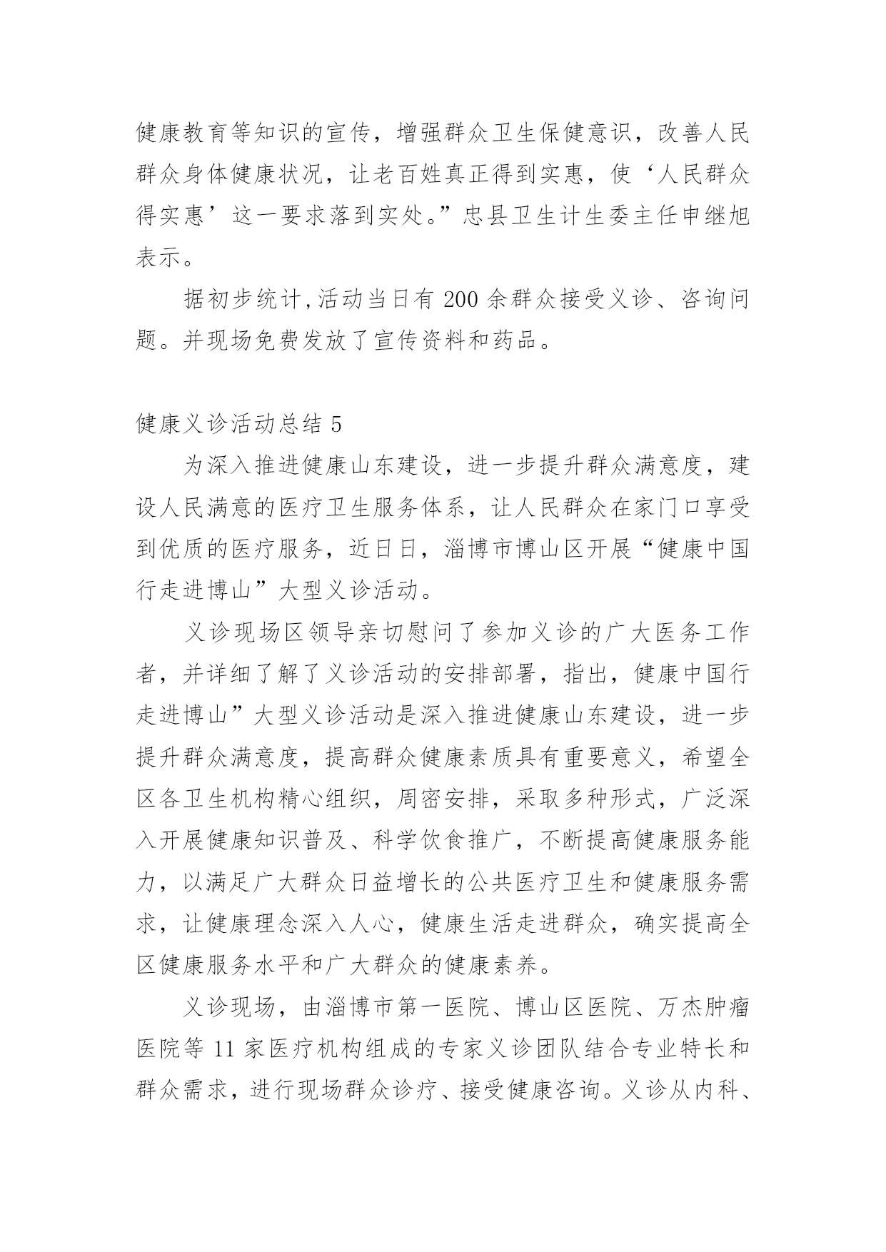 健康义诊活动总结健康义诊活动总结(14篇)总结是指对某一阶段的工作、学习或思想中的经验或情况加以总结和概括的书面材料,它可以帮助我们有寻找学习和工作中的规律,不如静下心来好好写写总结吧。总结你想好怎么写了吗?下面是小编整理的健康义诊活动总结,希望对大家有所帮助。健康义诊活动总结18月10日,呼和浩特市玉泉区五塔前街社区开展“关爱健康”义诊活动。此次活动由五塔前街社区、呼市祥瑞便民服务中心、五洲女子医院联合举办,吸引了辖区30多名居民参与。内蒙古晨报全媒体记者获悉,此次义诊涉及全科医生咨询、测量血压、妇科检查、B超等项目。活动现场,医生们各司其职,认真为居民们答疑解惑、排查病症。“方便居民是我们社区的宗旨,替居民办好事、办实事也是我们一直努力在做的工作。这次社区义诊活动,不仅使辖区居民在家门口享受到咨询服务和健康检查,还增强了他们科学防病养生的健康意识,增进了社区与居民之间的沟通联系。”玉泉区五塔前街社区主任杨佳奇表示。据了解,此次活动是五塔前街社区众多惠民项目活动之一。此外,作为亮点服务的“一站式邮政便民缴费平台”的上线,将为社区居民日常缴纳电费、煤气费、电话费等提供更多便捷服务。健康义诊活动总结2根据市卫计委《关于开展20xx年“服务百姓健康行动”大型义诊活动周的通知》精神,为进一步深入开展党的群众路线教育实践活动,xx区卫生局在辖区范围内开展了“服务百姓健康行动”大型义诊活动,现将情况总结如下:xx区卫生局医政科组织的义诊活动于20xx年9月25日在xx区xx广场举行。8:30之前参加义诊的医疗机构到达现场准备就绪,9:00义诊活动准时开始。此次活动分别在省中医附属医院、xx区人民医院等辖区共15家医疗机构中派出人员,副高以上职称特色专科专家18人及医务人员共计70余人为辖区内1500余名社区群众进行了义诊及健康咨询。活动中,专家们为前来咨询的群众免费测血压、测血糖,热情细致的为群众进行各种常见病、慢性病的初步筛查、诊断和一般治疗,尤其省中医的两位专家为每一位前来咨询的患者细心诊断,给出专业的建议,医疗水平得到群众认可,现场看病的群众排起了长龙。活动中共发放常见传染病防控知识手册、计划生育服务指南及健康教育处方等宣传材料近10000份,义诊期间减免患者费用50000余元。本次义诊活动紧紧围绕创服务百姓、创先争优活动、医院提升服务能力等要求,在各级医疗机构的大力支持下,取得了良好的效果,为百姓提高个人健康保健意识提供了很好的平台,使百姓们了解到自己的健康状况,同时了解未病先防、既病防变的治疗理念,取得了满意效果。健康义诊活动总结310月17日是第三个全国扶贫日。江西省扶贫和移民办日前召开新闻发布会宣布,启动“全国扶贫日”系列活动,重点开展电商、健康等扶贫公益行动,推动社会各方资源向农村贫困人口汇聚整合。17日,全省有300余家省市县级医疗机构、1100余支医疗队、万名医疗专家到定点帮扶贫困乡村或辖区内贫困乡村进行义诊,助力健康扶贫。全省1100余支医疗队下乡义诊国家最新调查数据显示,全国因病致贫返贫的人数占建档立卡贫困户的44.1%,我省因病致贫占总贫困户数的比例由20xx年的57.1%下降至20xx年的44.4%,因病致贫户数比五年前降了12.7%,在各种致贫原因中,因病致贫仍然最为突出。在全国第三个扶贫日到来之际,全省同步启动全省大型义诊活动,动员省、市、县三级医院组派医疗队到医院定点帮扶贫困乡村或辖区内贫困乡村进行义诊活动,确保全省每个贫困村所在的乡镇义诊活动全覆盖。预计全省有300余家省市县级医疗机构、1100余支医疗队、近万名医疗专家参加义诊活动。除了定点义诊外,我省还开展定点扶贫公益行动,帮助一批贫困户解决吃穿难、上学难、就医难、住房难等困难,扶助贫困户脱贫消号。我省2人荣获全国脱贫攻坚奖16日在北京举行的全国脱贫攻坚奖表彰大会上出现了2名江西人的身影。一个是全国脱贫攻坚奖“奋进奖”获得者——瑞金市壬田镇凤岗村农民廖秀英,一个是全国脱贫攻坚奖“贡献奖”获得者——九江市人民检察院原调研员王晓阳。廖秀英今年84岁,是红军烈士的后代,有腌制咸鸭蛋的好手艺。通过江西电商脱贫工程的扶持,在网上销售“廖奶奶咸鸭蛋”,成为畅销产品。她动员周边贫困户一起成立“廖奶奶咸鸭蛋合作社”,帮助32户贫困户社员年均增收2万余元。王晓阳今年71岁,曾是一名基层检察院检察长,20xx年从领导岗位退下来后主动请缨扶贫,拖着患糖尿病的身子先后在4个贫困村驻村帮扶,帮助近百个建档立卡贫困户实现增收脱贫,被当地村民称赞为焦裕禄式的好干部。持扶贫联名卡可享“六免”政策本月14日至26日,省邮政分公司牵头组织开展电商扶贫公益行动。目前我省邮政部门已经上线扶贫农产品135款,覆盖110个贫困村,关联上万名贫困户,所有农产品全部来自贫困户或扶贫产业。同时