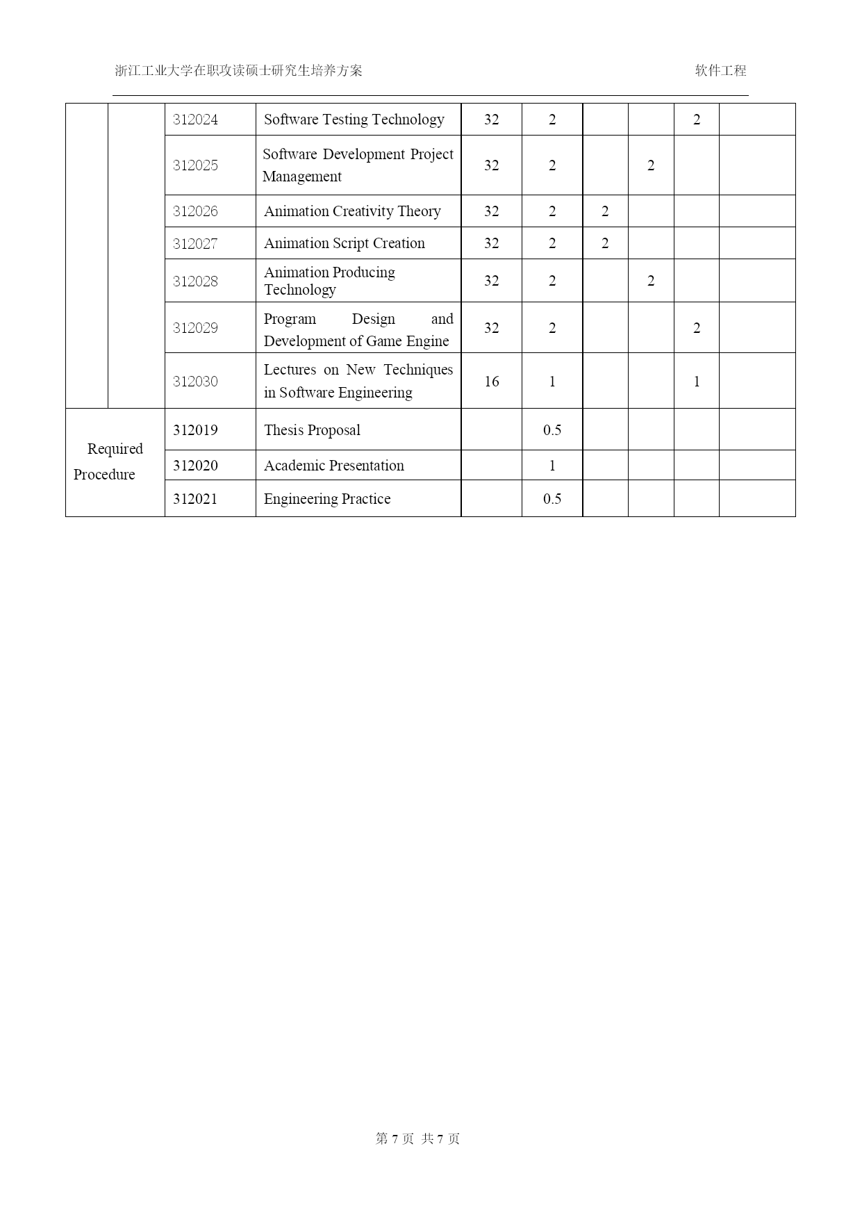 浙江工业大学在职攻读硕士研究生培养方案软件工程第页共NUMPAGES7页计算机科学与技术学院、软件学院软件工程领域培养方案概述本学位点依托浙江省重点学科——计算机软件与理论学科,现有教授18人,副教授17人。本学位点近3年来承担了国家重点基础研究发展规划项目(国家973课题)、国家高科技计划项目(国家863课题)、国家自然科学基金、国家教育部重点研究项目、浙江省自然科学基金项目、浙江省科技计划项目等30多项,科研经费近2,000万元,在各种核心刊物上发表论文300余篇。获得省科技进步二、三等奖,省政府教学成果奖,省教委科技进步二等奖等多项重要成果。本学位点和与北京航空航天大学、中国科学院遥感研究所、中国科学院地理研究所、美国辛辛那提大学、英国拉夫堡大学、瑞典布莱津工学院、IBM公司、杭州国家软件基地、杭州国家动画基地、杭州国家数字娱乐产业基地等单位在科研和联合培养研究生方面开展合作。一、培养目标软件工程领域工程硕士的培养目标是面向国民经济信息化建设和发展的需要、面向企事业单位对软件工程技术人才的需求,培养高层次实用型、复合型软件工程技术和软件工程管理人才。具体要求为:较好地掌握马克思主义、毛泽东思想和邓小平理论;拥护党的基本路线和方针、政策;热爱祖国、遵纪守法,具有良好的职业道德和创业精神,积极为我国经济建设和社会发展服务。掌握软件工程领域扎实的基础理论和宽广的专业知识;具有很强的工程实践能力,具备运用先进的工程化方法、技术和工具从事软件分析、设计、开发、维护等工作的能力,以及工程项目的组织与管理能力、团队协作能力、技术创新能力和市场开拓能力。掌握一门外语,具备良好的阅读、理解和撰写外语资料的能力和进行国际化交流的能力。二、研究方向1.软件设计与高级开发技术2.软件工程技术3.信息安全技术4.计算机网络技术及应用5.嵌入式软件技术6.电子政务和电子商务7.计算机智能系统8.企业信息化9.计算机控制与管理系统10.软件分析与测试技术11.软件质量保证12.信息管理与信息系统13.数字媒体技术14.无线传感网络、物联网15.软件项目管理三、培养方式及学习期限在职攻读工程硕士专业学位的研究生采取在职学习的方式,课程学习实行学分制。修业年限2~5年,基本学制为3年,其中在校学习的时间累计不少于6个月。四、课程设置与学分要求工程硕士研究生课程由学位课、非学位课和必修环节三部分组成,实行学分制。攻读工程硕士专业学位的研究生,应获得的总学分不少于32学分,其中学位课学分不少于21学分。具体详见课程设置一览表。五、培养过程实施1.制订个人培养计划攻读工程硕士专业学位的研究生入学后,在导师指导下根据本领域培养方案和研究生本人的具体情况制定个人培养计划,经学院负责人审定后实施。2.中期考核攻读工程硕士专业学位的研究生课程学习结束后,需填写《浙江工业大学研究生中期考核表》,由学院进行中期考核。中期考核内容主要包括思想品德、课程学习、开题报告情况等,中期考核合格后方可进入学位论文阶段。3.开题报告工程硕士论文选题应直接来源于生产实际或具有明确的工程背景,其研究成果要有实际应用价值,论文拟解决的问题要有一定的技术难度和工作量,论文要具有一定的理论深度和先进性,能体现研究生综合运用科学理论、方法和技术手段解决工程实际问题的能力。具体可从以下几个方面选取:技术攻关、技术改造、技术推广与应用;新工艺、新材料、新产品、新设备的研制与开发;引进、消化、吸收和应用国外先进技术项目;应用基础性研究、预研专题;一个较为完整的工程技术项目或工程管理项目的规划或研究;工程设计与实施。攻读工程硕士专业学位的研究生应在学校导师与企业导师的共同指导下进行论文选题工作,通过查阅有关文献资料,掌握课题研究领域国内外最新发展动态,以保证选题的实用性和先进性。选题后需做开题报告,并填写《浙江工业大学研究生学位论文开题报告申请表》,经由三至五人组成的专家小组审议通过后,方可进行论文工作。论文应具有一定的工作量,一般选题确定后,用于论文工作的时间不少于一学年。4.论文中期检查论文工作阶段实行研究生定期汇报检查制度。研究生在论文工作期间,应定期向导师汇报论文进展,包括论文工作的进展情况和取得的成果,下一阶段的论文工作安排,对论文技术难点及工作成果的评价等。5.学位论文工程硕士学位论文必须在导师的指导下由研究生本人独立完成。学位论文由校内具有工程实践经验的导师与工矿企业或工程部门经单位推荐的业务水平高、责任心强的具有高级技术职称的人员联合指导,来自企业的导师由学校按程序办理聘任手续。学位论文要求能综合运用基础理论、科学方法、专业知识和技术手段对工程实际问题进行分析研究,并能在某方面提出独立见解;论文写作要