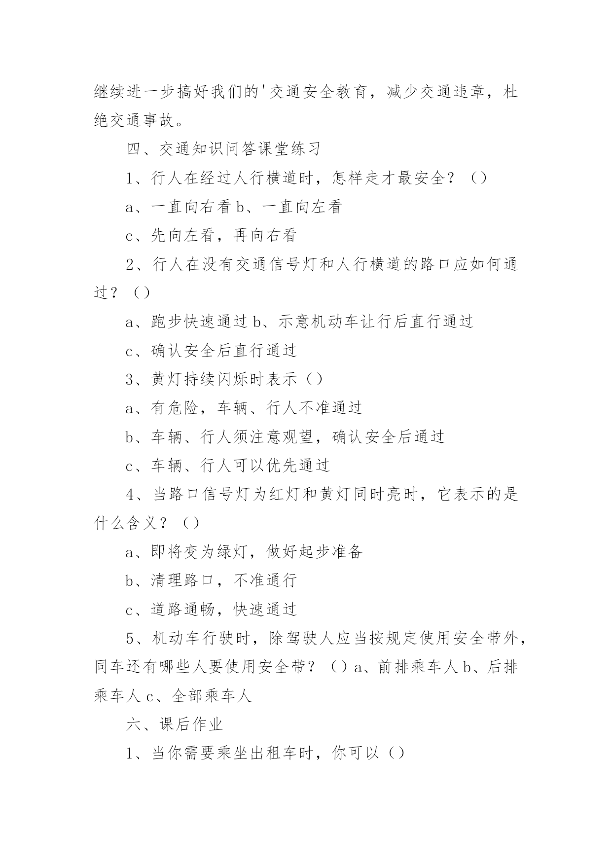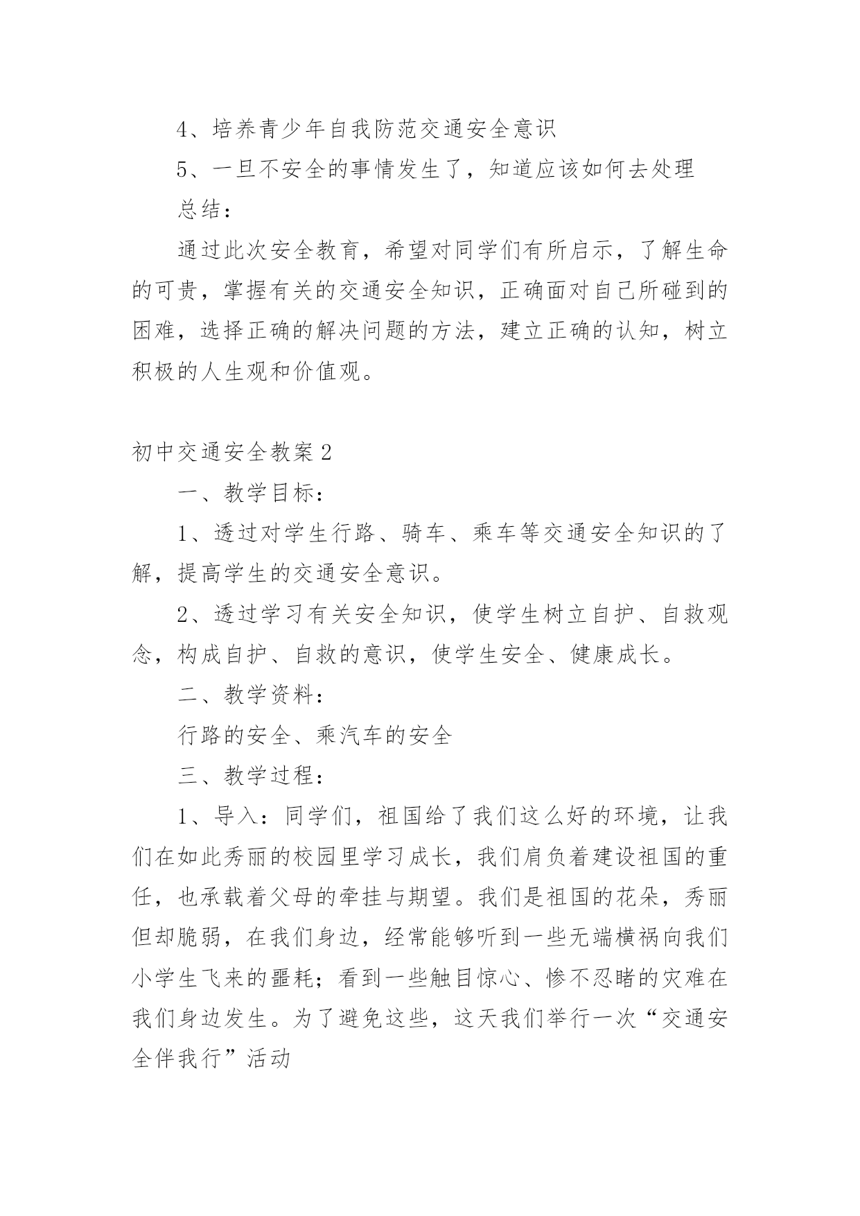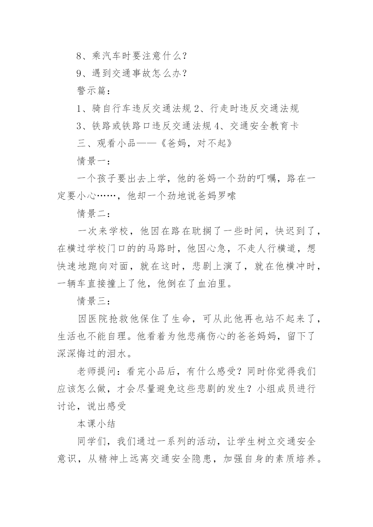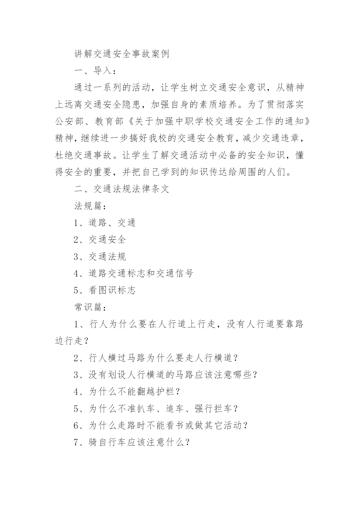 初中交通安全教案初中交通安全教案9篇作为一名优秀的教育工作者,常常需要准备教案,通过教案准备可以更好地根据具体情况对教学进程做适当的必要的调整。教案要怎么写呢?以下是小编收集整理的初中交通安全教案,仅供参考,希望能够帮助到大家。初中交通安全教案1教学目标:1、通过交通安全的教育使学生了解生命的可贵,掌握有关的交通安全知识,认清学习目的,增强学生安全意识2、引导学生在活动中认识生命的意义,在自我体验中发挥潜能,丰富自我生命,提升生命意义。热爱生命、保护生命3、为加强对学生法制与交通安全的教育与管理,使学生增加法制观念,做到懂法、知法、守法,确保身心健康,平安完成学业,教学重点:让学生知道各种常见的交通信号、标志和标线,知道有关交通常识,懂得应自觉遵守交通规则。教学难点:加强交通法规知识的学习,遵守交通法规教学过程:讲解交通安全事故案例一、导入:通过一系列的活动,让学生树立交通安全意识,从精神上远离交通安全隐患,加强自身的素质培养。为了贯彻落实公安部、教育部《关于加强中职学校交通安全工作的通知》精神,继续进一步搞好我校的交通安全教育,减少交通违章,杜绝交通事故。让学生了解交通活动中必备的安全知识,懂得安全的重要,并把自己学到的知识传达给周围的人们。二、交通法规法律条文法规篇:1、道路、交通2、交通安全3、交通法规4、道路交通标志和交通信号5、看图识标志常识篇:1、行人为什么要在人行道上行走,没有人行道要靠路边行走?2、行人横过马路为什么要走人行横道?3、没有划设人行横道的马路应该注意哪些?4、为什么不能翻越护栏?5、为什么不准扒车、追车、强行拦车?6、为什么走路时不能看书或做其它活动?7、骑自行车应该注意什么?8、乘汽车时要注意什么?9、遇到交通事故怎么办?警示篇:1、骑自行车违反交通法规2、行走时违反交通法规3、铁路或铁路口违反交通法规4、交通安全教育卡三、观看小品——《爸妈,对不起》情景一:一个孩子要出去上学,他的爸妈一个劲的叮嘱,路在一定要小心……,他却一个劲地说爸妈罗嗦情景二:一次来学校,他因在路在耽搁了一些时间,快迟到了,在横过学校门口的的马路时,他因心急,不走人行横道,想快速地跑向对面,就在这时,悲剧上演了,就在他横冲时,一辆车直接撞上了他,他倒在了血泊里。情景三:因医院抢救他保住了生命,可从此他再也站不起来了,生活也不能自理。他看着为他悲痛伤心的爸爸妈妈,留下了深深悔过的泪水。老师提问:看完小品后,有什么感受?同时你觉得我们应该怎么做,才会尽量避免这些悲剧的发生?小组成员进行讨论,说出感受本课小结同学们,我们通过一系列的活动,让学生树立交通安全意识,从精神上远离交通安全隐患,加强自身的素质培养。继续进一步搞好我们的'交通安全教育,减少交通违章,杜绝交通事故。四、交通知识问答课堂练习1、行人在经过人行横道时,怎样走才最安全?()a、一直向右看b、一直向左看c、先向左看,再向右看2、行人在没有交通信号灯和人行横道的路口应如何通过?()a、跑步快速通过b、示意机动车让行后直行通过c、确认安全后直行通过3、黄灯持续闪烁时表示()a、有危险,车辆、行人不准通过b、车辆、行人须注意观望,确认安全后通过c、车辆、行人可以优先通过4、当路口信号灯为红灯和黄灯同时亮时,它表示的是什么含义?()a、即将变为绿灯,做好起步准备b、清理路口,不准通行c、道路通畅,快速通过5、机动车行驶时,除驾驶人应当按规定使用安全带外,同车还有哪些人要使用安全带?()a、前排乘车人b、后排乘车人c、全部乘车人六、课后作业1、当你需要乘坐出租车时,你可以()a、站在机动车道上拦乘b、站在路口拦乘c、站在人行道上拦乘2、当机动车停在机动车道上时,你应当怎样上下车?()a、从机动车左侧下车b、从机动车右侧上下车c、只要不妨碍其他车辆和行人通行,左右侧上下车都可以3、小红在等候乘坐公共汽车时,应该站在(),依次排队a。机动车道上b。站台或指定位置c。非机动车道上d。人行道上4、小杨每天都经过铁路道口,他在经过铁路道口时应该()a。快速跨越铁轨b。进入到口,观察后通过c。一停,二看,三通过d。在栏杆放下时抢先通过5、明明在晚自习课后骑自行车回家途中,迎面遇到一辆驶来的汽车,灯光非常耀眼,为了安全明明应该()a。用手遮挡风光b。闭目缓慢形式c。下车靠边避让d。迎着灯光行驶七、应采取的措施1、提高学生交通安全意识2、知道交通安全有些行为是不安全的3、引导青少年树立正确的价值观、人生观、择业观4、培养青少年自我防范交通安全意识5、一旦不安全的事情发生了,知道应该如何去处理总结:通过此次安全教育,希望对同学们有所启示,了解生命的可贵,掌握有关的交通安全知识,正确面对自己所碰到的困难,选择正确的解决问题的方法,建立正确的认知,树立积极的人生观和价值观。初中交通安全教案2一