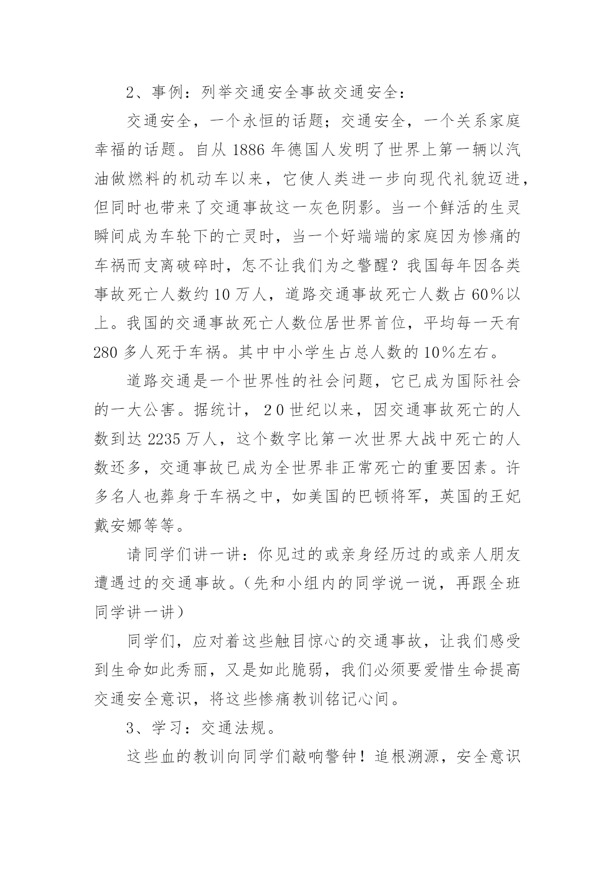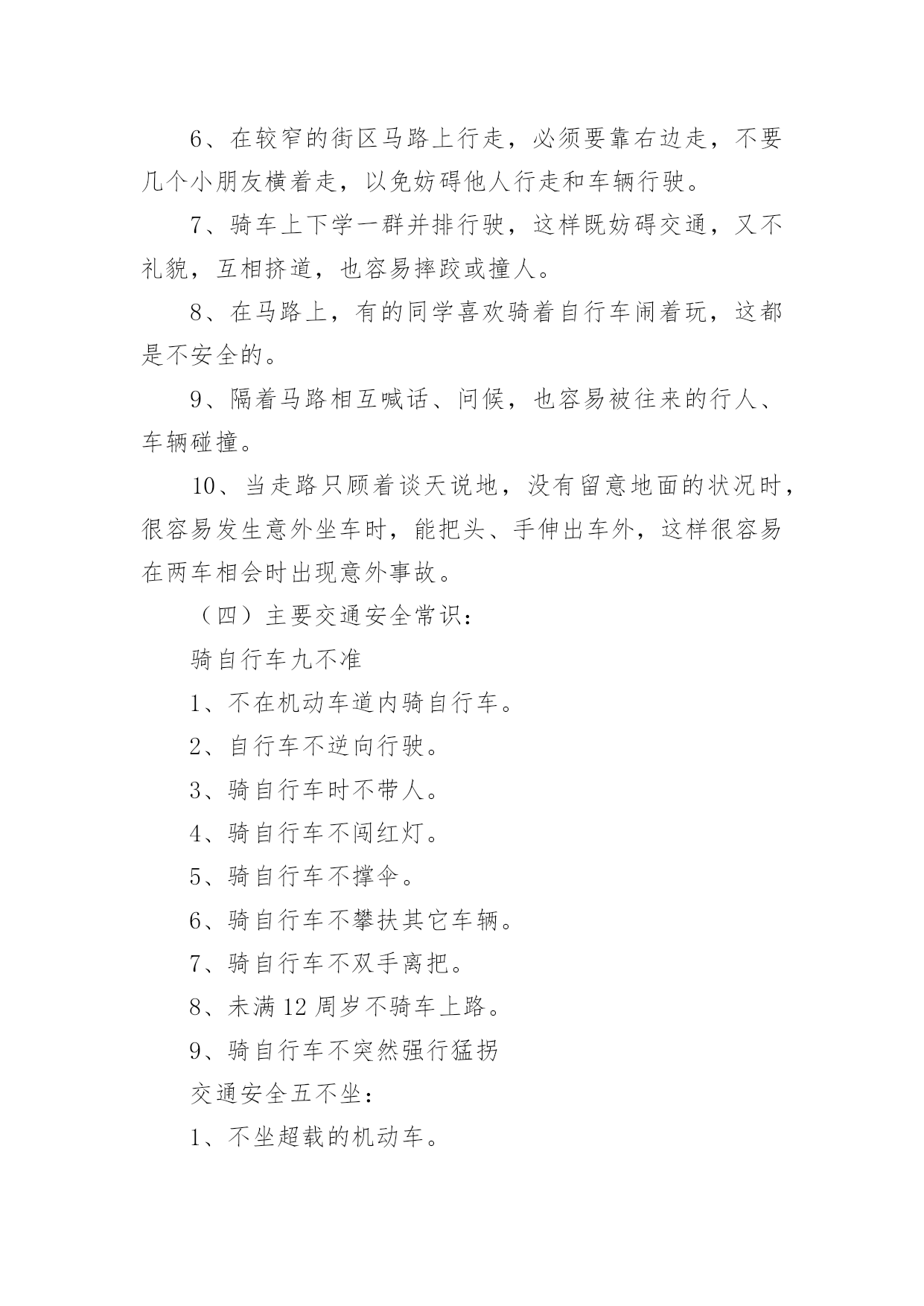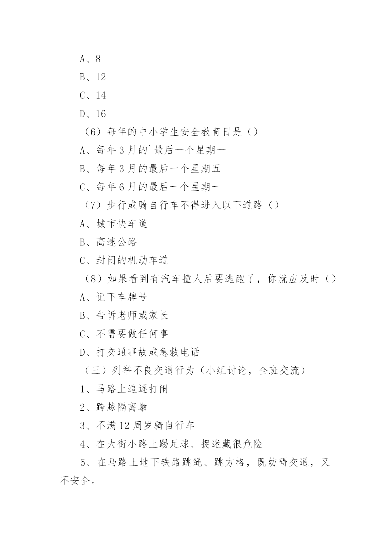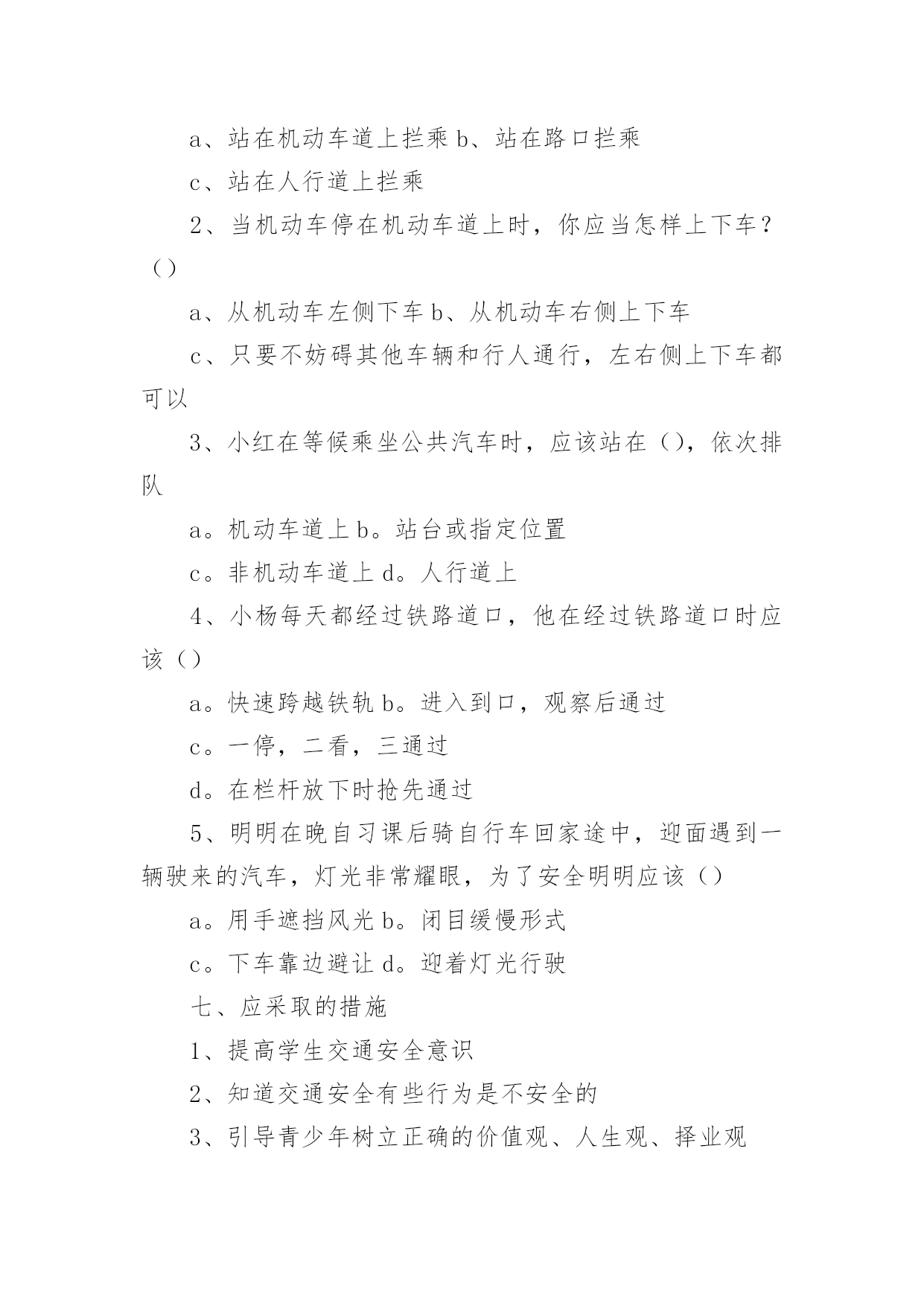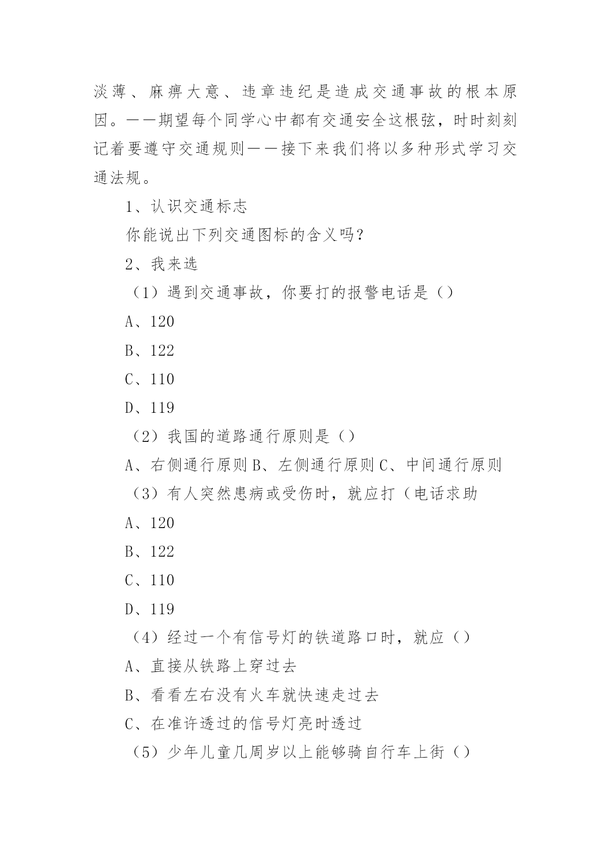 初中交通安全教案初中交通安全教案9篇作为一名优秀的教育工作者,常常需要准备教案,通过教案准备可以更好地根据具体情况对教学进程做适当的必要的调整。教案要怎么写呢?以下是小编收集整理的初中交通安全教案,仅供参考,希望能够帮助到大家。初中交通安全教案1教学目标:1、通过交通安全的教育使学生了解生命的可贵,掌握有关的交通安全知识,认清学习目的,增强学生安全意识2、引导学生在活动中认识生命的意义,在自我体验中发挥潜能,丰富自我生命,提升生命意义。热爱生命、保护生命3、为加强对学生法制与交通安全的教育与管理,使学生增加法制观念,做到懂法、知法、守法,确保身心健康,平安完成学业,教学重点:让学生知道各种常见的交通信号、标志和标线,知道有关交通常识,懂得应自觉遵守交通规则。教学难点:加强交通法规知识的学习,遵守交通法规教学过程:讲解交通安全事故案例一、导入:通过一系列的活动,让学生树立交通安全意识,从精神上远离交通安全隐患,加强自身的素质培养。为了贯彻落实公安部、教育部《关于加强中职学校交通安全工作的通知》精神,继续进一步搞好我校的交通安全教育,减少交通违章,杜绝交通事故。让学生了解交通活动中必备的安全知识,懂得安全的重要,并把自己学到的知识传达给周围的人们。二、交通法规法律条文法规篇:1、道路、交通2、交通安全3、交通法规4、道路交通标志和交通信号5、看图识标志常识篇:1、行人为什么要在人行道上行走,没有人行道要靠路边行走?2、行人横过马路为什么要走人行横道?3、没有划设人行横道的马路应该注意哪些?4、为什么不能翻越护栏?5、为什么不准扒车、追车、强行拦车?6、为什么走路时不能看书或做其它活动?7、骑自行车应该注意什么?8、乘汽车时要注意什么?9、遇到交通事故怎么办?警示篇:1、骑自行车违反交通法规2、行走时违反交通法规3、铁路或铁路口违反交通法规4、交通安全教育卡三、观看小品——《爸妈,对不起》情景一:一个孩子要出去上学,他的爸妈一个劲的叮嘱,路在一定要小心……,他却一个劲地说爸妈罗嗦情景二:一次来学校,他因在路在耽搁了一些时间,快迟到了,在横过学校门口的的马路时,他因心急,不走人行横道,想快速地跑向对面,就在这时,悲剧上演了,就在他横冲时,一辆车直接撞上了他,他倒在了血泊里。情景三:因医院抢救他保住了生命,可从此他再也站不起来了,生活也不能自理。他看着为他悲痛伤心的爸爸妈妈,留下了深深悔过的泪水。老师提问:看完小品后,有什么感受?同时你觉得我们应该怎么做,才会尽量避免这些悲剧的发生?小组成员进行讨论,说出感受本课小结同学们,我们通过一系列的活动,让学生树立交通安全意识,从精神上远离交通安全隐患,加强自身的素质培养。继续进一步搞好我们的'交通安全教育,减少交通违章,杜绝交通事故。四、交通知识问答课堂练习1、行人在经过人行横道时,怎样走才最安全?()a、一直向右看b、一直向左看c、先向左看,再向右看2、行人在没有交通信号灯和人行横道的路口应如何通过?()a、跑步快速通过b、示意机动车让行后直行通过c、确认安全后直行通过3、黄灯持续闪烁时表示()a、有危险,车辆、行人不准通过b、车辆、行人须注意观望,确认安全后通过c、车辆、行人可以优先通过4、当路口信号灯为红灯和黄灯同时亮时,它表示的是什么含义?()a、即将变为绿灯,做好起步准备b、清理路口,不准通行c、道路通畅,快速通过5、机动车行驶时,除驾驶人应当按规定使用安全带外,同车还有哪些人要使用安全带?()a、前排乘车人b、后排乘车人c、全部乘车人六、课后作业1、当你需要乘坐出租车时,你可以()a、站在机动车道上拦乘b、站在路口拦乘c、站在人行道上拦乘2、当机动车停在机动车道上时,你应当怎样上下车?()a、从机动车左侧下车b、从机动车右侧上下车c、只要不妨碍其他车辆和行人通行,左右侧上下车都可以3、小红在等候乘坐公共汽车时,应该站在(),依次排队a。机动车道上b。站台或指定位置c。非机动车道上d。人行道上4、小杨每天都经过铁路道口,他在经过铁路道口时应该()a。快速跨越铁轨b。进入到口,观察后通过c。一停,二看,三通过d。在栏杆放下时抢先通过5、明明在晚自习课后骑自行车回家途中,迎面遇到一辆驶来的汽车,灯光非常耀眼,为了安全明明应该()a。用手遮挡风光b。闭目缓慢形式c。下车靠边避让d。迎着灯光行驶七、应采取的措施1、提高学生交通安全意识2、知道交通安全有些行为是不安全的3、引导青少年树立正确的价值观、人生观、择业观4、培养青少年自我防范交通安全意识5、一旦不安全的事情发生了,知道应该如何去处理总结:通过此次安全教育,希望对同学们有所启示,了解生命的可贵,掌握有关的交通安全知识,正确面对自己所碰到的困难,选择正确的解决问题的方法,建立正确的认知,树立积极的人生观和价值观。初中交通安全教案2一