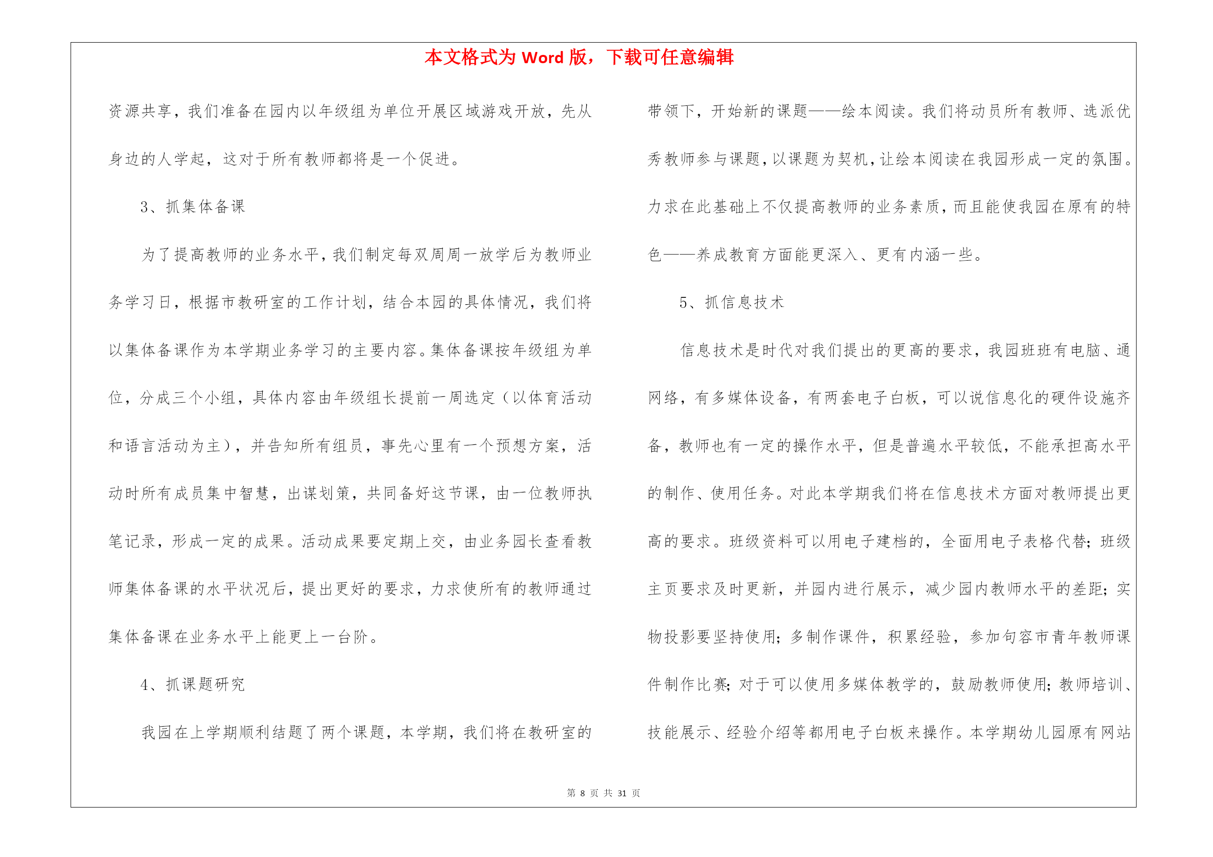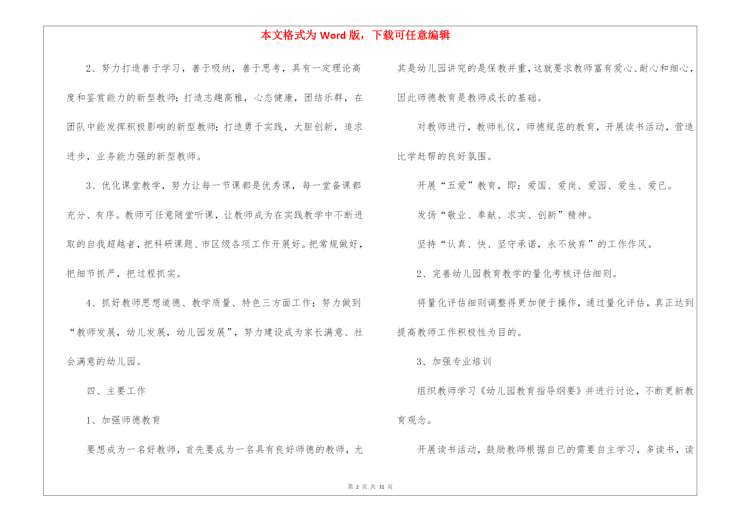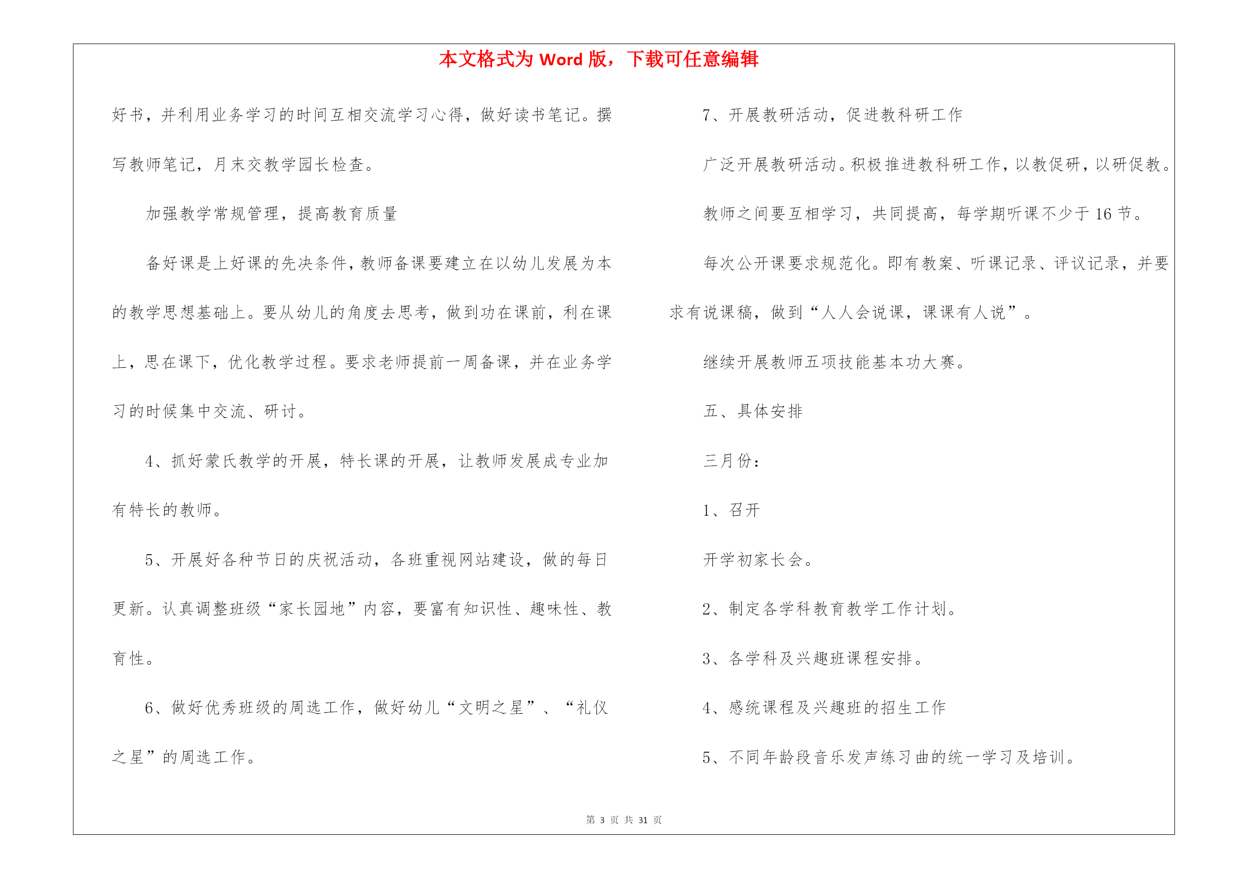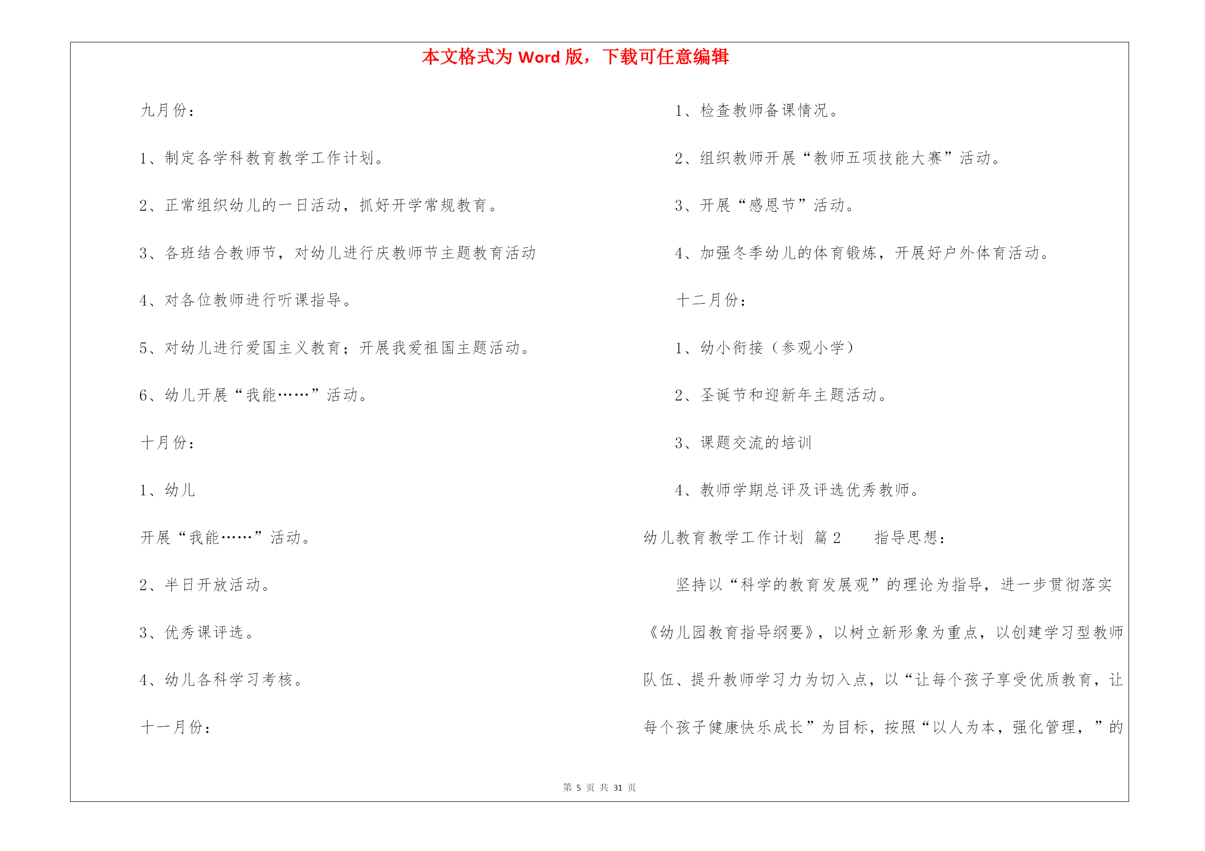 本文格式为Word版,下载可任意编辑第PAGE\*MERGEFORMAT31页共NUMPAGES\*MERGEFORMAT31页幼儿教育教学工作计划8篇幼儿教育教学工作计划范文8篇时间就如同白驹过隙般的流逝,前方等待着我们的是新的机遇和挑战,该好好计划一下接下来的工作了!计划到底怎么拟定才合适呢?以下是我帮大家整理的幼儿教育教学工作计划8篇,欢迎阅读与收藏。幼儿教育教学工作计划篇1一、指导思想以转变观念、外树形象、内抓质量为重点;以贯彻落实两个《纲要》为核心,加强幼儿园管理,以“幼儿园一日常规”和“幼儿早期阅读”的深入为主线,着力提高幼教管理水平及教科研队伍建设,着力加强规范化及示范化幼儿园建设,实施蒙氏加特长教育;把我园建设成为精品幼儿园。二、情况分析上一年,在每个学期初期,我们都进行大力度的宣传招生工作,在校领导的正确领导下,经过全园教师的共同努力,我们招生突破了三百名幼儿。目前教职员工50人,幼儿园发展态势良好。但在去年,我园师资情况比较紧张,最后由校领导及园领导的研究,我们又新招4名教师和一名后勤人员。在教学过程,我们一直将新教师培训工作作为幼儿园工作的重中之重,并通过多种形式对教师进行教学业务培训。去年,我们积极参加上级部门举办的各项活动;我们还先后开展绿园区“经典诵读”活动,全国“幼儿早期阅读”科研课题活动;新学期我们将力求开展好各项教育教学活动。三、工作目标1、坚持以正确的思想引导师生,高尚的情操熏陶师生,科学的制度规范师生,实干的精神带动师生。着力于教师队伍的建设;重视教师培训;提供多种平台学习锻炼;强化教育教学常规管理;提高教师的育人能力和水平。2、努力打造善于学习,善于吸纳,善于思考,具有一定理论高度和鉴赏能力的新型教师;打造志趣高雅,心态健康,团结乐群,在团队中能发挥积极影响的新型教师;打造勇于实践,大胆创新,追求进步,业务能力强的新型教师。3、优化课堂教学,努力让每一节课都是优秀课,每一堂备课都充分、有序。教师可任意随堂听课,让教师成为在实践教学中不断进取的自我超越者,把科研课题、市区级各项工作开展好。把常规做好,把细节抓严,把过程抓实。4、抓好教师思想道德、教学质量、特色三方面工作;努力做到“教师发展,幼儿发展,幼儿园发展”,努力建设成为家长满意、社会满意的幼儿园。四、主要工作1、加强师德教育要想成为一名好教师,首先要成为一名具有良好师德的教师,尤其是幼儿园讲究的是保教并重,这就要求教师富有爱心、耐心和细心,因此师德教育是教师成长的基础。对教师进行,教师礼仪,师德规范的教育,开展读书活动,营造比学赶帮的良好氛围。开展“五爱”教育,即:爱国、爱岗、爱园、爱生、爱已。发扬“敬业、奉献、求实、创新”精神。坚持“认真、快、坚守承诺,永不放弃”的工作作风。2、完善幼儿园教育教学的量化考核评估细则。将量化评估细则调整得更加便于操作,通过量化评估,真正达到提高教师工作积极性为目的。3、加强专业培训组织教师学习《幼儿园教育指导纲要》并进行讨论,不断更新教育观念。开展读书活动,鼓励教师根据自己的需要自主学习,多读书,读好书,并利用业务学习的时间互相交流学习心得,做好读书笔记。撰写教师笔记,月末交教学园长检查。加强教学常规管理,提高教育质量备好课是上好课的先决条件,教师备课要建立在以幼儿发展为本的教学思想基础上。要从幼儿的角度去思考,做到功在课前,利在课上,思在课下,优化教学过程。要求老师提前一周备课,并在业务学习的时候集中交流、研讨。4、抓好蒙氏教学的开展,特长课的开展,让教师发展成专业加有特长的教师。5、开展好各种节日的庆祝活动,各班重视网站建设,做的每日更新。认真调整班级“家长园地”内容,要富有知识性、趣味性、教育性。6、做好优秀班级的周选工作,做好幼儿“文明之星”、“礼仪之星”的周选工作。7、开展教研活动,促进教科研工作广泛开展教研活动。积极推进教科研工作,以教促研,以研促教。教师之间要互相学习,共同提高,每学期听课不少于16节。每次公开课要求规范化。即有教案、听课记录、评议记录,并要求有说课稿,做到“人人会说课,课课有人说”。继续开展教师五项技能基本功大赛。五、具体安排三月份:1、召开开学初家长会。2、制定各学科教育教学工作计划。3、各学科及兴趣班课程安排。4、感统课程及兴趣班的招生工作5、不同年龄段音乐发声练习曲的统一学习及培训。6、“亿童”教材学习及教师培训。7、全园环境创设。8、优秀班级及幼儿之星评选活动。四月份:1、对各班教师进行听课指导。2、集体备课,听课评课;优秀课评选。3、蒙班教学开放。4、幼儿开展“我能……”活动,每月一次、主题不同。5、加强安全常规教育、文明纪律养成教育,形成幼儿良好的行为习惯。6、“五一”国际劳动节,幼儿学习相关知识及宣传板的制作。五月份:1、幼儿开展“我