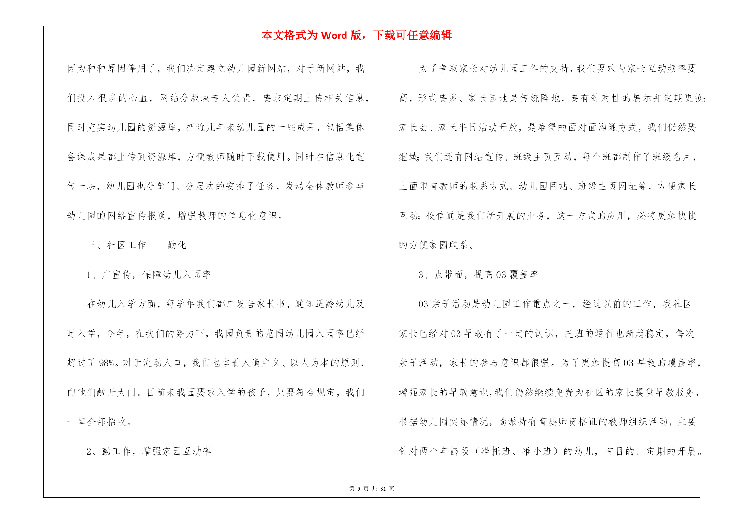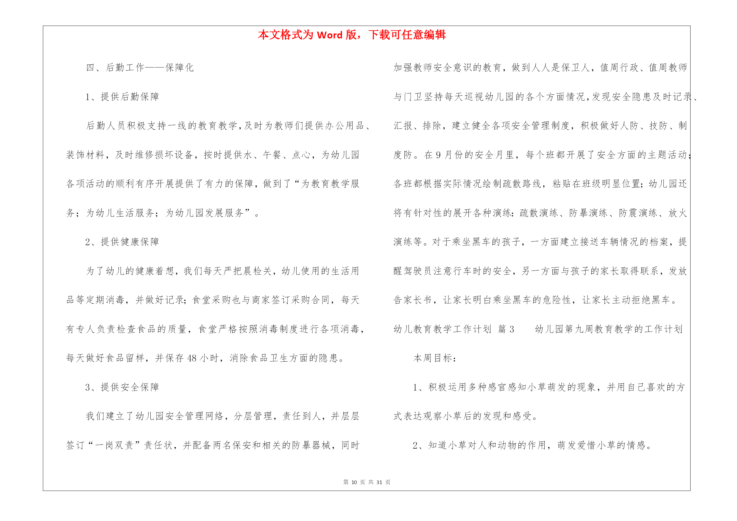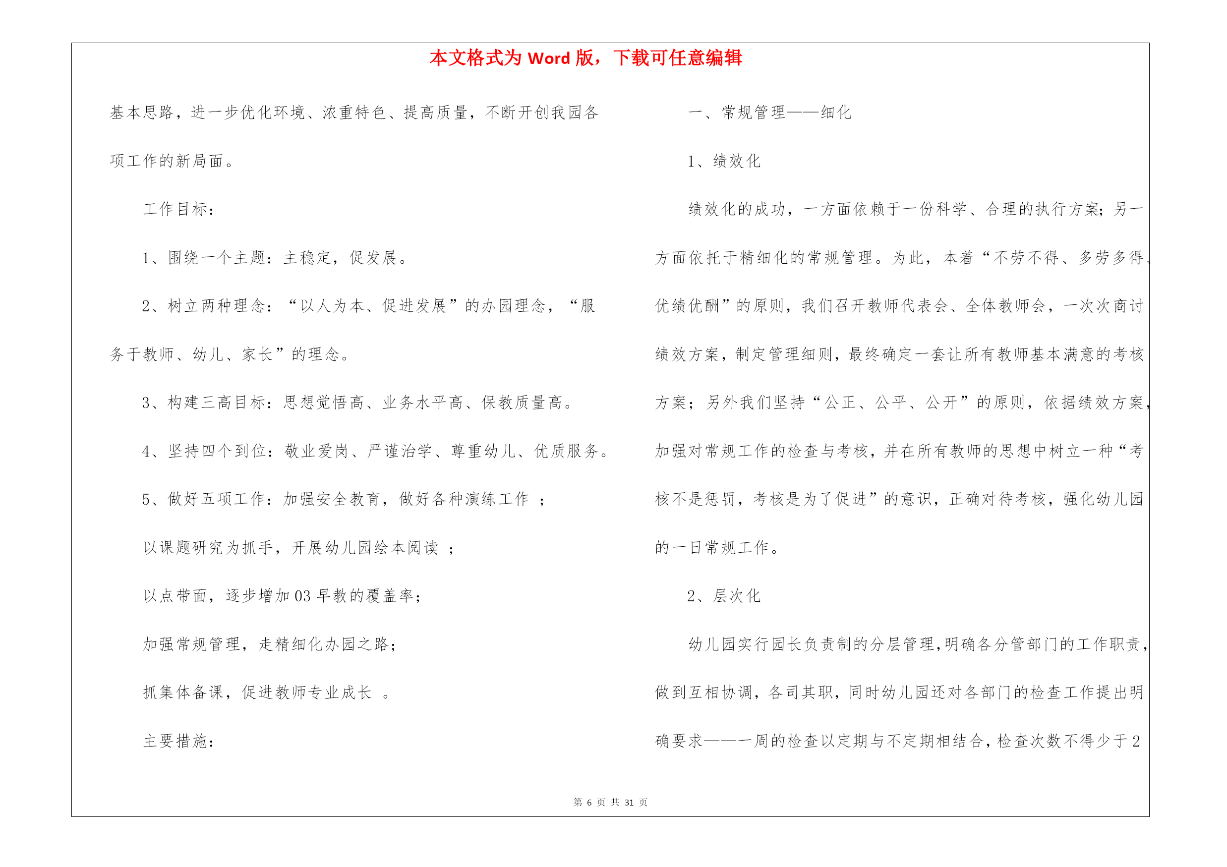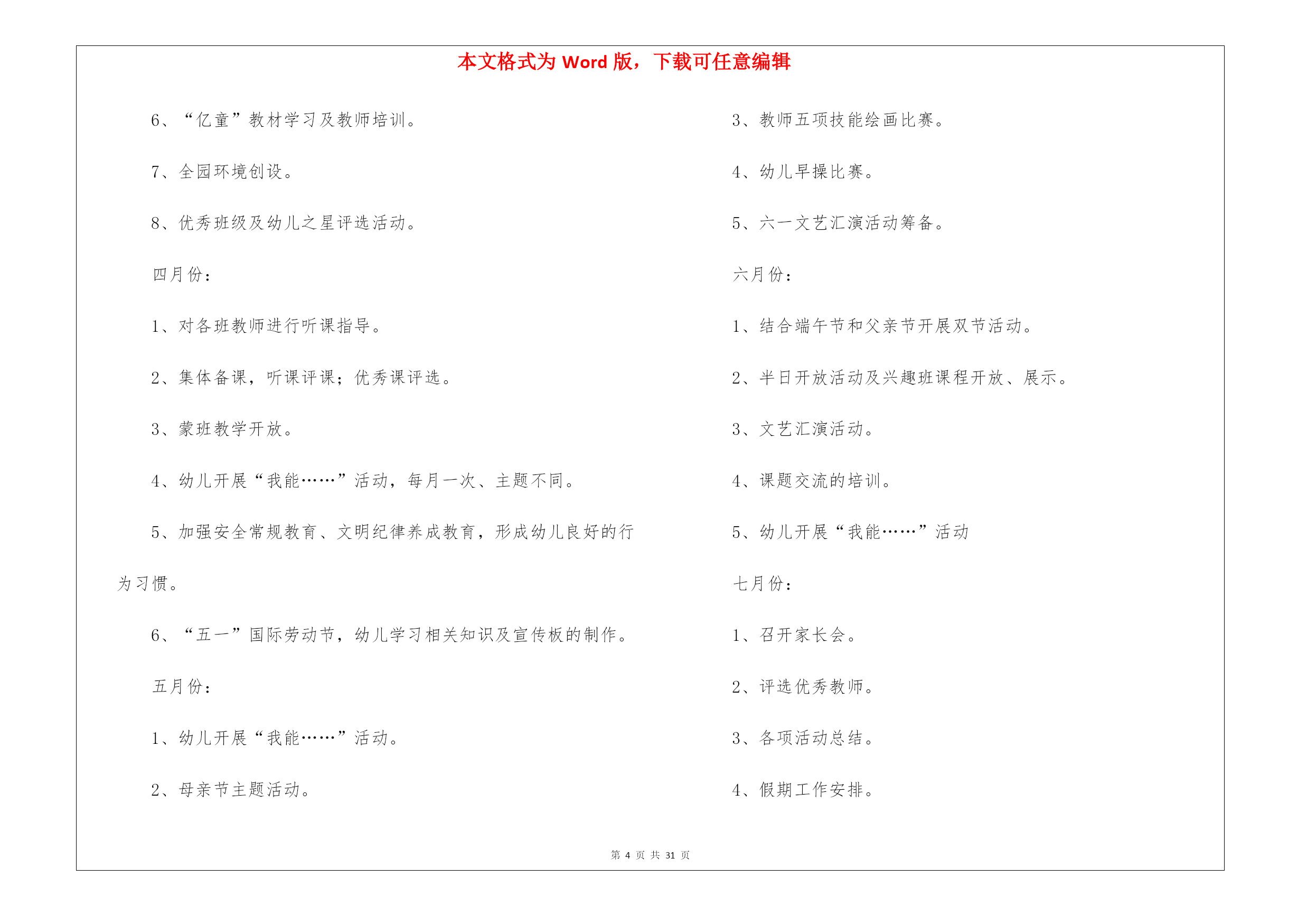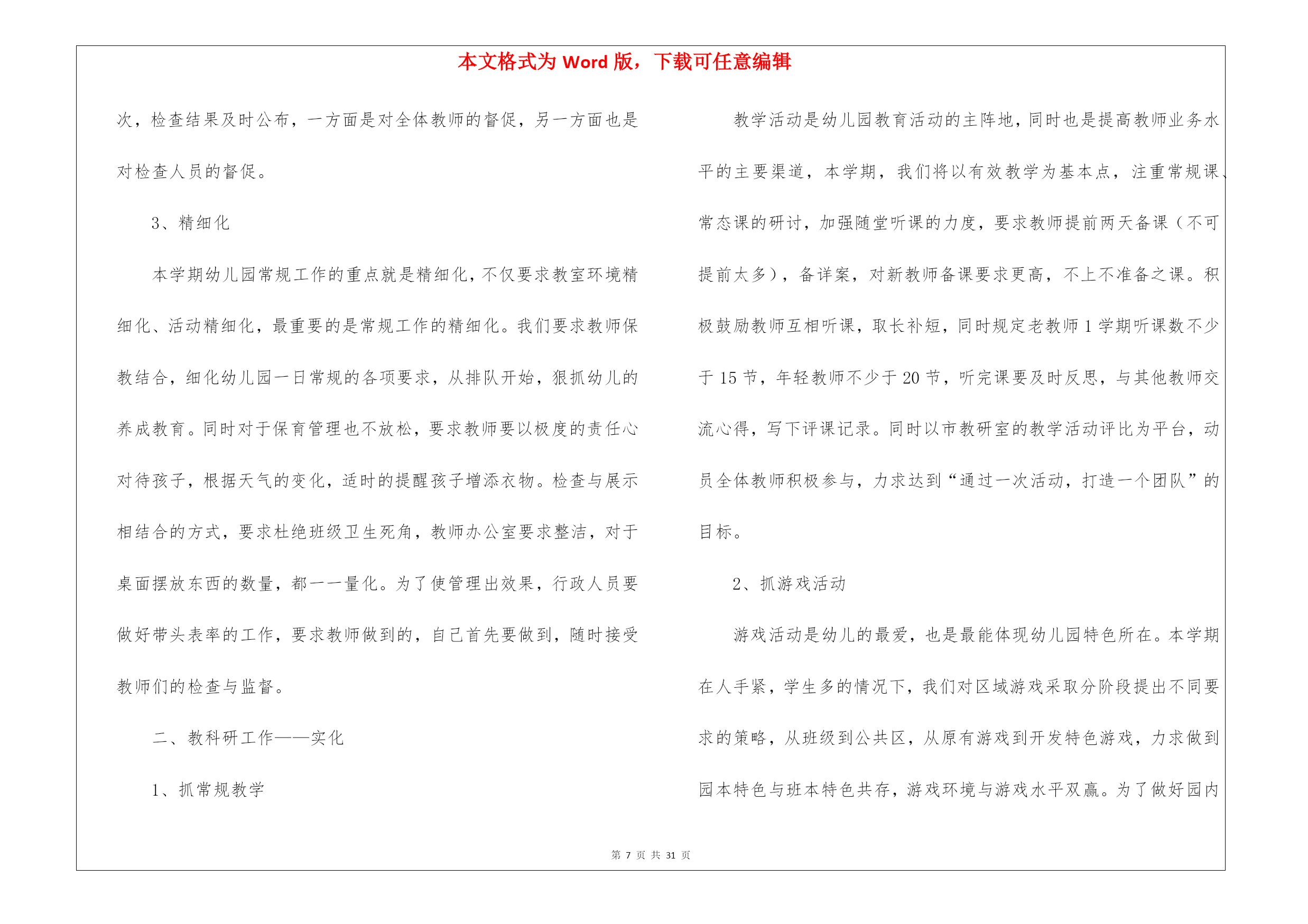 本文格式为Word版,下载可任意编辑第PAGE\*MERGEFORMAT31页共NUMPAGES\*MERGEFORMAT31页幼儿教育教学工作计划8篇幼儿教育教学工作计划范文8篇时间就如同白驹过隙般的流逝,前方等待着我们的是新的机遇和挑战,该好好计划一下接下来的工作了!计划到底怎么拟定才合适呢?以下是我帮大家整理的幼儿教育教学工作计划8篇,欢迎阅读与收藏。幼儿教育教学工作计划篇1一、指导思想以转变观念、外树形象、内抓质量为重点;以贯彻落实两个《纲要》为核心,加强幼儿园管理,以“幼儿园一日常规”和“幼儿早期阅读”的深入为主线,着力提高幼教管理水平及教科研队伍建设,着力加强规范化及示范化幼儿园建设,实施蒙氏加特长教育;把我园建设成为精品幼儿园。二、情况分析上一年,在每个学期初期,我们都进行大力度的宣传招生工作,在校领导的正确领导下,经过全园教师的共同努力,我们招生突破了三百名幼儿。目前教职员工50人,幼儿园发展态势良好。但在去年,我园师资情况比较紧张,最后由校领导及园领导的研究,我们又新招4名教师和一名后勤人员。在教学过程,我们一直将新教师培训工作作为幼儿园工作的重中之重,并通过多种形式对教师进行教学业务培训。去年,我们积极参加上级部门举办的各项活动;我们还先后开展绿园区“经典诵读”活动,全国“幼儿早期阅读”科研课题活动;新学期我们将力求开展好各项教育教学活动。三、工作目标1、坚持以正确的思想引导师生,高尚的情操熏陶师生,科学的制度规范师生,实干的精神带动师生。着力于教师队伍的建设;重视教师培训;提供多种平台学习锻炼;强化教育教学常规管理;提高教师的育人能力和水平。2、努力打造善于学习,善于吸纳,善于思考,具有一定理论高度和鉴赏能力的新型教师;打造志趣高雅,心态健康,团结乐群,在团队中能发挥积极影响的新型教师;打造勇于实践,大胆创新,追求进步,业务能力强的新型教师。3、优化课堂教学,努力让每一节课都是优秀课,每一堂备课都充分、有序。教师可任意随堂听课,让教师成为在实践教学中不断进取的自我超越者,把科研课题、市区级各项工作开展好。把常规做好,把细节抓严,把过程抓实。4、抓好教师思想道德、教学质量、特色三方面工作;努力做到“教师发展,幼儿发展,幼儿园发展”,努力建设成为家长满意、社会满意的幼儿园。四、主要工作1、加强师德教育要想成为一名好教师,首先要成为一名具有良好师德的教师,尤其是幼儿园讲究的是保教并重,这就要求教师富有爱心、耐心和细心,因此师德教育是教师成长的基础。对教师进行,教师礼仪,师德规范的教育,开展读书活动,营造比学赶帮的良好氛围。开展“五爱”教育,即:爱国、爱岗、爱园、爱生、爱已。发扬“敬业、奉献、求实、创新”精神。坚持“认真、快、坚守承诺,永不放弃”的工作作风。2、完善幼儿园教育教学的量化考核评估细则。将量化评估细则调整得更加便于操作,通过量化评估,真正达到提高教师工作积极性为目的。3、加强专业培训组织教师学习《幼儿园教育指导纲要》并进行讨论,不断更新教育观念。开展读书活动,鼓励教师根据自己的需要自主学习,多读书,读好书,并利用业务学习的时间互相交流学习心得,做好读书笔记。撰写教师笔记,月末交教学园长检查。加强教学常规管理,提高教育质量备好课是上好课的先决条件,教师备课要建立在以幼儿发展为本的教学思想基础上。要从幼儿的角度去思考,做到功在课前,利在课上,思在课下,优化教学过程。要求老师提前一周备课,并在业务学习的时候集中交流、研讨。4、抓好蒙氏教学的开展,特长课的开展,让教师发展成专业加有特长的教师。5、开展好各种节日的庆祝活动,各班重视网站建设,做的每日更新。认真调整班级“家长园地”内容,要富有知识性、趣味性、教育性。6、做好优秀班级的周选工作,做好幼儿“文明之星”、“礼仪之星”的周选工作。7、开展教研活动,促进教科研工作广泛开展教研活动。积极推进教科研工作,以教促研,以研促教。教师之间要互相学习,共同提高,每学期听课不少于16节。每次公开课要求规范化。即有教案、听课记录、评议记录,并要求有说课稿,做到“人人会说课,课课有人说”。继续开展教师五项技能基本功大赛。五、具体安排三月份:1、召开开学初家长会。2、制定各学科教育教学工作计划。3、各学科及兴趣班课程安排。4、感统课程及兴趣班的招生工作5、不同年龄段音乐发声练习曲的统一学习及培训。6、“亿童”教材学习及教师培训。7、全园环境创设。8、优秀班级及幼儿之星评选活动。四月份:1、对各班教师进行听课指导。2、集体备课,听课评课;优秀课评选。3、蒙班教学开放。4、幼儿开展“我能……”活动,每月一次、主题不同。5、加强安全常规教育、文明纪律养成教育,形成幼儿良好的行为习惯。6、“五一”国际劳动节,幼儿学习相关知识及宣传板的制作。五月份:1、幼儿开展“我