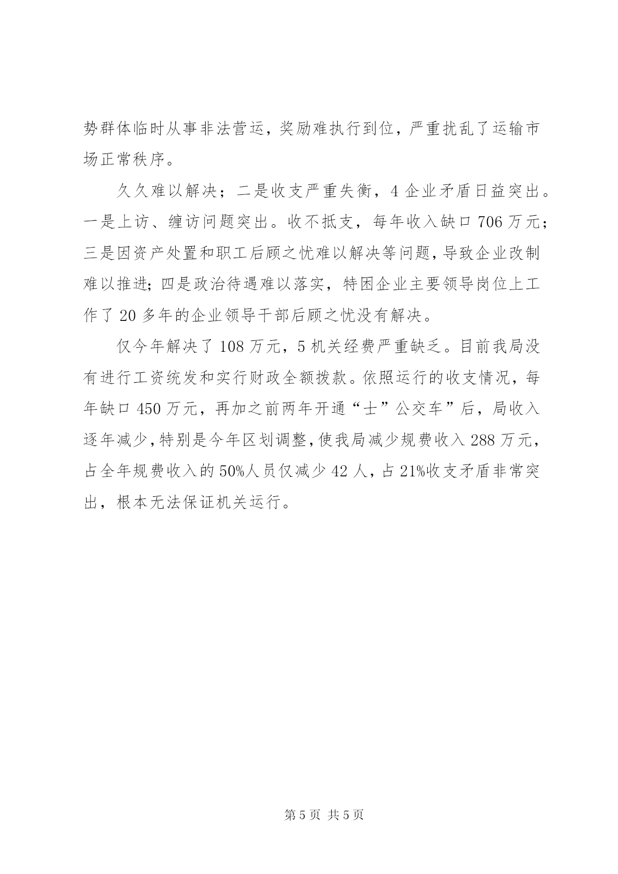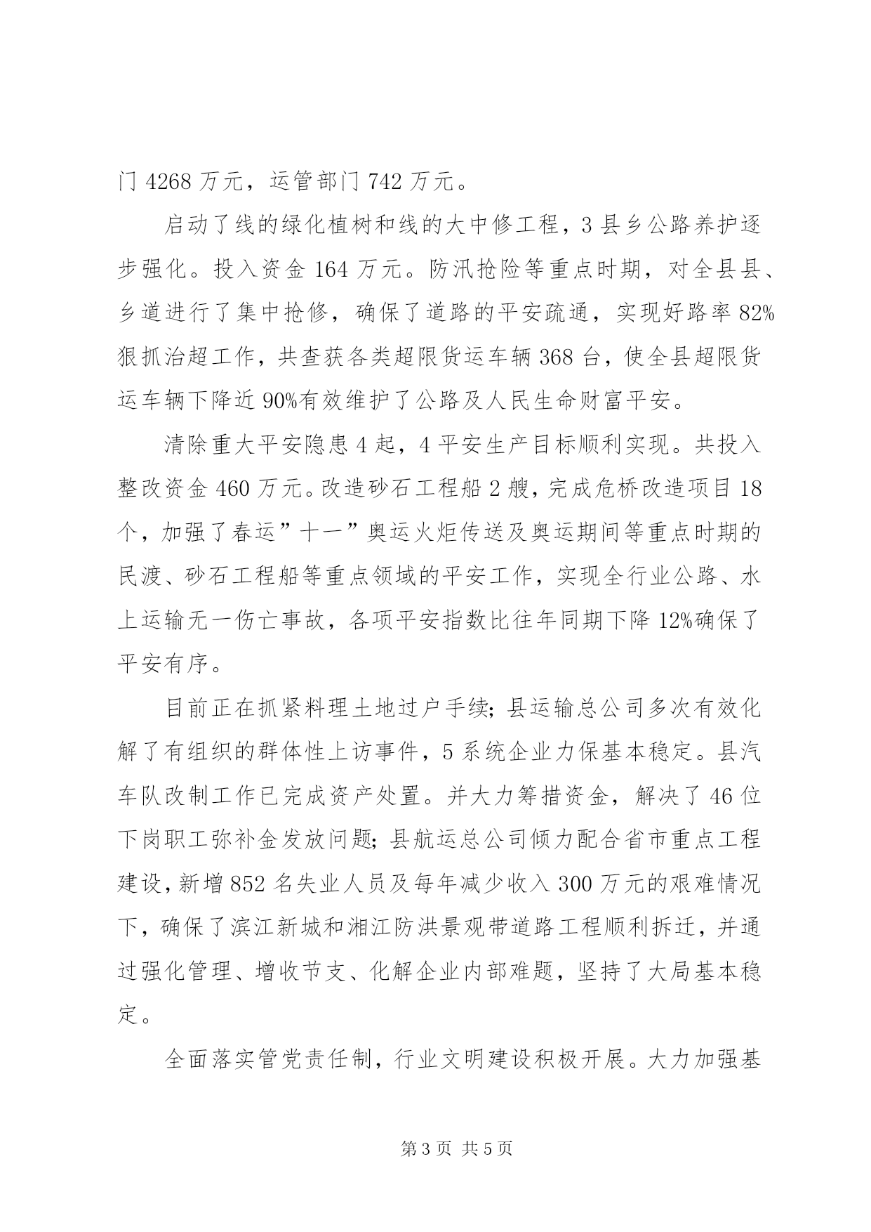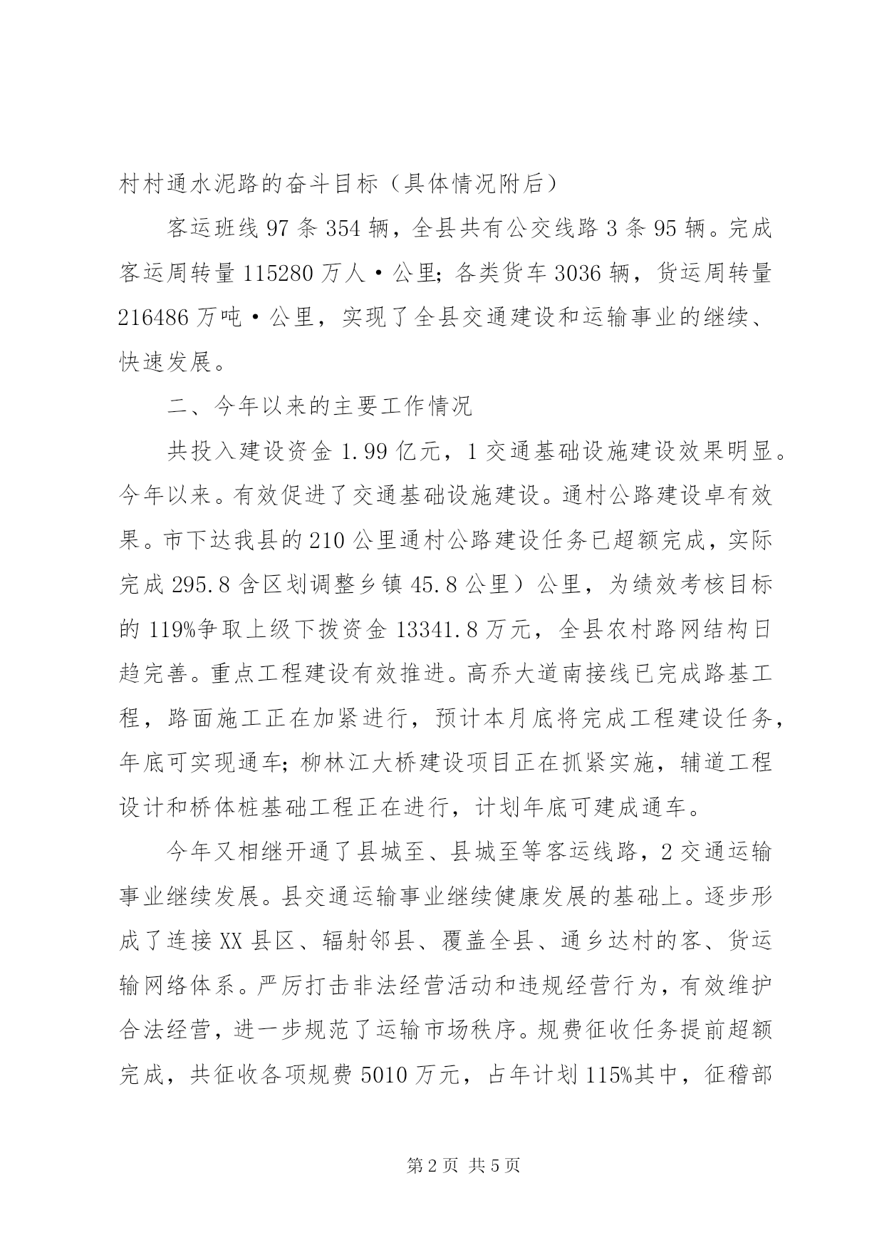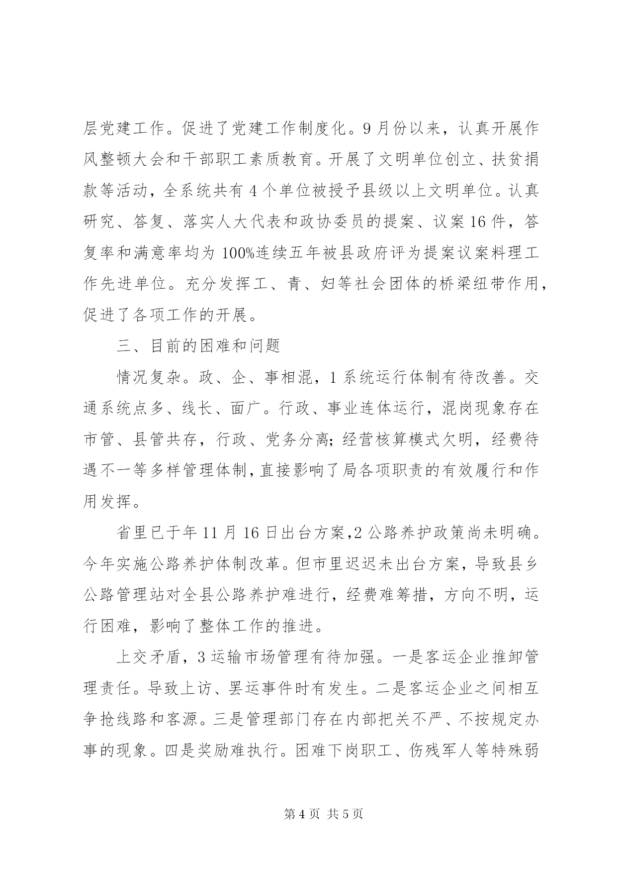第PAGE\*Arabic\*MERGEFORMAT5页共NUMPAGES\*MERGEFORMAT5页交通局基础设施管理总结局重点工程建设的主要载体是县交建投,重点工程建设压力很大。目前。但由于交建投机构没有健全,职能没有明确,运作模式缺乏市场性,回报用地没有挂牌交易,公司没有积累,没有资产,导致我局重点工程建设压力很大。年底交建投应付资金9332万元。一、基本情况下辖运管所、征稽所、县乡公路管理站、港航管理所、5个交管站(办)质监站、交建投,县交通局内设办公室、财务审计科、平安科、交建科、人事科、法制办。共有干部职工169人(退休人员29人)其中局机关30名、事业单位139人,共设党支部及党委15个,党员374名。同时管理航运总公司、汽车队、运输总公司三家企业,企业共有干部职工2452名。县、乡、村公路规划、建养和管理;水、陆运输市场,主要负责全县交通基础设施建设管理、质量监督。运输站、点、场规划和建设以及各项交通规费的征缴,对三家企业的管理及维稳工作。公路总里程2201.2公里,目前全县共有村级以上公路885条。其中县级公路23条236.3公里、乡级公路136条514.4公里,村级公路726条1450.5公里,公路密度为每平方公里拥有公路1.62公里,420个行政村(除村外)全部通公路,实现了村村通水泥路的奋斗目标(具体情况附后)客运班线97条354辆,全县共有公交线路3条95辆。完成客运周转量115280万人·公里;各类货车3036辆,货运周转量216486万吨·公里,实现了全县交通建设和运输事业的继续、快速发展。二、今年以来的主要工作情况共投入建设资金1.99亿元,1交通基础设施建设效果明显。今年以来。有效促进了交通基础设施建设。通村公路建设卓有效果。市下达我县的210公里通村公路建设任务已超额完成,实际完成295.8含区划调整乡镇45.8公里)公里,为绩效考核目标的119%争取上级下拨资金13341.8万元,全县农村路网结构日趋完善。重点工程建设有效推进。高乔大道南接线已完成路基工程,路面施工正在加紧进行,预计本月底将完成工程建设任务,年底可实现通车;柳林江大桥建设项目正在抓紧实施,辅道工程设计和桥体桩基础工程正在进行,计划年底可建成通车。今年又相继开通了县城至、县城至等客运线路,2交通运输事业继续发展。县交通运输事业继续健康发展的基础上。逐步形成了连接XX县区、辐射邻县、覆盖全县、通乡达村的客、货运输网络体系。严厉打击非法经营活动和违规经营行为,有效维护合法经营,进一步规范了运输市场秩序。规费征收任务提前超额完成,共征收各项规费5010万元,占年计划115%其中,征稽部门4268万元,运管部门742万元。启动了线的绿化植树和线的大中修工程,3县乡公路养护逐步强化。投入资金164万元。防汛抢险等重点时期,对全县县、乡道进行了集中抢修,确保了道路的平安疏通,实现好路率82%狠抓治超工作,共查获各类超限货运车辆368台,使全县超限货运车辆下降近90%有效维护了公路及人民生命财富平安。清除重大平安隐患4起,4平安生产目标顺利实现。共投入整改资金460万元。改造砂石工程船2艘,完成危桥改造项目18个,加强了春运”十一”奥运火炬传送及奥运期间等重点时期的民渡、砂石工程船等重点领域的平安工作,实现全行业公路、水上运输无一伤亡事故,各项平安指数比往年同期下降12%确保了平安有序。目前正在抓紧料理土地过户手续;县运输总公司多次有效化解了有组织的群体性上访事件,5系统企业力保基本稳定。县汽车队改制工作已完成资产处置。并大力筹措资金,解决了46位下岗职工弥补金发放问题;县航运总公司倾力配合省市重点工程建设,新增852名失业人员及每年减少收入300万元的艰难情况下,确保了滨江新城和湘江防洪景观带道路工程顺利拆迁,并通过强化管理、增收节支、化解企业内部难题,坚持了大局基本稳定。全面落实管党责任制,行业文明建设积极开展。大力加强基层党建工作。促进了党建工作制度化。9月份以来,认真开展作风整顿大会和干部职工素质教育。开展了文明单位创立、扶贫捐款等活动,全系统共有4个单位被授予县级以上文明单位。认真研究、答复、落实人大代表和政协委员的提案、议案16件,答复率和满意率均为100%连续五年被县政府评为提案议案料理工作先进单位。充分发挥工、青、妇等社会团体的桥梁纽带作用,促进了各项工作的开展。三、目前的困难和问题情况复杂。政、企、事相混,1系统运行体制有待改善。交通系统点多、线长、面广。行政、事业连体运行,混岗现象存在市管、县管共存,行政、党务分离;经营核算模式欠明,经费待遇不一等多样管理体制,直接影响了局各项职责的有效履行和作用发挥。省里已于年11月16日出台方案,2公路养护政策尚未明确。今年实施公路养护体制改革。但市里迟