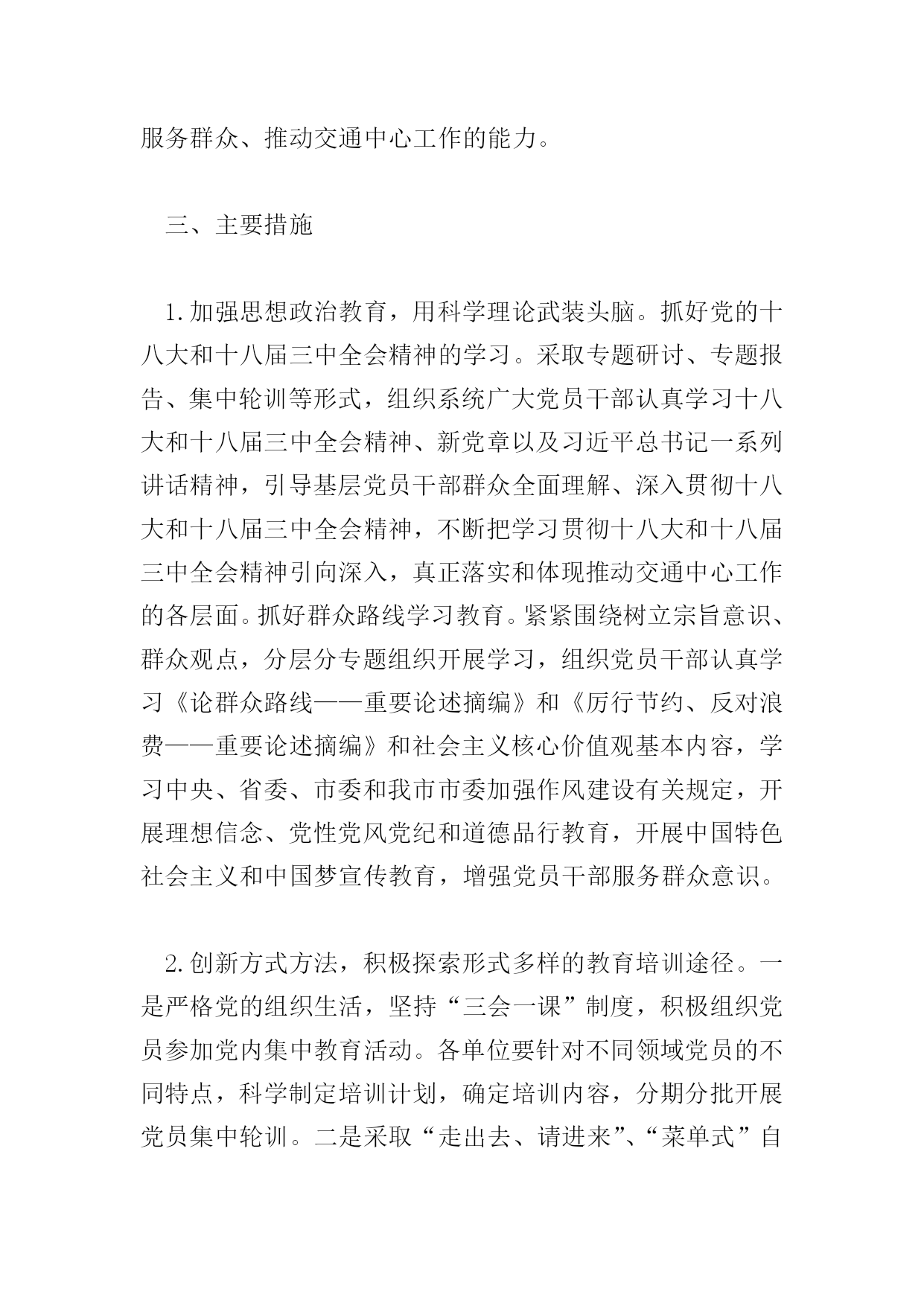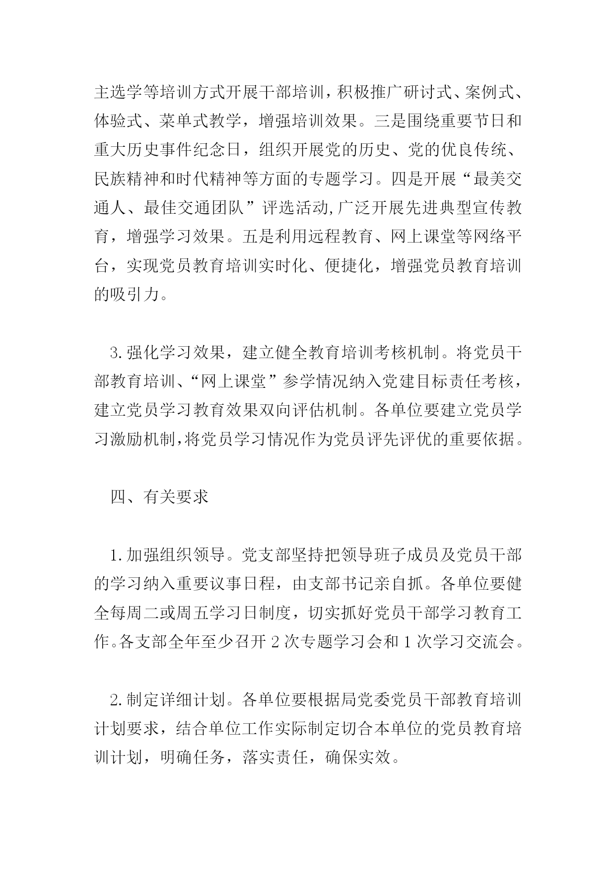 交通局党员教育培训计划为进一步加强党员干部队伍建设,提高党员干部综合素质,强化学习型党组织建设,提高交通基层党组织建设水平,结合交通工作实际,特制订本计划。一、指导思想以党的十八大和十八届三中全会精神为指导,深入贯彻落实科学发展观,自觉践行党的群众路线,以加强党的执政能力建设和先进性建设为主线,以建设学习型党组织为目标,围绕局党委中心工作,创新培训理念,丰富培训模式,进一步加大党员教育培训力度,引导系统党员干部善于学习,不断创新,提高交通党员干部政治理论和业务技能水平,改进工作作风,努力打造“三宽四有”型交通党员干部队伍。二、目标任务按照组织人事工作安排,全年拟计划举办1期入党积极分子培训班、1期党务干部培训班和4期党员干部能力素质提升专题学习辅导,对党员、入党积极分子集中进行3次以上教育培训。通过教育培训,使系统广大党员干部进一步坚定党性观念,进一步凝聚优良作风,进一步增强综合素质,进一步提高先锋模范作用,进一步提升执行政策、依法行政、服务群众、推动交通中心工作的能力。三、主要措施1.加强思想政治教育,用科学理论武装头脑。抓好党的十八大和十八届三中全会精神的学习。采取专题研讨、专题报告、集中轮训等形式,组织系统广大党员干部认真学习十八大和十八届三中全会精神、新党章以及习近平总书记一系列讲话精神,引导基层党员干部群众全面理解、深入贯彻十八大和十八届三中全会精神,不断把学习贯彻十八大和十八届三中全会精神引向深入,真正落实和体现推动交通中心工作的各层面。抓好群众路线学习教育。紧紧围绕树立宗旨意识、群众观点,分层分专题组织开展学习,组织党员干部认真学习《论群众路线——重要论述摘编》和《厉行节约、反对浪费——重要论述摘编》和社会主义核心价值观基本内容,学习中央、省委、市委和我市市委加强作风建设有关规定,开展理想信念、党性党风党纪和道德品行教育,开展中国特色社会主义和中国梦宣传教育,增强党员干部服务群众意识。2.创新方式方法,积极探索形式多样的教育培训途径。一是严格党的组织生活,坚持“三会一课”制度,积极组织党员参加党内集中教育活动。各单位要针对不同领域党员的不同特点,科学制定培训计划,确定培训内容,分期分批开展党员集中轮训。二是采取“走出去、请进来”、“菜单式”自主选学等培训方式开展干部培训,积极推广研讨式、案例式、体验式、菜单式教学,增强培训效果。三是围绕重要节日和重大历史事件纪念日,组织开展党的历史、党的优良传统、民族精神和时代精神等方面的专题学习。四是开展“最美交通人、最佳交通团队”评选活动,广泛开展先进典型宣传教育,增强学习效果。五是利用远程教育、网上课堂等网络平台,实现党员教育培训实时化、便捷化,增强党员教育培训的吸引力。3.强化学习效果,建立健全教育培训考核机制。将党员干部教育培训、“网上课堂”参学情况纳入党建目标责任考核,建立党员学习教育效果双向评估机制。各单位要建立党员学习激励机制,将党员学习情况作为党员评先评优的重要依据。四、有关要求1.加强组织领导。党支部坚持把领导班子成员及党员干部的学习纳入重要议事日程,由支部书记亲自抓。各单位要健全每周二或周五学习日制度,切实抓好党员干部学习教育工作。各支部全年至少召开2次专题学习会和1次学习交流会。2.制定详细计划。各单位要根据局党委党员干部教育培训计划要求,结合单位工作实际制定切合本单位的党员教育培训计划,明确任务,落实责任,确保实效。3.加强管理监督。各单位要健全学习教育制度,强化教育管理,建立培训档案,加强对党员干部教育学习考核,确保全年教育培训任务圆满完成。